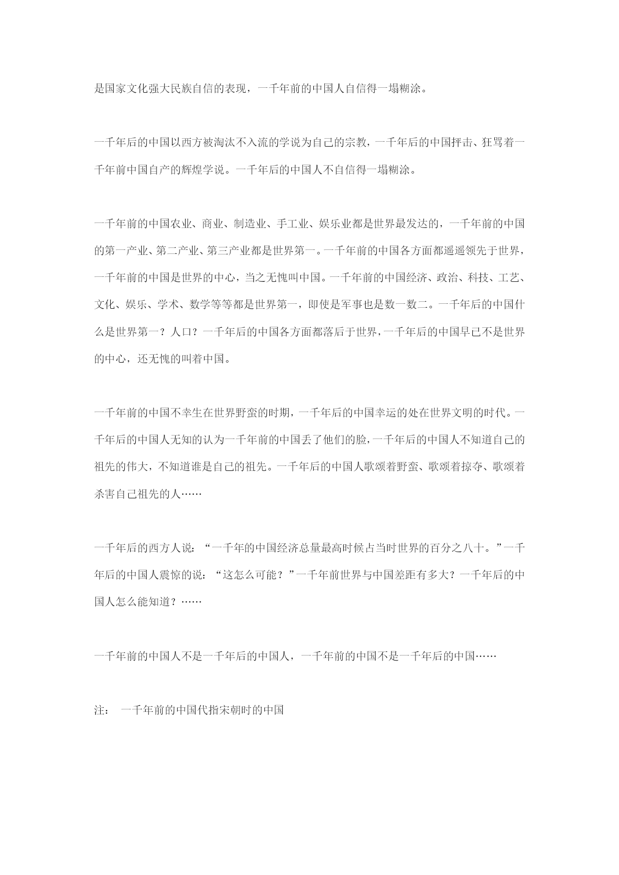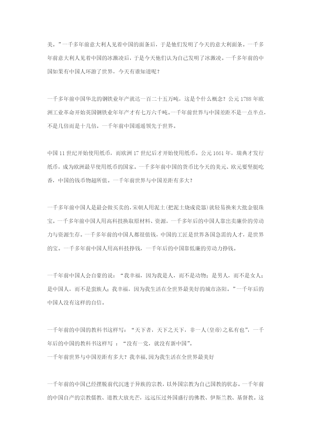 一千年前世界与中国差距有多大 一千多年前的夜晚,全世界的城市都是一片漆黑,只有中国的城市灯火辉煌、光明灿烂。一千多年前的夜晚,全世界的城市都是一片安静,只有中国的城市人流拥动、欢歌笑语。一千年前世界与中国差距有多大? 一千多年前全世界只有中国有超过百万以上的超大城市。11世纪,欧洲最大的城市英国的伦敦,法国的巴黎,意大利的威尼斯、佛罗伦萨等城市的规模都不过万人。而中国的首都有一百五十万人。一千年前中国的城市规模的超过二十万人口的有六个,十万人以上的城市有四十六个。一千年前的中国城市就已经有施药局、慈幼局、养济院、漏泽园等福利设施,这是城市高级现代化的特征。一千多年前欧洲很乱很穷很落后,美洲未开发、非洲很原始。一千年前世界与中国差距有多大?一千年前世界与中国差距不是一点半点,不是一倍而是十几倍。一千年前中国遥遥领先于世界。 13世纪世界除中国以外最大最繁华的城市是巴格达,城市规模在三十至五十万之间。西方最大最繁华的城市是威尼斯只有十万人口。欧洲14世纪的伦敦也只有四万人,巴黎有六万人。而中国13世纪杭州、苏州、成都都是超过百万以上的大城市。一千年前世界与中国差距有多大?13世纪欧洲最富裕地方的意大利威尼斯人有幸来到泉州,不禁感慨中国城市是光明之城。13世纪西方最富裕地方的意大利威尼斯人有幸见到杭州,不禁感慨中国城市是天上的城市,认为杭州是世界上最优美最高贵的城市。一千年前世界与中国差距不是一点半点,不是一倍而是十几倍。一千年前中国遥遥领先于世界。 一千多年前的中国正朝着成为海上强国的方向发展。一千多年前西方最富裕地方的意大利威尼斯人见着中国的商船不仅感慨:“中国的商船也是人们能够想象出的最大的船只,有的有6层桅杆,4层甲板,12张大帆,可以装载1000多人。这些船不仅拥有精确得近乎奇迹般的航线图,而且,它们还拥有几何学家以及那些懂得星象的人,还有那些熟练运用天然磁石的人,通过它,他们可以找到通往陆上世界尽头的路,对于他们的天赋,愿上帝受到赞美。”一千多年前意大利人见着中国的面条后,于是他们发明了今天的意大利面条。一千多年前意大利人见着中国的冰激凌后,于是今天他们认为自己发明了冰激凌。一千多年前的中国如果有中国人环游了世界,今天有谁知道呢? 一千多年前中国华北的钢铁业年产就达一百二十五万吨,这是个什么概念?公元1788年欧洲工业革命开始英国钢铁业年年产才有七万六千吨。一千年前世界与中国差距不是一点半点,不是几倍而是十几倍。一千年前中国遥遥领先于世界。 中国11世纪开始使用纸币,而欧洲17世纪后才开始使用纸币。公元1661年,瑞典才发行纸币,成为欧洲最早使用纸币的国家。一千多年前中国的货币比今天的美元、欧元要坚挺吃香,中国的钱币物超所值。一千年前世界与中国差距有多大? 一千多年前中国人是最会做买卖的,宋朝人用泥土(把泥土烧成瓷器)就轻易换来大批金银珠宝。一千多年前中国人用高科技换取原材料、资源,一千多年后的中国人靠出卖廉价的劳动力与资源生存。一千多年前的中国人都很值钱,中国的工匠是世界各国急需的人才,是世界的宝。一千多年前中国人用高科技挣钱,一千年后的中国靠低廉的劳动力挣钱。 一千年前中国人会自豪的说:“我幸福,因为我是人,而不是动物;是男人,而不是女人;是中国人,而不是蛮族人;我幸福,因为我生活在全世界最美好的城市洛阳。”一千年后的中国人没有这样的自信。 一千年前的中国的教科书这样写:“天下者,天下之天下,非一人(皇帝)之私有也”,一千年后的中国的教科书这样写:“没有一党,就没有新中国”。 一千年前世界与中国差距有多大?我幸福,因为我生活在全世界最美好 一千年前的中国已经摆脱前代沉迷于异族的宗教,以外国宗教为自己国教的状态。一千年前的中国自产的宗教儒教、道教大放光芒,远远压过外国盛行的佛教、伊斯兰教、基督教。这是国家文化强大民族自信的表现,一千年前的中国人自信得一塌糊涂。 一千年后的中国以西方被淘汰不入流的学说为自己的宗教,一千年后的中国抨击、狂骂着一千年前中国自产的辉煌学说。一千年后的中国人不自信得一塌糊涂。 一千年前的中国农业、商业、制造业、手工业、娱乐业都是世界最发达的,一千年前的中国的第一产业、第二产业、第三产业都是世界第一。一千年前的中国各方面都遥遥领先于世界,一千年前的中国是世界的中心,当之无愧叫中国。一千年前的中国经济、政治、科技、工艺、文化、娱乐、学术、数学等等都是世界第一,即使是军事也是数一数二。一千年后的中国什么是世界第一?人口?一千年后的中国各方面都落后于世界,一千年后的中国早已不是世界的中心,还无愧的叫着中国。 一千年前的中国不幸生在世界野蛮的时期,一千年后的中国幸运的处在世界文明的时代。一千年后的中国人无知的认为一千年前的中国丢了他们的脸,一千年后的中国人不知道自己的祖先的伟大,不