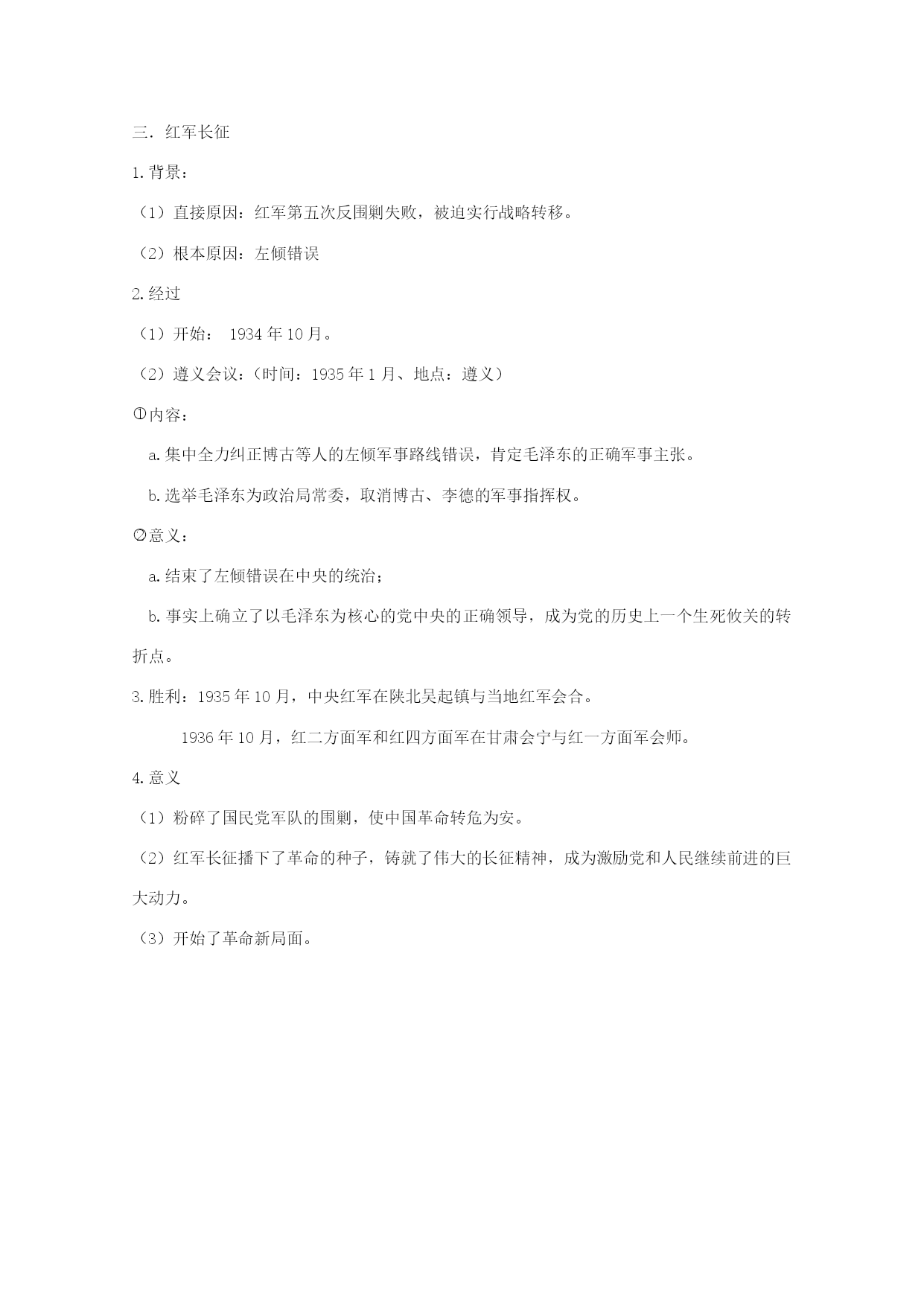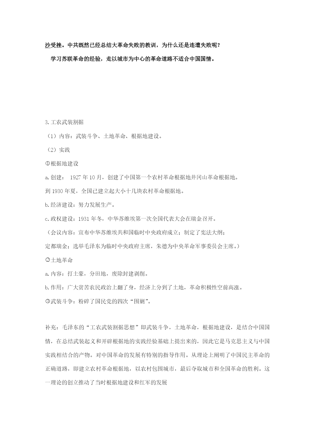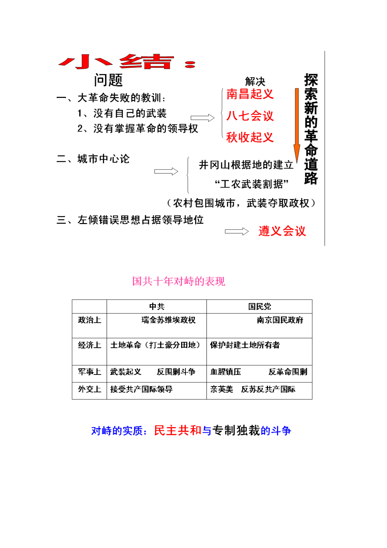第15课国共的十年对峙 一、南昌起义 1.背景: (1)大革命失败的教训(中共从大革命的失败中认识到要想取得革命的胜利必须要掌握革命的领导权和革命的武装,开展武装斗争) (2)中共掌握了一部分武装力量 (3)南昌附近敌人兵力比较薄弱 2.过程: (1)时间:1927年8月1日;主要领导人:周恩来、贺龙 (2)概况:经过战斗,占领南昌城。南下途中受挫,保存下来的队伍, 一部分由朱德、陈毅率领,转战湘南。另一部分进入海陆丰,与当地农民军会合。 3.意义: (1)南昌起义打响了武装反抗国民党反动统治的第一枪。 (2)标志着中国共产党独立领导武装斗争、创建人民军队和武装夺取政权的开始。 二、土地革命 1.八七会议 (1)时间、地点:1927年8月7日、汉口。 (2)内容: eq\o\ac(○,1)会议清算了陈独秀的右倾错误。eq\o\ac(○,2)确定开展土地革命和武装反抗国民党统治eq\o\ac(○,3)决定秋收时节发动武装起义。 2.秋收起义 1927年9月,毛泽东领导了湘赣边秋收起义,进攻长沙受挫,此后中共实现了第一次工作重心的转移。 思考:南昌起义成功后,按预定计划南下广州,遭到敌人封堵,损失严重。秋收起义进攻长沙受挫。中共既然已经总结大革命失败的教训,为什么还是连遭失败呢? 学习苏联革命的经验,走以城市为中心的革命道路不适合中国国情。 3.工农武装割据 (1)内容:武装斗争、土地革命、根据地建设。 (2)实践 eq\o\ac(○,1)根据地建设 a.创建:1927年10月,创建了中国第一个农村革命根据地井冈山革命根据地。 到1930年夏,全国已建立起大小十几块农村革命根据地。 b.经济建设:努力发展生产。 c.政权建设:1931年冬,中华苏维埃第一次全国代表大会在瑞金召开。 (会议内容:宣布中华苏维埃共和国临时中央政府成立;制定了宪法大纲; 定都瑞金;选举毛泽东为临时中央政府主席,朱德为中央革命军事委员会主席。) eq\o\ac(○,2)土地革命 a.内容:打土豪,分田地,废除封建剥削。 b.作用:广大贫苦农民政治上翻了身,经济上分到了土地,革命积极性空前高涨。 eq\o\ac(○,3)武装斗争:粉碎了国民党的四次“围剿”。 补充:毛泽东的“工农武装割据思想”即武装斗争,土地革命,根据地建设,是结合中国国情,在总结武装起义和开辟根据地的实践经验基础上提出来的,因此它是马克思主义与中国实践相结合的产物。对中国革命的发展有特别的指导作用。从理论上阐明了中国民主革命的正确道路,即建立农村革命根据地,以农村包围城市,最后夺取城市和全国革命的胜利。这一理论的创立推动了当时根据地建设和红军的发展 三.红军长征 1.背景: (1)直接原因:红军第五次反围剿失败,被迫实行战略转移。 (2)根本原因:左倾错误 2.经过 (1)开始:1934年10月。 (2)遵义会议:(时间:1935年1月、地点:遵义) eq\o\ac(○,1)内容: a.集中全力纠正博古等人的左倾军事路线错误,肯定毛泽东的正确军事主张。 b.选举毛泽东为政治局常委,取消博古、李德的军事指挥权。 eq\o\ac(○,2)意义: a.结束了左倾错误在中央的统治; b.事实上确立了以毛泽东为核心的党中央的正确领导,成为党的历史上一个生死攸关的转折点。 3.胜利:1935年10月,中央红军在陕北吴起镇与当地红军会合。 1936年10月,红二方面军和红四方面军在甘肃会宁与红一方面军会师。 4.意义 (1)粉碎了国民党军队的围剿,使中国革命转危为安。 (2)红军长征播下了革命的种子,铸就了伟大的长征精神,成为激励党和人民继续前进的巨大动力。 (3)开始了革命新局面。