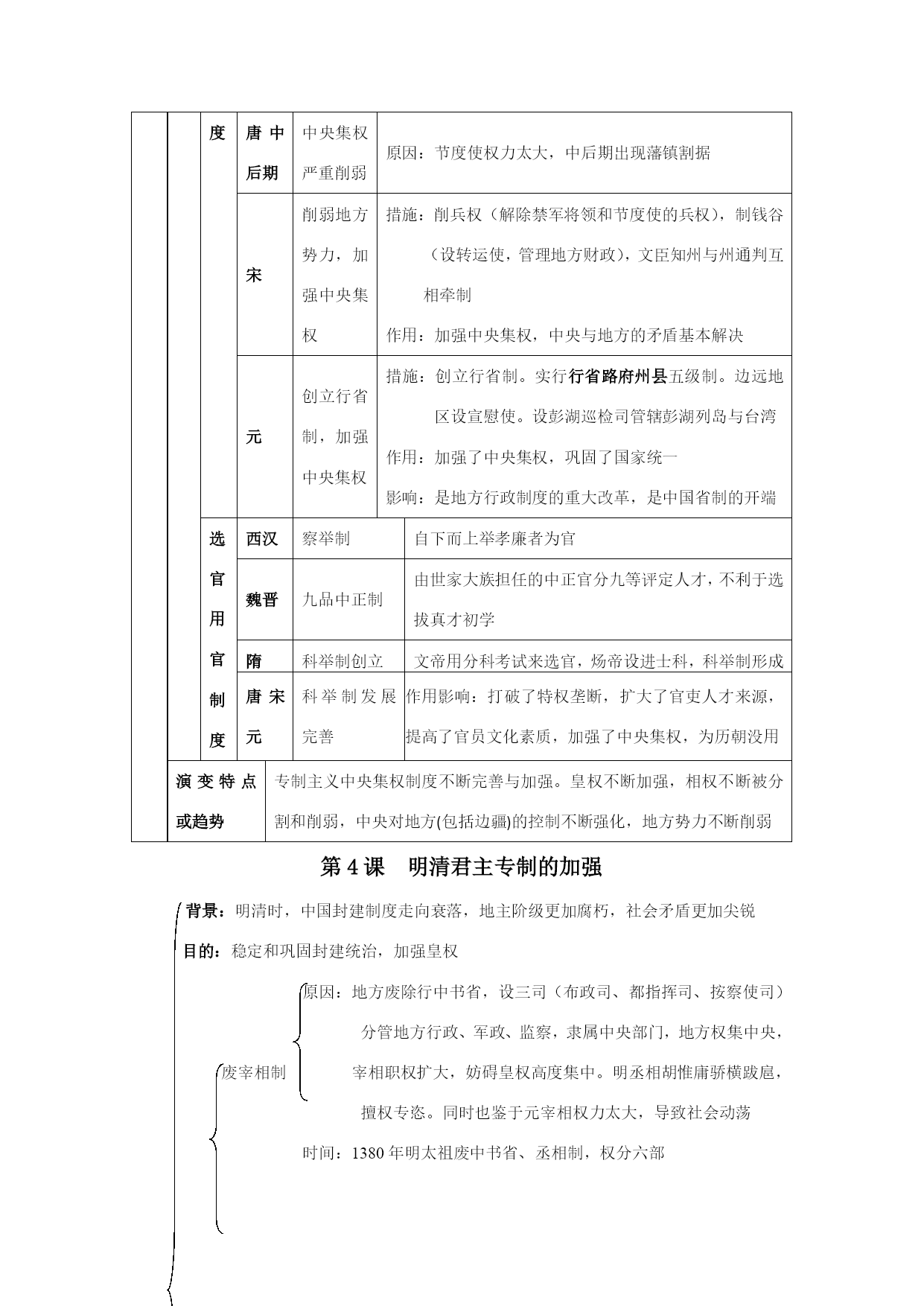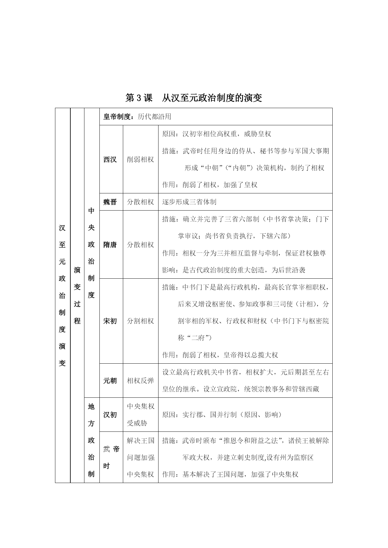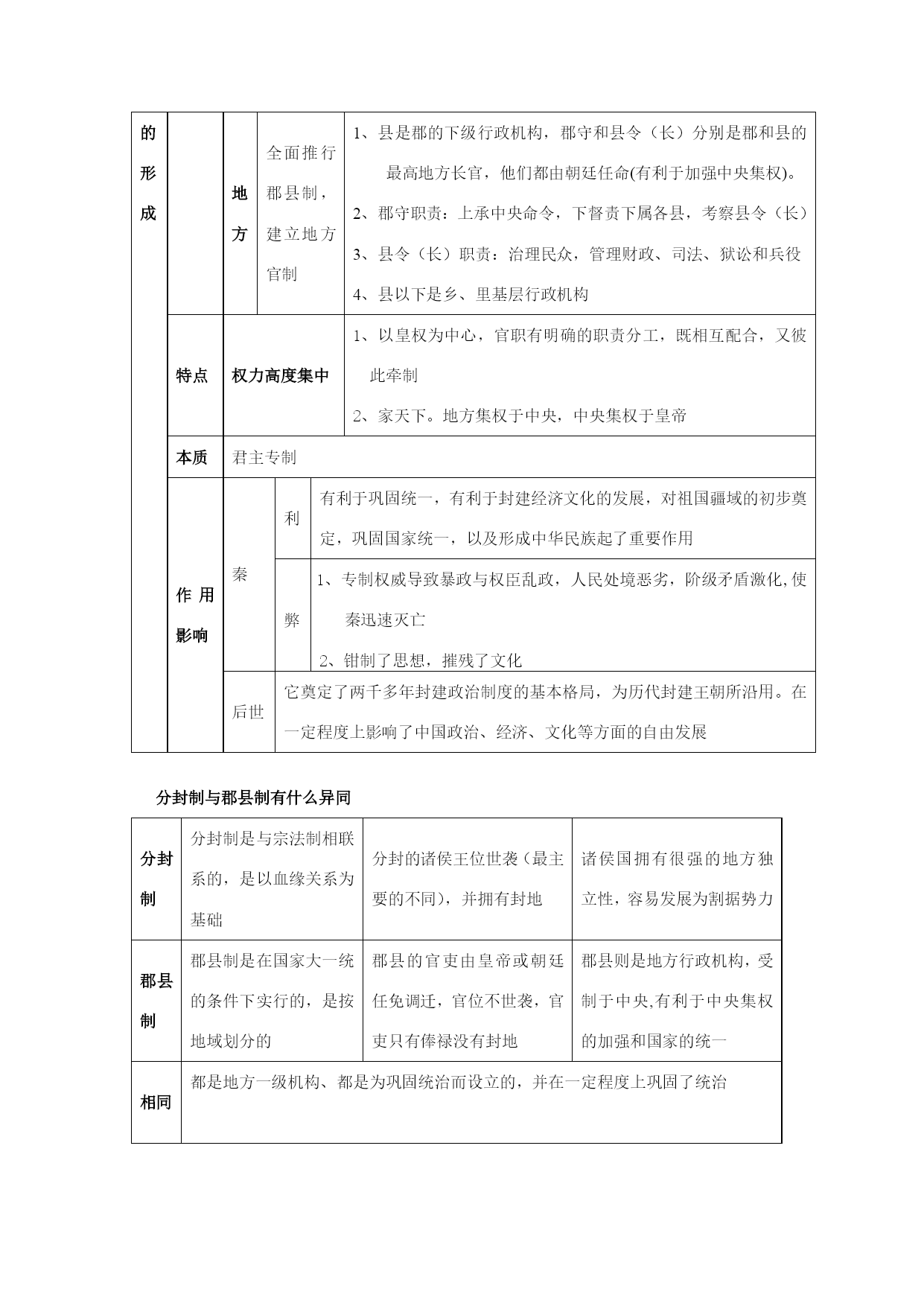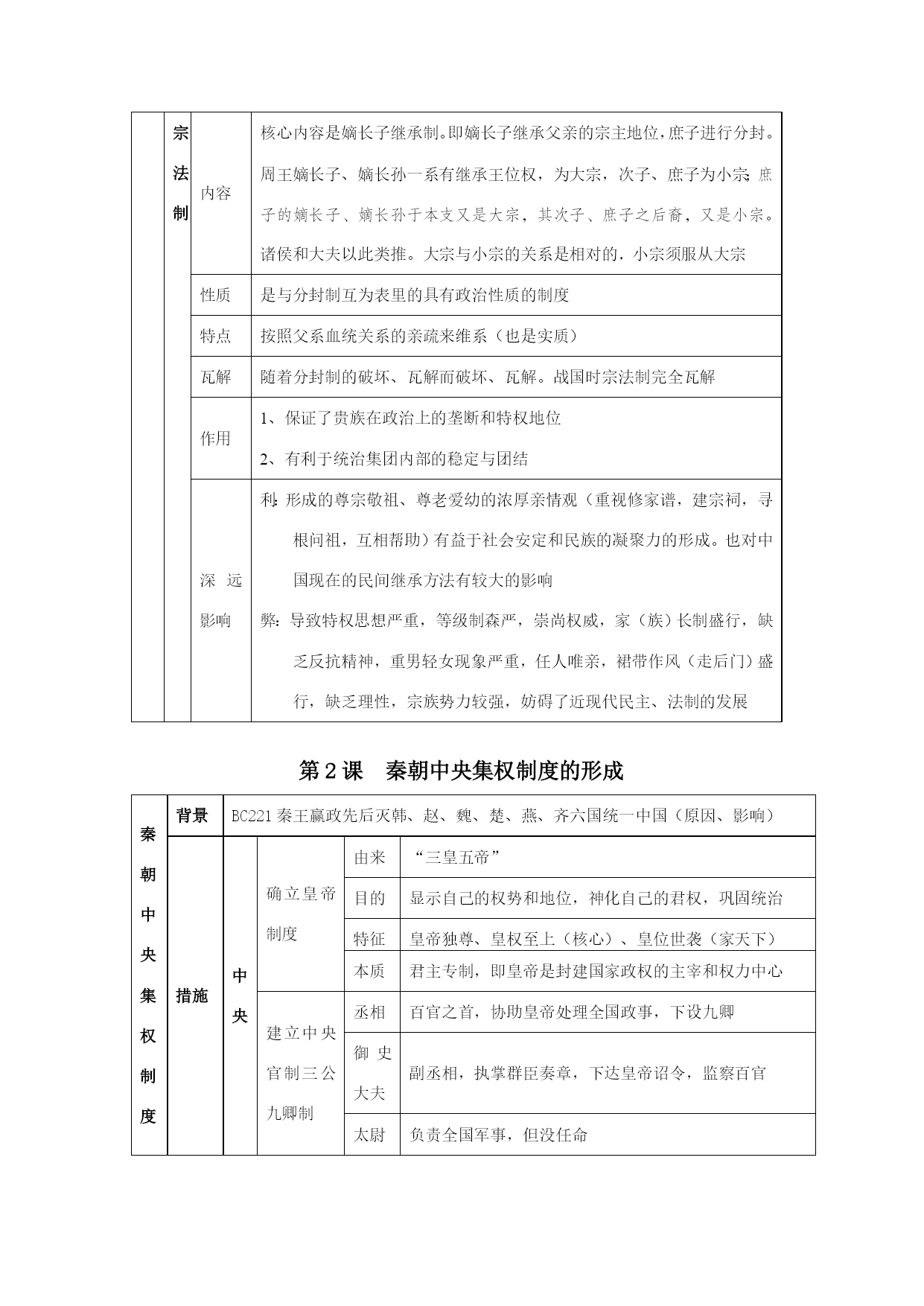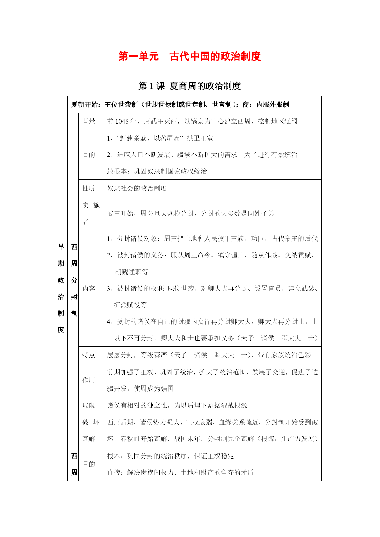 第一单元古代中国的政治制度 第1课夏商周的政治制度 早期政治制度夏朝开始:王位世袭制(世卿世禄制或世定制、世官制);商:内服外服制西周分封制背景前1046年,周武王灭商,以镐京为中心建立西周,控制地区辽阔目的1、“封建亲戚,以藩屏周”拱卫王室 2、适应人口不断发展、疆域不断扩大的需求,为了进行有效统治 最根本:巩固奴隶制国家政权统治性质奴隶社会的政治制度实施者武王开始,周公旦大规模分封。分封的大多数是同姓子弟内容1、分封诸侯对象:周王把土地和人民授于王族、功臣、古代帝王的后代 2、被封诸侯的义务:服从周王命令、镇守疆土、随从作战、交纳贡赋、朝觐述职等 3、被封诸侯的权利:职位世袭、对卿大夫再分封、设置官员、建立武装、征派赋役等 4、受封的诸侯在自己的封疆内实行再分封卿大夫,卿大夫再分封士,士以下不再分封。卿大夫和士也要承担义务(天子-诸侯-卿大夫-士)特点层层分封,等级森严(天子-诸侯-卿大夫-士),带有家族统治色彩作用前期加强了王权,巩固了统治,扩大了统治范围,发展了交通,促进了边疆开发,使周成为强国局限诸侯有相对的独立性,为以后埋下割据混战根源破坏瓦解西周后期,诸侯势力强大,王权衰弱,血缘关系疏远,分封制开始受到破坏。春秋时开始瓦解,战国末年,分封制完全瓦解(根源:生产力发展)西周宗法制目的根本:巩固分封的统治秩序,保证王权稳定 直接:解决贵族间权力、土地和财产的争夺的矛盾内容核心内容是嫡长子继承制。即嫡长子继承父亲的宗主地位,庶子进行分封。周王嫡长子、嫡长孙一系有继承王位权,为大宗,次子、庶子为小宗;庶子的嫡长子、嫡长孙于本支又是大宗,其次子、庶子之后裔,又是小宗。诸侯和大夫以此类推。大宗与小宗的关系是相对的,小宗须服从大宗性质是与分封制互为表里的具有政治性质的制度特点按照父系血统关系的亲疏来维系(也是实质)瓦解随着分封制的破坏、瓦解而破坏、瓦解。战国时宗法制完全瓦解作用1、保证了贵族在政治上的垄断和特权地位 2、有利于统治集团内部的稳定与团结深远影响利:形成的尊宗敬祖、尊老爱幼的浓厚亲情观(重视修家谱,建宗祠,寻根问祖,互相帮助)有益于社会安定和民族的凝聚力的形成。也对中国现在的民间继承方法有较大的影响 弊:导致特权思想严重,等级制森严,崇尚权威,家(族)长制盛行,缺乏反抗精神,重男轻女现象严重,任人唯亲,裙带作风(走后门)盛行,缺乏理性,宗族势力较强,妨碍了近现代民主、法制的发展 第2课秦朝中央集权制度的形成 秦朝中央集权制度的形成背景BC221秦王赢政先后灭韩、赵、魏、楚、燕、齐六国统一中国(原因、影响)措施中央确立皇帝制度由来“三皇五帝”目的显示自己的权势和地位,神化自己的君权,巩固统治特征皇帝独尊、皇权至上(核心)、皇位世袭(家天下)本质君主专制,即皇帝是封建国家政权的主宰和权力中心建立中央官制三公九卿制丞相百官之首,协助皇帝处理全国政事,下设九卿御史大夫副丞相,执掌群臣奏章,下达皇帝诏令,监察百官太尉负责全国军事,但没任命地方全面推行郡县制,建立地方官制1、县是郡的下级行政机构,郡守和县令(长)分别是郡和县的最高地方长官,他们都由朝廷任命(有利于加强中央集权)。 2、郡守职责:上承中央命令,下督责下属各县,考察县令(长)3、县令(长)职责:治理民众,管理财政、司法、狱讼和兵役 4、县以下是乡、里基层行政机构特点权力高度集中1、以皇权为中心,官职有明确的职责分工,既相互配合,又彼此牵制 2、家天下。地方集权于中央,中央集权于皇帝本质君主专制作用影响秦利有利于巩固统一,有利于封建经济文化的发展,对祖国疆域的初步奠定,巩固国家统一,以及形成中华民族起了重要作用弊1、专制权威导致暴政与权臣乱政,人民处境恶劣,阶级矛盾激化,使秦迅速灭亡 2、钳制了思想,摧残了文化后世它奠定了两千多年封建政治制度的基本格局,为历代封建王朝所沿用。在一定程度上影响了中国政治、经济、文化等方面的自由发展 分封制与郡县制有什么异同 分封制分封制是与宗法制相联系的,是以血缘关系为基础分封的诸侯王位世袭(最主要的不同),并拥有封地诸侯国拥有很强的地方独立性,容易发展为割据势力郡县制郡县制是在国家大一统的条件下实行的,是按地域划分的郡县的官吏由皇帝或朝廷任免调迁,官位不世袭,官吏只有俸禄没有封地郡县则是地方行政机构,受制于中央,有利于中央集权的加强和国家的统一相同都是地方一级机构、都是为巩固统治而设立的,并在一定程度上巩固了统治 第3课从汉至元政治制度的演变 汉至元政治制度演变演变过程中央政治制度皇帝制度:历代都沿用西汉削弱相权原因:汉初宰相位高权重,威胁皇权 措施:武帝时任用身边的侍从、秘书等参与军国大事期形成“中朝”(“内朝”)决策机构,制约了相权 作用:削弱了相权,加强了皇权魏晋分散相权逐步形成三省体制隋唐分散相权措施:确立并完