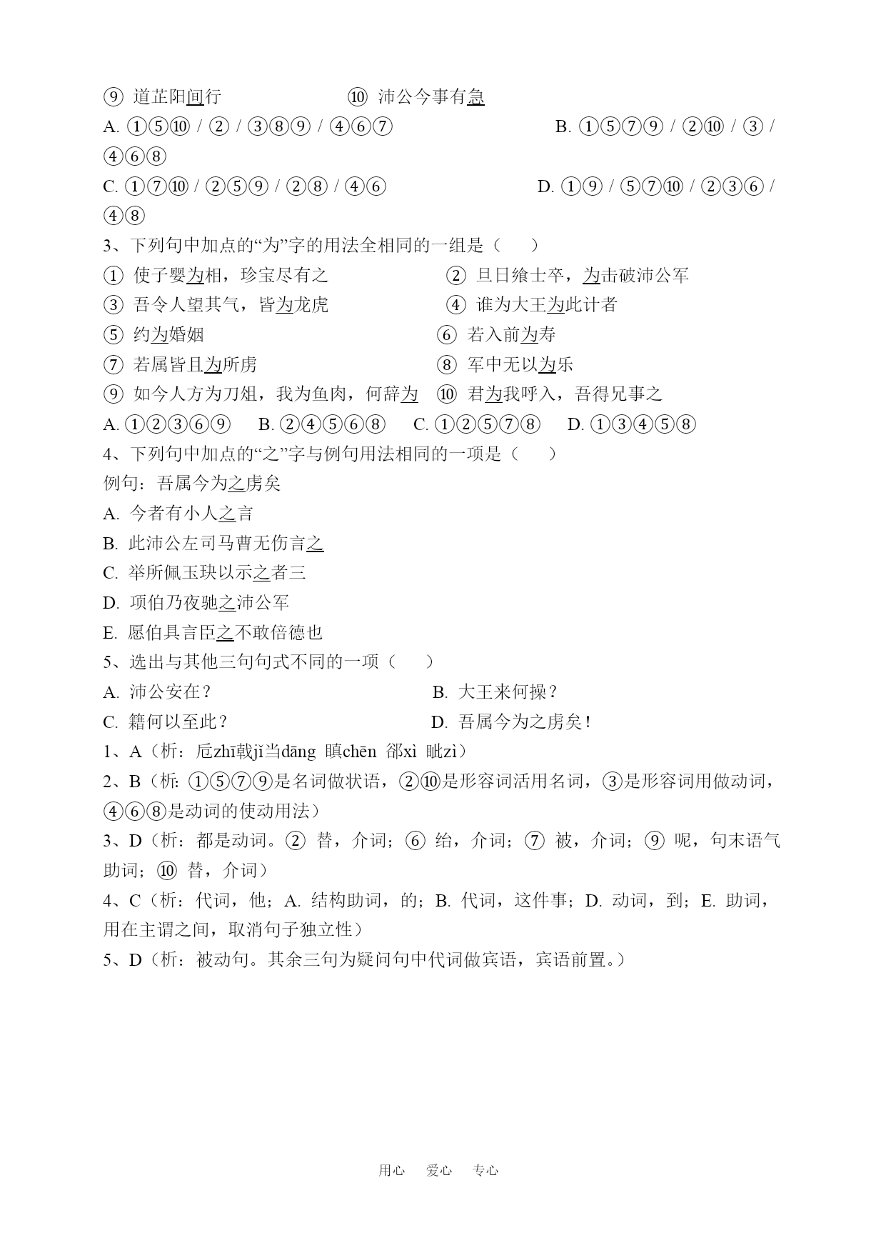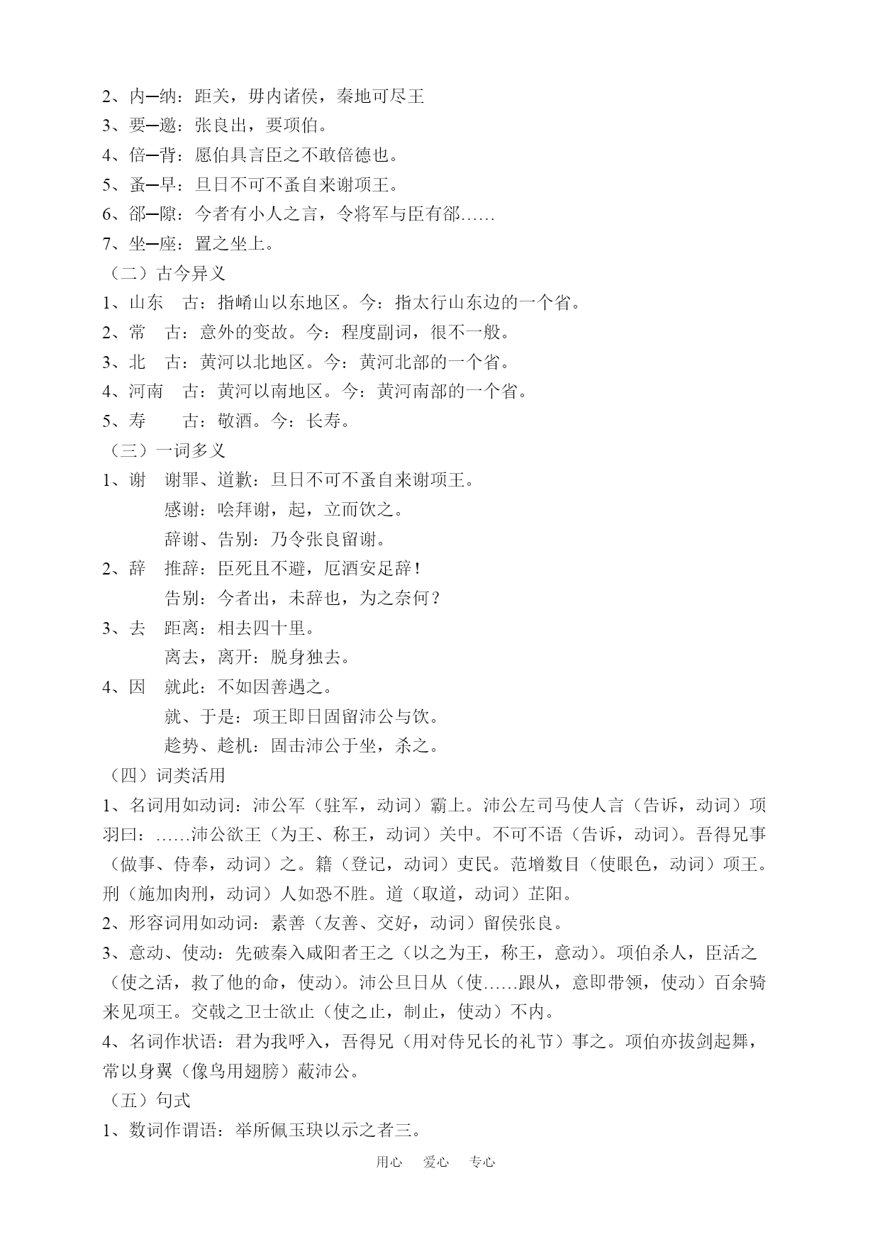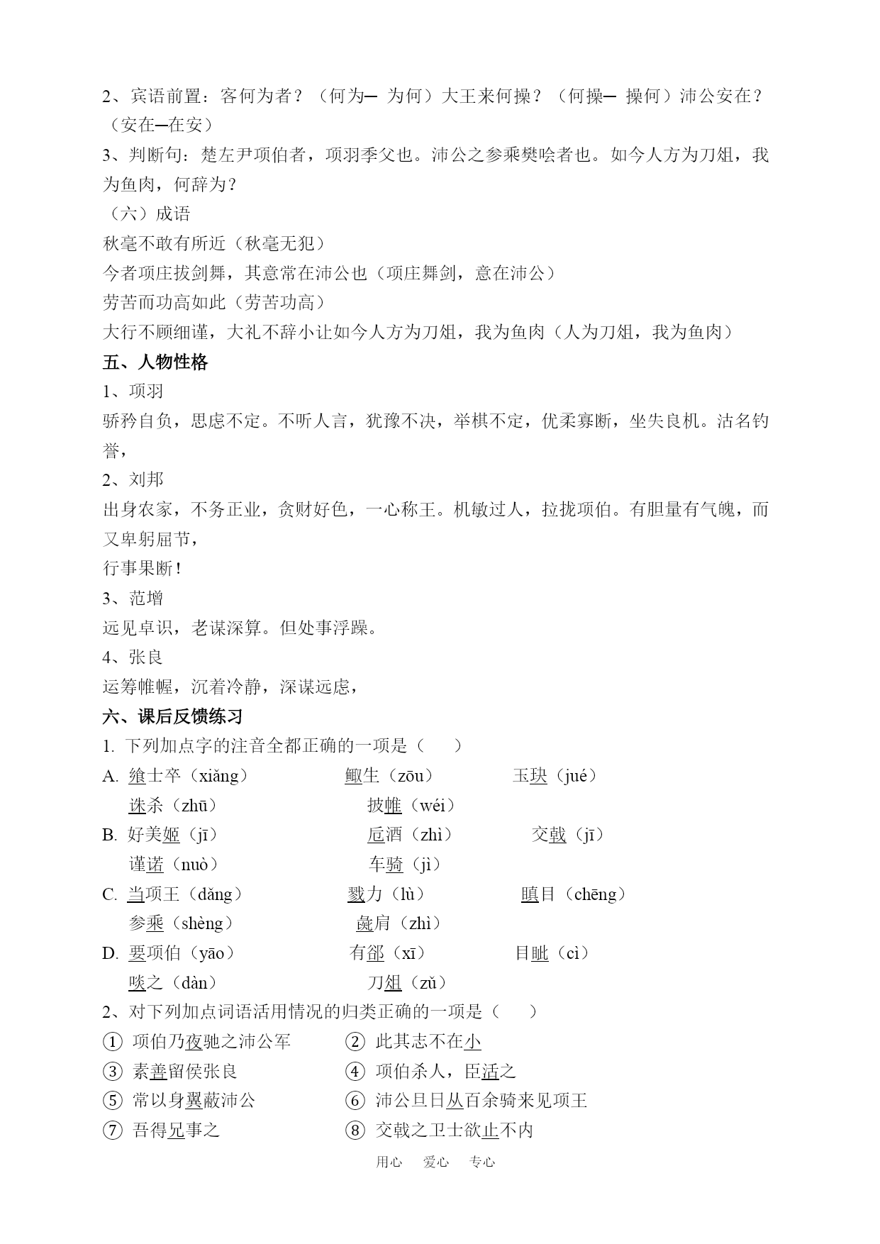 用心爱心专心 鸿门宴 【复习目标】。 1、掌握重要字、词的用法。 2、理解重要语句。 3、人物形象分析。 【复习设想】 1、通过对关键语句的点评,理解作者的写作意图。 2、通过反馈练习提高学生理解水平。 【复习课时】 两课时 【复习过程】 一、作者与《史记》 司马迁(约前145-前80或前135-前93)字子长,西汉夏阳(今陕西韩城南)人。承继其父遗志,著《太史公书》(即《史记》),后因替降子匈奴的李陵辩解,而受腐刑下狱。出狱后任中书令,发愤著述,完成《史记》。 《史记》由十二“本纪”、十“表”、八“书”、三十“世家”、七十“列传”,计一百三十篇,五十二万余字,记黄帝至汉武帝太初年间史事。鲁迅先生曾誉它为“史家之绝唱,无韵之《离骚》。”这正说明了《史记》在史学和文学上的伟大成就。 二、时代背景 “鸿门宴”这个历史事件发生于公元前206年(即陈涉起义后的第三年),地点在现在陕西省临潼市新丰镇附近的“项王营”,当时叫“鸿门”。这是刘邦、项羽在推翻秦王朝后,为了争夺农民起义军胜利果实而展开的第一场惊心动魄的斗争。当时刘弱项强,在双方力量极为悬殊的情况下,刘邦冒险到项营,骗取项羽的信任,经过种种斗智斗勇的艰难曲折的斗争。终于脱险逃归营地。 三、段落大意 全文共有七段,可按照“鸿门宴”的前后过程,分为宴前、宴会上与宴会后三个部分。 第一部分(第1、2段)宴前。写宴会前刘、项两军驻地、力量对比、事件的起因及双方的幕后活动。 第二部分(第3、4段)宴会上。写鸿门宴上双方的尖锐斗争。这部分是课文的重点,情节的高潮。 第三部分(第5、6、7段)宴后。写刘邦脱身逃走,张良入谢与刘邦诛杀内奸。这是情节的结束与尾声 四、字、词、句复习 (一)通假字、异体字 1、距─拒:距关,毋内诸侯,秦地可尽王也。 2、内─纳:距关,毋内诸侯,秦地可尽王 3、要─邀:张良出,要项伯。 4、倍─背:愿伯具言臣之不敢倍德也。 5、蚤─早:旦日不可不蚤自来谢项王。 6、郤─隙:今者有小人之言,令将军与臣有郤…… 7、坐─座:置之坐上。 (二)古今异义 1、山东古:指崤山以东地区。今:指太行山东边的一个省。 2、常古:意外的变故。今:程度副词,很不一般。 3、北古:黄河以北地区。今:黄河北部的一个省。 4、河南古:黄河以南地区。今:黄河南部的一个省。 5、寿古:敬酒。今:长寿。 (三)一词多义 1、谢谢罪、道歉:旦日不可不蚤自来谢项王。 感谢:哙拜谢,起,立而饮之。 辞谢、告别:乃令张良留谢。 2、辞推辞:臣死且不避,厄酒安足辞! 告别:今者出,未辞也,为之奈何? 3、去距离:相去四十里。 离去,离开:脱身独去。 因就此:不如因善遇之。 就、于是:项王即日固留沛公与饮。 趁势、趁机:固击沛公于坐,杀之。 (四)词类活用 1、名词用如动词:沛公军(驻军,动词)霸上。沛公左司马使人言(告诉,动词)项羽曰:……沛公欲王(为王、称王,动词)关中。不可不语(告诉,动词)。吾得兄事(做事、侍奉,动词)之。籍(登记,动词)吏民。范增数目(使眼色,动词)项王。刑(施加肉刑,动词)人如恐不胜。道(取道,动词)芷阳。 2、形容词用如动词:素善(友善、交好,动词)留侯张良。 3、意动、使动:先破秦入咸阳者王之(以之为王,称王,意动)。项伯杀人,臣活之(使之活,救了他的命,使动)。沛公旦日从(使……跟从,意即带领,使动)百余骑来见项王。交戟之卫士欲止(使之止,制止,使动)不内。 4、名词作状语:君为我呼入,吾得兄(用对侍兄长的礼节)事之。项伯亦拔剑起舞,常以身翼(像鸟用翅膀)蔽沛公。 (五)句式 1、数词作谓语:举所佩玉玦以示之者三。 2、宾语前置:客何为者?(何为─为何)大王来何操?(何操─操何)沛公安在?(安在─在安) 3、判断句:楚左尹项伯者,项羽季父也。沛公之参乘樊哙者也。如今人方为刀俎,我为鱼肉,何辞为? (六)成语 秋毫不敢有所近(秋毫无犯) 今者项庄拔剑舞,其意常在沛公也(项庄舞剑,意在沛公) 劳苦而功高如此(劳苦功高) 大行不顾细谨,大礼不辞小让如今人方为刀俎,我为鱼肉(人为刀俎,我为鱼肉) 五、人物性格 1、项羽 骄矜自负,思虑不定。不听人言,犹豫不决,举棋不定,优柔寡断,坐失良机。沽名钓誉, 2、刘邦 出身农家,不务正业,贪财好色,一心称王。机敏过人,拉拢项伯。有胆量有气魄,而又卑躬屈节, 行事果断! 3、范增 远见卓识,老谋深算。但处事浮躁。 4、张良 运筹帷幄,沉着冷静,深谋远虑, 六、课后反馈练习 1.下列加点字的注音全都正确的一项是() A.飨士卒(xiǎng)鲰生(zōu)玉玦(jué) 诛杀(zhū)披帷(wéi) B.好美姬(jī)卮酒(zhì)交戟(jī) 谨诺(nuò)车骑(jì) C.当项王(dǎng)戮力(lù)瞋目(chēng) 参乘(shè