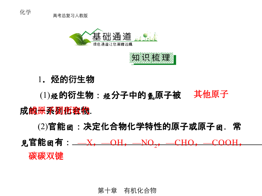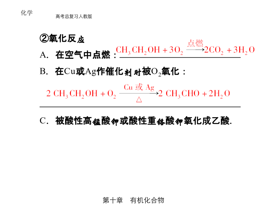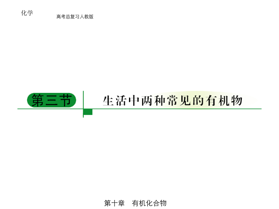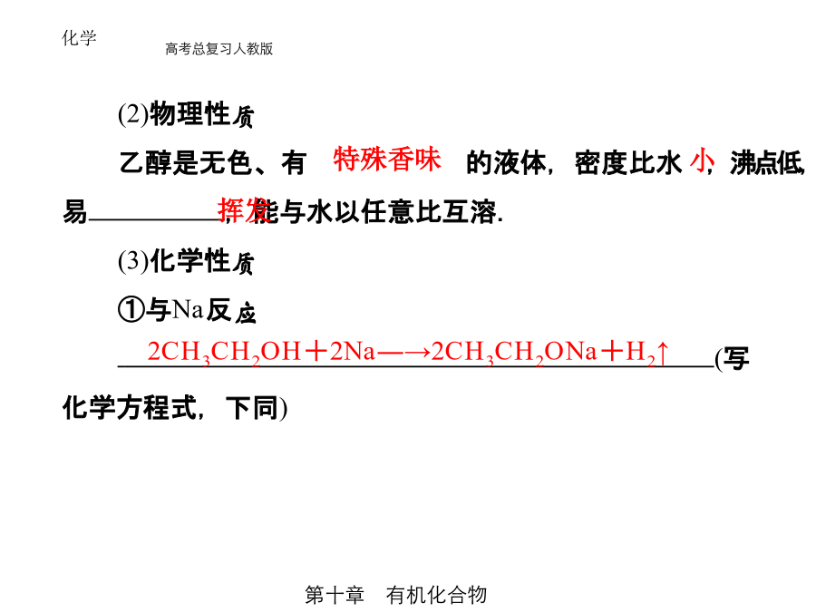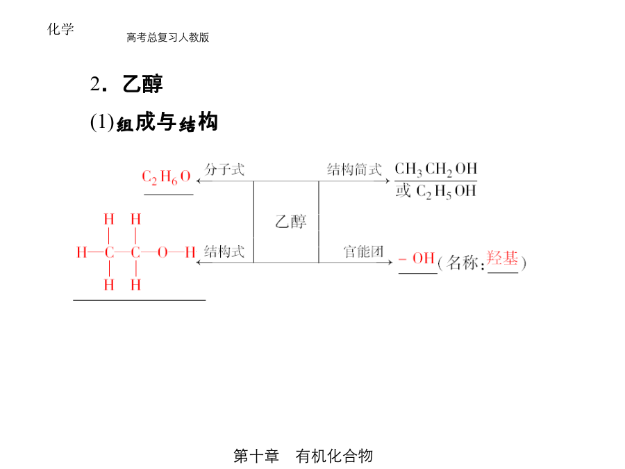 1.烃的衍生物 (1)烃的衍生物:烃分子中的氢原子被 而生成的一系列化合物. (2)官能团:决定化合物化学特性的原子或原子团.常见官能团有: 等.(写出常见的六种)2.乙醇 (1)组成与结构(2)物理性质 乙醇是无色、有 的液体,密度比水 ,沸点低,易 ,能与水以任意比互溶. (3)化学性质 ①与Na反应 (写化学方程式,下同)②氧化反应 A.在空气中点燃: B.在Cu或Ag作催化剂时被O2氧化: C.被酸性高锰酸钾或酸性重铬酸钾氧化成乙酸.3.乙酸 (1)组成与结构(2)物理性质 乙酸是有 气味的 色液体,熔点 ,易溶于 . (3)化学性质 ①酸的通性 A.使石蕊试液 . B.与NaHCO3反应:CH3COOH+ NaHCO3===CH3COONa+CO2↑+H2O(说明酸性:CH3COOHH2CO3)②酯化反应:与CH3CH2OH反应:CH3COOH+CH3CH2OH . 1.乙醇分子中各种化学键如图所示.关于乙醇在下列反应中断键情况的说法中不正确的是 () A.与金属钠反应时键①断裂 B.与乙酸发生酯化反应时键①断裂 C.与浓硫酸共热到170℃时键③、④断裂 D.在铜催化下与氧气反应时键①、③断裂 解析:与浓H2SO4共热制得 乙烯,发生断键的部位是键②、④. 答案:C2.用括号中的试剂和方法除去各物质中的少量杂质,正确的是 () A.苯中的甲苯(溴水、分液) B.乙醇中的乙酸(NaOH溶液,分液) C.乙醇中的水(新制CaO,蒸馏) D.乙酸乙酯中的乙酸(NaOH溶液,分液) 解析:除杂的要求:既要把杂质除去,又不能引入新的杂质且原物质不能被消耗.苯中的甲苯用溴水不能除去;乙醇与NaOH溶液不分层;乙酸乙酯在碱性条件下易水解;乙醇中的水可用CaO吸收,然后蒸馏提纯. 答案:C3.在同温同压下,某有机物和过量Na反应得到V1L氢气,另一份等量的有机物和足量的NaHCO3反应得V2L二氧化碳,若V1=V2≠0,则此有机物可能是()解析:Na既能与羟基反应,又能与羧基反应.NaHCO3只与羧基反应,不与羟基反应.因此,能使生成的CO2与H2的量相等的只有A项. 答案:A 1.结构 (1)与活泼金属反应产生H2:断裂共价键①. (2)在Cu、Ag等催化作用下被氧化:断裂共价键①和③.(3)与CH3COOH等发生酯化反应:断裂共价键①. (4)在浓H2SO4存在下加热到170℃制取乙烯:断裂共价键②和④. (5)在浓H2SO4存在下加热到140℃生成乙醚:断裂共价键①和②. (6)与HX作用生成卤代烃:断裂共价键②. (7)在空气中燃烧:断裂共价键①②③④.3.羟基性质的比较[例题1]下列说法错误的是 () A.乙醇和乙酸都是常用调味品的主要成分 B.乙醇和乙酸的沸点和熔点都比C2H6、C2H4的沸点和熔点高 C.乙醇和乙酸都能发生氧化反应 D.乙醇和乙酸之间能发生酯化反应,酯化反应和皂化反应互为逆反应点拨:解答该题时要依据结构决定性质的规律来辨析,同时要注意酯化反应的实质及皂化反应的特点. 解析:乙醇和乙酸都是常用调味品的主要成分,A正确.从分子的结构或性质(状态)可确定乙醇和乙酸的沸点和熔点都比C2H6和C2H4的沸点和熔点高,B正确.乙醇和乙酸都能发生氧化反应,如燃烧等,C正确.酯化反应是指醇羟基与酸羟基之间的脱水反应,而皂化反应是专指高级脂肪酸甘油酯在碱性条件下的水解反应,二者发生的条件也不同,不是互为逆反应,D错误. 答案:D 右图所示是某有机分子的比例模型,黑色的是碳原子,白色的是氢原子,灰色的是氧原子.对该物质下列说法正确的是 () A.该物质的水溶液可除去水瓶胆中的水垢 B.该物质是室内装潢的夹板中 散发出的一种对人体有害的气体 C.它与乙醇混合加热就能产生具有水果香味的物质 D.该物质属于电解质,在熔融状态下可导电解析:由图示可知,该有机分子的结构简式为 ,即为乙酸.A项中,乙酸水溶液可溶解水垢中的CaCO3、Mg(OH)2;B项中,室内装潢的夹板中散发出的对人体有害的气体主要是甲醛、苯等;C项中,乙酸和乙醇发生酯化反应需要加入浓硫酸加热才能进行;D项中,乙酸属共价化合物类电解质,熔融状态下不能导电. 答案:A 1.实验原理 CH3COOH+HOCH2CH3 CH3COOCH2CH3+H2O (1)反应实质:酸去羟基醇去氢.证明: (2)反应类型:取代反应. (3)反应特点:可逆反应.2.实验装置 (1)装置如图所示(2)装置特点 ①大试管倾斜成45°角,目的是增大受热面积. ②导气管较长及倾斜,目的是导气兼冷凝回流. ③导气管末端刚好与液面接触,以防倒吸.3.实