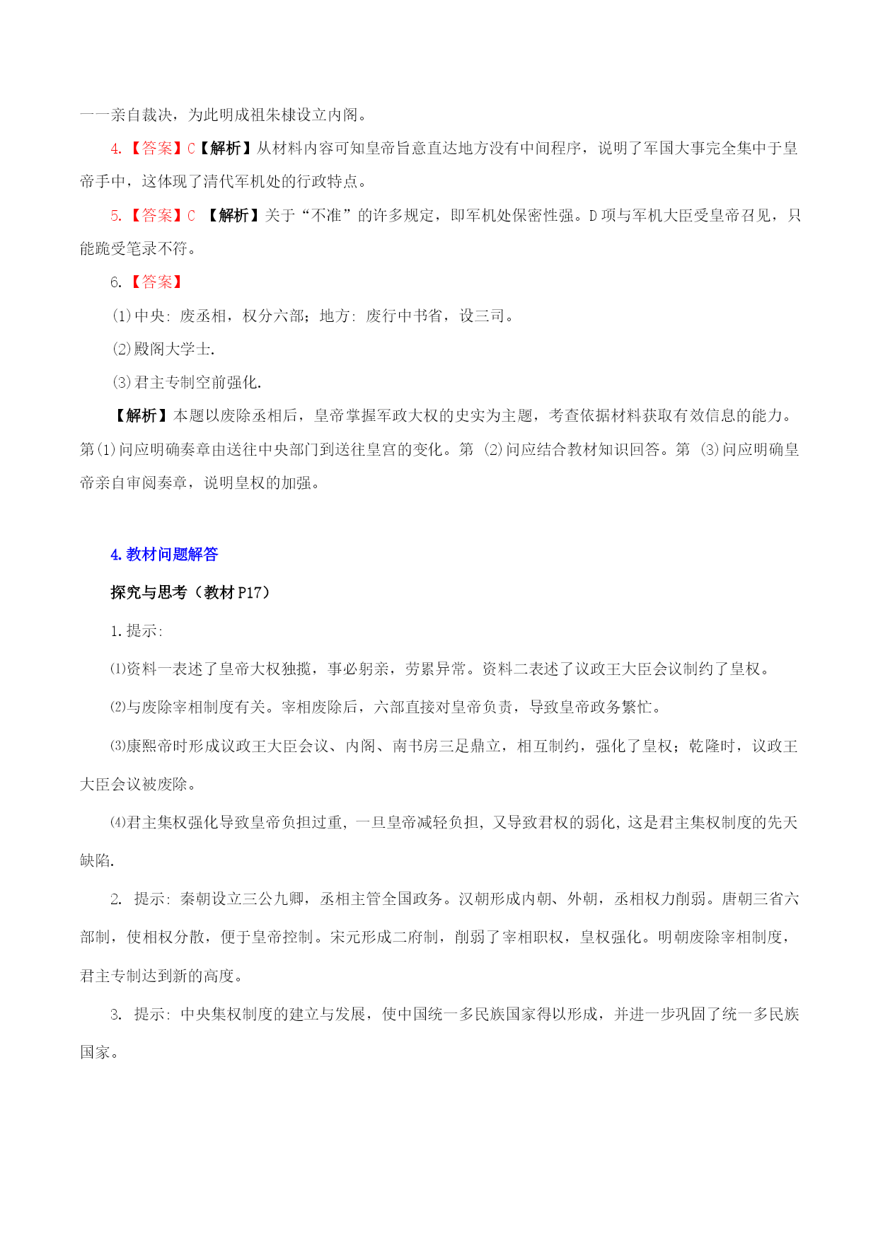 1.4明清中央集权制度的强化(教学素材) 1.黄宗羲在《明夷待访录》中说:“有明之无善治,自高皇帝罢丞相始也。”材料中的“高皇帝”应该是指 A.汉高祖B.明太祖C.宋高宗D.唐太宗 2.“胡惟庸绝不是朱元璋的真正目标,朱元璋要毁灭的是胡惟庸背后的那个庞然大物。”“那个庞然大物”是指 A.内阁制度B.宰相制度C.宦官集团D.胡惟庸集团 3.据史料记载,从明太祖洪武十七年九月十四日至二十一日的八天内,内外诸司送到皇宫的奏章多达1460件。在这样的背景下,为有效处理政务,后来明成祖朱棣采取的措施是 A.设立中朝B.设立丞相C.设立内阁D.设立军机处 4.“(封函传递迟速)判明于函外,曰马上飞递者,不过日行三百里。有紧急则另判日行里数,或四五百里,或六百里,并有六百里加快者。即此一事,已为前代未有者。”按这样的方式和速度传达皇帝“谕旨”的是 A.唐朝的尚书省B.明朝的内阁C.清朝的军机处D.清朝的议政王大臣会议 5.据清《养吉斋丛录》载:凡军机大臣只准在军机处输本日所奉谕旨,部院稿案不准在军机处输,司员不准至军机处启事,军机章京办事处(章京系专职办事官员)不许闲人窥视,王以下及文武大臣不准至军机处与军机大臣谈论。这是说军机处 A.效率高B.机构干练C.保密性强D.决策权有限 6.阅读下列材料: 据史料记载,从明太祖洪武十七年九月十四日到二十一日的八天内,内外诸司送到皇宫的奏章共1160件,这些奏章有讲一件事的,也有讲两三件事的,共计有3291件事,皇帝平均一天要处理411件事。 (1)大量奏章送达皇宫,是因朱元璋对“内外诸司”(中央、地方行政部门)作了哪些改革? (2)什么人协助朱元璋处理如此多的奏章? (3)这则材料反映了明朝皇权的什么特点? 2.随堂训练答案 1.【答案】B【解析】明朝时明太祖下令罢除丞相职位,成为定制。 2.【答案】B【解析】朱元璋要废除的是对皇权构成威胁的宰相制度,而不是仅限于胡惟庸本人或者胡惟庸集团,故B项为正确选项。 3.【答案】C【解析】明太祖废除丞相后,重要政务都要由皇帝亲自处理,由于事务繁多,皇帝不可能一一亲自裁决,为此明成祖朱棣设立内阁。 4.【答案】C【解析】从材料内容可知皇帝旨意直达地方没有中间程序,说明了军国大事完全集中于皇帝手中,这体现了清代军机处的行政特点。 5.【答案】C【解析】关于“不准”的许多规定,即军机处保密性强。D项与军机大臣受皇帝召见,只能跪受笔录不符。 6.【答案】 (1)中央:废丞相,权分六部;地方:废行中书省,设三司。 (2)殿阁大学士. (3)君主专制空前强化. 【解析】本题以废除丞相后,皇帝掌握军政大权的史实为主题,考查依据材料获取有效信息的能力。第(1)问应明确奏章由送往中央部门到送往皇宫的变化。第(2)问应结合教材知识回答。第(3)问应明确皇帝亲自审阅奏章,说明皇权的加强。 4.教材问题解答 探究与思考(教材P17) 1.提示: ⑴资料一表述了皇帝大权独揽,事必躬亲,劳累异常。资料二表述了议政王大臣会议制约了皇权。 ⑵与废除宰相制度有关。宰相废除后,六部直接对皇帝负责,导致皇帝政务繁忙。 ⑶康熙帝时形成议政王大臣会议、内阁、南书房三足鼎立,相互制约,强化了皇权;乾隆时,议政王大臣会议被废除。 ⑷君主集权强化导致皇帝负担过重,一旦皇帝减轻负担,又导致君权的弱化,这是君主集权制度的先天缺陷. 2.提示:秦朝设立三公九卿,丞相主管全国政务。汉朝形成内朝、外朝,丞相权力削弱。唐朝三省六部制,使相权分散,便于皇帝控制。宋元形成二府制,削弱了宰相职权,皇权强化。明朝废除宰相制度,君主专制达到新的高度。 3.提示:中央集权制度的建立与发展,使中国统一多民族国家得以形成,并进一步巩固了统一多民族国家。