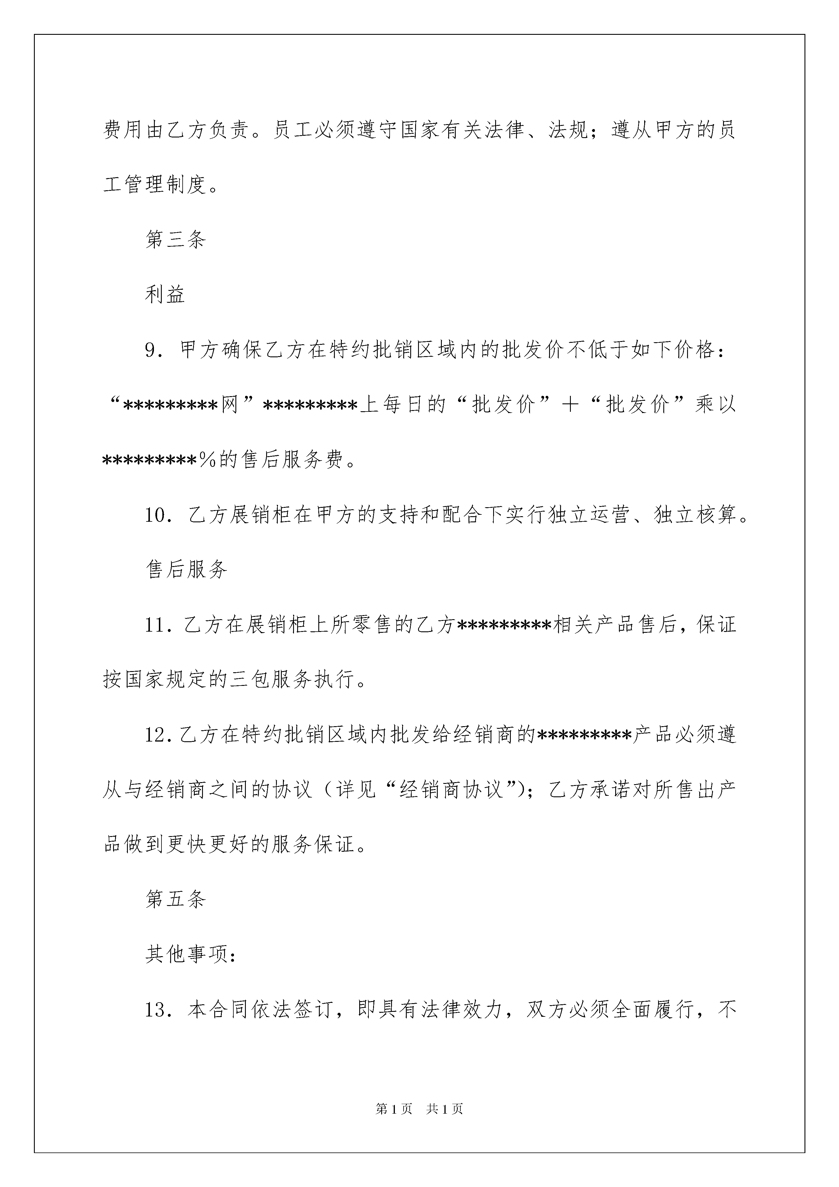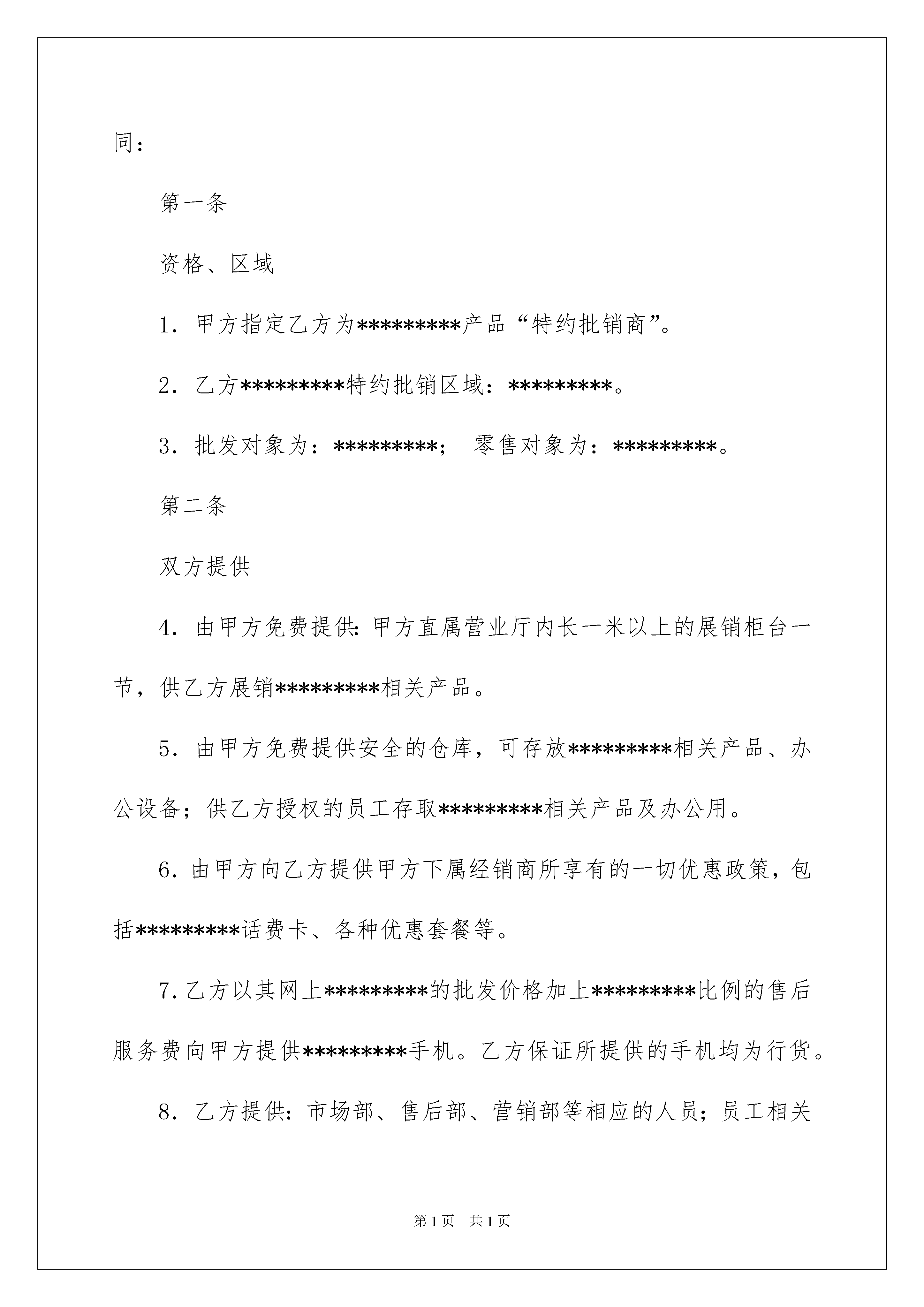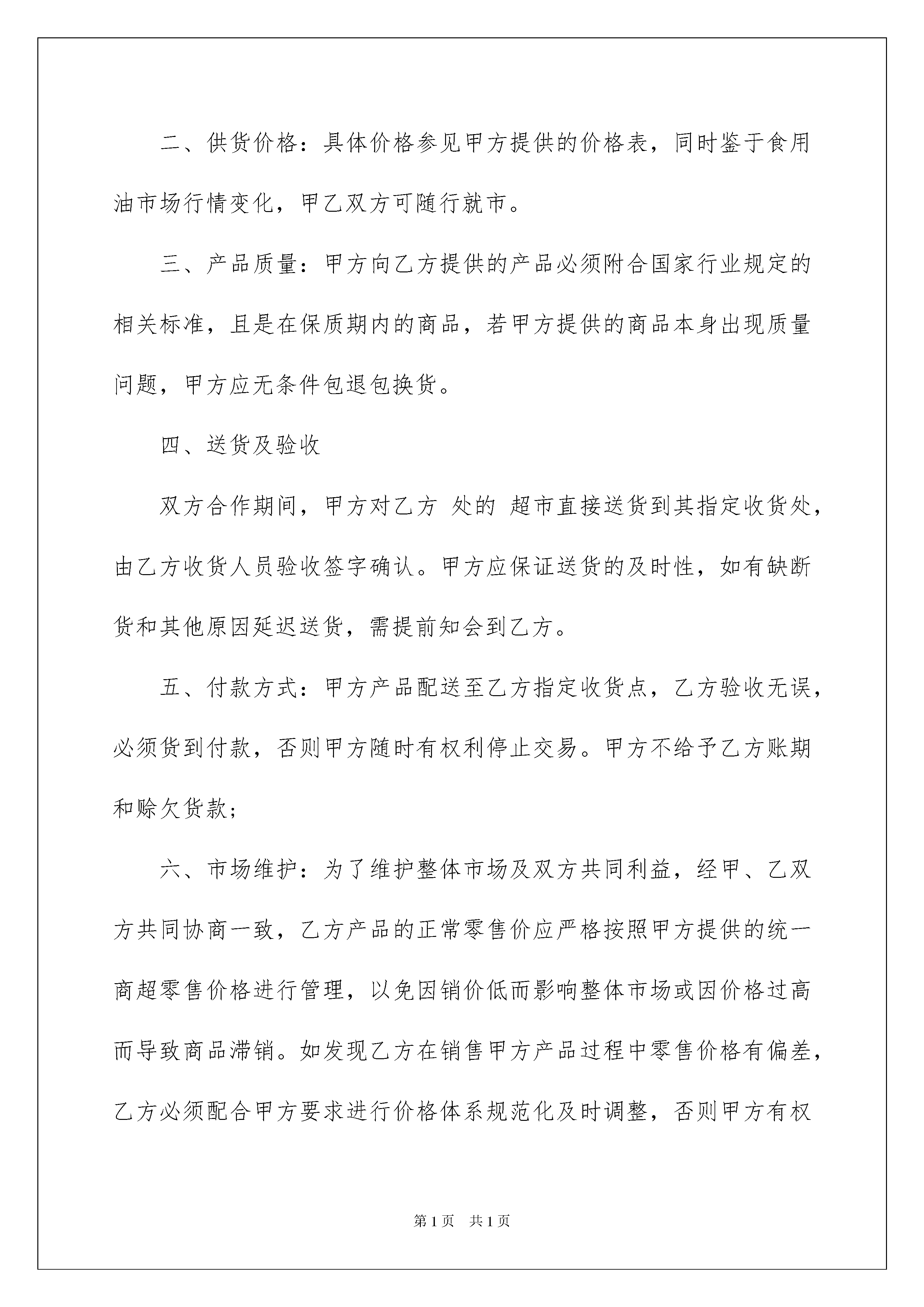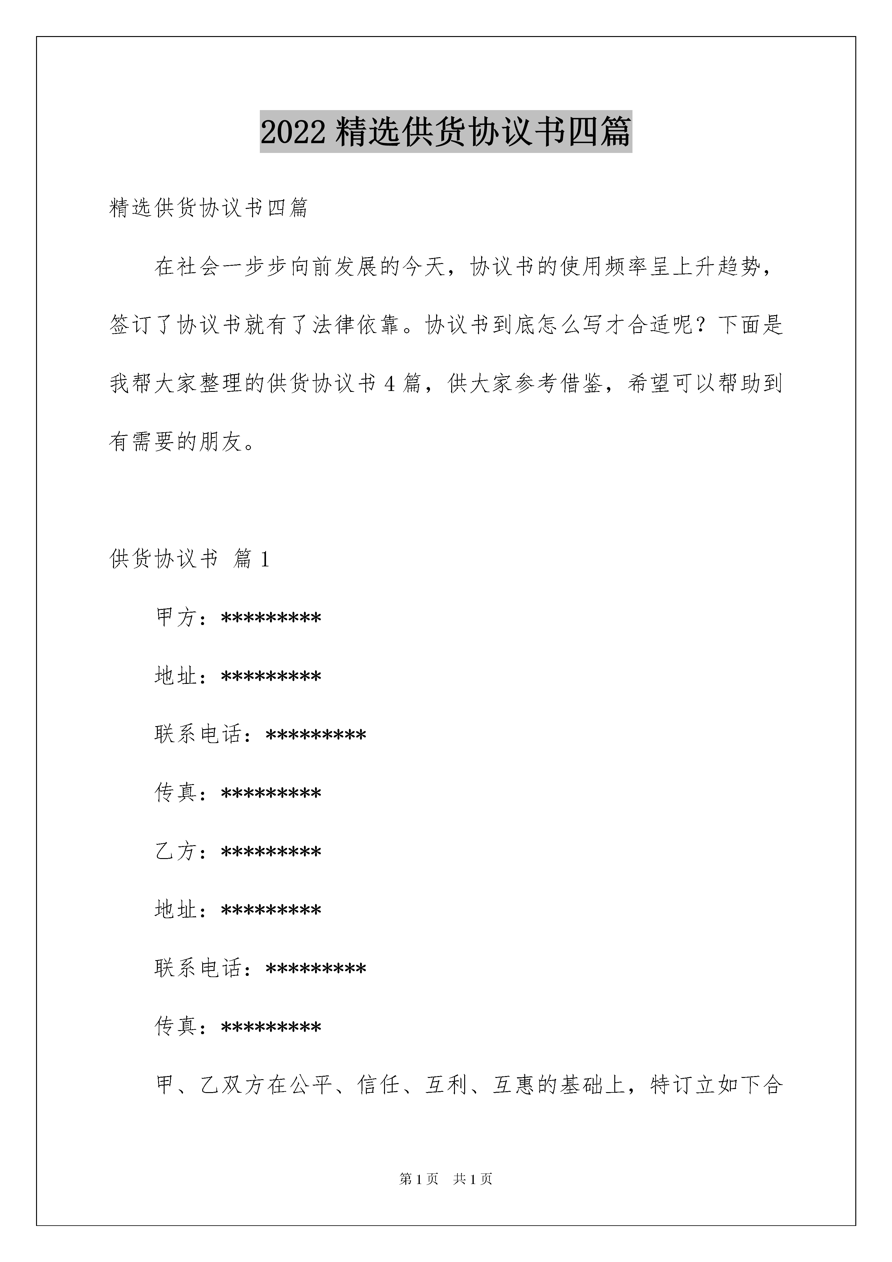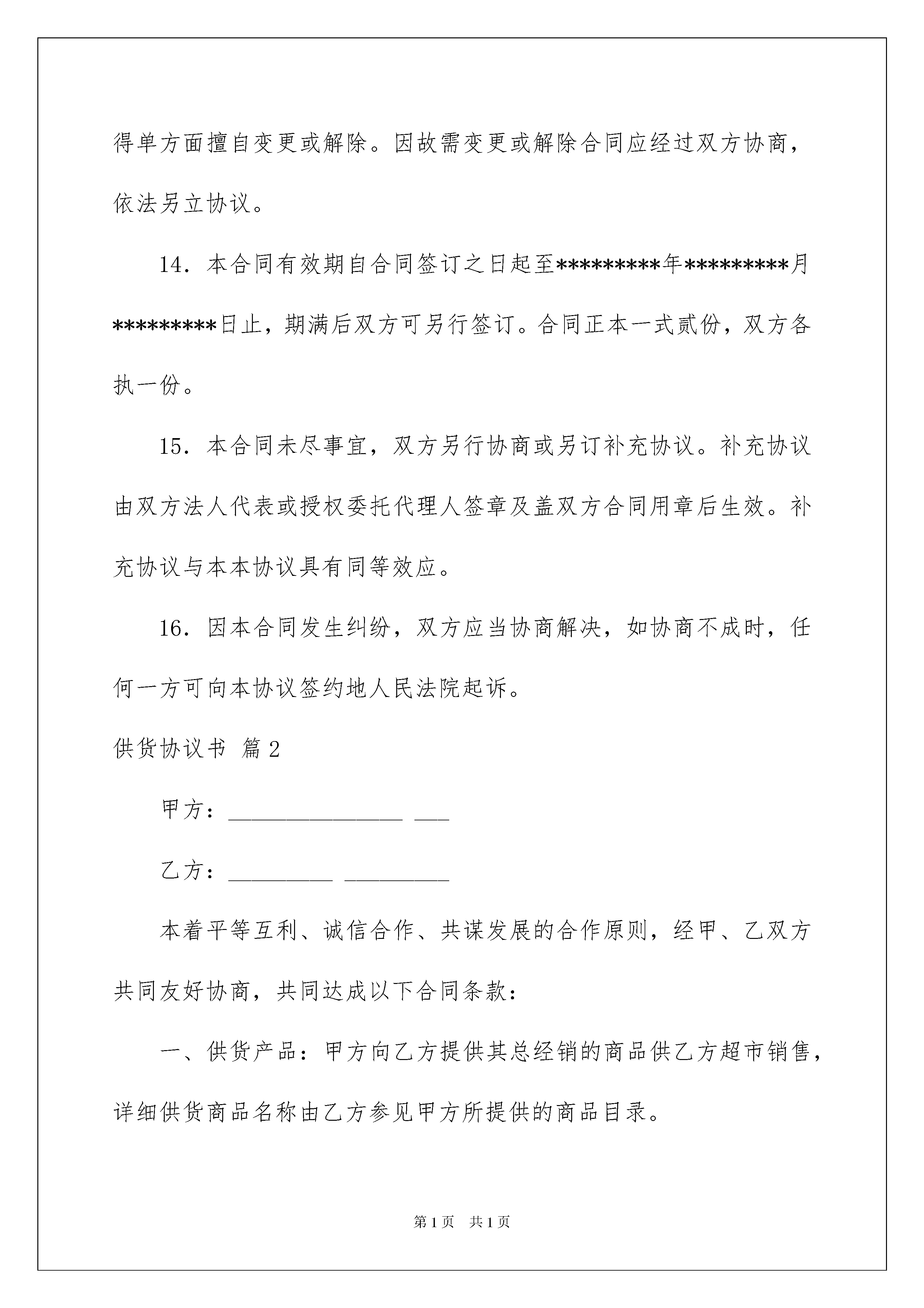 2022精选供货协议书四篇精选供货协议书四篇在社会一步步向前发展的今天,协议书的使用频率呈上升趋势,签订了协议书就有了法律依靠。协议书到底怎么写才合适呢?下面是我帮大家整理的供货协议书4篇,供大家参考借鉴,希望可以帮助到有需要的朋友。供货协议书篇1甲方:*********地址:*********联系电话:*********传真:*********乙方:*********地址:*********联系电话:*********传真:*********甲、乙双方在公平、信任、互利、互惠的基础上,特订立如下合同:第一条资格、区域1.甲方指定乙方为*********产品“特约批销商”。2.乙方*********特约批销区域:*********。3.批发对象为:*********;零售对象为:*********。第二条双方提供4.由甲方免费提供:甲方直属营业厅内长一米以上的展销柜台一节,供乙方展销*********相关产品。5.由甲方免费提供安全的仓库,可存放*********相关产品、办公设备;供乙方授权的员工存取*********相关产品及办公用。6.由甲方向乙方提供甲方下属经销商所享有的一切优惠政策,包括*********话费卡、各种优惠套餐等。7.乙方以其网上*********的批发价格加上*********比例的售后服务费向甲方提供*********手机。乙方保证所提供的手机均为行货。8.乙方提供:市场部、售后部、营销部等相应的人员;员工相关费用由乙方负责。员工必须遵守国家有关法律、法规;遵从甲方的员工管理制度。第三条利益9.甲方确保乙方在特约批销区域内的批发价不低于如下价格:“*********网”*********上每日的“批发价”+“批发价”乘以*********%的售后服务费。10.乙方展销柜在甲方的支持和配合下实行独立运营、独立核算。售后服务11.乙方在展销柜上所零售的乙方*********相关产品售后,保证按国家规定的三包服务执行。12.乙方在特约批销区域内批发给经销商的*********产品必须遵从与经销商之间的协议(详见“经销商协议”);乙方承诺对所售出产品做到更快更好的服务保证。第五条其他事项:13.本合同依法签订,即具有法律效力,双方必须全面履行,不得单方面擅自变更或解除。因故需变更或解除合同应经过双方协商,依法另立协议。14.本合同有效期自合同签订之日起至*********年*********月*********日止,期满后双方可另行签订。合同正本一式贰份,双方各执一份。15.本合同未尽事宜,双方另行协商或另订补充协议。补充协议由双方法人代表或授权委托代理人签章及盖双方合同用章后生效。补充协议与本本协议具有同等效应。16.因本合同发生纠纷,双方应当协商解决,如协商不成时,任何一方可向本协议签约地人民法院起诉。供货协议书篇2甲方:__________________乙方:__________________本着平等互利、诚信合作、共谋发展的合作原则,经甲、乙双方共同友好协商,共同达成以下合同条款:一、供货产品:甲方向乙方提供其总经销的商品供乙方超市销售,详细供货商品名称由乙方参见甲方所提供的商品目录。二、供货价格:具体价格参见甲方提供的价格表,同时鉴于食用油市场行情变化,甲乙双方可随行就市。三、产品质量:甲方向乙方提供的产品必须附合国家行业规定的相关标准,且是在保质期内的商品,若甲方提供的商品本身出现质量问题,甲方应无条件包退包换货。四、送货及验收双方合作期间,甲方对乙方处的超市直接送货到其指定收货处,由乙方收货人员验收签字确认。甲方应保证送货的及时性,如有缺断货和其他原因延迟送货,需提前知会到乙方。五、付款方式:甲方产品配送至乙方指定收货点,乙方验收无误,必须货到付款,否则甲方随时有权利停止交易。甲方不给予乙方账期和赊欠货款;六、市场维护:为了维护整体市场及双方共同利益,经甲、乙双方共同协商一致,乙方产品的正常零售价应严格按照甲方提供的统一商超零售价格进行管理,以免因销价低而影响整体市场或因价格过高而导致商品滞销。如发现乙方在销售甲方产品过程中零售价格有偏差,乙方必须配合甲方要求进行价格体系规范化及时调整,否则甲方有权单方停止供货。七、退换货规定1.仅限于甲方供应乙方商品在正常陈列和销售中超过2/3货龄的滞销产品,甲方给予乙方同品类、规格新货调换,不允许该商品无故下架撤货,因甲方供应工厂停止生产的品类,甲方需告知乙方。乙方自行采购商品和非甲方供应商品,甲方不负责调换和退货。2.因乙方超市自身管理不慎和过失导致的产品外包装损坏、渗漏、霉变、破袋、过期、丢失