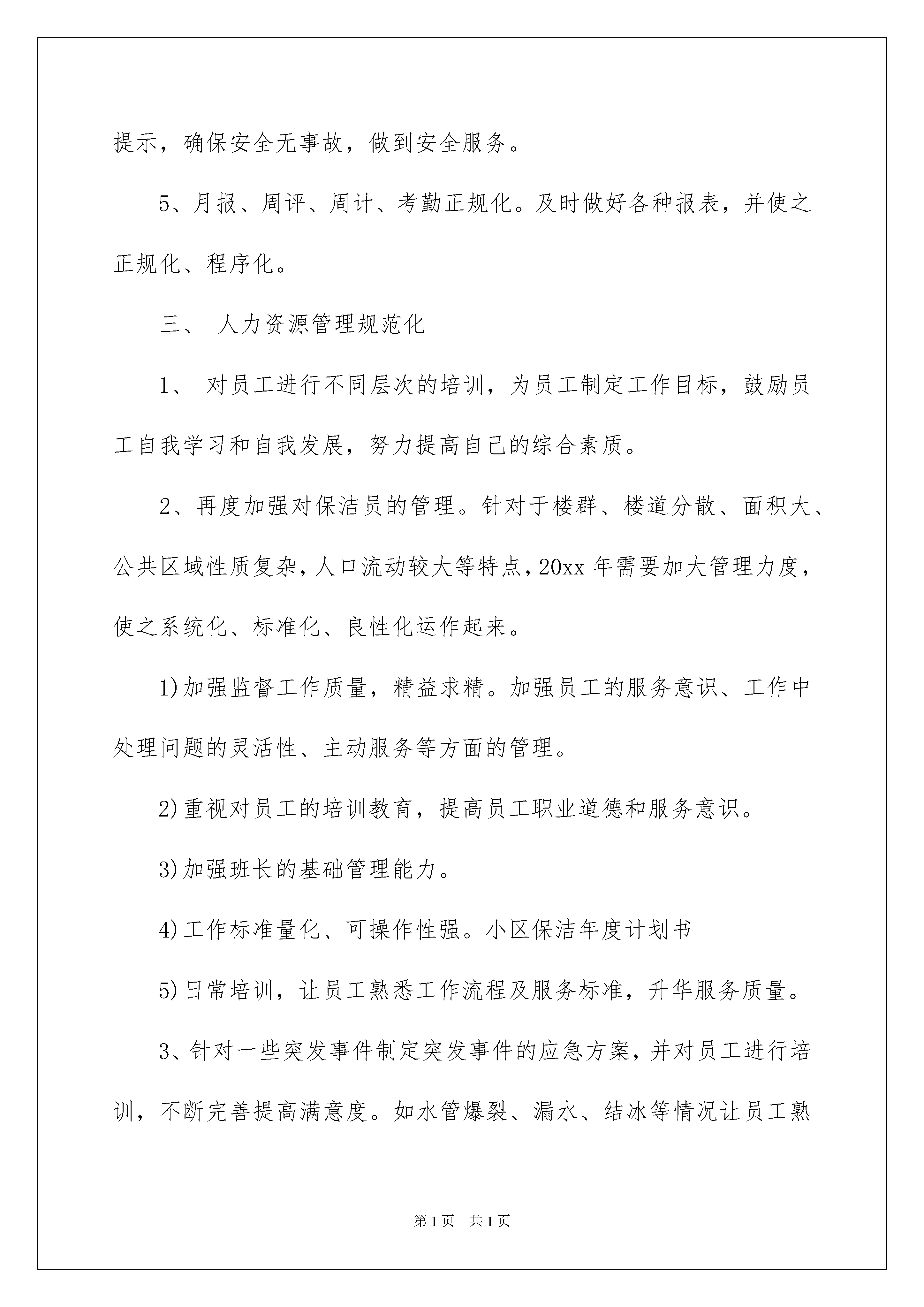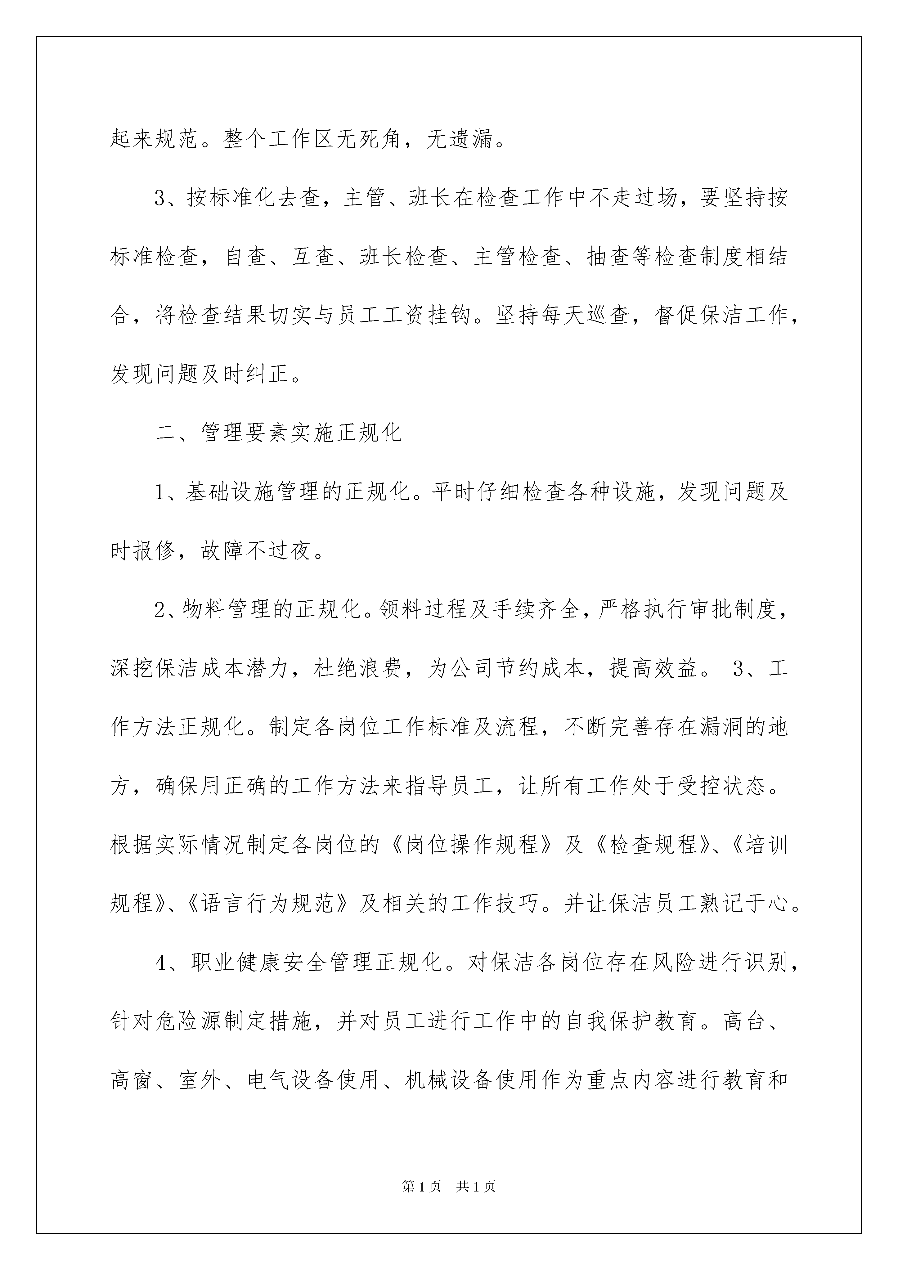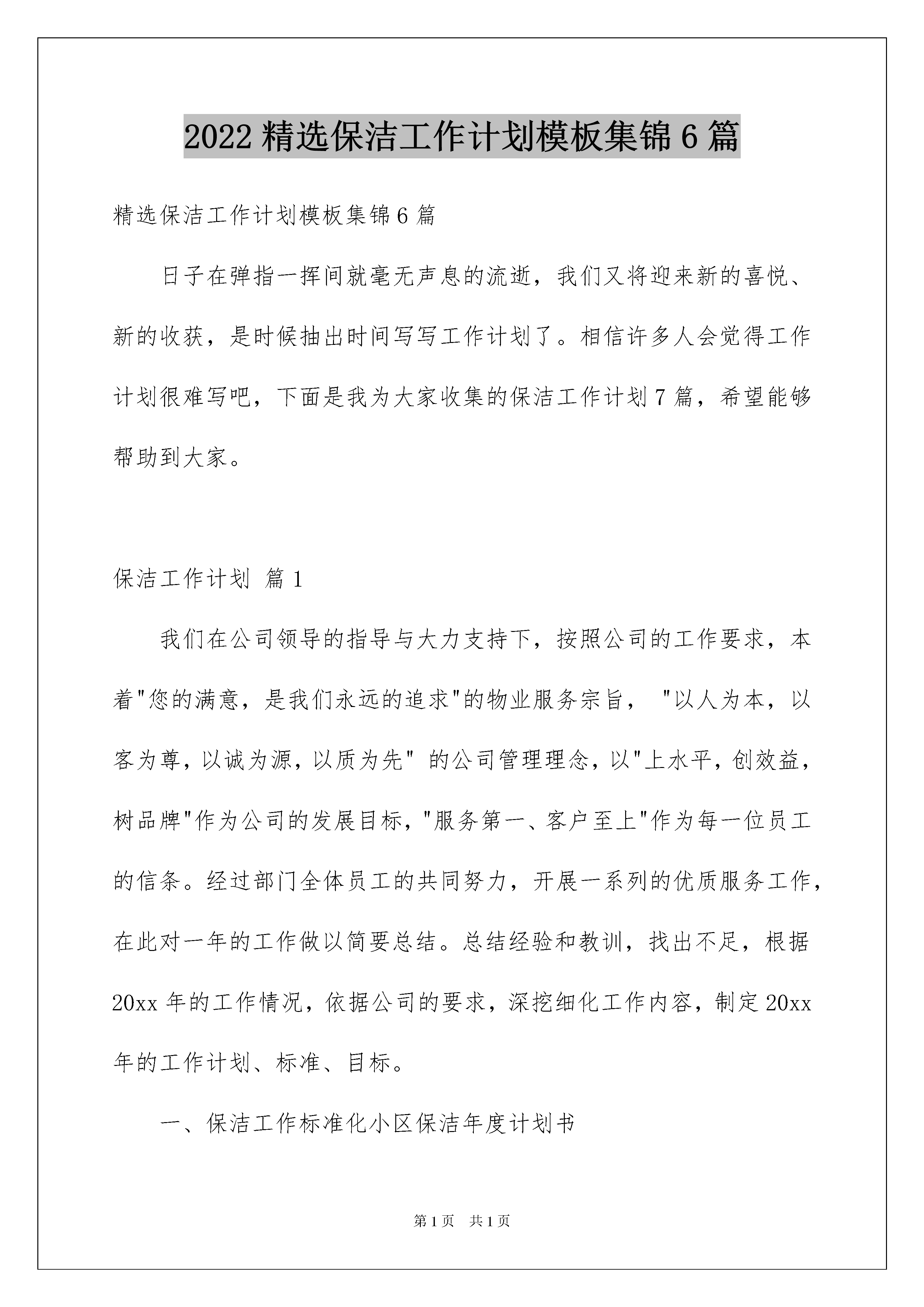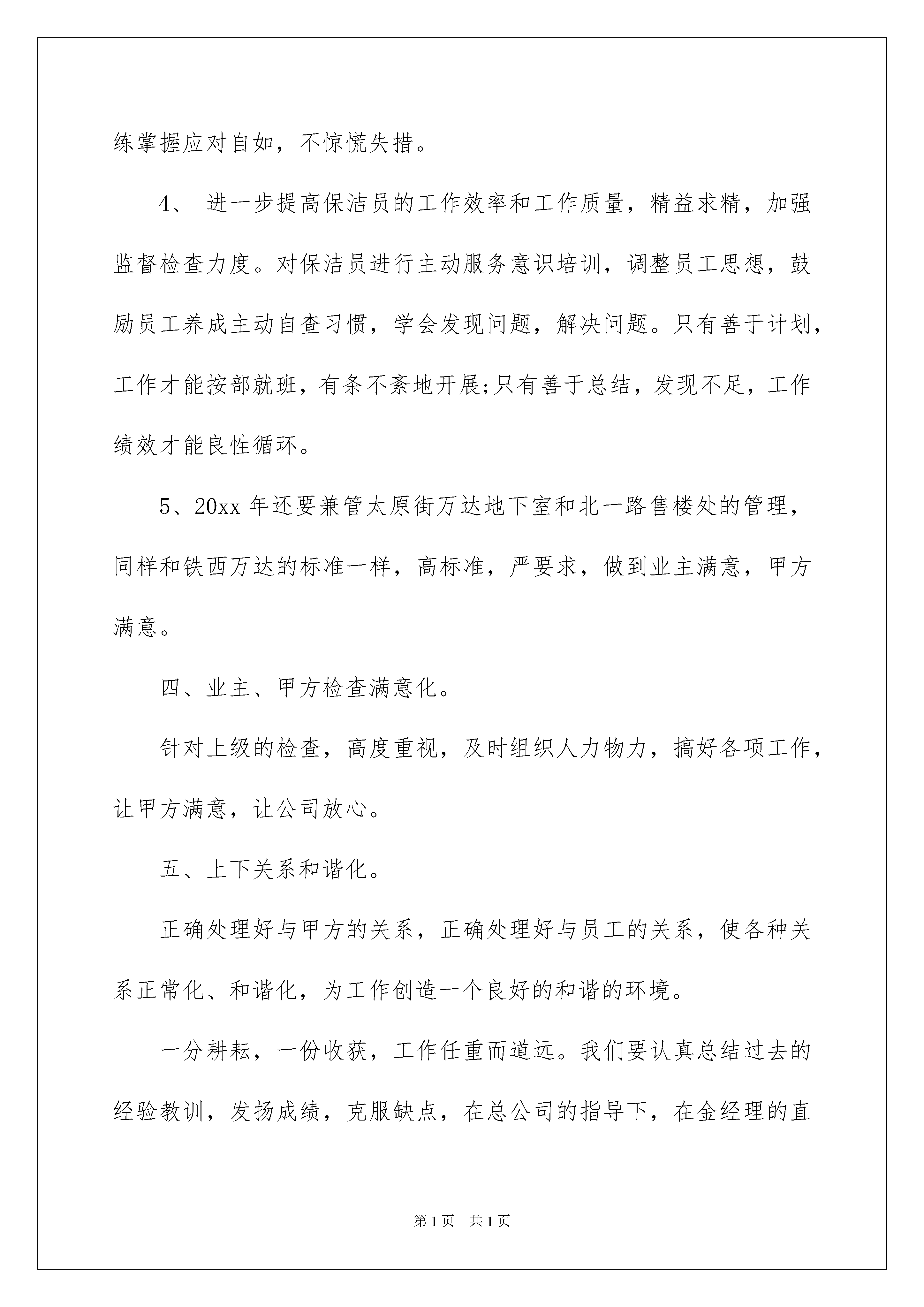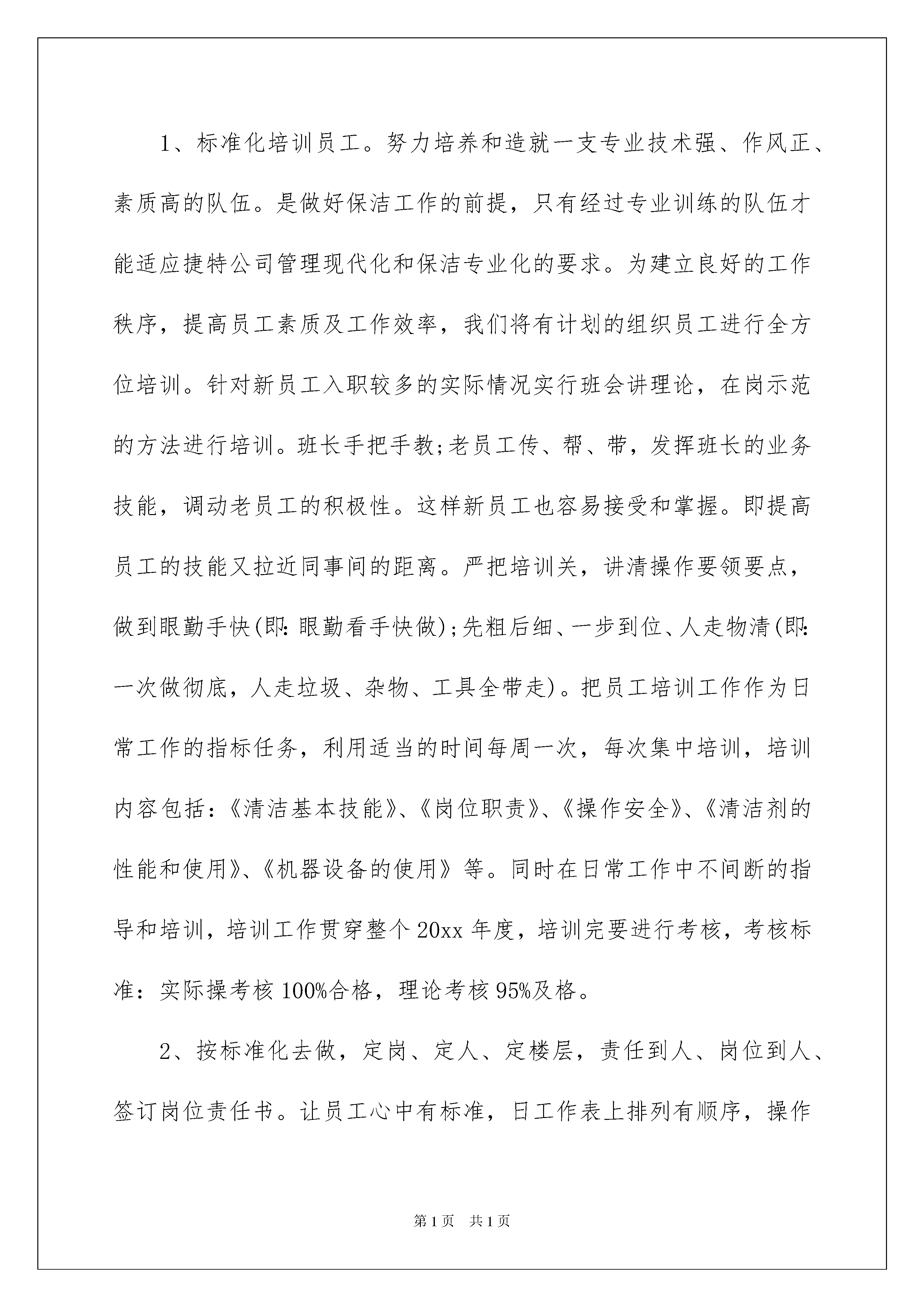 2022精选保洁工作计划模板集锦6篇精选保洁工作计划模板集锦6篇日子在弹指一挥间就毫无声息的流逝,我们又将迎来新的喜悦、新的收获,是时候抽出时间写写工作计划了。相信许多人会觉得工作计划很难写吧,下面是我为大家收集的保洁工作计划7篇,希望能够帮助到大家。保洁工作计划篇1我们在公司领导的指导与大力支持下,按照公司的工作要求,本着"您的满意,是我们永远的追求"的物业服务宗旨,"以人为本,以客为尊,以诚为源,以质为先"的公司管理理念,以"上水平,创效益,树品牌"作为公司的发展目标,"服务第一、客户至上"作为每一位员工的信条。经过部门全体员工的共同努力,开展一系列的优质服务工作,在此对一年的工作做以简要总结。总结经验和教训,找出不足,根据20xx年的工作情况,依据公司的要求,深挖细化工作内容,制定20xx年的工作计划、标准、目标。一、保洁工作标准化小区保洁年度计划书1、标准化培训员工。努力培养和造就一支专业技术强、作风正、素质高的队伍。是做好保洁工作的前提,只有经过专业训练的队伍才能适应捷特公司管理现代化和保洁专业化的要求。为建立良好的工作秩序,提高员工素质及工作效率,我们将有计划的组织员工进行全方位培训。针对新员工入职较多的实际情况实行班会讲理论,在岗示范的方法进行培训。班长手把手教;老员工传、帮、带,发挥班长的业务技能,调动老员工的积极性。这样新员工也容易接受和掌握。即提高员工的技能又拉近同事间的距离。严把培训关,讲清操作要领要点,做到眼勤手快(即:眼勤看手快做);先粗后细、一步到位、人走物清(即:一次做彻底,人走垃圾、杂物、工具全带走)。把员工培训工作作为日常工作的指标任务,利用适当的时间每周一次,每次集中培训,培训内容包括:《清洁基本技能》、《岗位职责》、《操作安全》、《清洁剂的性能和使用》、《机器设备的使用》等。同时在日常工作中不间断的指导和培训,培训工作贯穿整个20xx年度,培训完要进行考核,考核标准:实际操考核100%合格,理论考核95%及格。2、按标准化去做,定岗、定人、定楼层,责任到人、岗位到人、签订岗位责任书。让员工心中有标准,日工作表上排列有顺序,操作起来规范。整个工作区无死角,无遗漏。3、按标准化去查,主管、班长在检查工作中不走过场,要坚持按标准检查,自查、互查、班长检查、主管检查、抽查等检查制度相结合,将检查结果切实与员工工资挂钩。坚持每天巡查,督促保洁工作,发现问题及时纠正。二、管理要素实施正规化1、基础设施管理的正规化。平时仔细检查各种设施,发现问题及时报修,故障不过夜。2、物料管理的正规化。领料过程及手续齐全,严格执行审批制度,深挖保洁成本潜力,杜绝浪费,为公司节约成本,提高效益。3、工作方法正规化。制定各岗位工作标准及流程,不断完善存在漏洞的地方,确保用正确的工作方法来指导员工,让所有工作处于受控状态。根据实际情况制定各岗位的《岗位操作规程》及《检查规程》、《培训规程》、《语言行为规范》及相关的工作技巧。并让保洁员工熟记于心。4、职业健康安全管理正规化。对保洁各岗位存在风险进行识别,针对危险源制定措施,并对员工进行工作中的自我保护教育。高台、高窗、室外、电气设备使用、机械设备使用作为重点内容进行教育和提示,确保安全无事故,做到安全服务。5、月报、周评、周计、考勤正规化。及时做好各种报表,并使之正规化、程序化。三、人力资源管理规范化1、对员工进行不同层次的培训,为员工制定工作目标,鼓励员工自我学习和自我发展,努力提高自己的综合素质。2、再度加强对保洁员的管理。针对于楼群、楼道分散、面积大、公共区域性质复杂,人口流动较大等特点,20xx年需要加大管理力度,使之系统化、标准化、良性化运作起来。1)加强监督工作质量,精益求精。加强员工的服务意识、工作中处理问题的灵活性、主动服务等方面的管理。2)重视对员工的培训教育,提高员工职业道德和服务意识。3)加强班长的基础管理能力。4)工作标准量化、可操作性强。小区保洁年度计划书5)日常培训,让员工熟悉工作流程及服务标准,升华服务质量。3、针对一些突发事件制定突发事件的应急方案,并对员工进行培训,不断完善提高满意度。如水管爆裂、漏水、结冰等情况让员工熟练掌握应对自如,不惊慌失措。4、进一步提高保洁员的工作效率和工作质量,精益求精,加强监督检查力度。对保洁员进行主动服务意识培训,调整员工思想,鼓励员工养成主动自查习惯,学会发现问题,解决问题。只有善于计划,工作才能按部就班,有条不紊地开展;只有善于总结,发现不足,工作绩效才能良性循环。5、20xx年还要兼管太原街万达地下室和北一路售楼处的管理,同样和铁西万达的标准一样,