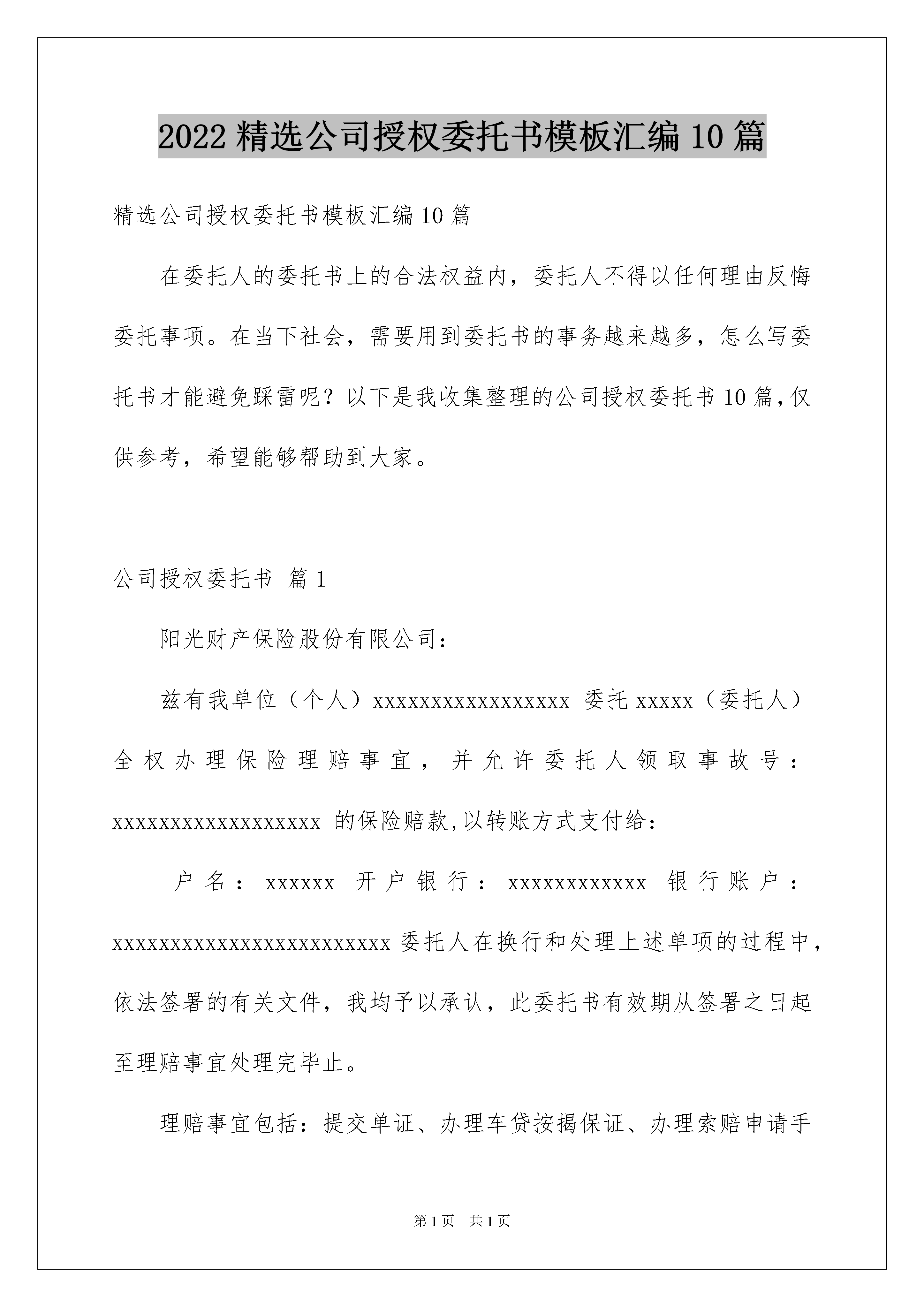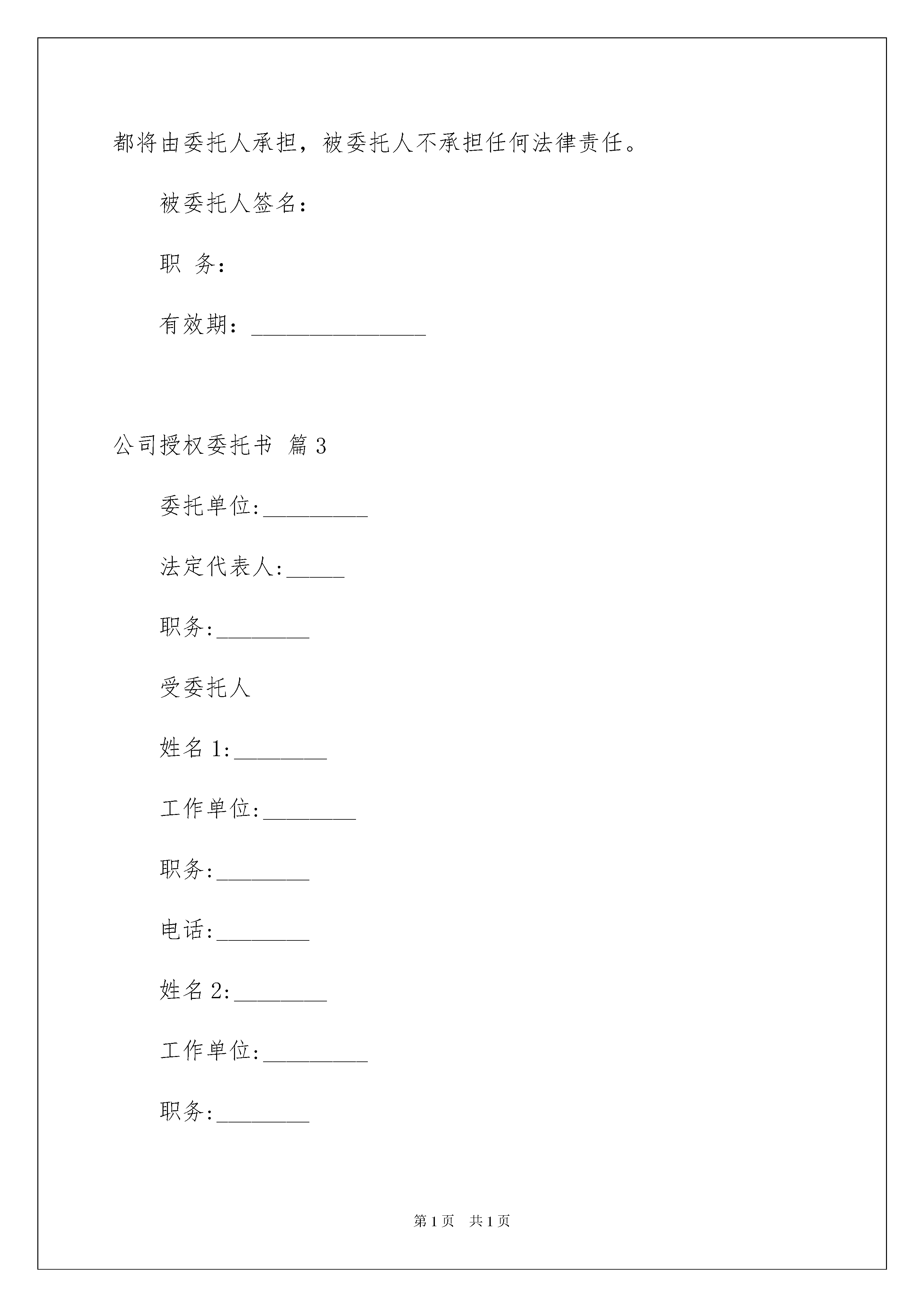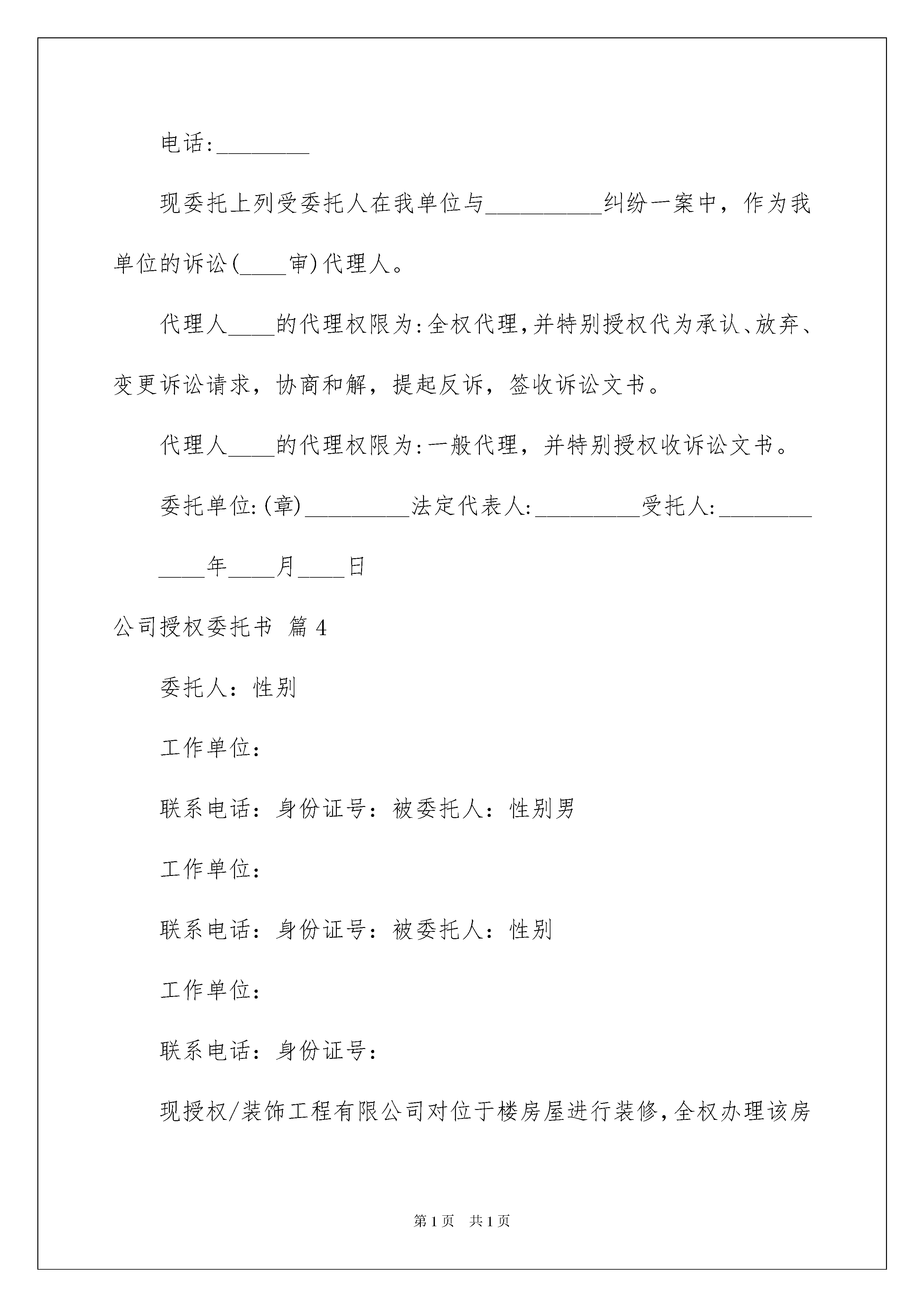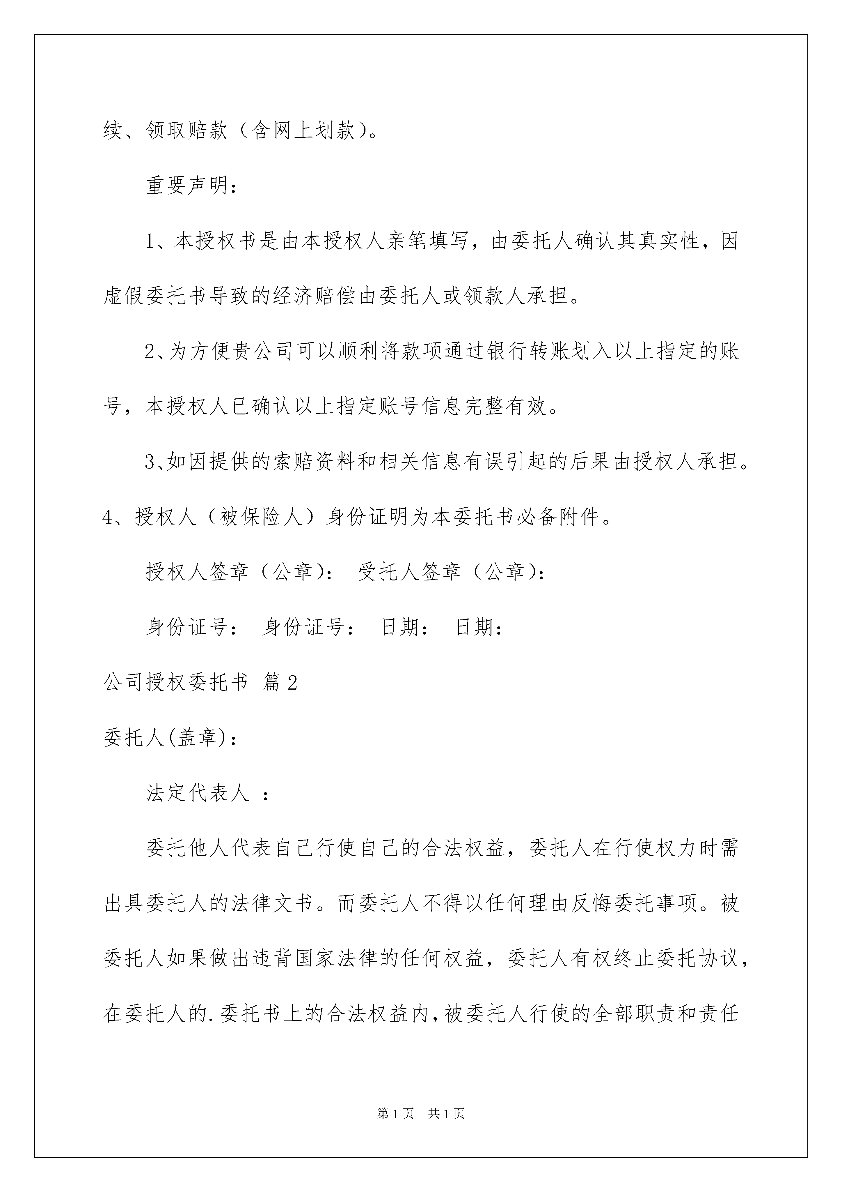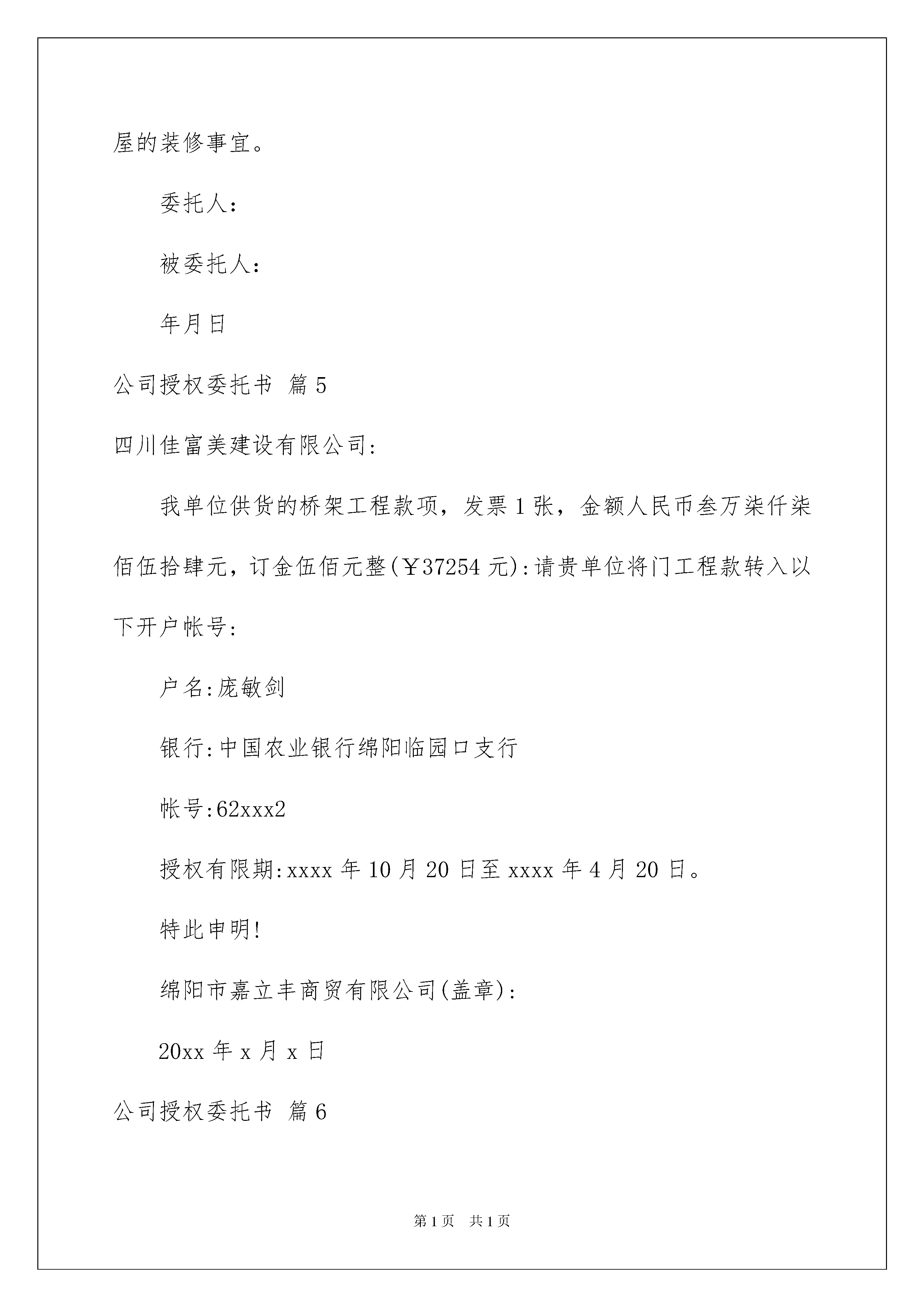 2022精选公司授权委托书模板汇编10篇精选公司授权委托书模板汇编10篇在委托人的委托书上的合法权益内,委托人不得以任何理由反悔委托事项。在当下社会,需要用到委托书的事务越来越多,怎么写委托书才能避免踩雷呢?以下是我收集整理的公司授权委托书10篇,仅供参考,希望能够帮助到大家。公司授权委托书篇1阳光财产保险股份有限公司:兹有我单位(个人)xxxxxxxxxxxxxxxxx委托xxxxx(委托人)全权办理保险理赔事宜,并允许委托人领取事故号:xxxxxxxxxxxxxxxxxx的保险赔款,以转账方式支付给:户名:xxxxxx开户银行:xxxxxxxxxxxx银行账户:xxxxxxxxxxxxxxxxxxxxxxxx委托人在换行和处理上述单项的过程中,依法签署的有关文件,我均予以承认,此委托书有效期从签署之日起至理赔事宜处理完毕止。理赔事宜包括:提交单证、办理车贷按揭保证、办理索赔申请手续、领取赔款(含网上划款)。重要声明:1、本授权书是由本授权人亲笔填写,由委托人确认其真实性,因虚假委托书导致的经济赔偿由委托人或领款人承担。2、为方便贵公司可以顺利将款项通过银行转账划入以上指定的账号,本授权人已确认以上指定账号信息完整有效。3、如因提供的索赔资料和相关信息有误引起的后果由授权人承担。4、授权人(被保险人)身份证明为本委托书必备附件。授权人签章(公章):受托人签章(公章):身份证号:身份证号:日期:日期:公司授权委托书篇2委托人(盖章):法定代表人:委托他人代表自己行使自己的合法权益,委托人在行使权力时需出具委托人的法律文书。而委托人不得以任何理由反悔委托事项。被委托人如果做出违背国家法律的任何权益,委托人有权终止委托协议,在委托人的.委托书上的合法权益内,被委托人行使的全部职责和责任都将由委托人承担,被委托人不承担任何法律责任。被委托人签名:职务:有效期:_______________公司授权委托书篇3委托单位:_________法定代表人:_____职务:________受委托人姓名1:________工作单位:________职务:________电话:________姓名2:________工作单位:_________职务:________电话:________现委托上列受委托人在我单位与__________纠纷一案中,作为我单位的诉讼(____审)代理人。代理人____的代理权限为:全权代理,并特别授权代为承认、放弃、变更诉讼请求,协商和解,提起反诉,签收诉讼文书。代理人____的代理权限为:一般代理,并特别授权收诉讼文书。委托单位:(章)_________法定代表人:_________受托人:____________年____月____日公司授权委托书篇4委托人:性别工作单位:联系电话:身份证号:被委托人:性别男工作单位:联系电话:身份证号:被委托人:性别工作单位:联系电话:身份证号:现授权/装饰工程有限公司对位于楼房屋进行装修,全权办理该房屋的装修事宜。委托人:被委托人:年月日公司授权委托书篇5四川佳富美建设有限公司:我单位供货的桥架工程款项,发票1张,金额人民币叁万柒仟柒佰伍拾肆元,订金伍佰元整(¥37254元):请贵单位将门工程款转入以下开户帐号:户名:庞敏剑银行:中国农业银行绵阳临园口支行帐号:62xxx2授权有限期:xxxx年10月20日至xxxx年4月20日。特此申明!绵阳市嘉立丰商贸有限公司(盖章):20xx年x月x日公司授权委托书篇6_________________公司:我单位现委托_______(姓名)作为我单位合法委托代理人,授权其代表我单位进行____________工作。该委托代理人的授权范围为:代表我单位与你们进行磋商、签署文件和处理______________活动有关的事务。在整个__________过程中,该代理人的一切行为,均代表本单位,与本单位的行为具有同等法律效力。本单位将承担该代理人行为的全部法律后果和法律责任。代理人无权转换代理权。特此委托。代理人姓名:________性别:________年龄:_____职务:________身份证号码:________日期:________年________月________日竞标申请人:________法定代表人:________公司授权委托书篇7委托人(必填):工商注册号:对账受托人(必填):身份证号码:联系方式:为便于开展与xxxxxx有限公司的产品购销业务,委托人特授权受托人在20xx年x月x日至20xx年x月x日期间,作为委托人与xxxxx有限公司的业务代理人,向xxxxx有