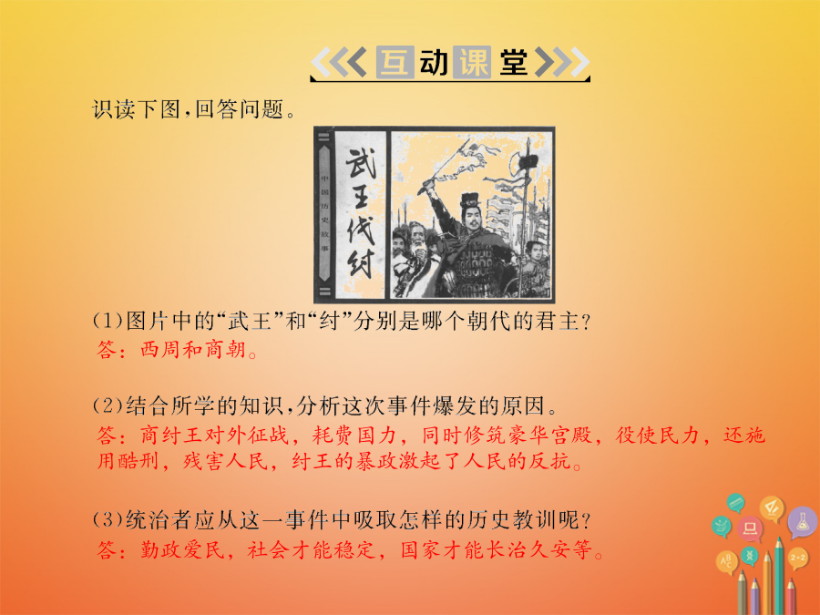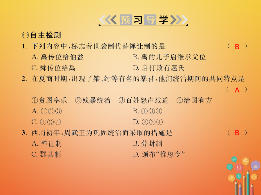 第4课早期国家的产生和发展禹牧野B答:西周和商朝。ABA答:材料一反映了没有压迫、没有剥削、“天下为公”的原始社会的状况;材料二则描述了“天下为家”和王位世袭的社会现象。答:分封制。答:向周王进纳贡物,并服从周王调兵。