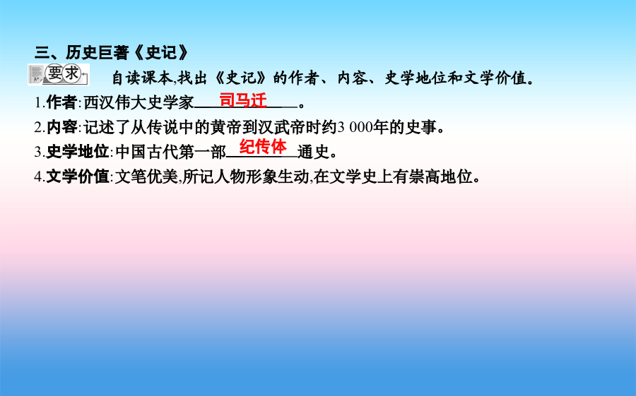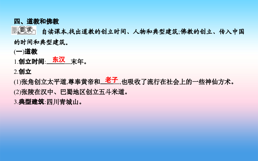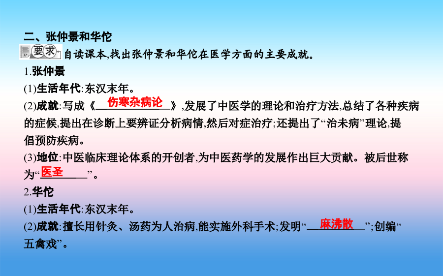 第15课两汉的科技和文化一、造纸术的发明 结合右图,说出纸的发明时间、改进和作用。 1.纸的发明:时期,人们已经懂得了造纸的基本方法。 2.纸的改进:东汉宦官改进造纸工艺,用树皮、麻头、破布、旧渔网等植物纤维为原料造纸。 3.纸的作用:成为人们广泛使用的书写材料,也便利了典籍的流传,是中国对世界文明的伟大贡献之一。二、张仲景和华佗 自读课本,找出张仲景和华佗在医学方面的主要成就。 1.张仲景 (1)生活年代:东汉末年。 (2)成就:写成《》,发展了中医学的理论和治疗方法,总结了各种疾病的症候,提出在诊断上要辨证分析病情,然后对症治疗;还提出了“治未病”理论,提倡预防疾病。 (3)地位:中医临床理论体系的开创者,为中医药学的发展作出巨大贡献。被后世称为“”。 2.华佗 (1)生活年代:东汉末年。 (2)成就:擅长用针灸、汤药为人治病,能实施外科手术;发明“”;创编“五禽戏”。三、历史巨著《史记》 自读课本,找出《史记》的作者、内容、史学地位和文学价值。 1.作者:西汉伟大史学家。 2.内容:记述了从传说中的黄帝到汉武帝时约3000年的史事。 3.史学地位:中国古代第一部通史。 4.文学价值:文笔优美,所记人物形象生动,在文学史上有崇高地位。 四、道教和佛教 自读课本,找出道教的创立时间、人物和典型建筑;佛教的创立、传入中国的时间和典型建筑。 (一)道教 1.创立时间:末年。 2.创立 (1)张角创立太平道,尊奉黄帝和,也吸收了流行在社会上的一些神仙方术。 (2)张陵在汉中、巴蜀地区创立五斗米道。 3.典型建筑:四川青城山。(二)佛教 1.简介:世界三大宗教之一,产生于公元前6世纪的,创始人是乔达摩·悉达多,又称释迦牟尼。 2.传播:通西域后,佛教通过丝绸之路传入中国。东汉时,佛教得到上层统治阶级的扶持,逐渐传播。 3.典型建筑:洛阳白马寺。 4.影响:丰富了中国文化,在社会、思想、文学以及建筑、雕刻、绘画等方面产生深远影响。司马迁与《史记》 司马迁的《史记》
