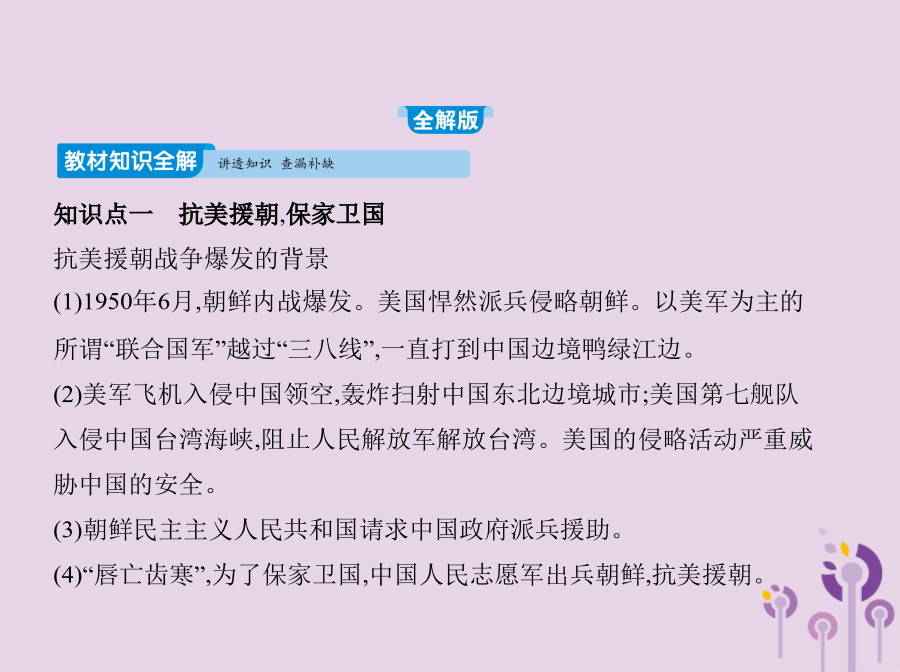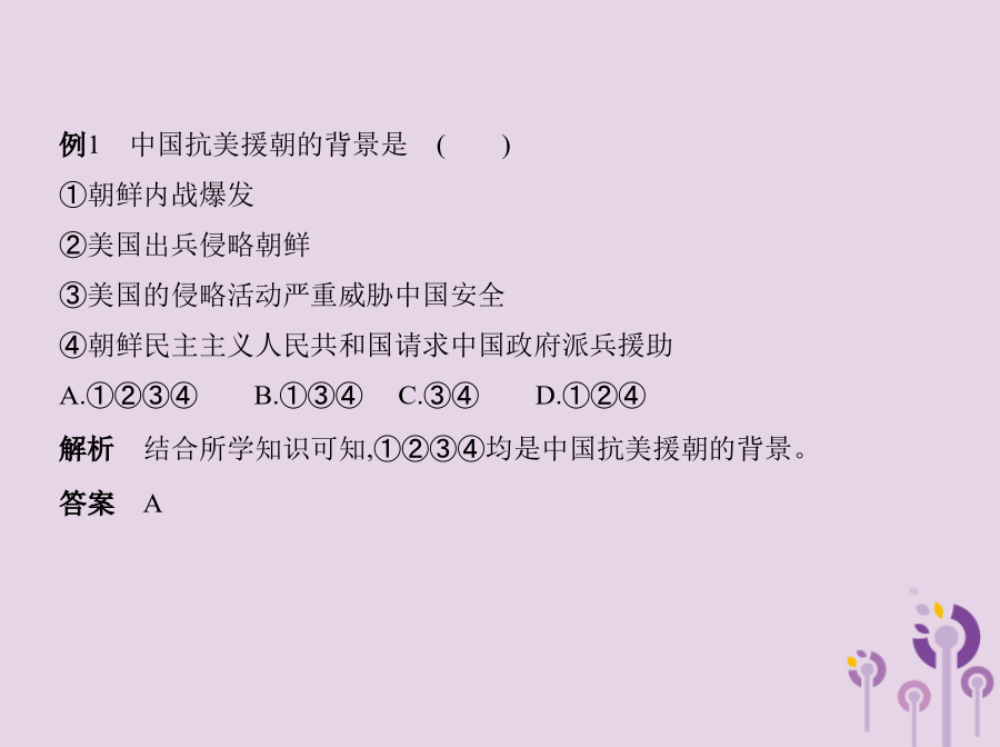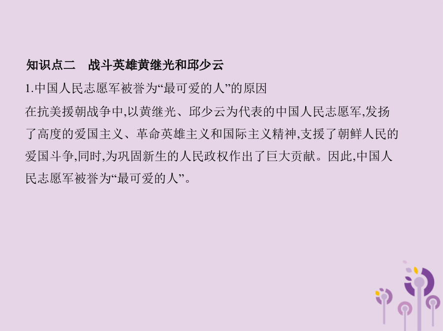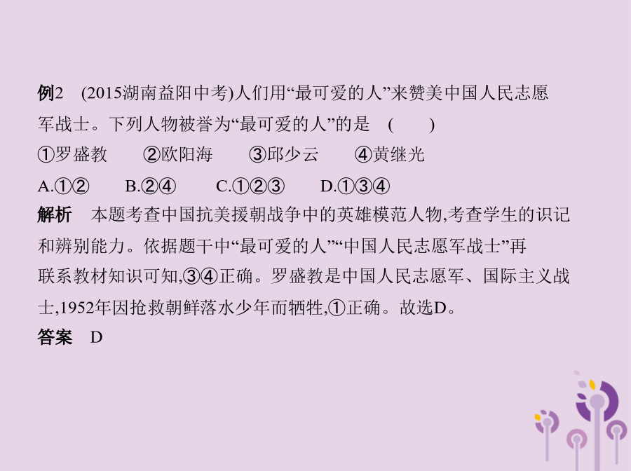 知识点一抗美援朝,保家卫国例1中国抗美援朝的背景是 () ①朝鲜内战爆发 ②美国出兵侵略朝鲜 ③美国的侵略活动严重威胁中国安全 ④朝鲜民主主义人民共和国请求中国政府派兵援助 A.①②③④B.①③④C.③④D.①②④知识点二战斗英雄黄继光和邱少云例2(2015湖南益阳中考)人们用“最可爱的人”来赞美中国人民志愿军战士。下列人物被誉为“最可爱的人”的是 () ①罗盛教②欧阳海③邱少云④黄继光 A.①②B.②④C.①②③D.①③④2.抗美援朝胜利的原因和意义 (1)原因 ①党的英明决策和正确指挥。②广大志愿军将士英勇奋战。③朝鲜军民密切配合。④抗美援朝战争具有正义性。⑤全国人民、国际正义力量大力支持。 (2)意义 ①打击了美帝国主义的侵略政策和战争政策,打破了美国不可战胜的神话,极大地鼓舞了全世界人民保卫和平、反对侵略的勇气和信心,对国际局势产生了深远的影响。 ②战争的胜利极大地提高了我国的国际威望。③保卫了中朝两国的独立和安全,为我国的社会主义改造和社会主义建 设赢得了一个相对和平的环境。 ④使我国建立了一支较为现代化的海陆空军和其他各兵种的国防军,并取得了对美作战的经验。 ⑤提高了全国人民的政治觉悟,振奋了革命精神,极大地激发了全国人民的爱国热情和国际主义精神。例3(2015河南中考)周恩来总理曾郑重警告美国:“中国人民绝不能容忍外国的侵略,也不能听任帝国主义者对自己的邻人肆行侵略而置之不理。”历时3年与邻国并肩战斗的胜利,使帝国主义不敢轻易作武装侵华的尝试。这表明这场战斗 () A.使祖国大陆实现了统一 B.保证了新中国土改的顺利进行 C.开拓了新中国外交的新局面 D.为新政权赢得相对稳定的和平环境解析本题考查知识点抗美援朝,考查学生对材料的理解能力。由“不能听任帝国主义者对自己的邻人肆行侵略而置之不理”“历时3年与邻国并肩战斗的胜利”可知该战争为抗美援朝战争。再根据“使帝国主义不敢轻易作武装侵华的尝试”可知这场战斗为新政权赢得相对稳定的和平环境。3.抗美援朝精神的含义 在抗美援朝战争中,中国人民志愿军表现出来的是爱国主义精神、国际主义精神和不怕牺牲的革命英雄主义精神。【教材图片导读】 (1)中国人民志愿军跨过鸭绿江(2)黄继光 点拨黄继光,生于1931年,四川中江县人。1952年10月,在上甘岭战役中壮烈牺牲。为了表彰黄继光的伟大精神和不朽功勋,志愿军司令员彭德怀发布命令,为黄继光追记特等功一次,并授予他“特级英雄”称号。中国共产党志愿军第15军委员会在追认黄继光为“模范团员”的同时,追认他为中国共产党党员。黄继光的名字和光荣事迹被铭刻在上甘岭背后的五圣山上。妙招巧记(1)归纳记忆法:本课内容可采用数字法简记为“两个一,一个二,一个三”。 “两个一”:一个目的——抗美援朝、保家卫国,一次典型战役——上甘岭战役。 “一个二”:两个时间——1950年10月和1953年7月。 “一个三”:三个人物——彭德怀、黄继光、邱少云。 (2)歌谣记忆法:百废待兴新中国,国内国外威胁多。一九五(年)六月,朝鲜内战爆发了。美军悍然侵朝鲜,打到中国边境线。严重威胁我安全,台湾海峡被侵犯。抗美援朝保国家,志愿军流血朝鲜。美(军)被赶到“三八线”,典型战役上甘岭。黄邱(指黄继光、邱少云)事迹人人夸,中朝友谊代代传。一九五三(年)签协定,英雄军队才凯旋。图示归纳 1.抗美援朝是为了帮助朝鲜,与我国无关。(✕)知识点一抗美援朝,保家卫国2.(2017广西桂林灌阳期中)“那是一个现在看来非常久远的年代。有一天,战火烧到鸭绿江边,年轻的人们拿起枪奔赴战场,只为能有宁静的生活……纪念那一群可爱的人。”那场战争中谁被称为“最可爱的人” () A.中国人民志愿军B.中国人民解放军 C.工农红军D.抗日义勇军知识点二战斗英雄黄继光和邱少云4.(2017福建莆田二十五中月考)1952年12月11日,他所在排潜伏在距前沿60多米的蒿草丛中。12日12时美军发射侦察燃烧弹,恰巧落在潜伏点附近草丛中,烈火蔓延到他身边,燃着了他的棉衣、头发和皮肉。为不暴露潜伏部队,他双手插进泥土中,强忍剧痛,始终未动,直至壮烈牺牲!他是 () A.黄继光B.邱少云C.杨根思D.罗盛教5.阅读下列图片: 请回答: (1)图1中跨过鸭绿江的是我国哪一部队?他们开赴抗美援朝战场的时间和目的是什么?这支部队的司令员是谁? (2)美国出兵朝鲜的真实目的是什么?美国有哪些严重威胁中国安全的 侵略活动? (3)图2纪念碑是由无数烈士的鲜血铸就的,请举出抗美援朝战争中的英雄人物及其主要事迹。(两例即可)谈一谈他们所体现的精神。答案(1)部队:中国人民志愿军。时间:1950年;目的:保家卫国。司令员:彭德怀。 (2)目的:以朝鲜为跳板,进而侵略中国。活动:以美军为主的“联合国军”一直打到中国边境鸭