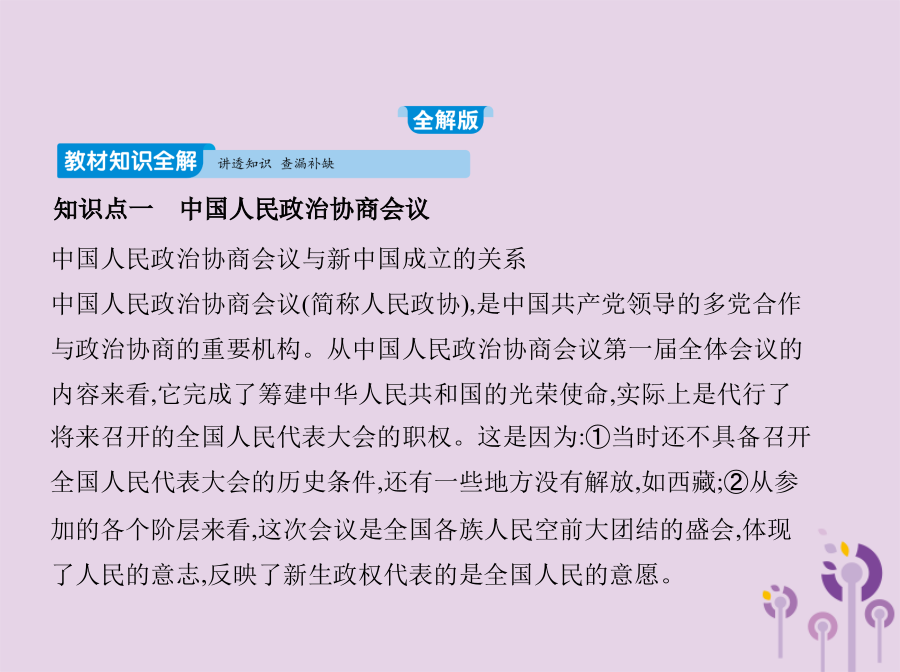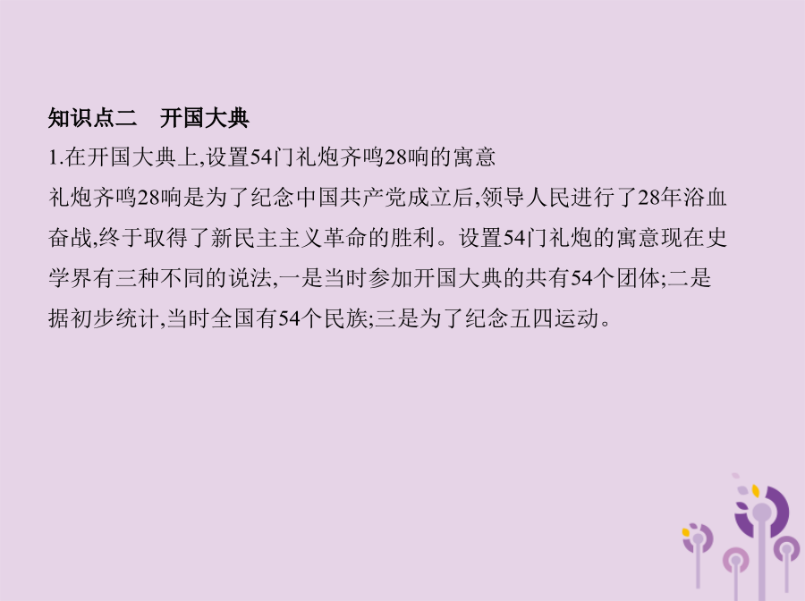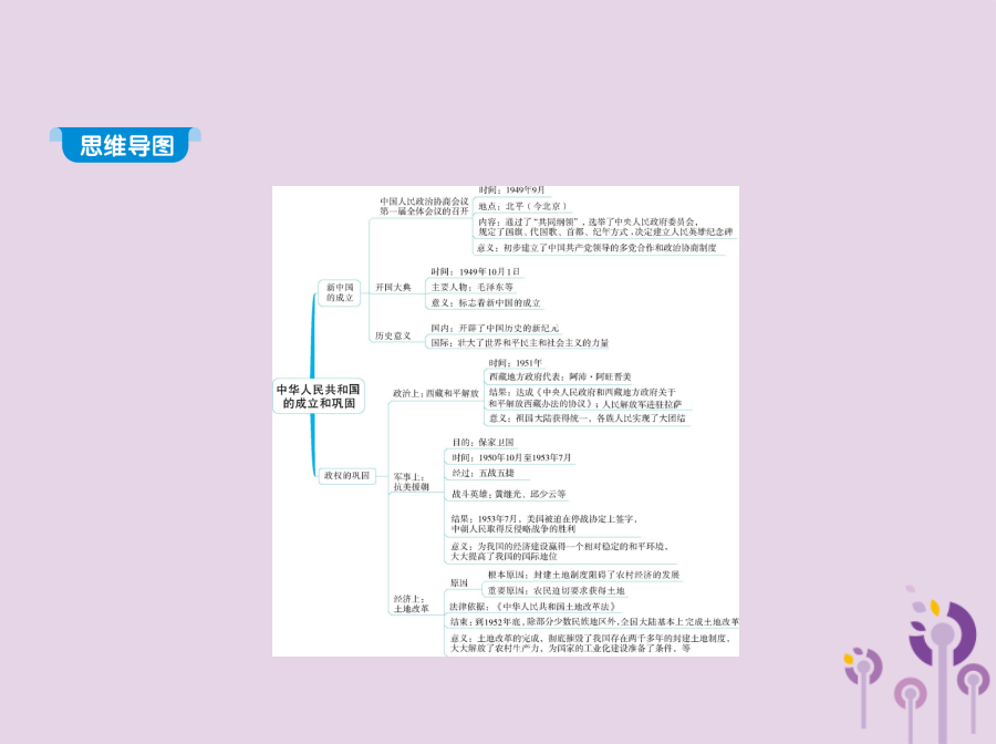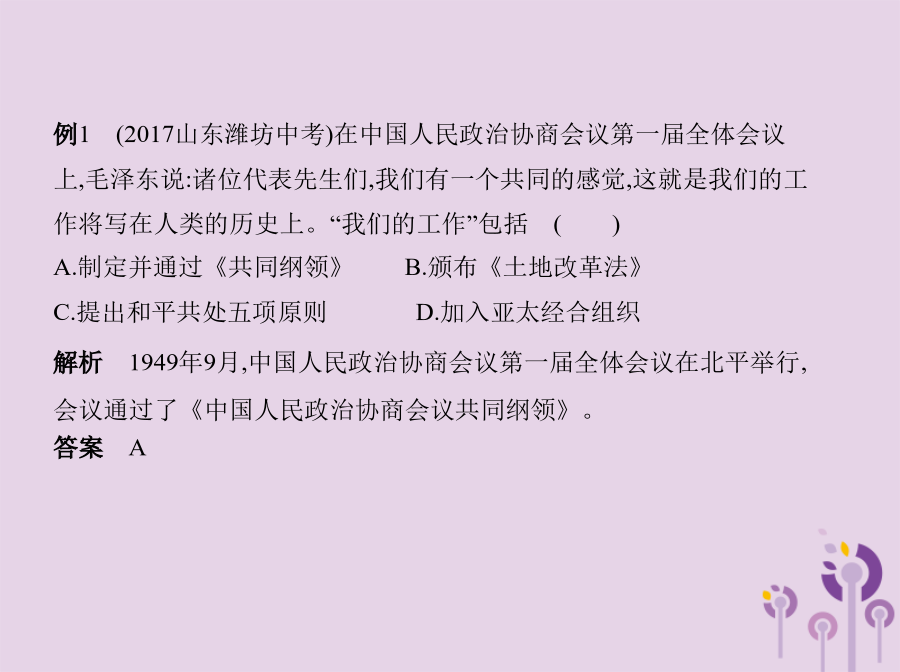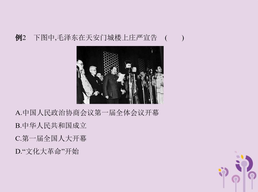 知识点一中国人民政治协商会议例1(2017山东潍坊中考)在中国人民政治协商会议第一届全体会议上,毛泽东说:诸位代表先生们,我们有一个共同的感觉,这就是我们的工作将写在人类的历史上。“我们的工作”包括 () A.制定并通过《共同纲领》B.颁布《土地改革法》 C.提出和平共处五项原则D.加入亚太经合组织知识点二开国大典例2下图中,毛泽东在天安门城楼上庄严宣告 () A.中国人民政治协商会议第一届全体会议开幕 B.中华人民共和国成立 C.第一届全国人大开幕 D.“文化大革命”开始解析本题考查开国大典、新中国的成立,考查学生的识图能力。结合所学知识可判断图片为开国大典的场景,毛泽东主席在天安门城楼宣告:中华人民共和国中央人民政府今天成立了!B项正确。2.对“中华人民共和国的成立,开辟了中国历史的新纪元”的认识 中华人民共和国的成立,在中国革命历程中具有承上启下的历史意义。它标志着中国人民推翻了“三座大山”的压迫,结束了半殖民地半封建社会,既是一个旧时代结束的标志,又是一个新时代开始的标志。中华人民共和国的成立,是中国现代史的开端。中华人民共和国的成立,标志着中国民主革命的任务已基本完成,中国进入了向社会主义过渡的时期。例3(2017贵州黔东南中考)《走进新时代》这首歌中唱道:“让我告诉世界,中国命运自己主宰,让我告诉未来,中国进行着接力赛……”你知道中国人民“命运自己主宰”开始于 () A.五四运动B.中共成立 C.开国大典D.改革开放3.中华民国与中华人民共和国的比较例4标志着中国人民从此站起来,成为国家的主人,使中国成为独立自主国家的历史事件是 () A.中国共产党成立 B.西藏和平解放 C.社会主义制度建立 D.中华人民共和国成立知识点三西藏和平解放例5(2015内蒙古呼和浩特中考)1951年西藏的和平解放 () A.标志中华人民共和国实现了统一 B.说明西藏开始进入社会主义 C.实现了各族人民的大团结 D.挫败了列强分割西藏的计划【教材图片导读】 (1)人民英雄纪念碑(3)开国大典 点拨1949年10月1日下午3时,毛泽东等国家领导人登上天安门城楼,参加开国典礼。中央人民政府主席毛泽东向全世界庄严宣告:“中华人民共和国中央人民政府今天成立了!”他宣读了中央人民政府公告,宣布本政府为代表中华人民共和国全国人民的唯一合法政府。图为毛泽东等国家领导人在天安门城楼上。妙招巧记(1)归纳记忆法:本课内容可巧记为“两个意义、三个时间、三个事件”。 “两个意义”:中华人民共和国成立的历史意义、西藏和平解放的历史意义。 “三个时间”:1949年9月、1949年10月1日、1951年。 “三个事件”:中国人民政治协商会议第一届全体会议的召开、开国大典、西藏和平解放。 (2)歌谣记忆法:政治协商在北平,“共同纲领”要执行。“共同纲领”如宪法,国家大事定准绳。国旗代国歌确定,首都定名为北京。建立(人民)英雄纪念碑,革命先烈后人敬。十月一日大阅兵,开国大典齐欢腾。西藏和平得解放,各族人民大团结。图示归纳 1.1949年9月,中国人民政治协商会议第一届全体会议在北京隆重举行。(✕) 提示:中国人民政治协商会议第一届全体会议在北平召开,会议决定把北平改名为北京,作为新中国的首都。 3.从中华人民共和国成立开始,我国进入社会主义社会。(✕) 提示:1949年中华人民共和国成立后,我国开始了由新民主主义向社会主义过渡的新时期,从社会性质来说,此时我国属于新民主主义社会。 知识点一中国人民政治协商会议2.下列选项中属于中国人民政治协商会议第一届全体会议内容的有 () ①通过了“共同纲领” ②通过了我国第一部社会主义类型的宪法 ③决定采用公元纪年 ④决定以《义勇军进行曲》为代国歌 A.①②③B.①②④C.②③④D.①③④知识点二开国大典4.(2017广东揭阳揭西第三华侨中学月考)下列内容不属于中华人民共和国成立历史意义的是 () A.开辟了中国历史的新纪元 B.中国人民从此站起来了,成为国家的主人 C.标志着中国进入社会主义社会 D.壮大了世界和平民主和社会主义的力量知识点三西藏和平解放6.1951年,中央人民政府和西藏地方政府代表团通过友好谈判作出的重大决定是 () A.设立西藏百万农奴解放纪念日 B.和平解放西藏 C.建立西藏自治区 D.平定达赖集团分裂祖国的叛乱1.(2017安徽蚌埠十二中期中)每当你参加升旗仪式,被那雄壮的《义勇军进行曲》所感染时,你知道它被定为代国歌是在下列哪次会议上吗 () A.中国人民政治协商会议第一届全体会议 B.第一届全国人民代表大会 C.中共七届二中全会 D.中共“一大”2.开国大典上,升起中华人民共和国国旗——五星红旗的是 () A.朱德B.陈毅C.毛泽东D.周恩来3.拿破仑曾说:中国是一只沉睡的雄狮,它一旦醒来,