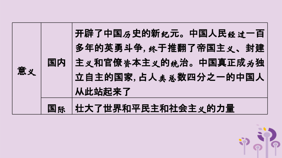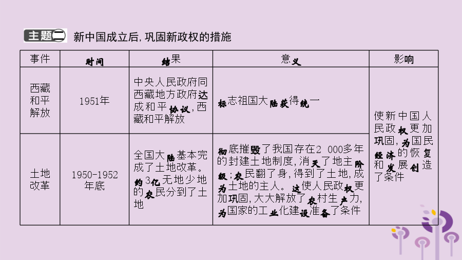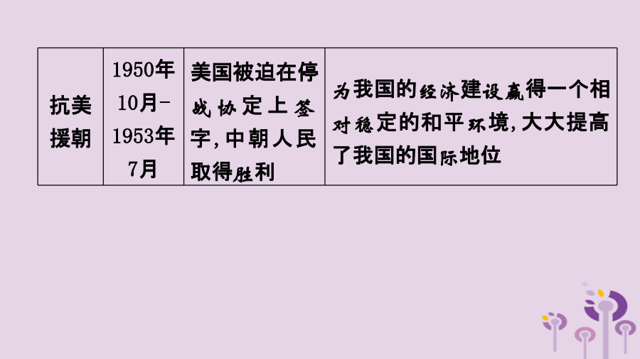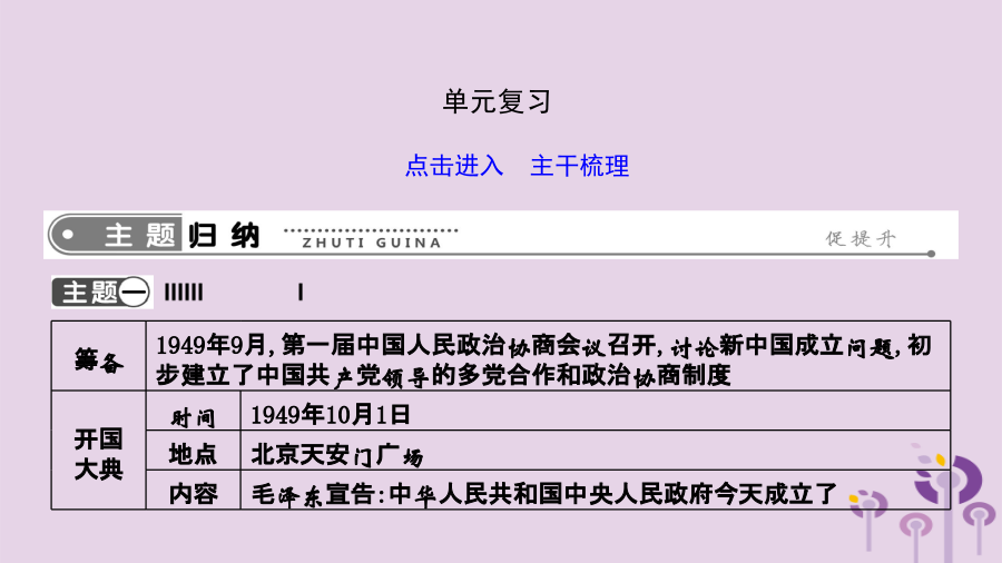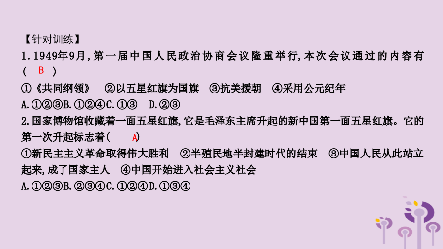 单元复习意义【针对训练】 1.1949年9月,第一届中国人民政治协商会议隆重举行,本次会议通过的内容有 () ①《共同纲领》②以五星红旗为国旗③抗美援朝④采用公元纪年 A.①②③ B.①②④ C.①③ D.②③ 2.国家博物馆收藏着一面五星红旗,它是毛泽东主席升起的新中国第一面五星红旗。它的第一次升起标志着() ①新民主主义革命取得伟大胜利②半殖民地半封建时代的结束③中国人民从此站立起来,成了国家主人④中国开始进入社会主义社会 A.①②③ B.②③④ C.①②④ D.①③④新中国成立后,巩固新政权的措施抗美 援朝【针对训练】 1.下列图片共同体现出的时代主题是() A.反抗外来侵略 B.进行三大改造 C.发展国民经济 D.巩固新生政权 2.如图是1949—1952年中国粮食产量示意图,促使图中数据发生变化的主要原因是() A.抗日战争的胜利 B.土地改革运动的开展 C.抗美援朝的胜利 D.三大改造的完成