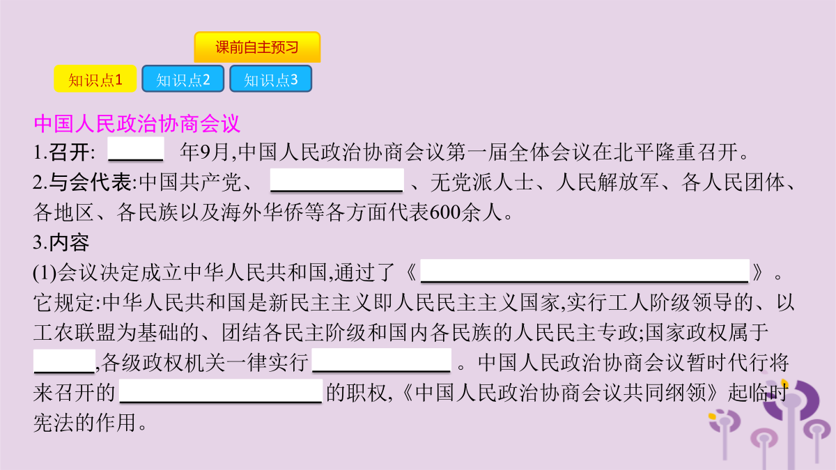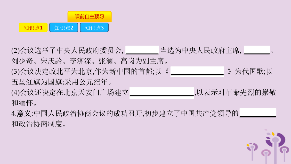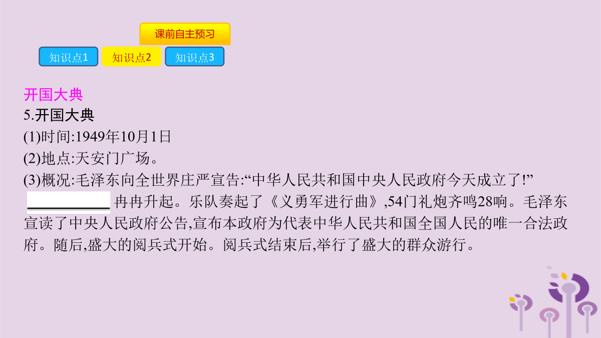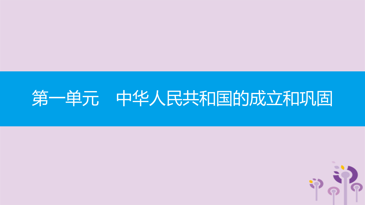 第一单元中华人民共和国的成立和巩固第1课中华人民共和国成立知识点1知识点1知识点1知识点1知识点1知识点1知识点1知识点1知识点1知识点11.下图展现了第一届中国人民政治协商会议各方参会代表的人数,此图最能说明的实质问题是(A) A.参与的广泛性 B.参加的人数多 C.参加的派别多 D.参与稳定性 2.1949年举行的中国人民政治协商会议(C) ①是具有广泛代表性的统一战线 ②初步建立了中国共产党领导的多党合作和政治协商制度 ③与当时的全国人民代表大会一起发挥着政治协商和民主监督作用 ④是近现代中国的一件大事 A.①②③ B.②③④ C.①②④ D.①②③④3.年代尺有助于我们了解事件的先后顺序和时代主题。下面是一位同学设计的年代尺,这位同学探究的主题是(B) A.侵略与反侵略 B.新民主主义革命 C.近代化的探索 D.新中国的成立和巩固 4.1949年10月1日下午3点,首都30万军民齐集天安门广场,毛泽东向全世界庄严宣告:“中华人民共和国中央人民政府成立了!”接着,受检阅部队以海军的两个排为前导,步兵师、炮兵师、战车师、骑兵师依次通过主席台,空军14架飞机在会场上空飞行受阅。与上述材料相关的史实是(A) A.开国大典 B.渡江战役 C.挺进大别山 D.西藏和平解放5.毛泽东亲手升起第一面五星红旗,意味着睡狮已醒。从此,中国以新的姿态屹立在世界面前。这里的“新”包括(D) ①社会性质的变化②人民社会地位的变化 ③国际地位的变化④国家性质的变化 A.①②④ B.①③④ C.②③④ D.①②③④ 6.关于下面两幅图内在联系的论述最准确的是(D) A.西藏百万农奴翻身得解放 B.西藏和平解放实现了国家统一 C.西藏走上了社会主义道路 D.新中国的成立是西藏和平解放的主要前提7.经历了战争年代的暴风骤雨,中华民族终于以崭新的面貌,傲立于世界民族之林!阅读材料,探究问题。 【一次影响重大的会议】 1949年9月21日,中国人民政治协商会议第一届全体会议开幕。参加会议的有中国共产党、各民主党派、无党派人士、人民解放军、各人民团体、各地区、各民族以及海外华侨等各方面代表。在普选的全国人民代表大会召开前,这次会议代行全国人民代表大会的职权。 (1)下列图片的内容与这次会议的决定有关的是AC。(多选)(2)参加会议的代表有“中国共产党、各民主党派、无党派人士、人民解放军、各人民团体、各地区、各民族以及海外华侨等各方面代表”。这说明了什么? 这次会议代表全国各族人民、各界人士的意志,显示全国各族人民、各界人士的大团结。【一场全民参与的盛宴】 当雄伟的天安门,让风云迎来东升的太阳。历史的耳畔,传来了礼炮的隆隆回响,那排山倒海般的回响,是中国沧桑巨变的回响。一位巨人俯瞰着世界,洪亮的声音,全世界都听到了,中华人民共和国成立了! ——摘自诗歌《祖国啊,我为你自豪》 (3)上述诗歌描述的是哪一重大历史事件?诗歌中的“一位巨人”指的是谁? 开国大典。毛泽东。 (4)说一说你对中华人民共和国成立的感想。 中华人民共和国的成立来之不易,我们应该倍加珍惜;中国已经屹立于世界民族之林,被奴役、压迫的历史已经一去不复返。(言之有理即可)