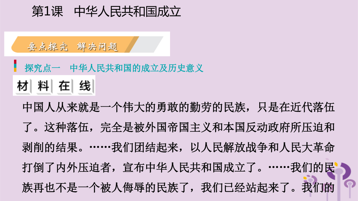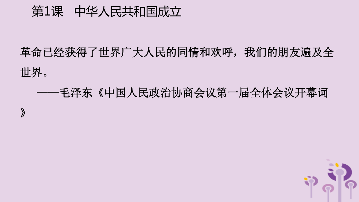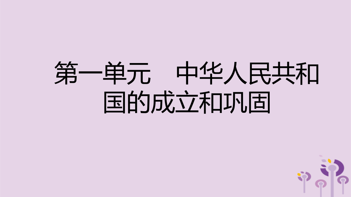 第一单元中华人民共和国的成立和巩固中华人民共和国的成立和巩固第1课中华人民共和国成立 第1课中华人民共和国成立第1课中华人民共和国成立(1)根据史料并结合所学知识,分析“我们已经站起来了”这句话的主要表现。谈谈中华人民共和国成立的历史意义。(2)“少年强则国强”“知耻而后勇”,祖国的未来需要广大青少年去努力创造。请你结合中国近代百年巨变,谈谈我们青少年学生应承担什么责任。正确理解“中华人民共和国的成立开辟了中国历史的新纪元”探究点二中国人民政治协商会议材料二在全国各地方未能实行普选以前,中国人民政治协商会议和它的地方委员会分别执行全国和地方的人民代表大会的职权……等到将来根据全国革命形势的发展和土地改革的情况及人民进步的程度,才可把普选由个别逐步推广到全国,召开全国人民代表大会。(1)中国人民政治协商会议第一届全体会议的与会代表有什么特点?这体现了什么?(2)结合材料二,谈谈当时未能实现普选并召开全国人民代表大会的原因。第2课抗美援朝 第2课抗美援朝第2课抗美援朝(1)根据材料一及所学知识回答,我国为什么要组织中国人民志愿军赴朝参战?(2)材料二、材料三说明抗美援朝战争取得胜利的原因分别是什么?除此之外,还有哪些原因?以材料三人物为代表的英雄们留给我们哪些精神财富?(3)请你结合中国近现代历史和对材料四彭德怀这句话的理解,分析抗美援朝战争胜利的伟大意义。为什么说抗美援朝的目的是保家卫国?第3课土地改革 第3课土地改革第3课土地改革(1)材料一说明了什么?(2)依据材料二和材料三并结合所学知识,概括共产党人“在他们控制的地区实行土地改革”的重大意义。中华人民共和国土地改革前后中国土地制度的比较中考链接D3.【2018·宁夏】1951年,西藏地方政府派出以阿沛·阿旺晋美为首席代表的代表团到达北京,与中央人民政府谈判,双方达成了和平解放西藏的协议,西藏获得和平解放。这标志着() A.祖国获得了统一B.祖国大陆获得了统一 C.西藏自治区成立D.西藏确立社会主义制度4.【2018·嘉兴】“我们不出兵让敌人压至鸭绿江边……首先是对东北更不利,整个东北边防军将被吸住,南满电力将被控制。”此话表明中国人民志愿军出兵朝鲜的原因是() A.促进朝鲜统一B.提升中国的国际地位 C.为了保家卫国D.防止朝鲜战争的爆发5.【2018·青岛】中共中央政治局于1950年10月上半月多次召开会议,毛泽东指出:“采取上述积极政策,对中国、对朝鲜、对东方、对世界都极为有利。”“上述积极政策”是指() A.土地改革B.抗美援朝 C.“一五”计划D.探索建设社会主义的道路6.【2018·株洲】中国人民志愿军被称为“最可爱的人”,他们中有一位战士在身负重伤、弹药用完的情况下用胸膛堵住正在扫射的机枪口。他是() A.黄继光B.邱少云C.杨根思D.罗盛教7.【2018·东营】下面是中华人民共和国成立初期我国主要农产品产量表(单位:万吨),其主要农产品产量发生变化的原因是() A.进行了土地改革 B.成立了农业生产合作社 C.开展了人民公社化运动 D.实行了家庭联产承包责任制[解析]表格中时间信息为1950—1952年,数据显示粮食和棉花产量在表格所示时间段内有了大幅度提高,结合所学知识可知,1950—1952年底的土地改革使农民得到了土地,大大解放了农村生产力,农业生产获得迅速恢复和发展,因此A项符合题意。8.【2018·江西】1951年全国粮食产量比1949年增加28%,1952年比1949年增加42%,农作物产量迅速达到和超过历史最高水平。下列对材料理解不正确的是() A.土地改革解放了农村生产力 B.土地改革实现了农村土地公有制 C.土地改革提高了农民生产积极性 D.土地改革促进了农村经济的发展[解析]土地改革使农民翻了身,得到了土地,成为土地的主人,土地所有制形式是农民土地私有制,不是农村土地公有制。故选B。
