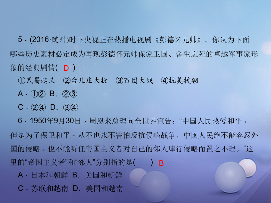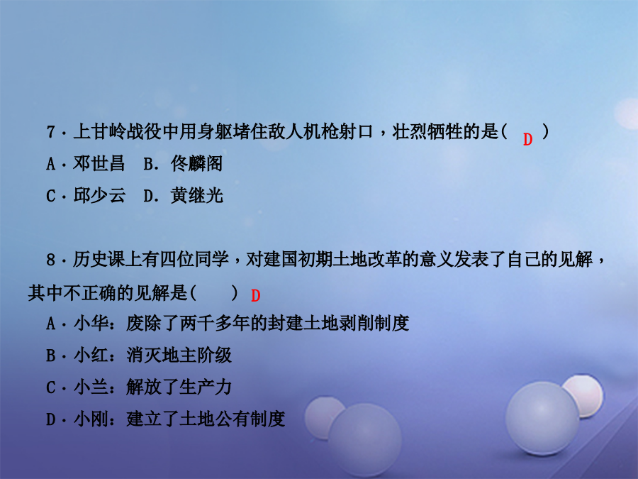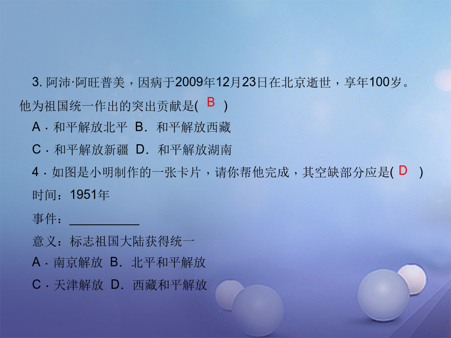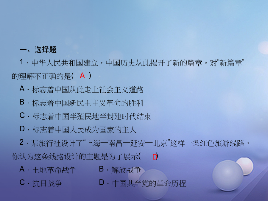 第一单元中华人民共和国的成立和巩固一、选择题 1.中华人民共和国建立,中国历史从此揭开了新的篇章。对“新篇章”的理解不正确的是() A.标志着中国从此走上社会主义道路 B.标志着中国新民主主义革命的胜利 C.标志着中国半殖民地半封建时代结束 D.标志着中国人民成为国家的主人 2.某旅行社设计了“上海—南昌—延安—北京”这样一条红色旅游线路,你认为这条线路设计的主题是为了展示() A.土地革命战争B.解放战争 C.抗日战争D.中国共产党的革命历程3.阿沛·阿旺普美,因病于2009年12月23日在北京逝世,享年100岁。他为祖国统一作出的突出贡献是() A.和平解放北平B.和平解放西藏 C.和平解放新疆D.和平解放湖南 4.如图是小明制作的一张卡片,请你帮他完成,其空缺部分应是() 时间:1951年 事件:__________ 意义:标志祖国大陆获得统一 A.南京解放B.北平和平解放 C.天津解放D.西藏和平解放5.(2016·随州)时下央视正在热播电视剧《彭德怀元帅》。你认为下面哪些历史素材必定成为再现彭德怀元帅保家卫国、舍生忘死的卓越军事家形象的经典剧情() ①武昌起义②台儿庄大捷③百团大战④抗美援朝 A.①②B.②③ C.②④D.③④ 6.1950年9月30日,周恩来总理向全世界宣告:“中国人民热爱和平,但是为了保卫和平,从不也永不害怕反抗侵略战争。中国人民绝不能容忍外国的侵略,也不能听任帝国主义者对自己的邻人肆行侵略而置之不理。”这里的“帝国主义者”和“邻人”分别指的是() A.日本和朝鲜B.美国和朝鲜 C.苏联和越南D.美国和越南7.上甘岭战役中用身躯堵住敌人机枪射口,壮烈牺牲的是() A.邓世昌B.佟麟阁 C.邱少云D.黄继光 8.历史课上有四位同学,对建国初期土地改革的意义发表了自己的见解,其中不正确的见解是() A.小华:废除了两千多年的封建土地剥削制度 B.小红:消灭地主阶级 C.小兰:解放了生产力 D.小刚:建立了土地公有制度9.某校历史兴趣小组开展了一次农村社会调查,就1952年全国粮食产量比1949年增加40%以上的原因进行了分析,得出的正确结论是() A.土地改革的完成 B.三大改造的基本完成 C.人民公社化运动的开展 D.最低生活保障制度的建立 10.某历史学习小组围绕抗美援朝、土地改革、镇压反革命运动进行研究性学习。该小组研究的主题应是() A.彻底实现国家独立B.巩固新生政权 C.进行社会主义改造D.探索社会主义道路二、非选择题 11.阅读下列材料,回答问题。 材料一9月下旬,中国人民政治协商会议召开,制定了共同纲领,选举了中央人民政府,宣告中华人民共和国成立。清华大学教授张奚若、梁思成、费孝通、吴晗等参加了新政协全体会议,大会采纳了张奚若关于新中国国名由“中华人民民主共和国”改为“中华人民共和国”的建议。 ——《清华校史连载之十一: 迎接中华人民共和国诞生》 材料二下午3时,毛泽东和其他中央领导人……登上天安门城楼。天安门广场30万群众欢声雷动。林伯渠宣布典礼开始……在国歌的乐曲声中,毛泽东按动电钮,第一面五星红旗冉冉升起。接着,毛泽东宣读了中央人民政府公告……公告宣读完毕……阅兵仪式结束后,天安门广场上的群众在热烈的气氛中开始游行,群情沸腾。 ——《民国春秋:四十一章——开国大典》(1)材料一中的“共同纲领”的全称是什么?它起到了怎样的作用? 《中国人民政治协商会议共同纲领》。临时宪法的作用。 (2)材料一记录的这次会议的主要任务是什么? 完成新中国的筹备工作。 (3)材料二文字记录的事件发生在历史上的哪一天?“中央人民政府”公告的内容有哪些?(列举出两例即可) 1949年10月1日。内容:中华人民共和国中央人民政府今天成立了;本政府为代表中华人民共和国全国人民的唯一合法政府。12.阅读下列材料,回答问题。 材料一60年前发生的那场战争,是帝国主义侵略者强加给中国人民的。朝鲜内战爆发后,美国杜鲁门政府悍然派兵进行武装干涉,发动对朝鲜的全面战争,并不顾中国政府多次警告,越过“三八线”,直逼中朝边境的鸭绿江和图们江,出动飞机轰炸我国东北边境城市和乡村,把战火烧到了新生的中华人民共和国国土之上。 材料二今天,我们纪念中国人民志愿军抗美援朝出国作战60周年,不是为了延续对抗,而是要以发展的思维、长远的眼光来审视历史、观察未来、思考未来,更好地汲取历史经验,从中获得现实和长远的教益。 ——以上材料均摘自习近平《在纪念中国人民志愿 军抗美援朝出国作战60周年座谈会上的讲话》材料三以新闻和历史节目见长的美国公共电视台为纪念《朝鲜停战协定》签订曾制作过一档特别节目,该节目的开场白强调:“战争在3年的酷暑和严寒中延续,面对不可预测的敌人,3.3万美军死亡、10万美军受伤、7140人成为战俘、8000多人失踪……
