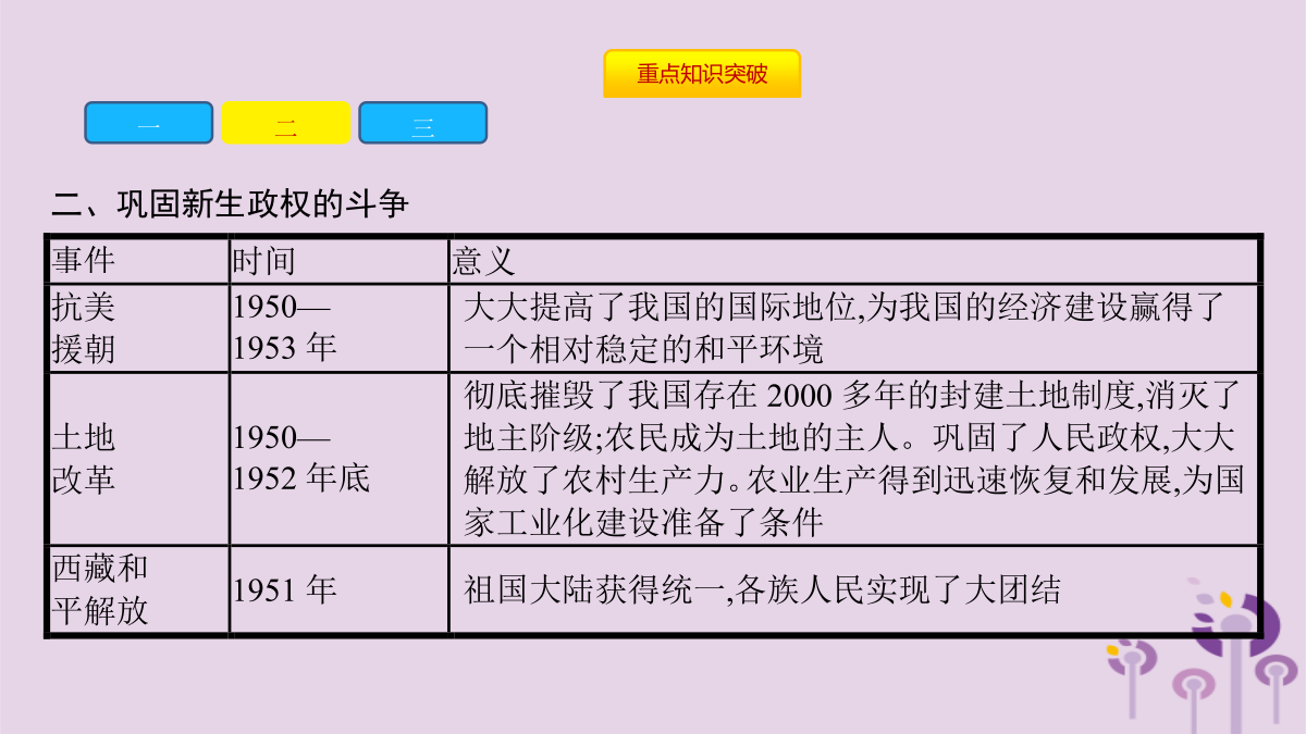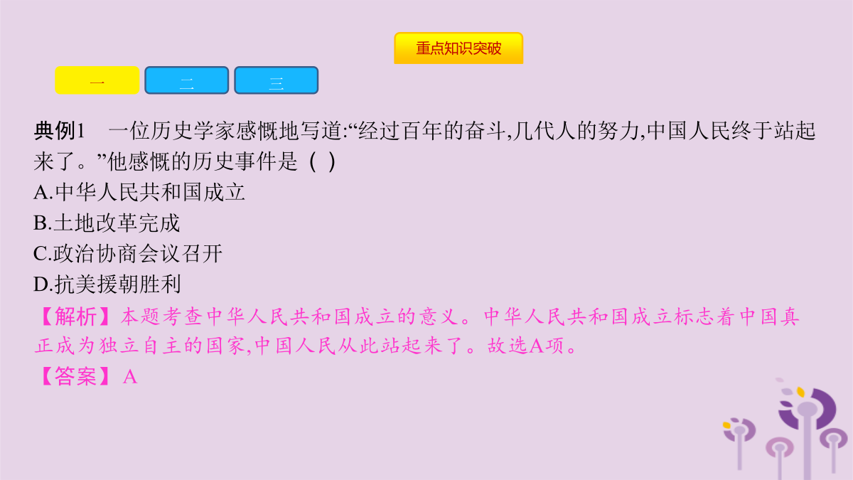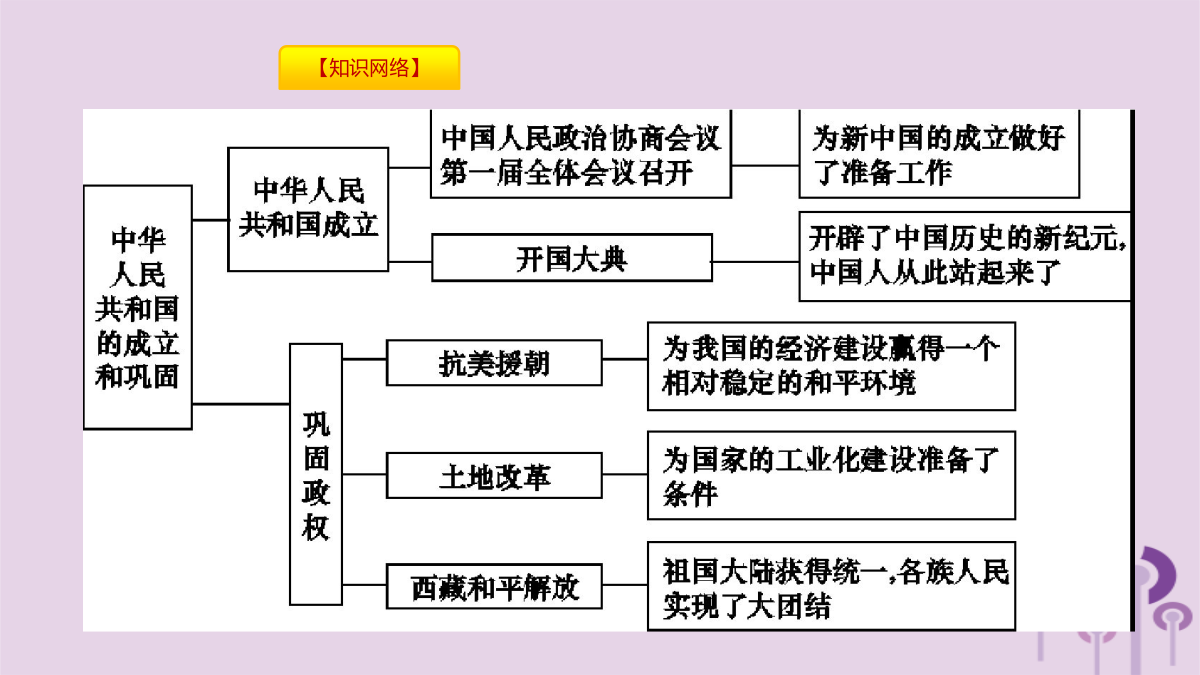 单元提升一一一一一一1.下图中的人们正在为筹备新中国而举行会议,这次会议(B) A.颁布了《中华人民共和国土地改革法》 B.通过了《中国人民政治协商会议共同纲领》 C.确定了国歌、国旗、国徽和首都 D.通过了《中华民国临时约法》 2.2018年上映的影片《红海行动》受到观众的欢迎,大国尊严、大国气魄贯穿该片始终。结束了中国百年来任人宰割的屈辱历史,开辟中国历史新纪元的重大事件是(A) A.中华人民共和国成立 B.抗日战争胜利 C.中华民国成立 D.抗美援朝战争胜利3.李晓明同学搜集到下面两幅历史图片进行研究性学习。他研究的主题应该是(B) A.红军长征 B.抗美援朝 C.解放战争 D.抗日战争 4.习近平主席在会见来华访问的朝鲜领导人金正恩时曾指出,我们老一辈领导人怀着共同的理想信念和深厚的革命友谊,彼此信赖、相互支持,书写了国际关系史上的一段佳话。这段“佳话”源于(D) A.甲午中日战争 B.抗日战争 C.土地改革 D.抗美援朝5.历史学家费正清说:“中国的革命正是由这样两种梦想推动着:一是爱国主义者想看到一个新中国傲立于世界民族之林;二是提高处于社会底层的农民的地位,消除古代旧有的社会差别。”中国人民的这两个梦想实现的标志分别是(A) A.新中国成立、土地改革基本完成 B.新中国成立、三大改造完成 C.抗美援朝战争胜利、土地改革基本完成 D.抗美援朝战争胜利、一五计划完成6.阅读材料,回答问题。 材料一 材料二20世纪50年代,在我国农村开展的一项运动,较好地遵循了社会经济发展的客观规律,满足了农民占有土地的强烈愿望,有力地促进了农业的发展。 (1)材料一中两幅图片分别反映了什么历史事件? 图1:开国大典。图2:抗美援朝。 (2)20世纪50年代初期,我国为解决农民土地问题出台了一部什么法律文献? 《中华人民共和国土地改革法》。
