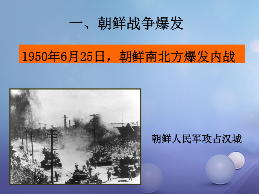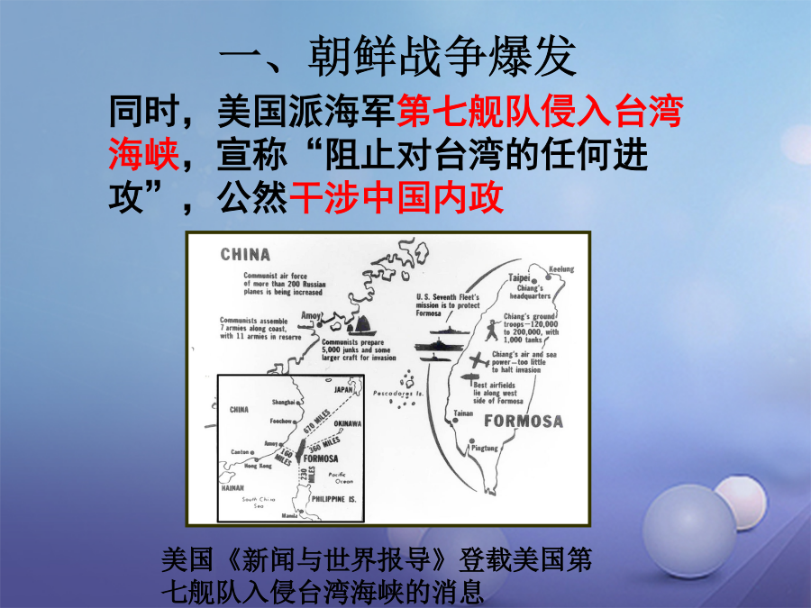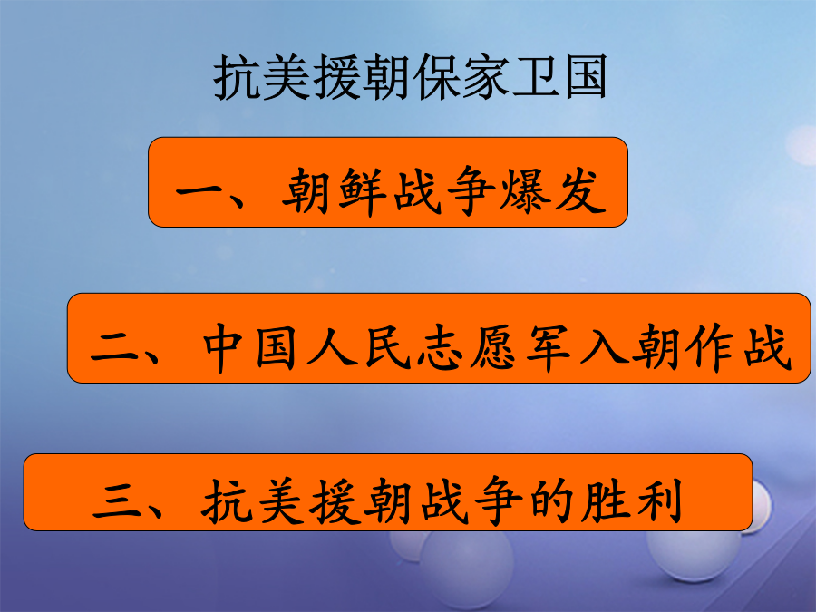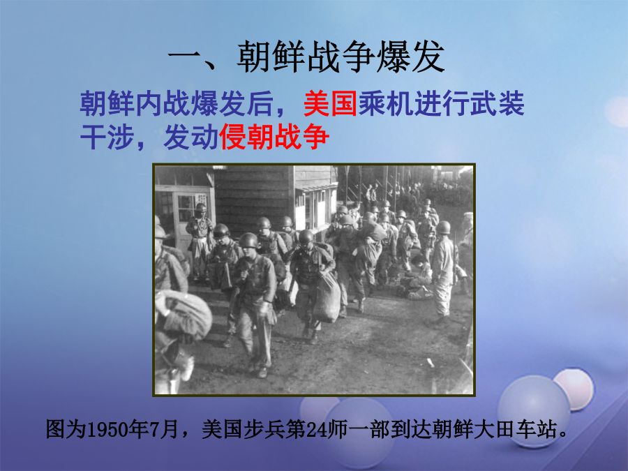 第二课二、中国人民志愿军入朝作战1950年6月25日,朝鲜南北方爆发内战图为1950年7月,美国步兵第24师一部到达朝鲜大田车站。美国《新闻与世界报导》登载美国第七舰队入侵台湾海峡的消息1950年10月初,美军悍然越过三八线,大举入侵朝鲜民主主义共和国,占领平壤,并向中朝边境迅速推进,把战火烧到鸭绿江边中国辽宁安东(今丹东)遭美军轰炸后的民房朝鲜民主主义共和国处于危急之中,中国的安全受到严重威胁二、中国人民志愿军入朝作战应金日成首相的请求,中国政府毅然作出“抗美援朝、保家卫国”的决策志愿军誓师大会1950年10月19日,首批志愿军部队跨过鸭绿江.(1)1950年10月,以彭德怀为司令员的中国人民志愿军开赴朝鲜,与朝鲜军民一起抗击美国侵略者。中国人民志愿军司令彭德怀2.爱国主义和革命英雄主义的精神上甘岭战役中,黄继光所在部队奉命夺取敌人攻占的高地,部队遇到一个火力点的猛烈射击,黄继光身负重伤,在手榴弹用完的情况下,忍痛爬到敌堡前,用胸膛堵住正在扫射的机枪口,用自我牺牲完成了任务2.爱国主义和革命英雄主义的精神三、抗美援朝战争的胜利1953年7月27日,“联合国军”总司令克拉克在停战协定上正式签字。他说自己是第一个在没有取得胜利的停战协定上签字的美国司令官,感到一种失望和痛苦抗美援朝胜利的意义中朝友谊纪念碑人们为什么称中国人民志愿军为 “最可爱的人”?1、中国人民志愿军何时开始跨过鸭绿江同美军作战() A1950年6月B1950年10月 C1951年6月D1951年10月
