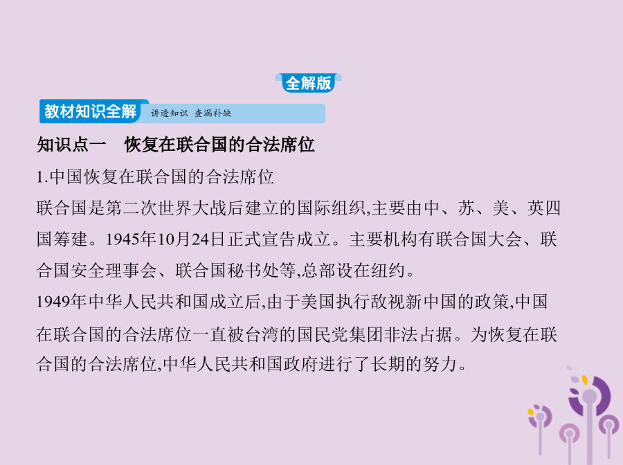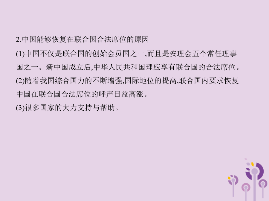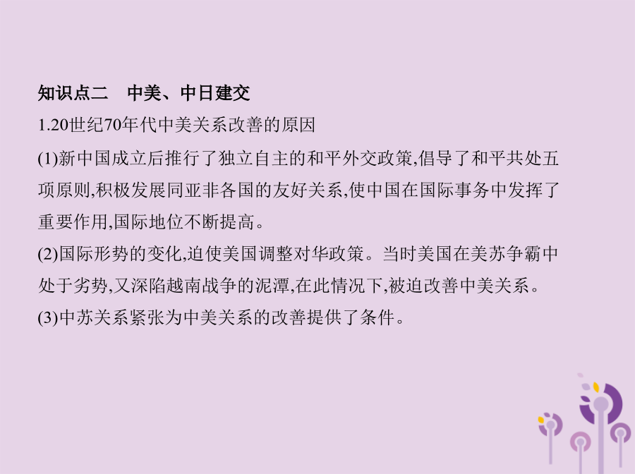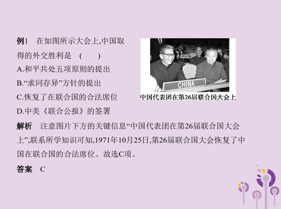 知识点一恢复在联合国的合法席位1971年10月25日,第26届联合国大会以76票赞成、35票反对、17票弃权的压倒多数通过了阿尔巴尼亚、阿尔及利亚等23国的提案,决定恢复中华人民共和国在联合国的一切合法权利,并立即把国民党集团的代表从联合国及其所属一切机构中驱逐出去。例1在如图所示大会上,中国取 得的外交胜利是 () A.和平共处五项原则的提出 B.“求同存异”方针的提出 C.恢复了在联合国的合法席位 D.中美《联合公报》的签署2.中国能够恢复在联合国合法席位的原因 (1)中国不仅是联合国的创始会员国之一,而且是安理会五个常任理事国之一。新中国成立后,中华人民共和国理应享有联合国的合法席位。 (2)随着我国综合国力的不断增强,国际地位的提高,联合国内要求恢复中国在联合国合法席位的呼声日益高涨。 (3)很多国家的大力支持与帮助。知识点二中美、中日建交 1.20世纪70年代中美关系改善的原因 (1)新中国成立后推行了独立自主的和平外交政策,倡导了和平共处五项原则,积极发展同亚非各国的友好关系,使中国在国际事务中发挥了重要作用,国际地位不断提高。 (2)国际形势的变化,迫使美国调整对华政策。当时美国在美苏争霸中处于劣势,又深陷越南战争的泥潭,在此情况下,被迫改善中美关系。 (3)中苏关系紧张为中美关系的改善提供了条件。例220世纪70年代中国外交事业不断取得新发展的原因是 () ①中国国际地位的提高②国际形势的变化 ③中国国家实力的增强④三大改造的基本完成 A.①②③B.②③④C.①③④D.①②④2.尼克松访华和中美《联合公报》的发表 1972年2月21日至28日,尼克松访问中国,成为第一位访问新中国的美国总统。尼克松会见了毛泽东主席,并与周恩来总理举行会谈。经过会谈,中美双方于2月28日在上海签署中美《联合公报》,标志着两国结束了长期的敌对状态,中美关系开始走向正常化。这不但是中美关系史上的一件大事,也对国际形势产生了重大影响。例3从“跨越太平洋的握手”到“跨越太平洋的合作”,中美关系展现出广阔的发展前景和蓬勃的生命力。中美两国“跨越太平洋的握手”开始于 () A.1953年签订《朝鲜停战协定》 B.1971年联合国恢复中国的合法席位 C.1972年中美签署《联合公报》 D.1979年中美正式建交3.1941年到1979年美国对华政策的变化及原因例4下列示意图反映了中美关系的变化。这体现了 () (注:1954年日内瓦会议上美国国务卿杜勒斯拒绝与周恩来总理握手) ①中美关系不断深化发展 ②我国外交政策由对抗走向对话 ③我国积极寻求与大国结盟 ④和平与发展已经成为时代主题 A.①②B.②③C.①④D.③④解析①④都是对中美关系变化发展的正确表述。②③说法错误,我国始终奉行独立自主的和平外交政策;我国奉行不结盟政策,不与任何大国结盟。4.20世纪50—70年代新中国的外交成就例5解析本题考查新中国的外交,主要考查学生提取信息分析问题的能力。漫画《梅开三度》反映的是20世纪70年代新中国外交事业的发展,A、B、D三项均发生在20世纪50年代,C项发生在1971年,故选择C项。知识点三全方位外交例6下列有关中国改革开放后的外交表述错误的一项是 () A.中国不必再奉行独立自主的和平外交政策 B.继续坚持和平共处五项原则 C.积极同其他国家发展友好合作关系 D.注重改善和发展与周边国家的睦邻友好关系【教材图片导读】 (1)恢复中华人民共和国在联合国的一切合法权利的提案通过后,多国代表欢呼庆祝(2)毛泽东会见美国总统尼克松 点拨1972年2月21日至28日,尼克松应中国总理周恩来的邀请访问中国,成为第一位访问中国的美国总统。尼克松会见了毛泽东主席,并同周恩来总理举行了会谈。妙招巧记歌谣记忆法:国际威望再提高,支持复联呼声大。恢复席位在联大,中国外交获胜利。五星红旗“联大”飘,中国地位大提高。基辛格秘密来华,尼克松应邀访华。签署了《联合公报》,关系始走正常化。1979年中美建交,美国承认一中国。田中角荣来访华,中日建交在 1972(年)。许多国家来建交,中国建交新热潮。外交体现新特点,全方位和多层次。多边外交积拓展,加强合作保和平。积极参与多活动,加强合作促交流。图示归纳 1.1971年,在第26届联合国大会上,中国加入联合国。(✕) 提示:中国是联合国创始会员国之一。新中国成立后,在美国等国家的操纵下,中国在联合国的席位一直被台湾的国民党集团非法占据。1971年,第26届联合国大会恢复中华人民共和国在联合国的合法席位。4.中美建交发生在中日建交以前。(✕) 提示:1972年2月,美国总统尼克松访华,中美双方在上海签署并发表《联合公报》。中美两国二十多年的对抗结束了,两国关系开始走向正常化。1979年,中美正式建交。1972年,日本首相田