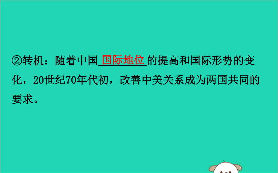 第17课 外交事业的发展一、恢复在联合国的合法席位 1.背景:在_____等国家的操纵下,联合国长期将中华 人民共和国排斥在外。为争取恢复_________,中华人 民共和国进行了长期的努力,得到越来越多的国家的 支持。2.概况:_____年10月,第___届联合国大会通过决 议,恢复中华人民共和国在联合国的一切合法权利。 3.意义:这是中国_____上的重大胜利。中国积极参与 国家事务,作为联合国安理会常任理事国之一,发挥 了重要作用。二、中美、中日建交 1.中美建交: (1)背景。 ①敌对:美国政府敌视新中国,对新中国实行封锁禁 运、包围威胁的政策。双方_____的状态长达二十多 年。②转机:随着中国_________的提高和国际形势的变 化,20世纪70年代初,改善中美关系成为两国共同的 要求。(2)历程。 ①接触:1971年7月,_______秘密访华,同周恩来总 理举行会谈。 ②访华:1972年,_______访华,中美双 方正式签署并发表了《_________》。 ③建交:_____年,中美正式建立外交关系。(3)意义:美国承认只有_________,_____是中国领 土的一部分,承认中华人民共和国是中国的唯一合法 政府。 2.中日建交:1972年,日本首相_________访华,两 国正式建立外交关系。三、全方位外交 1.背景:改革开放后,继续奉行_________的和平外 交政策,坚持在和平共处五项原则的基础上,同其他 国家发展友好合作关系。2.表现: (1)注重改善和发展与周边国家的_________关系,注 重加强同发展中国家的_________合作,力争中美、中 日关系稳定发展,逐步实现中苏关系正常化,积极发 展与_____国家的关系。 (2)中国积极发展_________关系,积极参与全球治理 体系改革和建设,推动构建人类命运共同体。(3)拓展_________,加强与联合国的合作,为解决区 域性争端、维护世界和平和建立一个公正合理的_____ _______而努力。 (4)中国广泛参与_________、社会领域的活动,在环 境、粮食、预防犯罪、禁毒、难民、妇女等_________ ___上发挥了积极作用。3.影响: (1)外交布局:中国特色大国外交全面推进,形成全方 位、多层次、立体化的外交布局。 (2)外交成果:中国与世界上____多个国家建交,参加 了100多个政府间国际组织的工作。(3)承办会议:中国多次举办亚太经合组织领导人非 正式会议、_______集团领导人峰会等重要国际会议, 加强国际合作。 (4)外交作用:成为维护和促进世界和平、稳定与发展 的坚定力量,在国际事务中发挥着日益重要的作用。【因果探源·历史理解】 中国恢复在联合国的合法席位的意义。 提示:(1)对中国的影响:它是中国外交的胜利,提高了中国的国际地位。 (2)对美国的影响:它标志着美国把中国排斥在国际社会之外的政策彻底失败。(3)对世界的影响:它大大增强了第三世界国家在联合国的力量,有利于打破超级大国通过控制联合国操纵国际事务的局面。 (4)从此,中国作为安理会常任理事国,在国际事务中发挥着重要的作用。【经典史料·历史解释】 “你的手伸过世界最辽阔的海洋来和我握手——25年没有交往了啊!” ——周恩来 【解读】尼克松访华,中美结束了长期的敌对状态,两国关系开始走向正常化,中美关系的缓和,有利于世界和平。【易混点拨】 ☉易混点:1972年,美国总统尼克松访华,签署《联合公报》,促使两国关系开始走向正常化,1978年12月,中美两国签署《关于建立外交关系的联合公报》,宣布双方自1979年1月1日起建立外交关系。☉易错点:中国既是联合国的创始会员国,也是联合国安理会的常任理事国,由于美国的阻挠,新中国在联合国的合法权利被长期剥夺。1971年10月25日,第26届联合国大会恢复中华人民共和国在联合国的合法权利。【归纳总结·知识构建】【历史纵横·时空观念】当历史的车轮驶入20世纪70年代时,新中国的外交事业出现了蓬勃发展的态势,新中国开始走向世界政治舞台……【扬眉吐气五星红旗高高飘扬】 材料一下图为在中国重返联合国会议上乔冠华激动心情难以抑制仰天大笑,被记者拍下,这张照片在新闻摄影展中展出。纽约某报对乔冠华这一笑也倍加赞赏,称他为“大国家的人物”,文章题目就叫《乔的笑》。材料二毛泽东明确指示说:“要去,为什么不去?马上就组团去。这是非洲黑人兄弟把我们抬进去的,不去就脱离群众了。” (1)1945年10月24日联合国正式成立,总部设在美国纽约。中、美、苏、英、法为五大常任理事国。为什么说中国是重返联合国呢?中国是何时、哪次会议上重返联合国的?提示:原因:中国本来是联合国的创始会员国和五大常任理事国之一,由于美国的阻挠,新中国长期以来