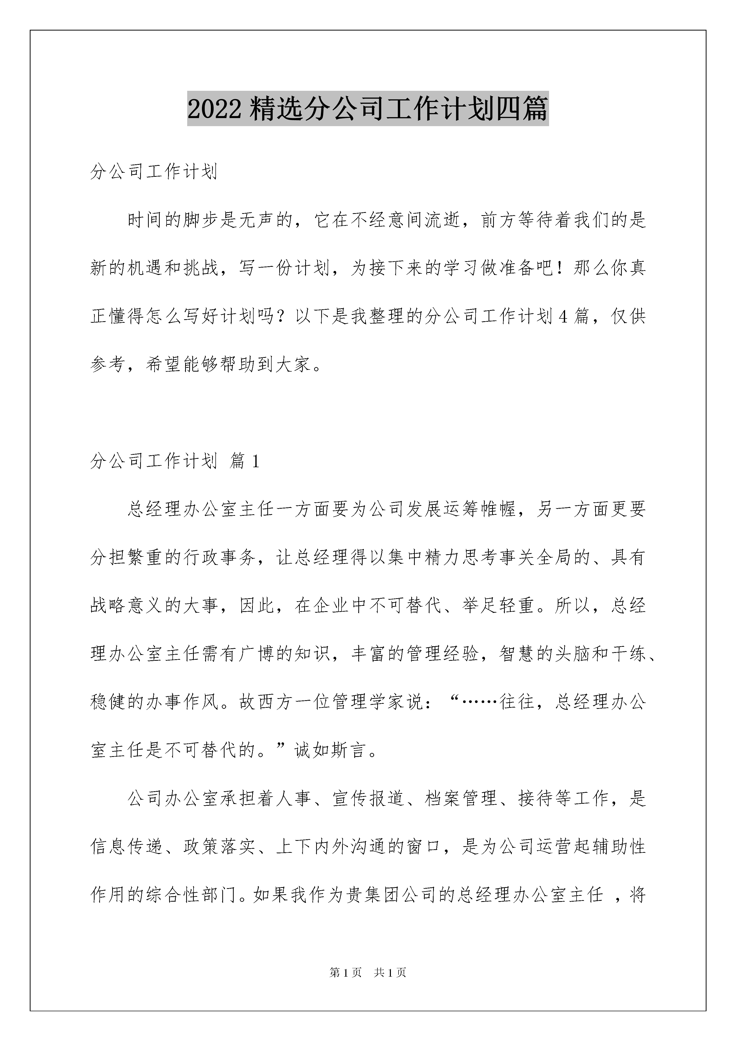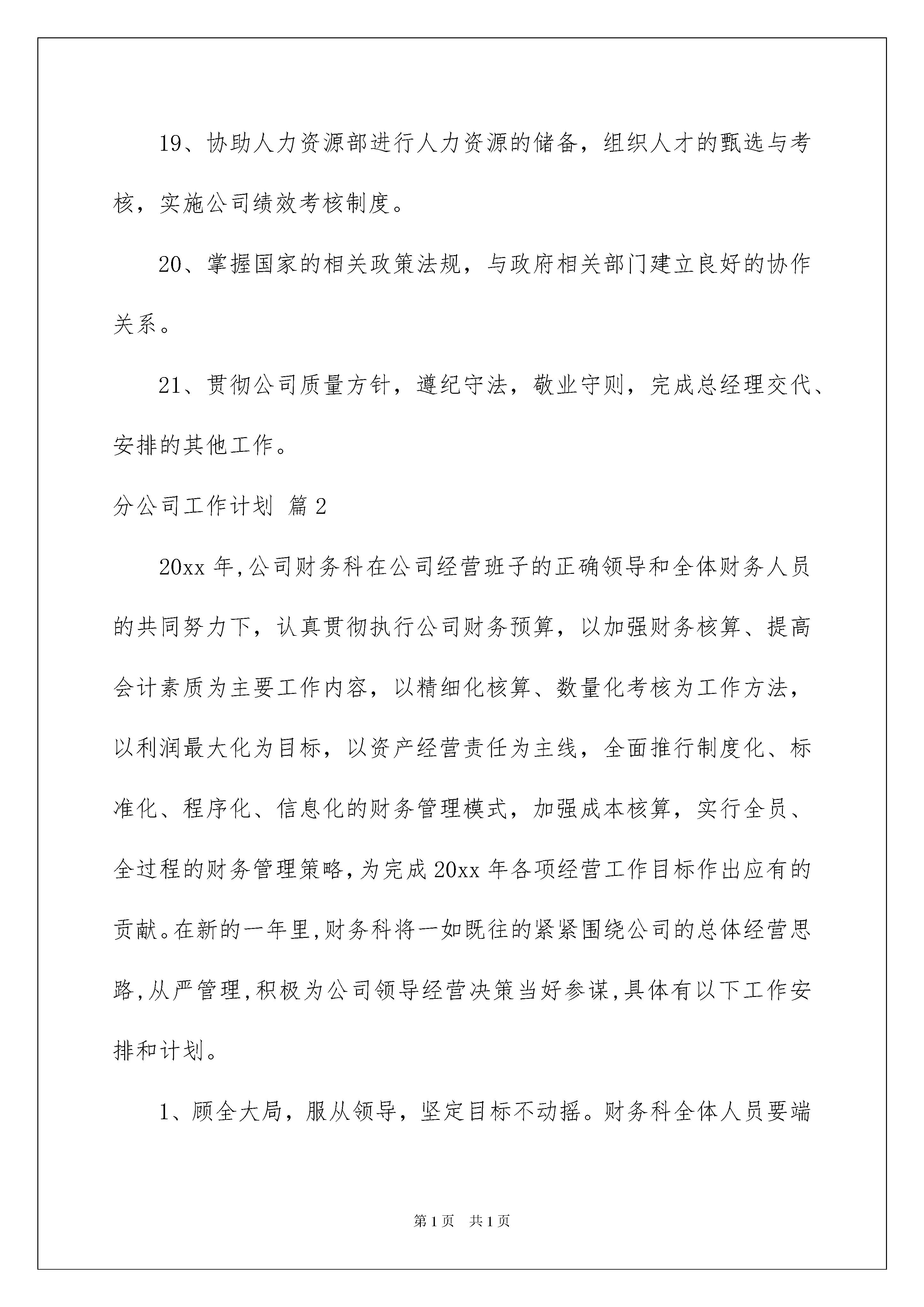 2022精选分公司工作计划四篇分公司工作计划时间的脚步是无声的,它在不经意间流逝,前方等待着我们的是新的机遇和挑战,写一份计划,为接下来的学习做准备吧!那么你真正懂得怎么写好计划吗?以下是我整理的分公司工作计划4篇,仅供参考,希望能够帮助到大家。分公司工作计划篇1总经理办公室主任一方面要为公司发展运筹帷幄,另一方面更要分担繁重的行政事务,让总经理得以集中精力思考事关全局的、具有战略意义的大事,因此,在企业中不可替代、举足轻重。所以,总经理办公室主任需有广博的知识,丰富的管理经验,智慧的头脑和干练、稳健的办事作风。故西方一位管理学家说:“……往往,总经理办公室主任是不可替代的。”诚如斯言。公司办公室承担着人事、宣传报道、档案管理、接待等工作,是信息传递、政策落实、上下内外沟通的窗口,是为公司运营起辅助性作用的综合性部门。如果我作为贵集团公司的总经理办公室主任,将开展的工作计划如下:一、充分深入地了解公司情况,找准自身的工作定位;了解公司的情况主要包括:公司的发展远景、发展战略、管理理念、企业文化等;公司的主要业务各部门的各项工作及流程、工作技巧及技能、组织结构;公司的整体运作以及公司的目前状况等。在了解了公司的远景和发展战略等基本情况、深入领会了自己的工作职责的基础上,对自己的工作进行定位,按照职位对公司的作用来明确工作重心,并就这些工作重心来制定工作计划方案和备选方案。二、初步工作方向:1、努力加强自身素质和业务水平的提高,切实起到表率作用,做到以理服人、以德服人、以能服人;2、努力提高理论水平,从根本上解决思想认识和觉悟的不足;3、努力提高管理水平,全面提升办公室的组织、协调、沟通、督促能力;4、努力改进工作方法,提高工作效率;5、营造团结互助、倾力协作工作氛围;6、加快规范制度建设,使各项工作有序、高效开展;7、建立办公室工作会议制度,并邀请各部门负责人参加,开诚布公的进行面对面的沟通以及时改进工作作风;三、根据本人以往工作经验,阐述以下几点;(一)、总经理办公室主任的岗位职责:1、在总经理领导下负责办公室的全面工作,努力作好总经理的参谋助手,起到承上启下的作用,认真做到全方位服务。2、在总经理领导下负责企业具体管理工作的布置、实施、检查、督促、落实执行情况;3、负责公司人事管理和培训管理,制订培训计划,协助领导做好员工考评工作。4、协助总经理作好经营服务各项管理并督促、检查落实贯彻执行情况;5、协助总经理做好各部门各项目标、任务的考核。6、负责各类文件的分类呈送,请集团领导阅批并转有关部门处理。7、协助总经理调查研究、了解公司经营管理情况并提出处理意见或建议,供总经理决策。8、做好总经理办公会议和其他会议的组织工作和会议纪录。做好“决议”、“决定”等文件的起草、发布。9、负责公司各类文件的控制和信息管理;做好企业内外文件的发放、登记、传递、催办、立卷、归档、整理等工作。10、负责内部质量审核和质量改进工作的日常管理工作;11、负责不合格项的纠正和预防措施以及质量改进工作的日常管理工作。12、负责企业内外的公文办理,解决来信、来访事宜,及时处理、汇报。13、负责上级领导机关或兄弟单位领导的接待、参观工作。14、掌握总经理的日程,做好预约工作,安排商务旅行。15、配合总经理抓好安全工作;16、协助总经理确保公司管理制度和流程的标准化及可操作性。17、协助总经理制定公司各项规章制度,定期组织各部门学习,并检查各项规章制度的具体执行情况。18、协助人力资源部完善公司行政管理,协助人力资源部制定公司人力资源计划、人力资源的开发,满足公司各部门、各岗位的人力需求。19、协助人力资源部进行人力资源的储备,组织人才的甄选与考核,实施公司绩效考核制度。20、掌握国家的相关政策法规,与政府相关部门建立良好的协作关系。21、贯彻公司质量方针,遵纪守法,敬业守则,完成总经理交代、安排的其他工作。分公司工作计划篇220xx年,公司财务科在公司经营班子的正确领导和全体财务人员的共同努力下,认真贯彻执行公司财务预算,以加强财务核算、提高会计素质为主要工作内容,以精细化核算、数量化考核为工作方法,以利润最大化为目标,以资产经营责任为主线,全面推行制度化、标准化、程序化、信息化的财务管理模式,加强成本核算,实行全员、全过程的财务管理策略,为完成20xx年各项经营工作目标作出应有的贡献。在新的一年里,财务科将一如既往的紧紧围绕公司的总体经营思路,从严管理,积极为公司领导经营决策当好参谋,具体有以下工作安排和计划。1、顾全大局,服从领导,坚定目标不动摇。财务科全体人员要端正态度,积极发挥主观能动性,时刻