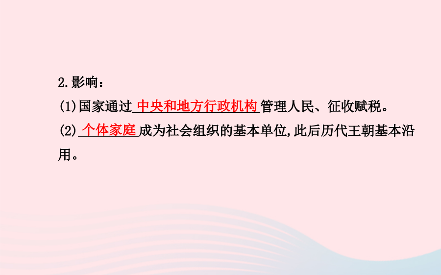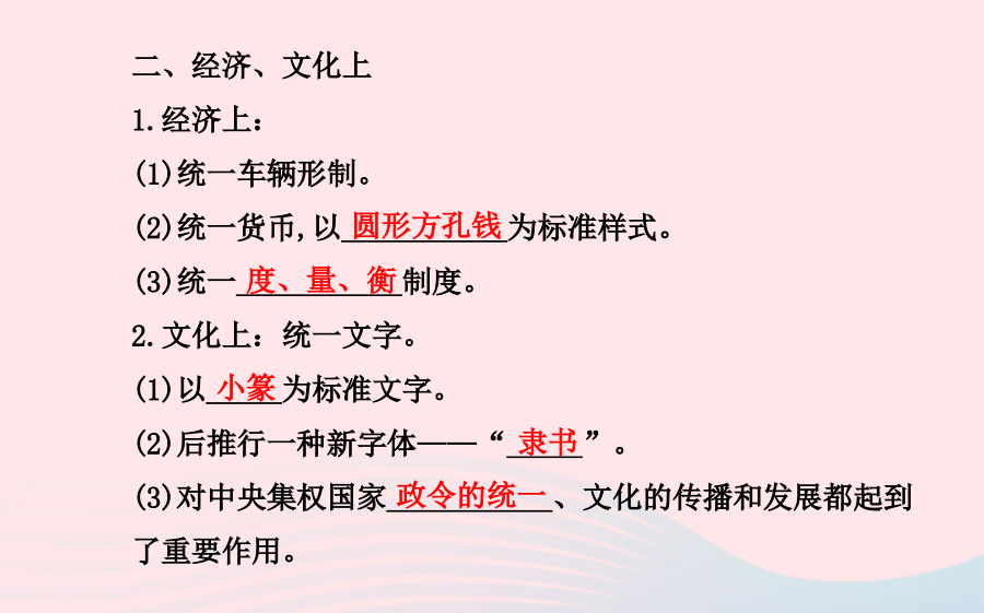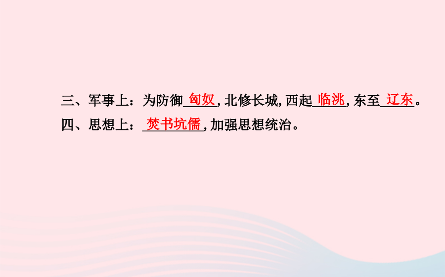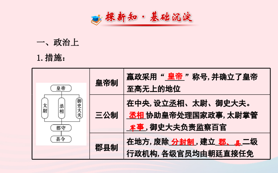 第14课 秦始皇建立中央集权的措施一、政治上 1.措施:2.影响: (1)国家通过___________________管理人民、征收赋税。 (2)_________成为社会组织的基本单位,此后历代王朝基本沿用。二、经济、文化上 1.经济上: (1)统一车辆形制。 (2)统一货币,以___________为标准样式。 (3)统一___________制度。 2.文化上:统一文字。 (1)以_____为标准文字。 (2)后推行一种新字体——“_____”。 (3)对中央集权国家___________、文化的传播和发展都起到 了重要作用。三、军事上:为防御_____,北修长城,西起_____,东至_____。 四、思想上:_________,加强思想统治。【记一记】 ☉西周在地方上实行分封制,以血缘纽带为基础;秦朝在地方上实行郡县制,各级官员都由朝廷直接任免。 ☉秦始皇规定以小篆作为标准文字,而并非是大篆。 ☉秦始皇规定以秦国货币圆形方孔钱为标准样式,统一全国货币,又规定了统一的度、量、衡制度。☉歌谣记忆 始皇咸阳来登基,至高无上大权集。 丞相太尉和御史,地方推行郡县制。 全国统一度量衡,还有货币和文字。 为了思想大控制,焚书坑儒有得失。 抵御匈奴筑长城,开疆拓土好疆域。【读一读】 一法度衡石丈尺,车同轨,书同文字。 ——《史记》 【解读】此记载是对秦始皇统一文字、度量衡措施的解读,称量物品用统一大小的量具,即重量单位要一致,长度单位要一致,所有的车辆两车轮的间距要相等,写书信或文章时用相同的文字。【读图学史】 A:_____B:___________【线索构建】 A:_____B:_____同学们,你们一定非常喜欢看科幻小说吧!今天让我们一起穿越时空隧道……来到秦朝,与秦始皇亲切会晤吧! 【人物专访】 我们首先来到秦朝,秦始皇正在接受记者采访……如果你现在就是秦始皇,你会怎样回答记者们的问题呢?(1)记者问:“尊敬的始皇帝,据说您大力推行加强中央集权的措施,请问在中央主要由哪些官员负责呢?” “秦始皇”答:。 提示:我在中央设立了三个主要官职,包括丞相、太尉、御史大夫。 (2)记者问:“陛下,您在地方废除了分封制,那您会采取什么新的措施来加强管理呢?” “秦始皇”答:。 提示:在地方,废除了分封制,建立由中央直接管辖的郡、县二级行政机构,把全国分为三十六郡,郡下设县。(3)记者问:“请问您为巩固统一,在其他方面又采取了什么措施呢?” “秦始皇”答:。 提示:我还规定以小篆作为标准文字,颁行天下;我还规定统一度、量、衡制度;为了防范匈奴,还修筑西起临洮、东到辽东的万里长城。【体制揭秘】(4)上图体制中,太尉、丞相、御史大夫各有哪些职责?这一政治体制的作用是什么? 提示:丞相协助皇帝处理国家政事,太尉掌管军事,御史大夫负责监察百官。 作用:国家通过中央和地方行政机构管理人民、征收赋税,个体家庭成为社会组织的基本单位。此后历代王朝基本沿用秦朝开创的中央集权制度。【历史法庭】(5)如果你是法官,你将如何断案? 提示:秦始皇建立了我国历史上第一个统一的中央集权的封建国家,统一文字、货币、度量衡等,对后世产生了深远影响;但是他又是一个统治残暴的封建皇帝。他广建宫殿陵墓,浪费了大量人力、物力、财力,影响了人民正常的生产和生活;他还制定残酷的刑法,使人民生活在水深火热之中;他焚书坑儒,钳制了思想,摧残了文化。【备选探究】 探究主题秦朝中央集权措施 【创新制度,巩固统一】 材料一材料二一法度衡石丈尺,车同轨,书同文字。 ——《史记》 依据材料一、二并结合所学,概括秦始皇巩固统一的措施。提示:【核心点拨】 1.秦朝实现了哪些“统一”? 提示:(1)秦的统一,结束了春秋战国以来长期争战混乱的局面,开创了统一的新局面。 (2)秦朝是我国历史上第一个统一的多民族的国家。 (3)统一货币、度量衡、文字。 (4)修筑长城,开凿灵渠,有利于国家统一和经济发展。2.秦长城的意义。 提示:万里长城的修筑,巩固了北方边防,保障了中原农业生产的发展,但同时也是秦朝奴役百姓的见证;万里长城是一项伟大的工程,是我国古代劳动人民血汗和智慧的结晶。3.在秦朝巩固统一的措施中,哪些对后世有深远的影响,甚至有些是我们今天还能感受的? 提示:建立起专制主义中央集权国家;实行郡县制;确立统一的疆域;统一文字;统一货币;统一度量衡;统一车轨等。4.如何评价秦始皇? 提示:(1)政治上:建立起中国历史上第一个中央集权专制的封建王朝,为今后中国各个朝代的建立打下基础。 (2)经济上:统一货币、度量衡,为中国今后的贸易活动提供了帮助。 (3)文化上:统一文字;“焚书坑儒”,对中国的文化遗产造成了极其严重的破坏。 (4)负面影响:在秦统一之后,徭役赋税繁重,为今后的灭亡