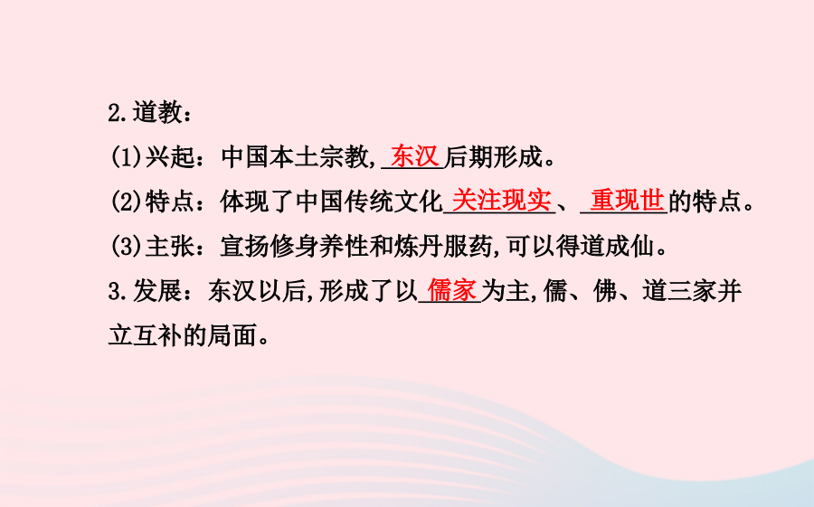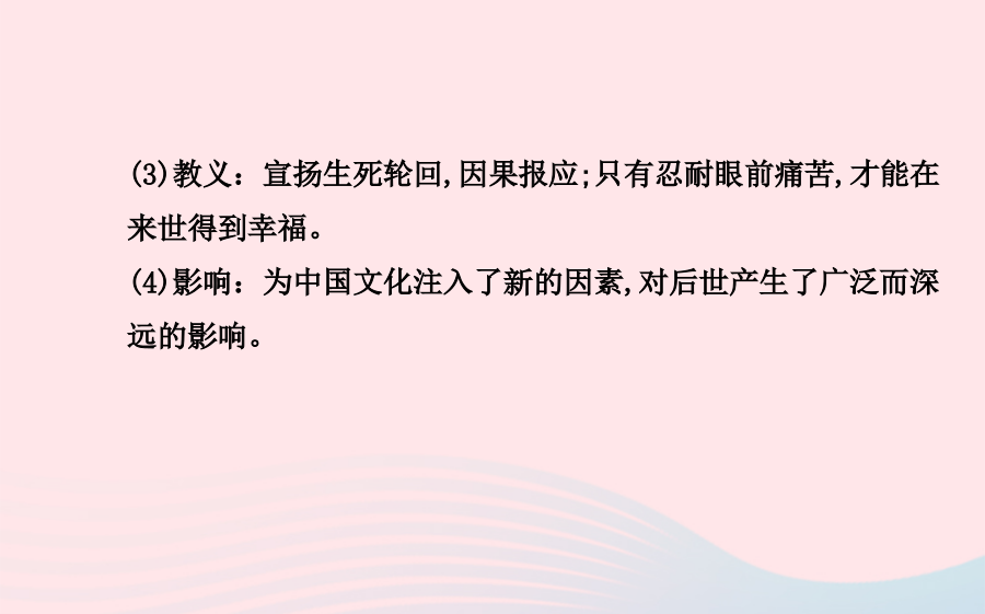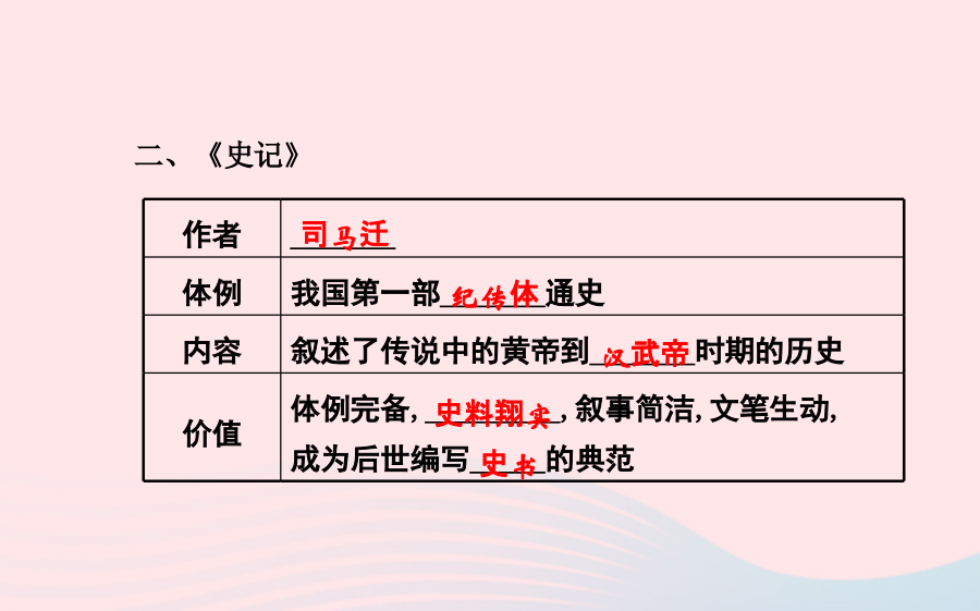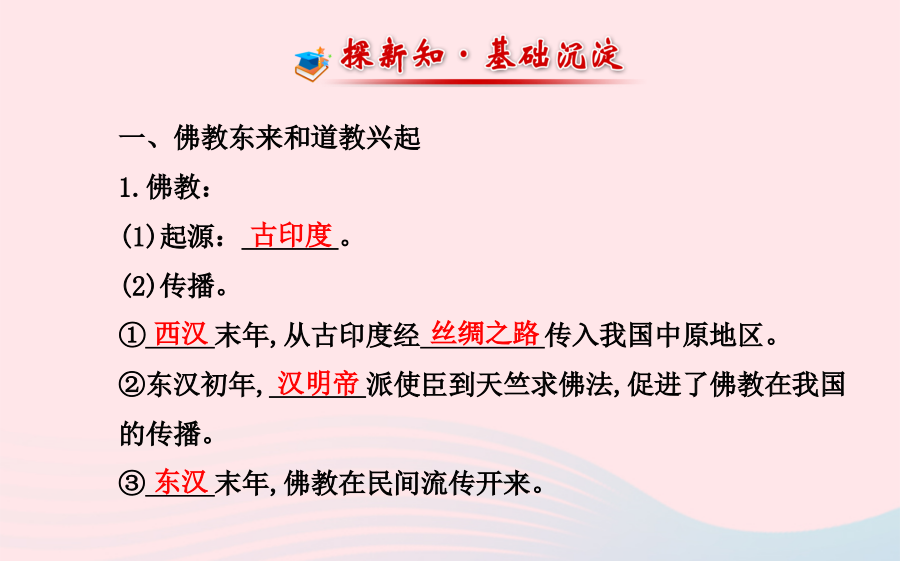 第18课 昌盛的文化一、佛教东来和道教兴起 1.佛教: (1)起源:_______。 (2)传播。 ①_____末年,从古印度经_________传入我国中原地区。 ②东汉初年,_______派使臣到天竺求佛法,促进了佛教在我国的传播。 ③_____末年,佛教在民间流传开来。(3)教义:宣扬生死轮回,因果报应;只有忍耐眼前痛苦,才能在来世得到幸福。 (4)影响:为中国文化注入了新的因素,对后世产生了广泛而深远的影响。2.道教: (1)兴起:中国本土宗教,_____后期形成。 (2)特点:体现了中国传统文化_________、_______的特点。 (3)主张:宣扬修身养性和炼丹服药,可以得道成仙。 3.发展:东汉以后,形成了以_____为主,儒、佛、道三家并 立互补的局面。二、《史记》三、秦始皇陵兵马俑 1.地点:陕西临潼。 2.地位:是秦汉时期_________的杰出代表。 3.内容:以步兵、车兵、骑兵组成的大型地下军阵。 4.价值:反映出秦朝_________的高超水平,生动展现出_____ _____的精神风貌。【记一记】 ☉佛教和道教在中国传播的原因,一方面是统治者提倡,因为迎合了统治者麻痹人民、加强统治的需要。另一方面,饱受困苦的人民在心理上得以安慰。 ☉兵马俑是“20世纪最重要的考古发现”,也是迄今为止世界上出土的最大艺术宝库。 ☉图示记忆佛教的传播☉歌谣记忆: 佛教起源古印度,西汉末年入中原; 土生土长是道教,东汉后期始形成; 司马迁写《史记》,记述黄帝到武帝; 编撰使用纪传体,文笔简洁是范例; 秦始皇陵兵马俑,雕塑水平显神功。【读一读】 “史家之绝唱,无韵之《离骚》”。 ——鲁迅 【解读】《史记》是所有历史学家所写著作中水平最高的,后世再也没有超过其水平的了,堪称没有韵律的《离骚》。这句话说明《史记》是一部不朽的史学著作,也是一部优秀的文学作品。【读图学史】 A:_______________B:_____C:_________【线索构建】 A:_____B:_____秦汉时期是中国古代文化大发展的时期。它的发展为此后两千多年的封建文化的发展奠定了基础,请你根据下列史料,完成探究任务。 【一部亘古未有的史书】 材料一(1)为了编写史书,司马迁四处收集写史的材料。司马迁收集资料的途径有哪些? 提示:考察风俗人情,访求历史古迹,收集历史资料等。 (2)“究天人之际,通古今之变,成一家之言”,这是司马迁撰写《史记》的目的。其中“通古今之变”中的“古”“今”分别指何时? 提示:“古”指黄帝时期; “今”指汉武帝前期。【一个世界独创的奇迹】 材料二(3)秦始皇陵兵马俑反映了怎样一种精神风貌? 提示:秦始皇陵兵马俑再现了当年秦国军队统一六国的宏大场面和威武雄姿,生动地表现了秦始皇的烜赫军势,展现了一种开拓进取的精神风貌。材料三联合国秘书长潘基文盛赞秦始皇陵兵马俑是“人间奇迹,举世无双”。法国前总统希拉克说:“世界上有七大奇迹。它的发现,使世界上有了八大奇迹。” (4)结合材料和所学知识,简要评价秦始皇陵兵马俑。 提示:秦始皇陵兵马俑是秦汉时期雕塑艺术的杰出代表,反映出秦朝雕塑艺术的高超水平,生动展现出开拓进取的精神风貌。【一个令人深思的问题】 (5)中国文化源远流长。在历史演进的长河中,有曲折的狭路,也有江波平阔之处。作为中国历史上的英雄时代,秦汉史的整体风貌“闳放”而“雄大”,你能说出秦汉时期文化“闳放”的原因吗? 提示:国家统一,社会安定为文化的发展提供了前提;封建经济繁荣,为文化的发展提供了物质基础;劳动人民辛勤劳动、发明创造为秦汉文化的繁荣创造了条件;各民族、各地区之间经济文化交流的加强。【备选探究】 探究主题佛教与道教 阅读下列材料: 材料一材料二……佛教宣扬生死轮回,因果报应,认为人生是痛苦的,只有忍耐眼前的一切痛苦,信奉佛教,努力修行,才能在来世得到幸福。这种教义有利于维护现存的等级秩序,对“来世天国”的期待,也在贫苦民众中产生了极大的吸引力。 材料三道教养生炼丹,在客观上促进了中国古代化学、医学、药物学的发展,道教对古代民俗的影响无处不在,像玉皇大帝、太上老君、土地爷、灶君等神灵都来自道教虚构的神仙世界。(1)材料一两幅图片中的建筑物分别与哪种宗教有关?你能说出这两种宗教的起源吗? 提示:佛教和道教。佛教起源于古印度,道教兴起于我国东汉时期。 (2)结合材料,说一说宗教的传播和发展,对我国有何影响。 提示:影响:宗教的传播麻痹了人民的反抗意识,成为统治者维护专制统治的工具,也带来了愚昧和迷信,但在一定程度上丰富了中国文化发展的多样性,是中国文化的重要组成部分。【核心点拨】 1.为什么《史记》在史学领域具有很高的地位? 提示:《史记》是一部杰出的历史著作,它开创了编写历史著作的新体例—