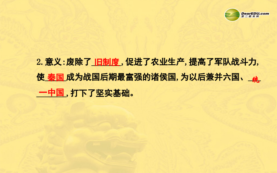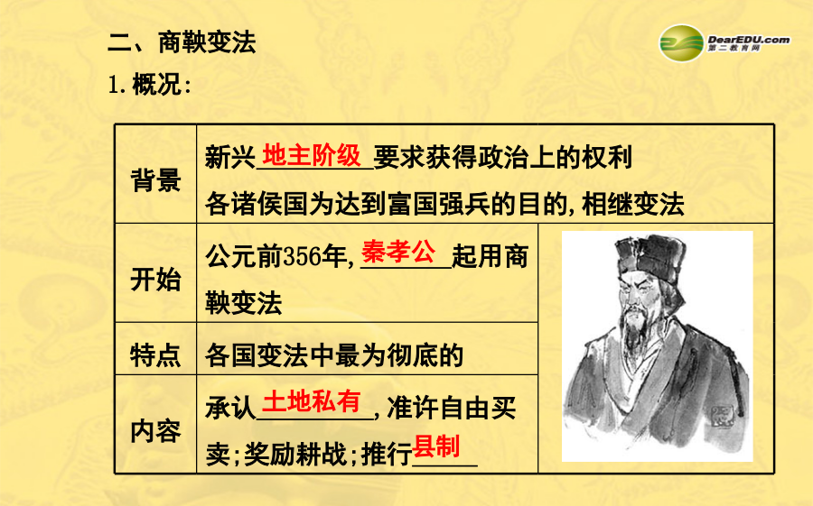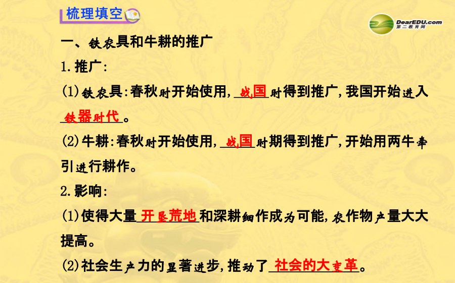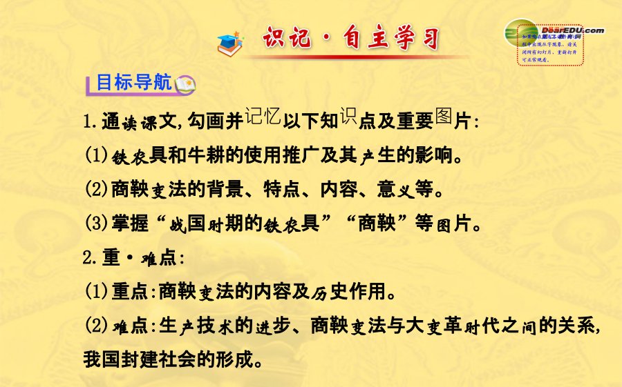 第9课战国时期的社会大变革1.通读课文,勾画并记忆以下知识点及重要图片: (1)铁农具和牛耕的使用推广及其产生的影响。 (2)商鞅变法的背景、特点、内容、意义等。 (3)掌握“战国时期的铁农具”“商鞅”等图片。 2.重·难点: (1)重点:商鞅变法的内容及历史作用。 (2)难点:生产技术的进步、商鞅变法与大变革时代之间的关系,我国封建社会的形成。一、铁农具和牛耕的推广 1.推广: (1)铁农具:春秋时开始使用,_____时得到推广,我国开始进入 _________。 (2)牛耕:春秋时开始使用,_____时期得到推广,开始用两牛牵 引进行耕作。 2.影响: (1)使得大量_________和深耕细作成为可能,农作物产量大大 提高。 (2)社会生产力的显著进步,推动了_____________。二、商鞅变法 1.概况:2.意义:废除了_______,促进了农业生产,提高了军队战斗力, 使_____成为战国后期最富强的诸侯国,为以后兼并六国、___ _______,打下了坚实基础。1.牛耕的推广,使畜力代替人力,是我国农业发展史上的一次革命。 2.商鞅变法中最重要的一条,也最能体现变法的封建性质的是“承认土地私有,准许自由买卖”。 3.春秋战国时期是我国奴隶社会结束、封建社会形成的历史时期,总的来说是社会大变革的时期。 4.衡量一场变革成败的标准在于是否推动了社会的进步。春秋战国时期,铁农具和牛耕的使用推广,大大促进了生产力的发展。随着私田开垦的增多,产生了新兴的地主阶级。随着地主阶级力量的壮大,他们要求获得政治上的权利。各国为顺应历史潮流,纷纷进行变法,商鞅变法是其中最彻底的变法。通过变法,新兴的封建制度得以确立。探究主题1铁农具和牛耕的推广 1.阅读下列材料: 材料一材料二《国语》载,公元前493年,晋国贵族范氏、中行氏在国内战争中失败后逃往齐国,子孙成为齐国农民,所谓“将耕于齐,宗庙之牺,为畎亩之勤”,是说把过去宗庙里作牺牲祭品的牛,用于田间耕作。 材料三农,天下之大业也;铁器,民之大用也。器用便利,则用力少而得作多,农夫乐事劝功。 ——《盐铁论·水旱》【探究思考】(1)通过材料一你能得到什么历史信息?在铁农具出现以前,我国劳动人民曾经使用过哪些生产工具?讨论一下铁农具与以前的生产工具相比有何优越性。 【参考答案】①春秋时开始使用铁农具,在战国时得到了推广,我国开始进入铁器时代。②木制工具、石器工具、骨质工具、青铜工具。③铁矿资源蕴藏量大,便于开采,铁农具坚硬锋利耐用,能更好开发山林、开垦田地。(2)根据材料二,指出牛耕最早出现在什么时候。铁农具的出现与牛耕的使用有什么关系? 【参考答案】①春秋时期。②铁农具的出现,推动了牛耕的普及。 (3)结合材料三和所学知识谈谈铁农具和牛耕的普及所产生的巨大历史意义。 【参考答案】铁农具和牛耕的推广,使得大量开垦荒地和精耕细作成为可能,也为兴修水利创造了条件,农作物产量大大提高。社会生产力的显著进步,推动了社会的大变革。探究主题2商鞅变法 2.阅读下列材料: 材料一材料二 一个新兴地主的烦恼我是一个大地主,拥有私田800亩。丰衣足食有剩余,人人都羡慕。只是私田不合法,成天担心被没收。寝食难安心烦忧,盼望土地变合法。大家帮我想一想,如何更享受。 材料三行之十年,秦民大说,道不拾遗,山无盗贼,家给人足。民勇于公战,怯于私斗,乡邑大治。 ——《史记》【探究思考】(1)你知道材料一图片反映的是什么故事吗?图中主人公这样做的目的是什么? 【参考答案】①商鞅徙木立信的故事。②是为了取信于民,便于推行改革。 (2)如果你是商鞅,你会怎样解决材料二中这位地主的烦恼? 【参考答案】推行变法,规定承认土地私有,准许自由买卖。(3)《史记》记载,秦孝公死后,太子即位。守旧的贵族诬告商鞅“谋反”,结果商鞅被处死。请大家结合材料三,议一议,商鞅变法是成功了,还是失败了?为什么?它给予我们怎样的启示?【参考答案】①成功了。②一场变革成功或失败的标准,不在于实施变法的人的生与死,而在于变法的目的是否达到。由于守旧贵族的反对,商鞅被处死,说明了守旧势力的猖狂和统治者的昏庸。商鞅虽死,但变法还是获得了成功。因为商鞅变法废除了旧制度,促进了农业生产,提高了军队战斗力,使秦国成为战国后期最富强的诸侯国,为以后兼并六国、统一中国,打下了坚实的基础。③启示:改革从来都不会一帆风顺,是要付出代价的,顺应历史潮流的改革终究会取得胜利。商鞅勇于改革、创新的精神值得我们学习。
