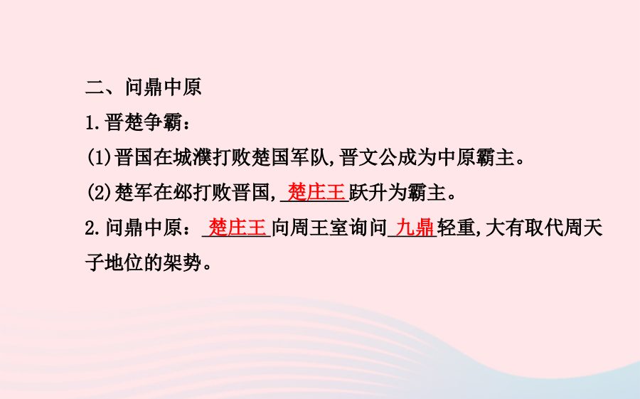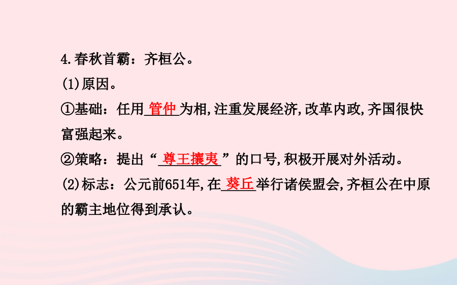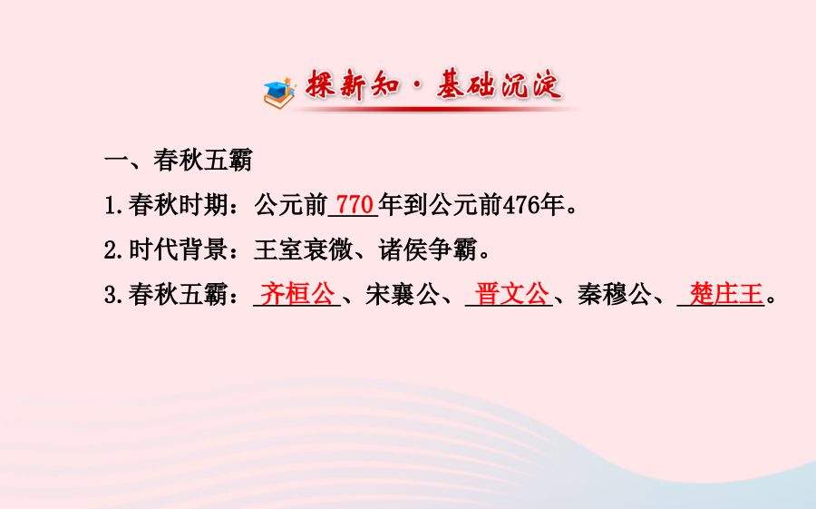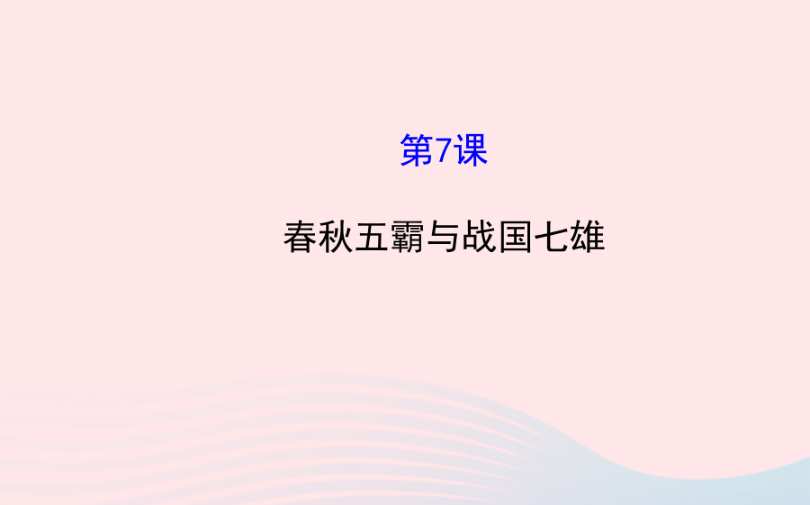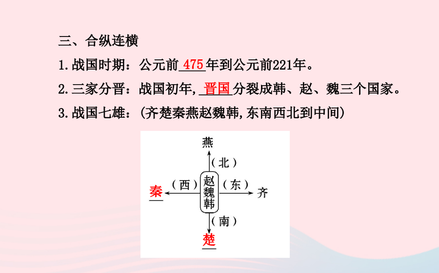 第7课 春秋五霸与战国七雄一、春秋五霸 1.春秋时期:公元前____年到公元前476年。 2.时代背景:王室衰微、诸侯争霸。 3.春秋五霸:_______、宋襄公、_______、秦穆公、_______。4.春秋首霸:齐桓公。 (1)原因。 ①基础:任用_____为相,注重发展经济,改革内政,齐国很快 富强起来。 ②策略:提出“_________”的口号,积极开展对外活动。 (2)标志:公元前651年,在_____举行诸侯盟会,齐桓公在中原 的霸主地位得到承认。二、问鼎中原 1.晋楚争霸: (1)晋国在城濮打败楚国军队,晋文公成为中原霸主。 (2)楚军在邲打败晋国,_______跃升为霸主。 2.问鼎中原:_______向周王室询问_____轻重,大有取代周天 子地位的架势。三、合纵连横 1.战国时期:公元前____年到公元前221年。 2.三家分晋:战国初年,_____分裂成韩、赵、魏三个国家。 3.战国七雄:(齐楚秦燕赵魏韩,东南西北到中间)4.合纵连横: (1)合纵:六国之间_____联合,共同抗秦。 (2)连横:秦利用_____之间的矛盾,远交近攻,各个击破。 (3)纵横家:秦国的_____和魏国的_______。【记一记】 ☉西周的分封,扩大了统治范围,但随着周王室势力下降,出现了春秋战国的纷争局面。 ☉春秋时期的战争以争霸为主,战国时期的战争以兼并为主。战争给社会带来了种种灾难,但在争霸与兼并过程中,国家逐渐趋向统一。 ☉春秋五霸先后出现,战国七雄同时并存。☉歌谣记忆 齐国君王齐桓公,第一霸主逞威风。 第二霸主晋文公,城濮之战称英雄。 齐楚燕韩赵魏秦,战国七雄多战争。 齐王军师名孙膑,围魏救赵战桂陵。【读一读】 平王之时,周室衰微,诸侯强并弱,齐、秦、楚、晋始大,政由方伯。 ——《史记·周本纪》 【解读】史料大意为:春秋时期,周王室衰微,周天子大权旁落,无力控制各诸侯国。于是强大的诸侯吞并弱小的诸侯,齐、秦、楚、晋开始强大,诸侯掌控政治局面。国家处于动荡状态。【读图学史】 A:_______B:_______C:_______【线索构建】 A:_______B:_________征战连连,互相杀戮,谁是真正的霸主?是齐桓公、晋文公,还是楚庄王?什么是称霸天下的第一要素,是仁义、是诚信,还是武力?想知道答案,那就让我们翻开两千多年前春秋战国精彩纷呈的历史画卷吧!【春秋争霸起风云】 材料一(1)识读图一《春秋形势图》,填写出B、C两处春秋霸主的名字。 提示:B:秦穆公;C:楚庄王。 (2)阅读图二,分析谁拜管仲为相。管仲改革有什么作用?并在图一中找出与之对应的字母。 提示:齐桓公。使齐桓公取得首霸地位。A。材料二战国形势简图 (3)填写出材料二《战国形势简图》中A、B、C三处的名字。并说出图中赵、魏、韩三国是由春秋时期的哪一诸侯国分裂来的。 提示:A:齐国;B:楚国;C:燕国。晋国。【硝烟背后谈感悟】 (4)观察材料一中的《春秋形势图》和材料二的《战国形势简图》,结合所学知识,分析春秋战国时期的战争有什么影响。 提示:春秋战国的兼并战争给人民带来深重的苦难。同时,也冲击着旧的社会秩序,传统的贵族统治体制渐趋瓦解。 (5)从春秋到战国,战争性质发生了什么变化?这说明出现了什么趋势? 提示:变化:从争霸到兼并。趋势:从分裂到统一。【备选探究】 探究主题春秋五霸 阅读下列材料,回答问题: 材料一从公元前770年到前476年,历史上称为春秋时代。在这290多年间,仅据鲁史《春秋》记载的军事行动就有四百八十余次。一些强大的诸侯国为了争夺霸权,互相征战,争做霸主。材料二桓公任管仲为相,推行改革,实行军政合一、兵民合一的制度,使国家逐渐强盛。桓公于前681年召集宋、陈等四国诸侯会盟,是历史上第一个充当盟主的诸侯。当时中原华夏各诸侯苦于戎狄等部落的攻击,于是桓公打出“尊王攘夷”的旗号,北击山戎,南伐楚国,最终成为春秋时期的第一个霸主。(1)结合材料一和所学知识分析,春秋时期出现这种诸侯争霸的纷乱局面与西周实行的哪一制度有关。 提示:分封制。 (2)依据材料二分析,材料中的“桓公”是哪一诸侯国的国君。他是怎样成为春秋时期第一个霸主的?(不能照抄原文) 提示:齐国。任用管仲为相,发展经济,改革内政;以“尊王攘夷”的名义号令诸侯,取得政治上的优势。(3)春秋时期除桓公这一霸主外,你还知道其他哪些霸主? 提示:楚庄王、晋文公、秦穆公、宋襄公。 (4)试从积极和消极两个方面来评价春秋争霸的影响。 提示:积极:在争霸过程中,有的诸侯国被灭掉,一些诸侯国的疆域不断扩大,促进了区域性的统一;在同周边少数民族交往和斗争中,出现了大规模的民族交融。消极:争霸战争给人民带来深重的灾难。【核心点拨】 1.如何看待春秋时期的诸