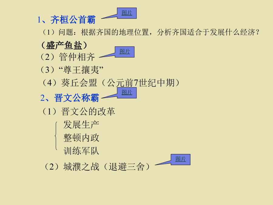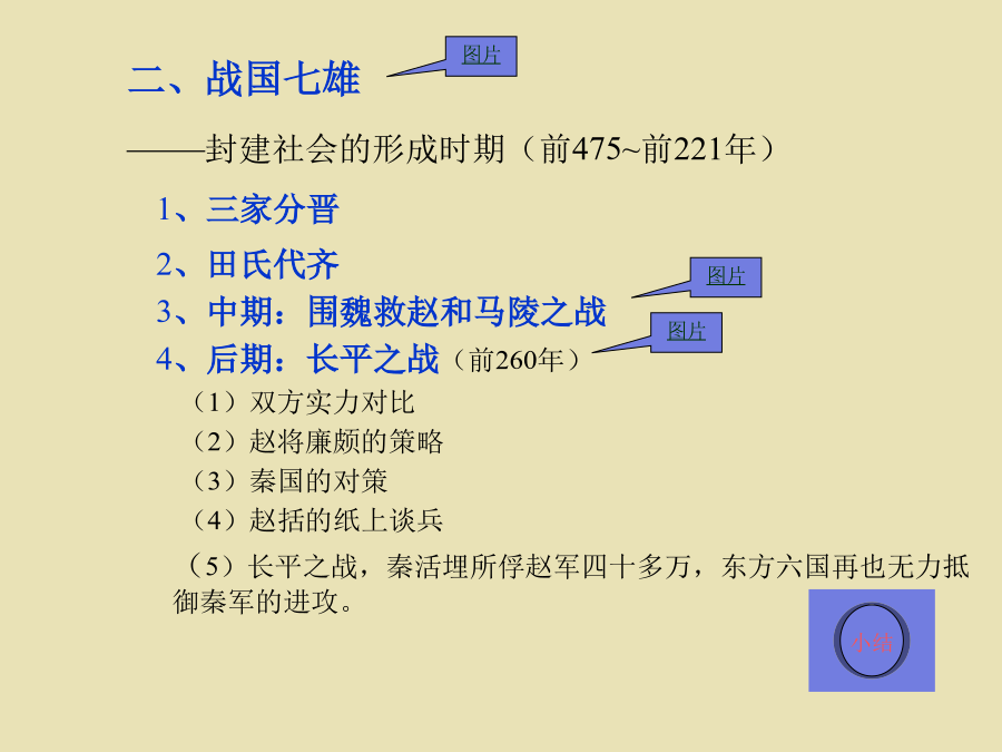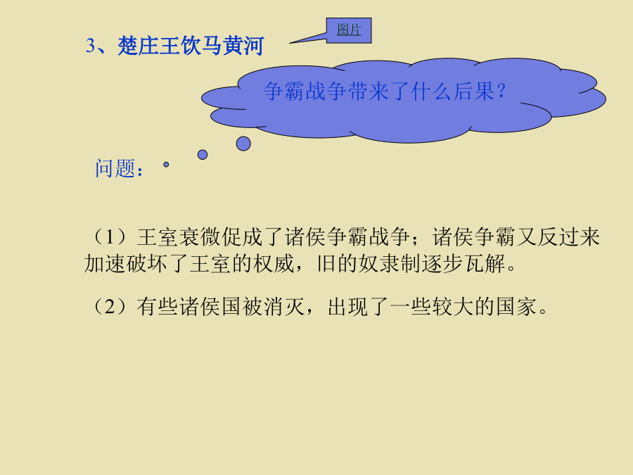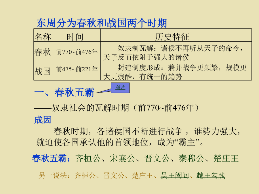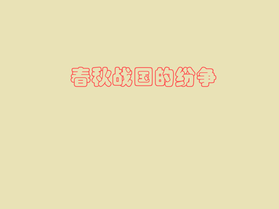 春秋战国的纷争东周分为春秋和战国两个时期1、齐桓公首霸3、楚庄王饮马黄河二、战国七雄 ——封建社会的形成时期(前475~前221年)11小结 春秋战国时期是我国奴隶社会的瓦解和封建社会的形成时期。“春秋无义战”,给人民带来了巨大的灾难。诸侯争霸使诸侯国的数量越来越少,加速破坏了王室的权威,旧的奴隶制逐步瓦解。战国时期,战争的规模更大,战况更加的惨烈。秦国在争霸战争中越来越强大,最终统一了中国。练习