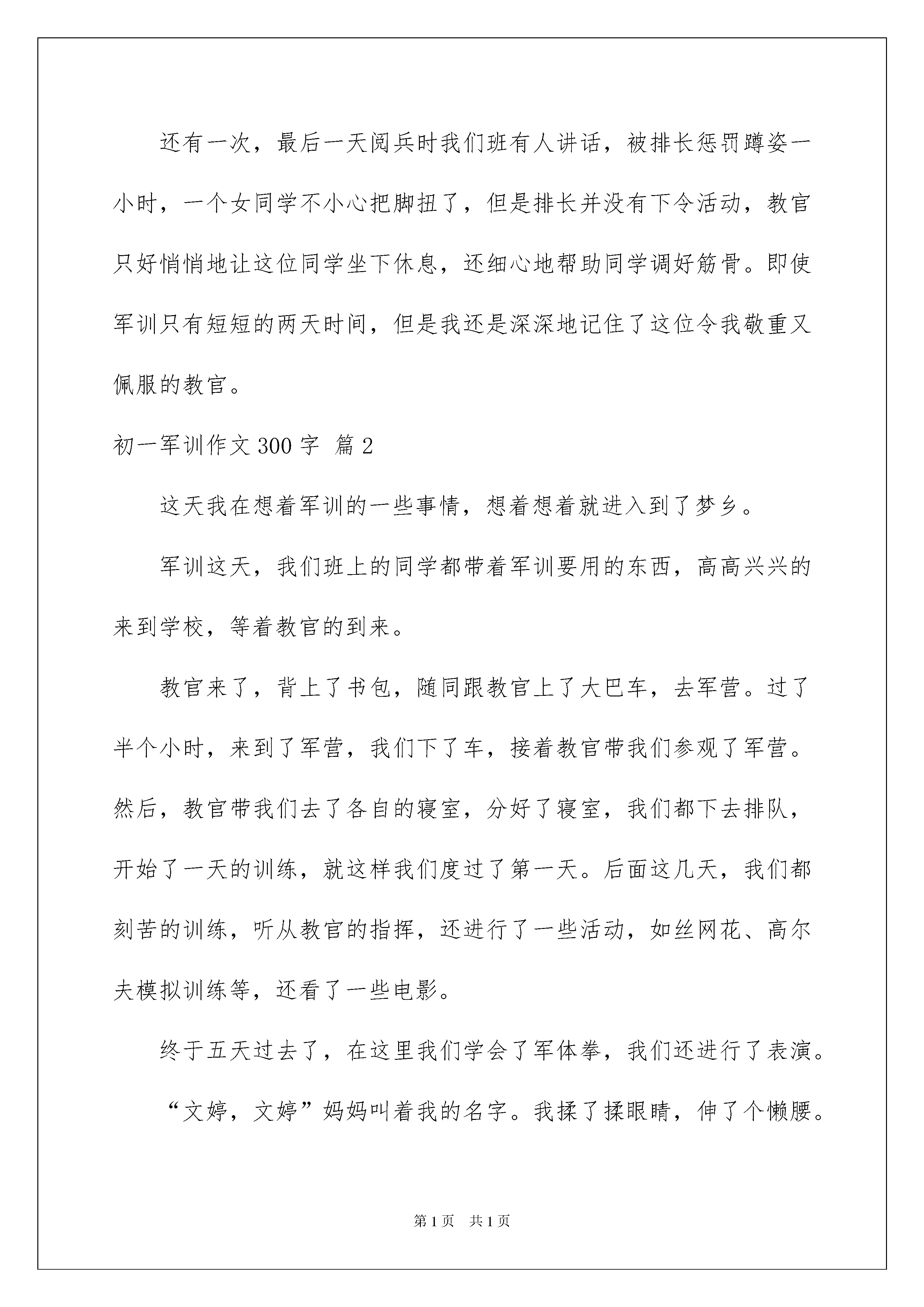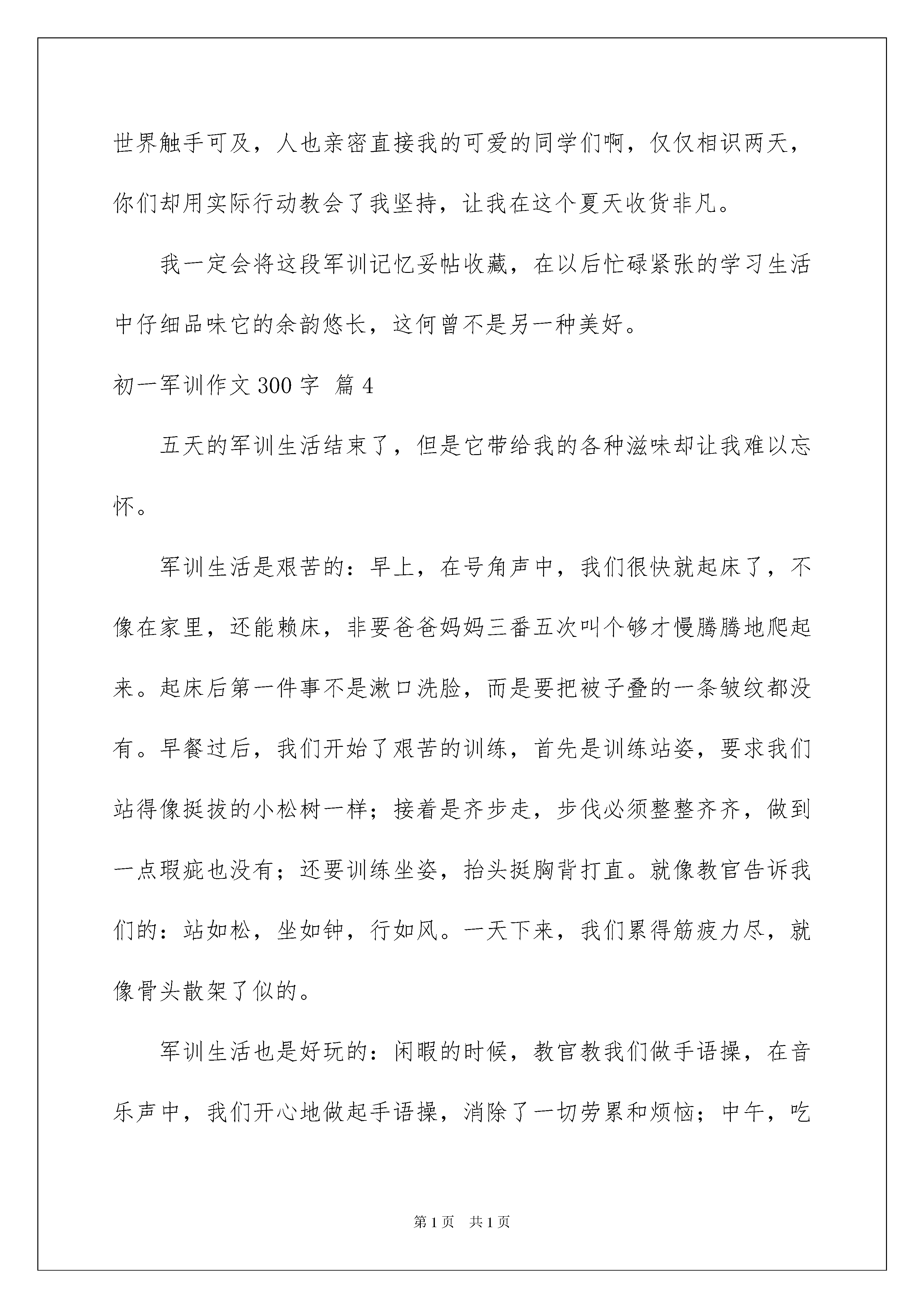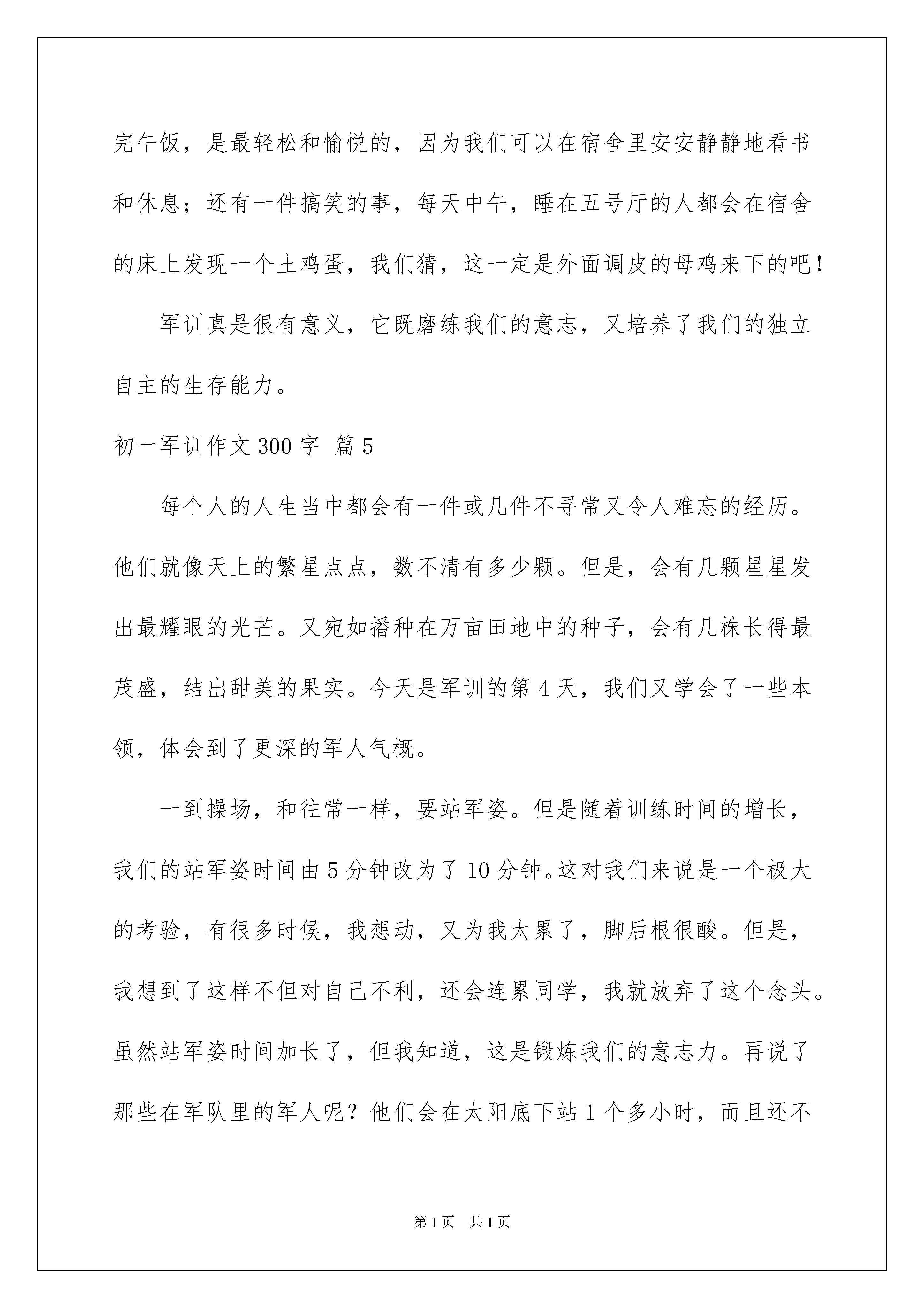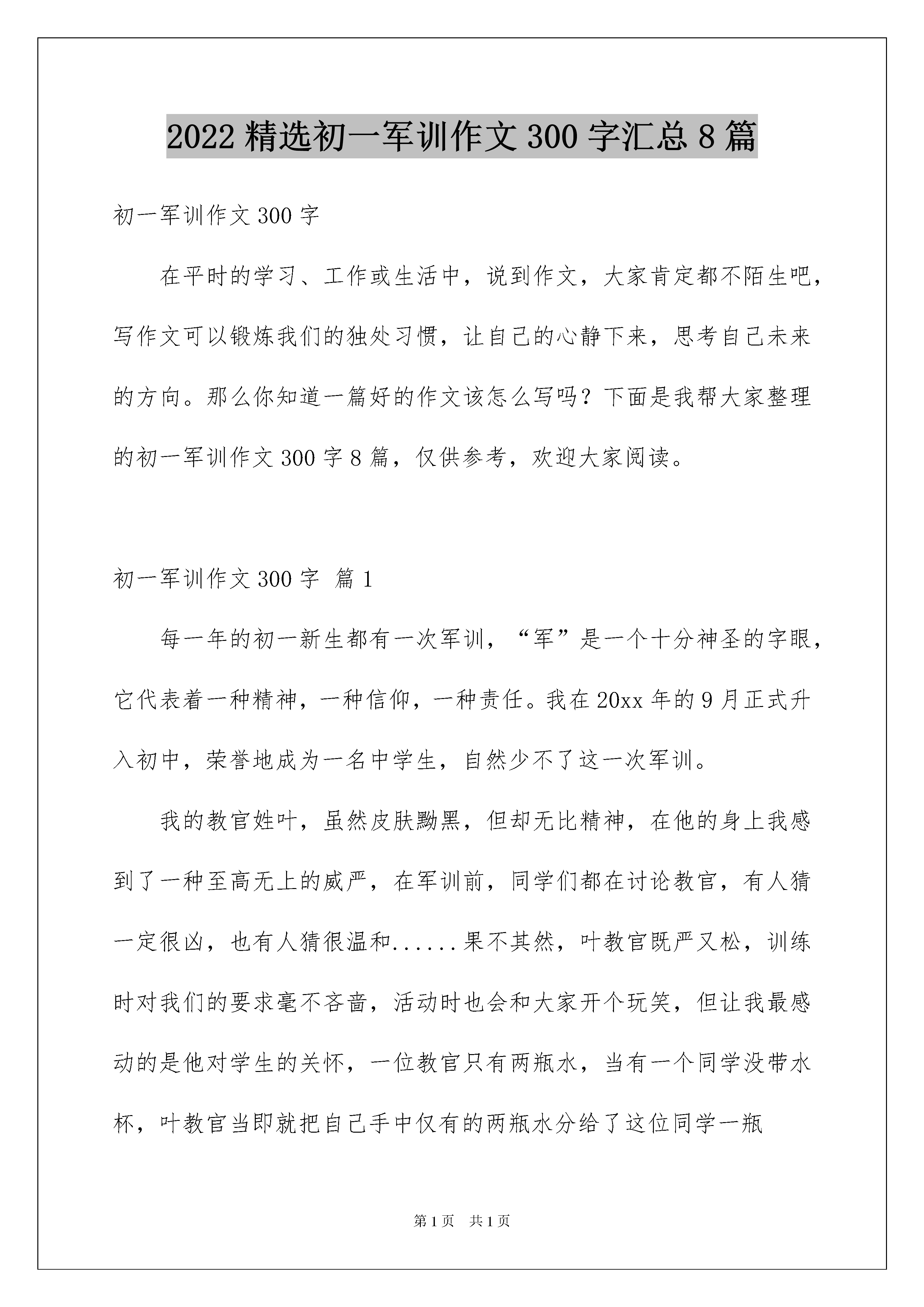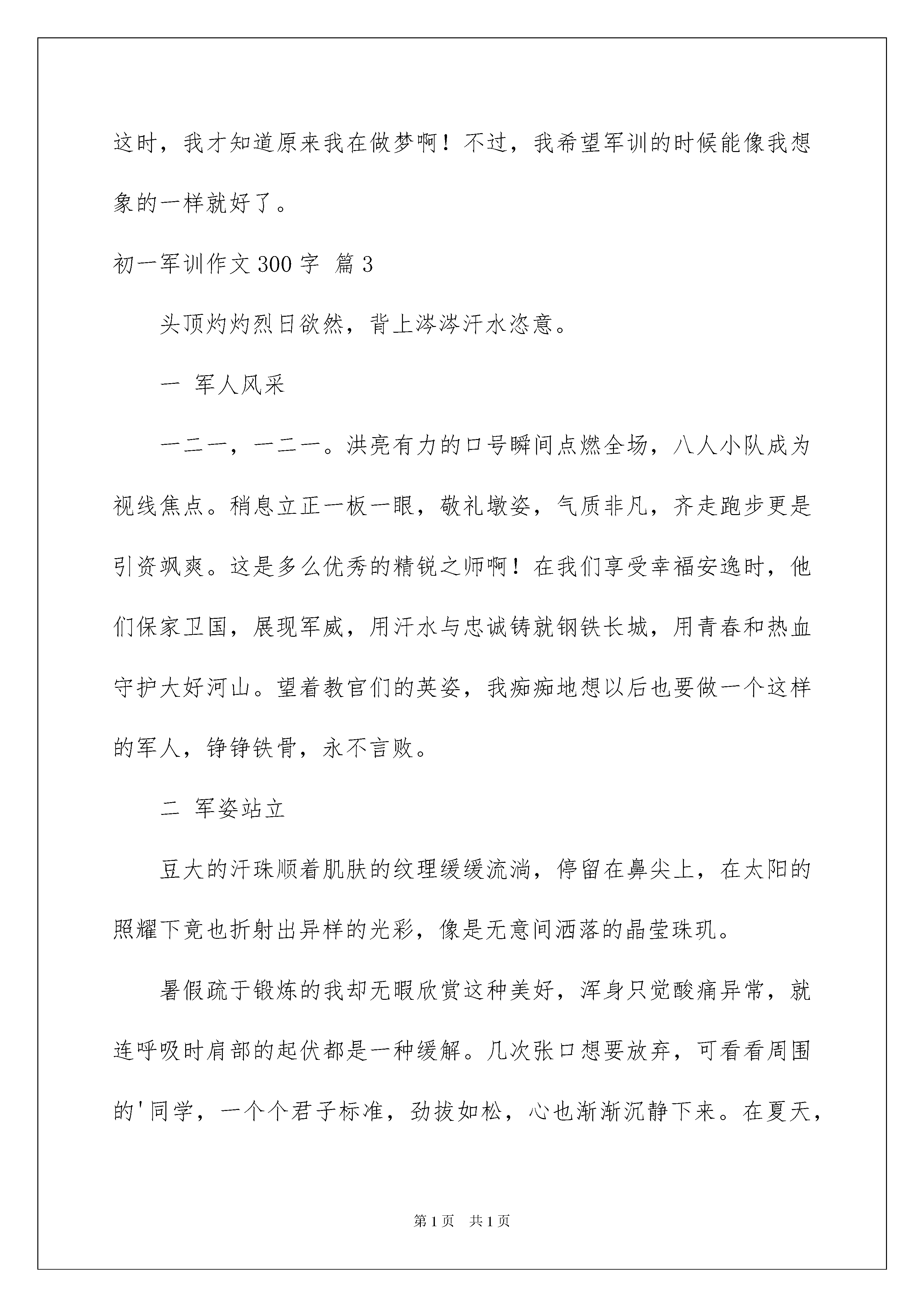 2022精选初一军训作文300字汇总8篇初一军训作文300字在平时的学习、工作或生活中,说到作文,大家肯定都不陌生吧,写作文可以锻炼我们的独处习惯,让自己的心静下来,思考自己未来的方向。那么你知道一篇好的作文该怎么写吗?下面是我帮大家整理的初一军训作文300字8篇,仅供参考,欢迎大家阅读。初一军训作文300字篇1每一年的初一新生都有一次军训,“军”是一个十分神圣的字眼,它代表着一种精神,一种信仰,一种责任。我在20xx年的9月正式升入初中,荣誉地成为一名中学生,自然少不了这一次军训。我的教官姓叶,虽然皮肤黝黑,但却无比精神,在他的身上我感到了一种至高无上的威严,在军训前,同学们都在讨论教官,有人猜一定很凶,也有人猜很温和......果不其然,叶教官既严又松,训练时对我们的要求毫不吝啬,活动时也会和大家开个玩笑,但让我最感动的是他对学生的关怀,一位教官只有两瓶水,当有一个同学没带水杯,叶教官当即就把自己手中仅有的两瓶水分给了这位同学一瓶还有一次,最后一天阅兵时我们班有人讲话,被排长惩罚蹲姿一小时,一个女同学不小心把脚扭了,但是排长并没有下令活动,教官只好悄悄地让这位同学坐下休息,还细心地帮助同学调好筋骨。即使军训只有短短的两天时间,但是我还是深深地记住了这位令我敬重又佩服的教官。初一军训作文300字篇2这天我在想着军训的一些事情,想着想着就进入到了梦乡。军训这天,我们班上的同学都带着军训要用的东西,高高兴兴的来到学校,等着教官的到来。教官来了,背上了书包,随同跟教官上了大巴车,去军营。过了半个小时,来到了军营,我们下了车,接着教官带我们参观了军营。然后,教官带我们去了各自的寝室,分好了寝室,我们都下去排队,开始了一天的训练,就这样我们度过了第一天。后面这几天,我们都刻苦的训练,听从教官的指挥,还进行了一些活动,如丝网花、高尔夫模拟训练等,还看了一些电影。终于五天过去了,在这里我们学会了军体拳,我们还进行了表演。“文婷,文婷”妈妈叫着我的名字。我揉了揉眼睛,伸了个懒腰。这时,我才知道原来我在做梦啊!不过,我希望军训的时候能像我想象的一样就好了。初一军训作文300字篇3头顶灼灼烈日欲然,背上涔涔汗水恣意。一军人风采一二一,一二一。洪亮有力的口号瞬间点燃全场,八人小队成为视线焦点。稍息立正一板一眼,敬礼墩姿,气质非凡,齐走跑步更是引资飒爽。这是多么优秀的精锐之师啊!在我们享受幸福安逸时,他们保家卫国,展现军威,用汗水与忠诚铸就钢铁长城,用青春和热血守护大好河山。望着教官们的英姿,我痴痴地想以后也要做一个这样的军人,铮铮铁骨,永不言败。二军姿站立豆大的汗珠顺着肌肤的纹理缓缓流淌,停留在鼻尖上,在太阳的照耀下竟也折射出异样的光彩,像是无意间洒落的晶莹珠玑。暑假疏于锻炼的我却无暇欣赏这种美好,浑身只觉酸痛异常,就连呼吸时肩部的起伏都是一种缓解。几次张口想要放弃,可看看周围的'同学,一个个君子标准,劲拔如松,心也渐渐沉静下来。在夏天,世界触手可及,人也亲密直接我的可爱的同学们啊,仅仅相识两天,你们却用实际行动教会了我坚持,让我在这个夏天收货非凡。我一定会将这段军训记忆妥帖收藏,在以后忙碌紧张的学习生活中仔细品味它的余韵悠长,这何曾不是另一种美好。初一军训作文300字篇4五天的军训生活结束了,但是它带给我的各种滋味却让我难以忘怀。军训生活是艰苦的:早上,在号角声中,我们很快就起床了,不像在家里,还能赖床,非要爸爸妈妈三番五次叫个够才慢腾腾地爬起来。起床后第一件事不是漱口洗脸,而是要把被子叠的一条皱纹都没有。早餐过后,我们开始了艰苦的训练,首先是训练站姿,要求我们站得像挺拔的小松树一样;接着是齐步走,步伐必须整整齐齐,做到一点瑕疵也没有;还要训练坐姿,抬头挺胸背打直。就像教官告诉我们的:站如松,坐如钟,行如风。一天下来,我们累得筋疲力尽,就像骨头散架了似的。军训生活也是好玩的:闲暇的时候,教官教我们做手语操,在音乐声中,我们开心地做起手语操,消除了一切劳累和烦恼;中午,吃完午饭,是最轻松和愉悦的,因为我们可以在宿舍里安安静静地看书和休息;还有一件搞笑的事,每天中午,睡在五号厅的人都会在宿舍的床上发现一个土鸡蛋,我们猜,这一定是外面调皮的母鸡来下的吧!军训真是很有意义,它既磨练我们的意志,又培养了我们的独立自主的生存能力。初一军训作文300字篇5每个人的人生当中都会有一件或几件不寻常又令人难忘的经历。他们就像天上的繁星点点,数不清有多少颗。但是,会有几颗星星发出最耀眼的光芒。又宛如播种在万亩田地中的种子,会有几株长得最茂盛,结出甜美的果实。今天是军训的第4天,我们又学会了一些本领,体会到了更深
