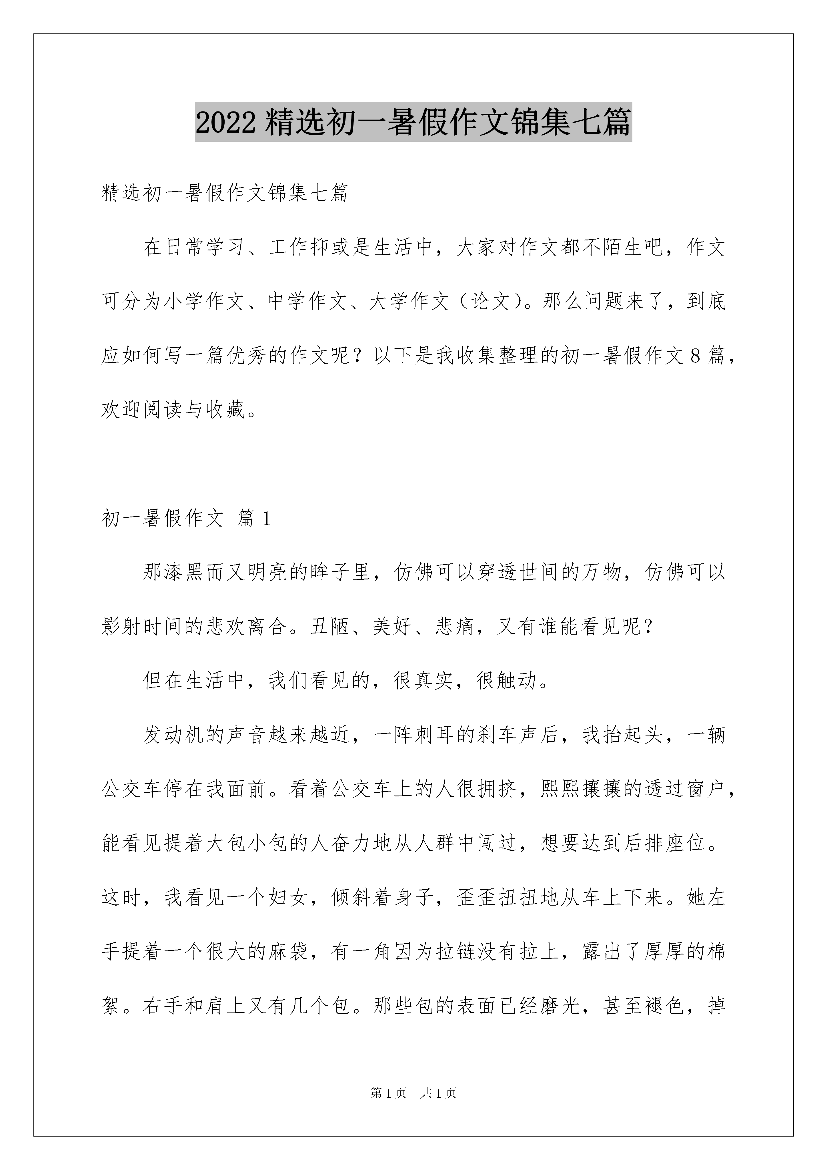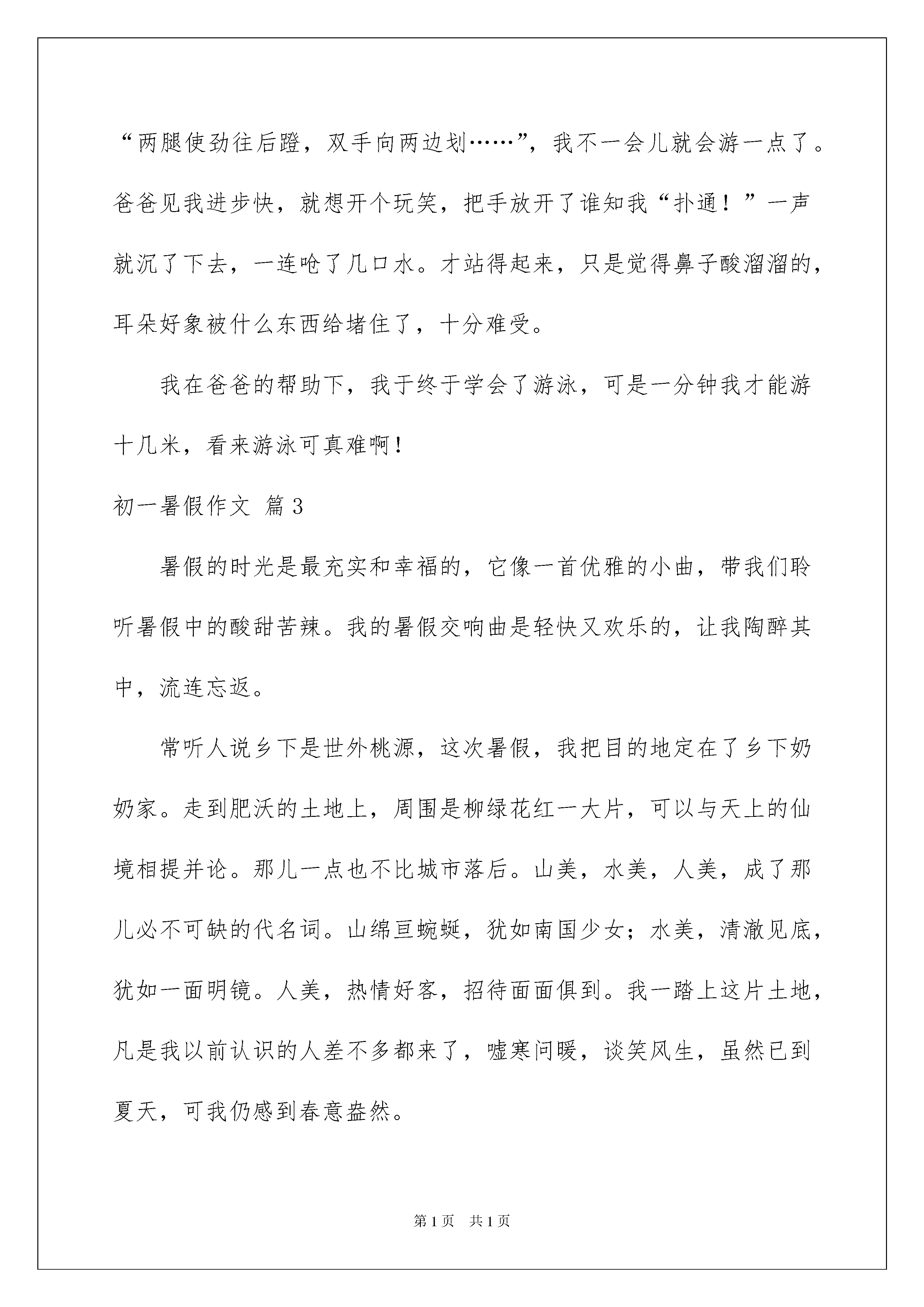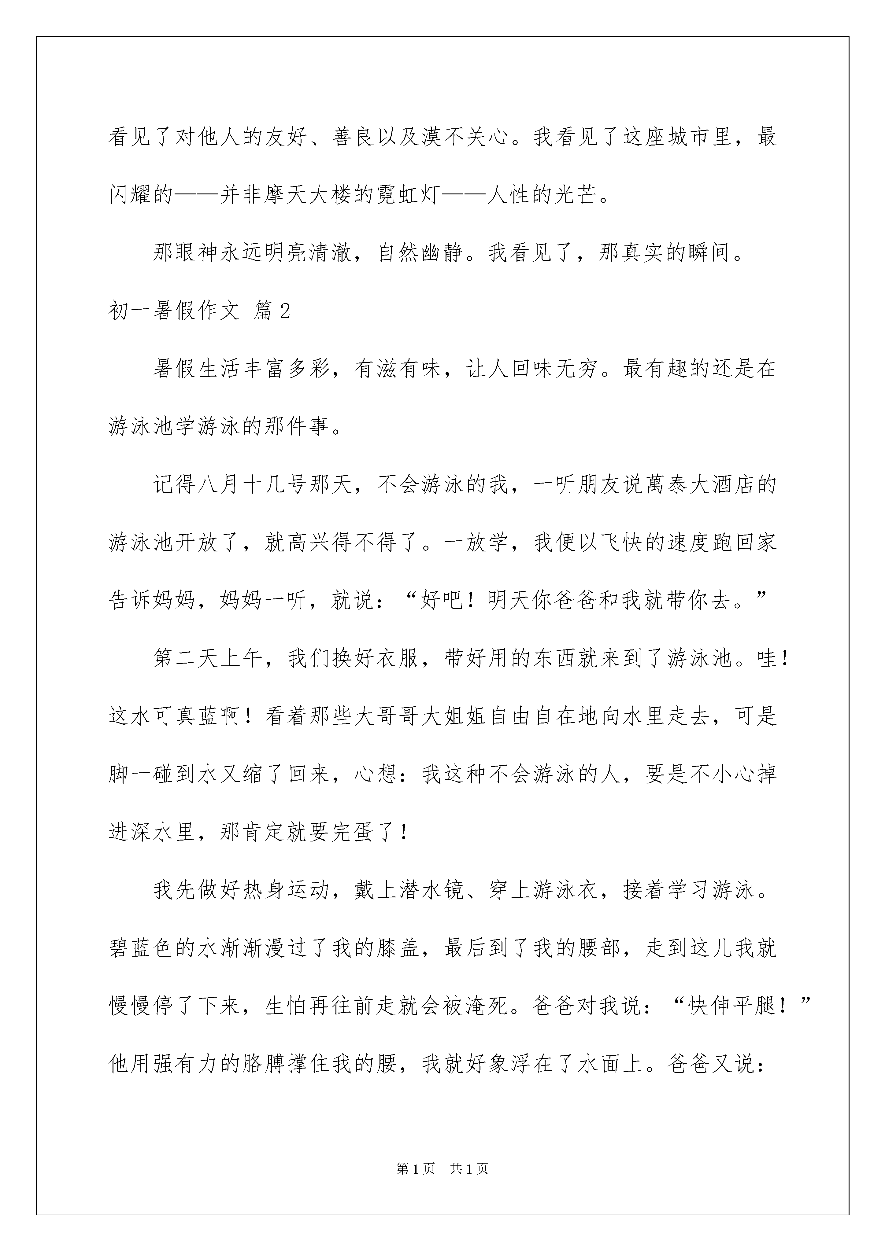 2022精选初一暑假作文锦集七篇精选初一暑假作文锦集七篇在日常学习、工作抑或是生活中,大家对作文都不陌生吧,作文可分为小学作文、中学作文、大学作文(论文)。那么问题来了,到底应如何写一篇优秀的作文呢?以下是我收集整理的初一暑假作文8篇,欢迎阅读与收藏。初一暑假作文篇1那漆黑而又明亮的眸子里,仿佛可以穿透世间的万物,仿佛可以影射时间的悲欢离合。丑陋、美好、悲痛,又有谁能看见呢?但在生活中,我们看见的,很真实,很触动。发动机的声音越来越近,一阵刺耳的刹车声后,我抬起头,一辆公交车停在我面前。看着公交车上的人很拥挤,熙熙攘攘的透过窗户,能看见提着大包小包的人奋力地从人群中闯过,想要达到后排座位。这时,我看见一个妇女,倾斜着身子,歪歪扭扭地从车上下来。她左手提着一个很大的麻袋,有一角因为拉链没有拉上,露出了厚厚的棉絮。右手和肩上又有几个包。那些包的表面已经磨光,甚至褪色,掉皮,但那个妇女好像还是舍不得换。她的皮肤被晒得很黑,皱着眉头,头上裹着一个毛巾。我想,她应该是从乡下来的。妇女弓着背,一步一晃,很着急的走着。突然,有一个布袋从她的手中掉落,桃子撒了一地。她很是不高兴的看了一眼那一地的狼藉,轻轻抱怨了一声,连忙蹲下来开始拾桃子。有一个青年,吹着口哨骑着车向这边来,看了一眼地上的桃子,继续抬起头,从旁边绕着路走了。旁边也有许多行人,仅仅用余光扫了一眼这一幕,便匆匆走开了。这时,“道路管理员”和我,看不下去了,一齐走光去帮妇女拾桃子。渐渐地,人越来越多,许多在妇女后面下车的人,也跟上来帮忙。在这些人中,有拿着文件的上班族,有牵着小孩的母亲,有散步回家的爷爷奶奶,也少不了我这个穿着校服的学生。妇女连声道谢,大家说:“是应该的!”桃子很大,很红,我们接二连三的往妇女手里送桃子,她如获珍宝的接过。我发现,妇女的手上有许多疤痕,也有岁月留下的痕迹。也许是因为经常下地干活,所以手上也写满了沧桑。桃子拾完了,妇女用手撑着膝盖,慢慢地站起来,向我们抱以感激的微笑,便离开了。我们看着她的身影,也笑了。就在这街头的,不起眼的小事里,我看见了对生活的乐观、希望,看见了对他人的友好、善良以及漠不关心。我看见了这座城市里,最闪耀的——并非摩天大楼的霓虹灯——人性的光芒。那眼神永远明亮清澈,自然幽静。我看见了,那真实的瞬间。初一暑假作文篇2暑假生活丰富多彩,有滋有味,让人回味无穷。最有趣的还是在游泳池学游泳的那件事。记得八月十几号那天,不会游泳的我,一听朋友说萬泰大酒店的游泳池开放了,就高兴得不得了。一放学,我便以飞快的速度跑回家告诉妈妈,妈妈一听,就说:“好吧!明天你爸爸和我就带你去。”第二天上午,我们换好衣服,带好用的东西就来到了游泳池。哇!这水可真蓝啊!看着那些大哥哥大姐姐自由自在地向水里走去,可是脚一碰到水又缩了回来,心想:我这种不会游泳的人,要是不小心掉进深水里,那肯定就要完蛋了!我先做好热身运动,戴上潜水镜、穿上游泳衣,接着学习游泳。碧蓝色的水渐渐漫过了我的膝盖,最后到了我的腰部,走到这儿我就慢慢停了下来,生怕再往前走就会被淹死。爸爸对我说:“快伸平腿!”他用强有力的胳膊撑住我的腰,我就好象浮在了水面上。爸爸又说:“两腿使劲往后蹬,双手向两边划……”,我不一会儿就会游一点了。爸爸见我进步快,就想开个玩笑,把手放开了谁知我“扑通!”一声就沉了下去,一连呛了几口水。才站得起来,只是觉得鼻子酸溜溜的,耳朵好象被什么东西给堵住了,十分难受。我在爸爸的帮助下,我于终于学会了游泳,可是一分钟我才能游十几米,看来游泳可真难啊!初一暑假作文篇3暑假的时光是最充实和幸福的,它像一首优雅的小曲,带我们聆听暑假中的酸甜苦辣。我的暑假交响曲是轻快又欢乐的,让我陶醉其中,流连忘返。常听人说乡下是世外桃源,这次暑假,我把目的地定在了乡下奶奶家。走到肥沃的土地上,周围是柳绿花红一大片,可以与天上的仙境相提并论。那儿一点也不比城市落后。山美,水美,人美,成了那儿必不可缺的代名词。山绵亘蜿蜒,犹如南国少女;水美,清澈见底,犹如一面明镜。人美,热情好客,招待面面俱到。我一踏上这片土地,凡是我以前认识的人差不多都来了,嘘寒问暖,谈笑风生,虽然已到夏天,可我仍感到春意盎然。奶奶的邻居有一个外孙女,我和她有过一面之缘。这次来乡下,我又见到了她,她手中拎着一个气球,蹦蹦跳跳,我走上前去逗她玩,她立刻露出灿烂的笑容,把气球送给了我,眼睛里充满了天真。我接过她的气球,沉浸在一片喜悦之中。突然,我得意忘形,一不小心松了手,气球随风而去。小女孩毫不犹豫的向前追去,不久,她的身影消失在我的视线里。过了好一会,她带着满脸的淤泥,失望的归来,似乎像失去