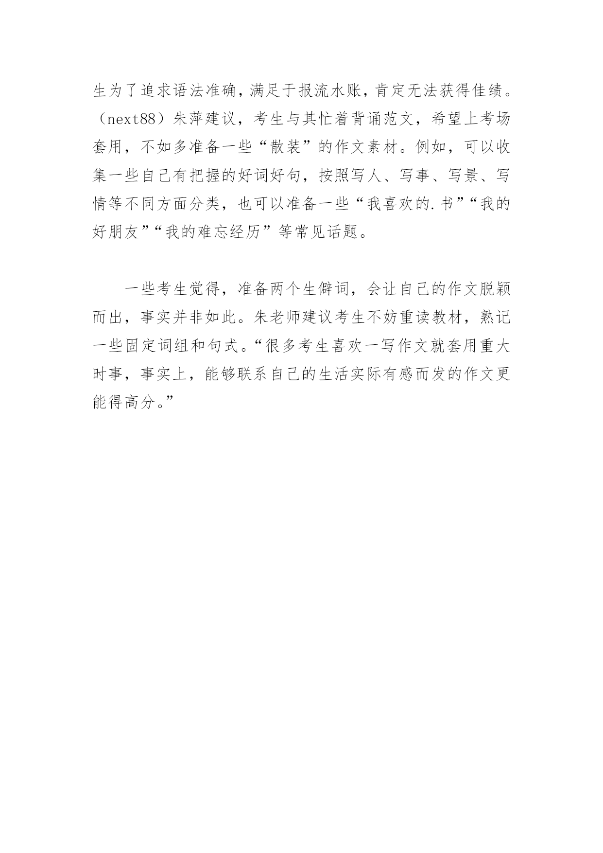 《三国》诗歌 河波泛柳,点点滴滴。望紫烟霞,浮春泛舟。波凌壮阔,滔滔江水。泛舟赤壁,回望三国。【每日写作指导:什么样的作文难得高分——写作必读】相比语文作文,很多考生容易忽视英语作文,觉得只要平铺直叙,避免语法错误,就能得高分。中考在即,世界外国语中学英语特级教师、教研组长朱萍提醒考生,近两年,英语作文要求和语文作文要求愈加接近,更注重人文内涵。行文流畅、言之有物也是英语作文的要求。朱老师多年参与阅卷工作,她透露,老师最不喜欢看到“脚踩西瓜皮”的作文——行文欠缺逻辑,写了几句后发现没话说再生拉硬拼凑字数。朱老师提醒,落笔之前,一定先列一个提纲,整理一下思路。老师在阅卷时,首先会通读全文,给作文分档。有些考生为了追求语法准确,满足于报流水账,肯定无法获得佳绩。(next88)朱萍建议,考生与其忙着背诵范文,希望上考场套用,不如多准备一些“散装”的作文素材。例如,可以收集一些自己有把握的好词好句,按照写人、写事、写景、写情等不同方面分类,也可以准备一些“我喜欢的.书”“我的好朋友”“我的难忘经历”等常见话题。一些考生觉得,准备两个生僻词,会让自己的作文脱颖而出,事实并非如此。朱老师建议考生不妨重读教材,熟记一些固定词组和句式。“很多考生喜欢一写作文就套用重大时事,事实上,能够联系自己的生活实际有感而发的作文更能得高分。”