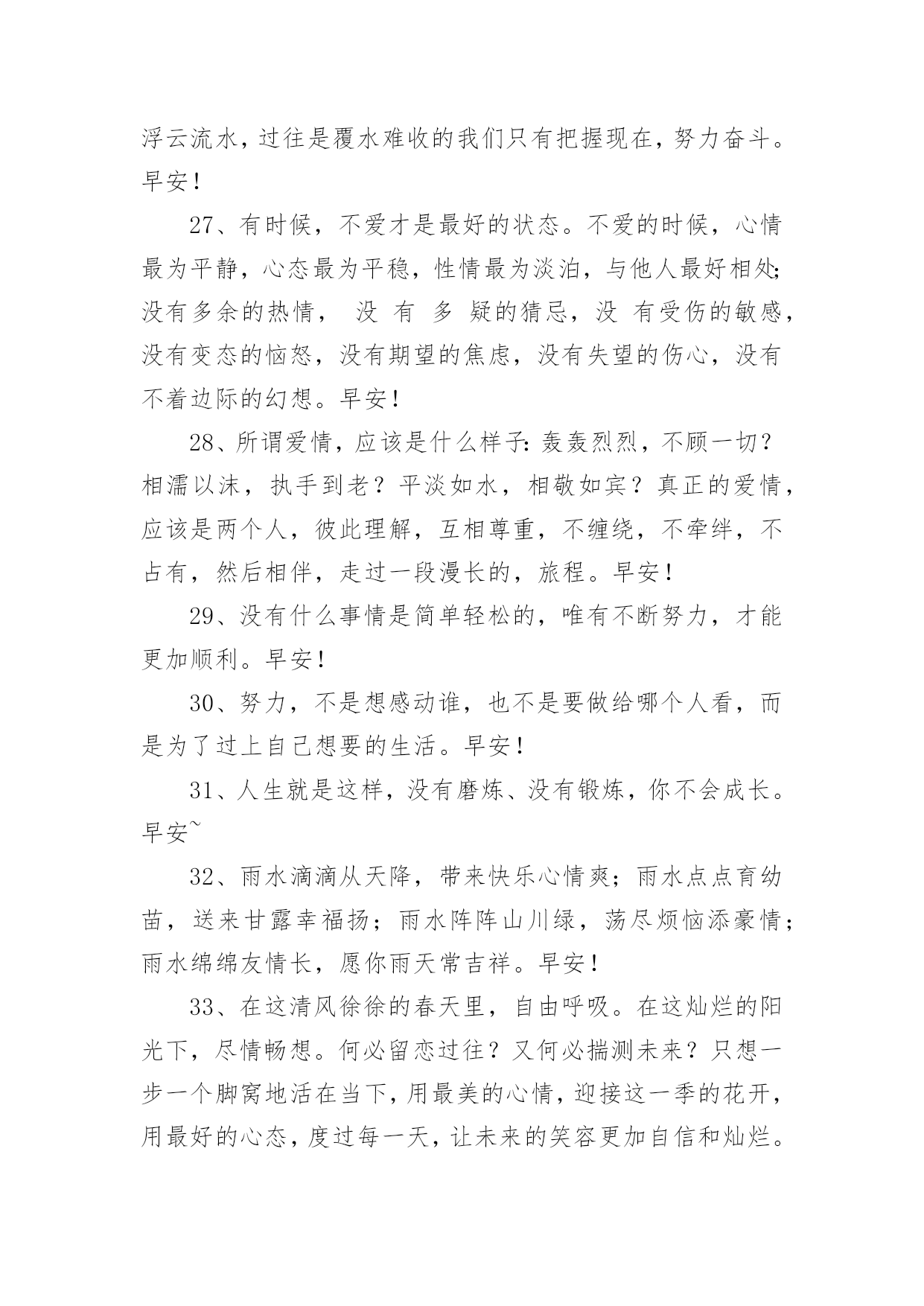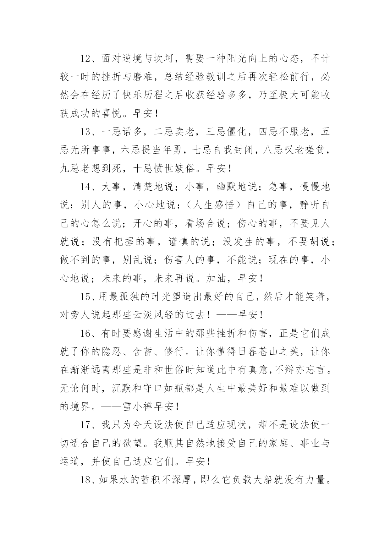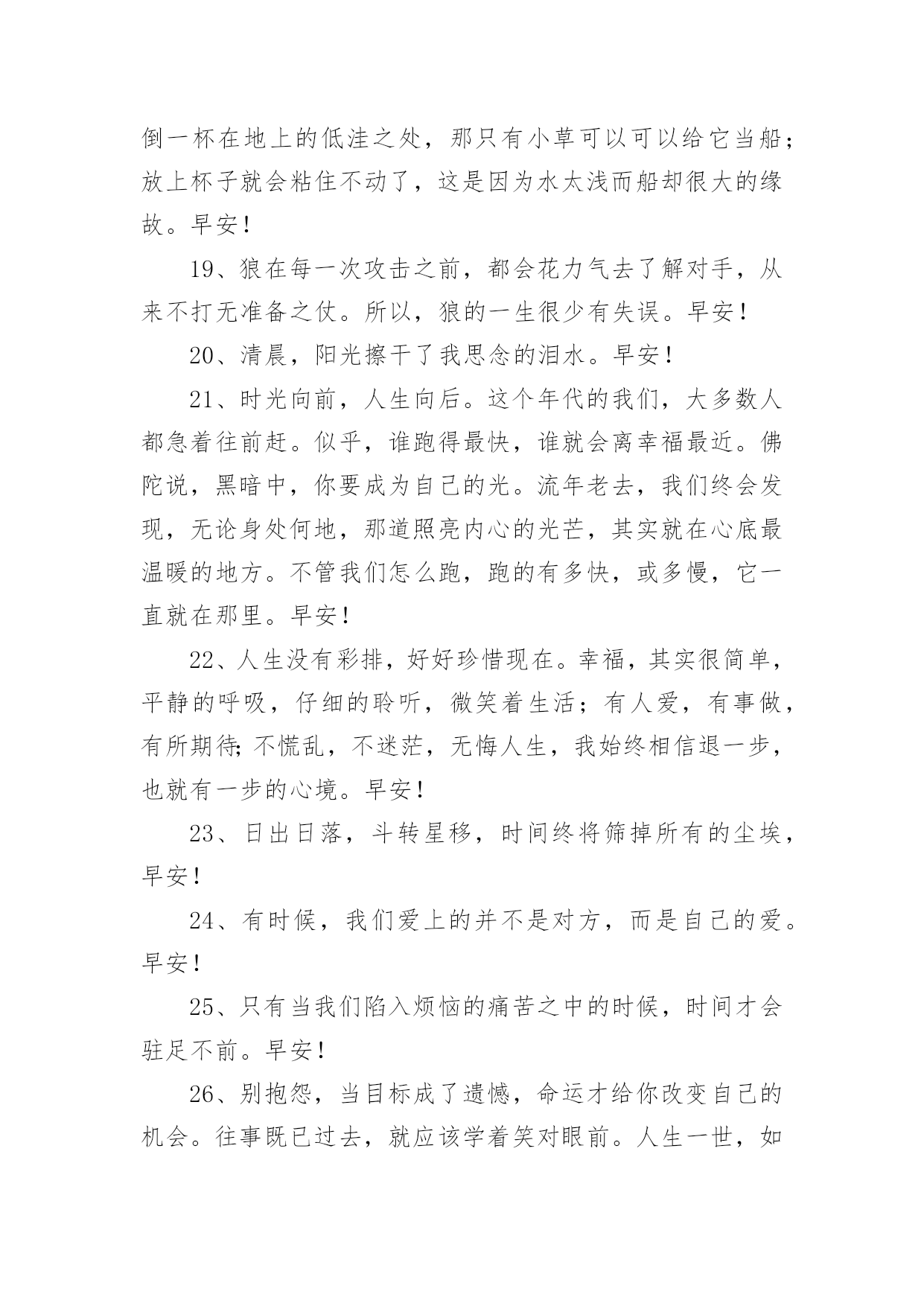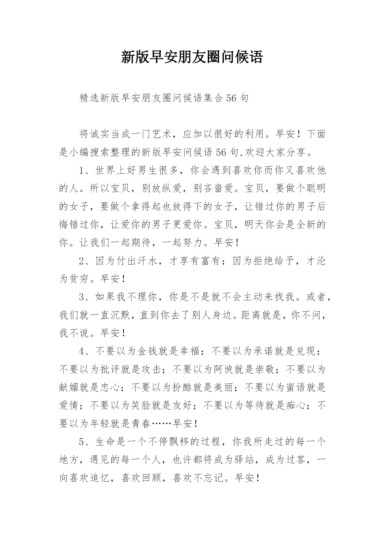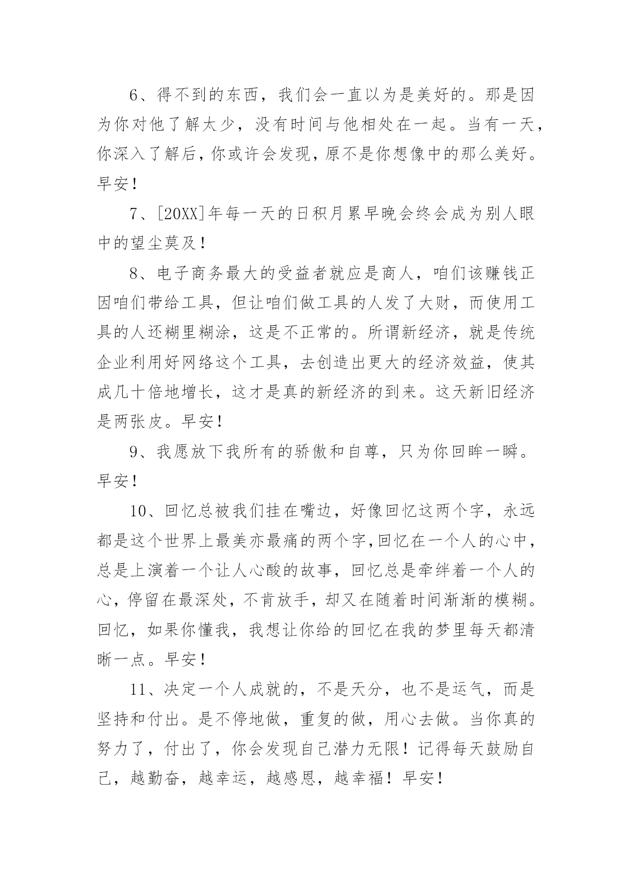 新版早安朋友圈问候语 精选新版早安朋友圈问候语集合56句将诚实当成一门艺术,应加以很好的利用。早安!下面是小编搜索整理的新版早安问候语56句,欢迎大家分享。1、世界上好男生很多,你会遇到喜欢你而你又喜欢他的人。所以宝贝,别放纵爱,别吝啬爱。宝贝,要做个聪明的女子,要做个拿得起也放得下的女子,让错过你的男子后悔错过你,让爱你的男子更爱你。宝贝,明天你会是全新的你。让我们一起期待,一起努力。早安!2、因为付出汗水,才享有富有;因为拒绝给予,才沦为贫穷。早安!3、如果我不理你,你是不是就不会主动来找我。或者,我们就一直沉默,直到你去了别人身边。距离就是,你不问,我不说。早安!4、不要以为金钱就是幸福;不要以为承诺就是兑现;不要以为批评就是攻击;不要以为阿谀就是崇敬;不要以为献媚就是忠心;不要以为扮酷就是美丽;不要以为蜜语就是爱情;不要以为笑脸就是友好;不要以为等待就是痴心;不要以为年轻就是青春……早安!5、生命是一个不停飘移的过程,你我所走过的每一个地方,遇见的每一个人,也许都将成为驿站,成为过客,一向喜欢追忆,喜欢回顾,喜欢不忘记。早安!6、得不到的东西,我们会一直以为是美好的。那是因为你对他了解太少,没有时间与他相处在一起。当有一天,你深入了解后,你或许会发现,原不是你想像中的那么美好。早安!7、[20XX]年每一天的日积月累早晚会终会成为别人眼中的望尘莫及!8、电子商务最大的受益者就应是商人,咱们该赚钱正因咱们带给工具,但让咱们做工具的人发了大财,而使用工具的人还糊里糊涂,这是不正常的。所谓新经济,就是传统企业利用好网络这个工具,去创造出更大的经济效益,使其成几十倍地增长,这才是真的新经济的到来。这天新旧经济是两张皮。早安!9、我愿放下我所有的骄傲和自尊,只为你回眸一瞬。早安!10、回忆总被我们挂在嘴边,好像回忆这两个字,永远都是这个世界上最美亦最痛的两个字,回忆在一个人的心中,总是上演着一个让人心酸的故事,回忆总是牵绊着一个人的心,停留在最深处,不肯放手,却又在随着时间渐渐的模糊。回忆,如果你懂我,我想让你给的回忆在我的梦里每天都清晰一点。早安!11、决定一个人成就的,不是天分,也不是运气,而是坚持和付出。是不停地做,重复的做,用心去做。当你真的努力了,付出了,你会发现自己潜力无限!记得每天鼓励自己,越勤奋,越幸运,越感恩,越幸福!早安!12、面对逆境与坎坷,需要一种阳光向上的心态,不计较一时的挫折与磨难,总结经验教训之后再次轻松前行,必然会在经历了快乐历程之后收获经验多多,乃至极大可能收获成功的喜悦。早安!13、一忌话多,二忌卖老,三忌僵化,四忌不服老,五忌无所事事,六忌提当年勇,七忌自我封闭,八忌叹老嗟贫,九忌老想到死,十忌愤世嫉俗。早安!14、大事,清楚地说;小事,幽默地说;急事,慢慢地说;别人的事,小心地说;(人生感悟)自己的事,静听自己的心怎么说;开心的事,看场合说;伤心的事,不要见人就说;没有把握的事,谨慎的说;没发生的事,不要胡说;做不到的事,别乱说;伤害人的事,不能说;现在的事,小心地说;未来的事,未来再说。加油,早安!15、用最孤独的时光塑造出最好的自己,然后才能笑着,对旁人说起那些云淡风轻的过去!——早安!16、有时要感谢生活中的那些挫折和伤害,正是它们成就了你的隐忍、含蓄、修行。让你懂得日暮苍山之美,让你在渐渐远离那些是非和世俗时知道此中有真意,不辩亦忘言。无论何时,沉默和守口如瓶都是人生中最美好和最难以做到的境界。——雪小禅早安!17、我只为今天设法使自己适应现状,却不是设法使一切适合自己的欲望。我顺其自然地接受自己的家庭、事业与运道,并使自己适应它们。早安!18、如果水的蓄积不深厚,即么它负载大船就没有力量。倒一杯在地上的低洼之处,那只有小草可以可以给它当船;放上杯子就会粘住不动了,这是因为水太浅而船却很大的缘故。早安!19、狼在每一次攻击之前,都会花力气去了解对手,从来不打无准备之仗。所以,狼的一生很少有失误。早安!20、清晨,阳光擦干了我思念的泪水。早安!21、时光向前,人生向后。这个年代的我们,大多数人都急着往前赶。似乎,谁跑得最快,谁就会离幸福最近。佛陀说,黑暗中,你要成为自己的光。流年老去,我们终会发现,无论身处何地,那道照亮内心的光芒,其实就在心底最温暖的地方。不管我们怎么跑,跑的有多快,或多慢,它一直就在那里。早安!22、人生没有彩排,好好珍惜现在。幸福,其实很简单,平静的呼吸,仔细的聆听,微笑着生活;有人爱,有事做,有所期待;不慌乱,不迷茫,无悔人生,我始终相信退一步,也就有一步的心境。早安!23、日出日落,斗转星移,时间终将筛掉所有的尘埃,早安!24、有时候,我们爱上的并不是对方,而是自己的爱。早安!25、只有当我们陷入烦恼的痛苦之中的时候,时间才会驻足不前。早安!26、别抱怨,
