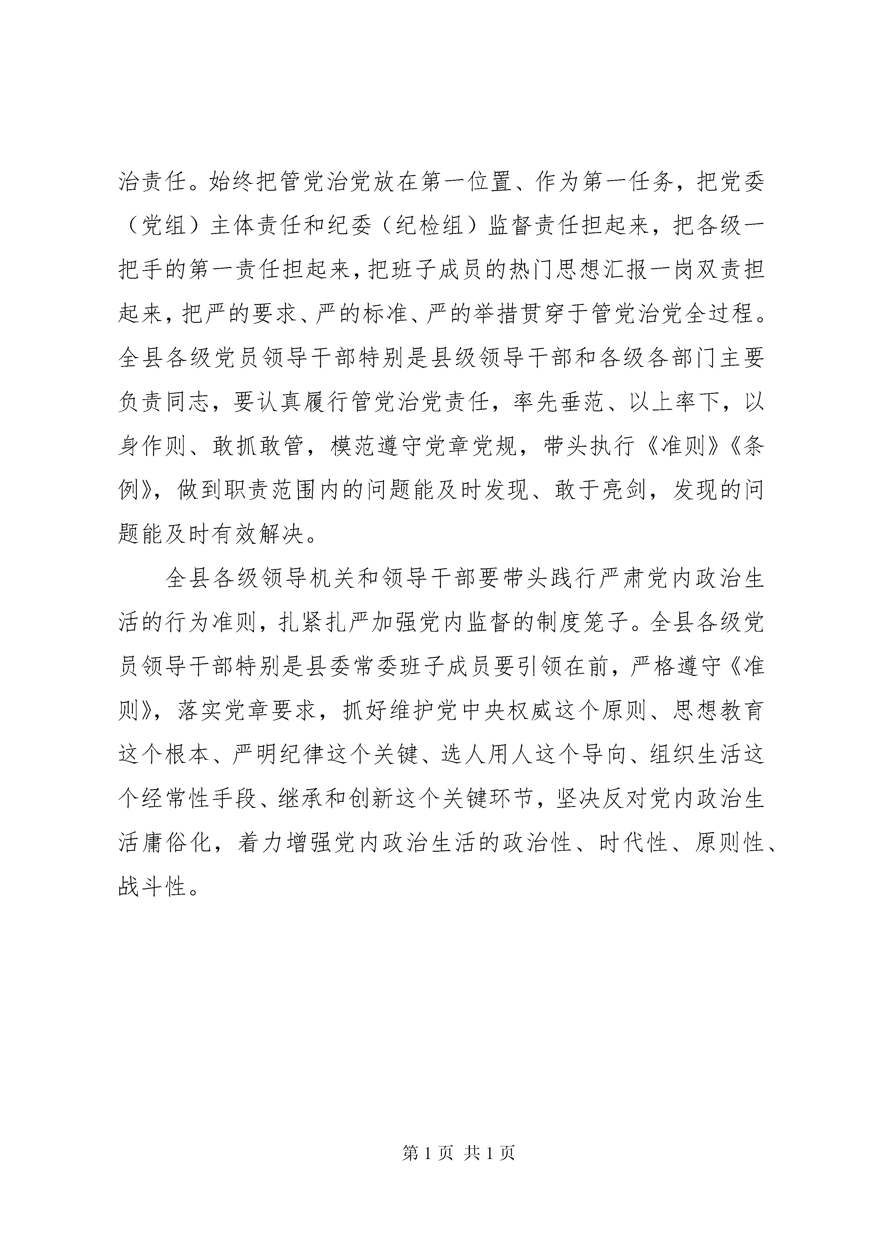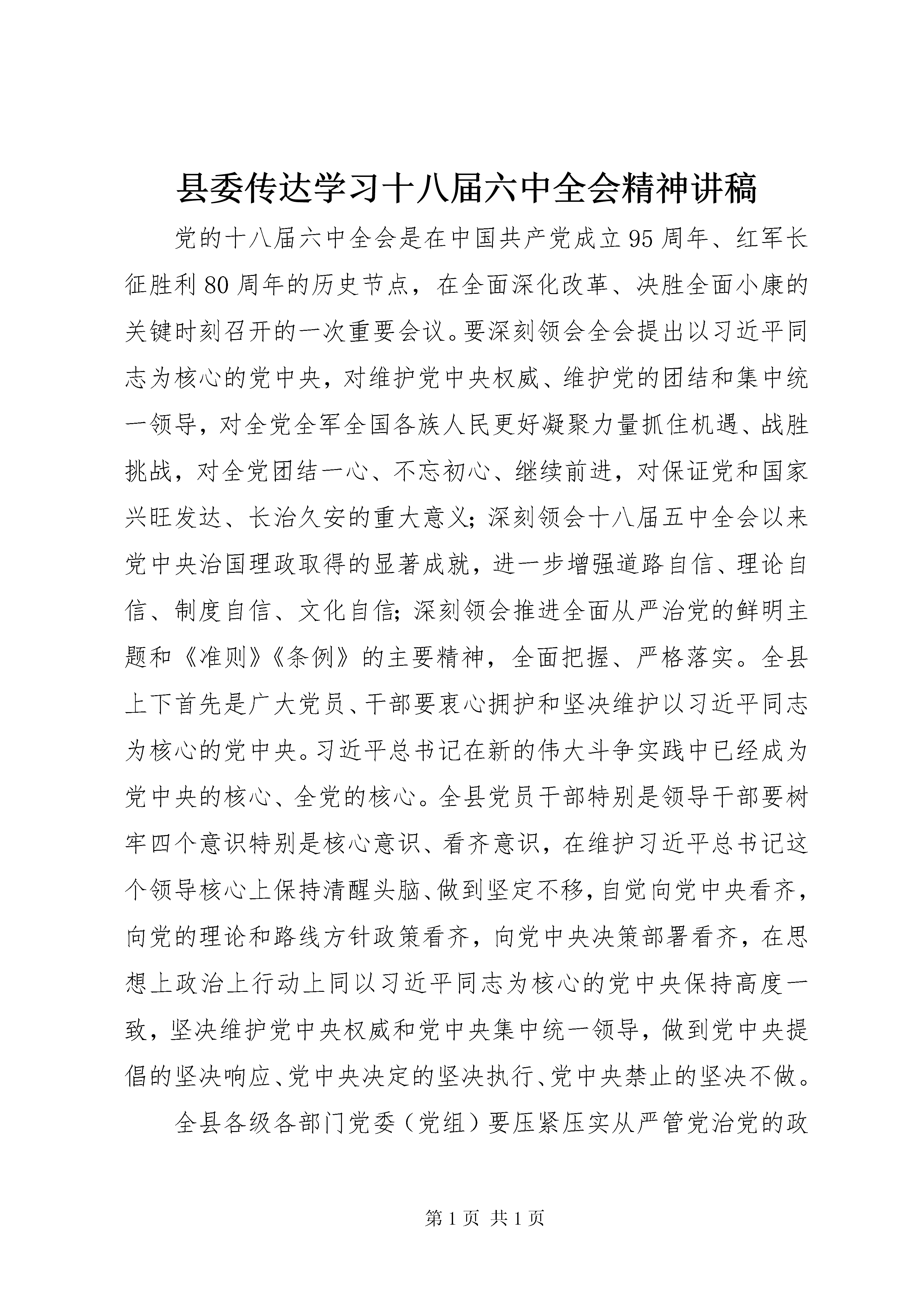 县委传达学习十八届六中全会精神讲稿党的十八届六中全会是在中国共产党成立95周年、红军长征胜利80周年的历史节点,在全面深化改革、决胜全面小康的关键时刻召开的一次重要会议。要深刻领会全会提出以习近平同志为核心的党中央,对维护党中央权威、维护党的团结和集中统一领导,对全党全军全国各族人民更好凝聚力量抓住机遇、战胜挑战,对全党团结一心、不忘初心、继续前进,对保证党和国家兴旺发达、长治久安的重大意义;深刻领会十八届五中全会以来党中央治国理政取得的显著成就,进一步增强道路自信、理论自信、制度自信、文化自信;深刻领会推进全面从严治党的鲜明主题和《准则》《条例》的主要精神,全面把握、严格落实。全县上下首先是广大党员、干部要衷心拥护和坚决维护以习近平同志为核心的党中央。习近平总书记在新的伟大斗争实践中已经成为党中央的核心、全党的核心。全县党员干部特别是领导干部要树牢四个意识特别是核心意识、看齐意识,在维护习近平总书记这个领导核心上保持清醒头脑、做到坚定不移,自觉向党中央看齐,向党的理论和路线方针政策看齐,向党中央决策部署看齐,在思想上政治上行动上同以习近平同志为核心的党中央保持高度一致,坚决维护党中央权威和党中央集中统一领导,做到党中央提倡的坚决响应、党中央决定的坚决执行、党中央禁止的坚决不做。全县各级各部门党委(党组)要压紧压实从严管党治党的政治责任。始终把管党治党放在第一位置、作为第一任务,把党委(党组)主体责任和纪委(纪检组)监督责任担起来,把各级一把手的第一责任担起来,把班子成员的热门思想汇报一岗双责担起来,把严的要求、严的标准、严的举措贯穿于管党治党全过程。全县各级党员领导干部特别是县级领导干部和各级各部门主要负责同志,要认真履行管党治党责任,率先垂范、以上率下,以身作则、敢抓敢管,模范遵守党章党规,带头执行《准则》《条例》,做到职责范围内的问题能及时发现、敢于亮剑,发现的问题能及时有效解决。全县各级领导机关和领导干部要带头践行严肃党内政治生活的行为准则,扎紧扎严加强党内监督的制度笼子。全县各级党员领导干部特别是县委常委班子成员要引领在前,严格遵守《准则》,落实党章要求,抓好维护党中央权威这个原则、思想教育这个根本、严明纪律这个关键、选人用人这个导向、组织生活这个经常性手段、继承和创新这个关键环节,坚决反对党内政治生活庸俗化,着力增强党内政治生活的政治性、时代性、原则性、战斗性。