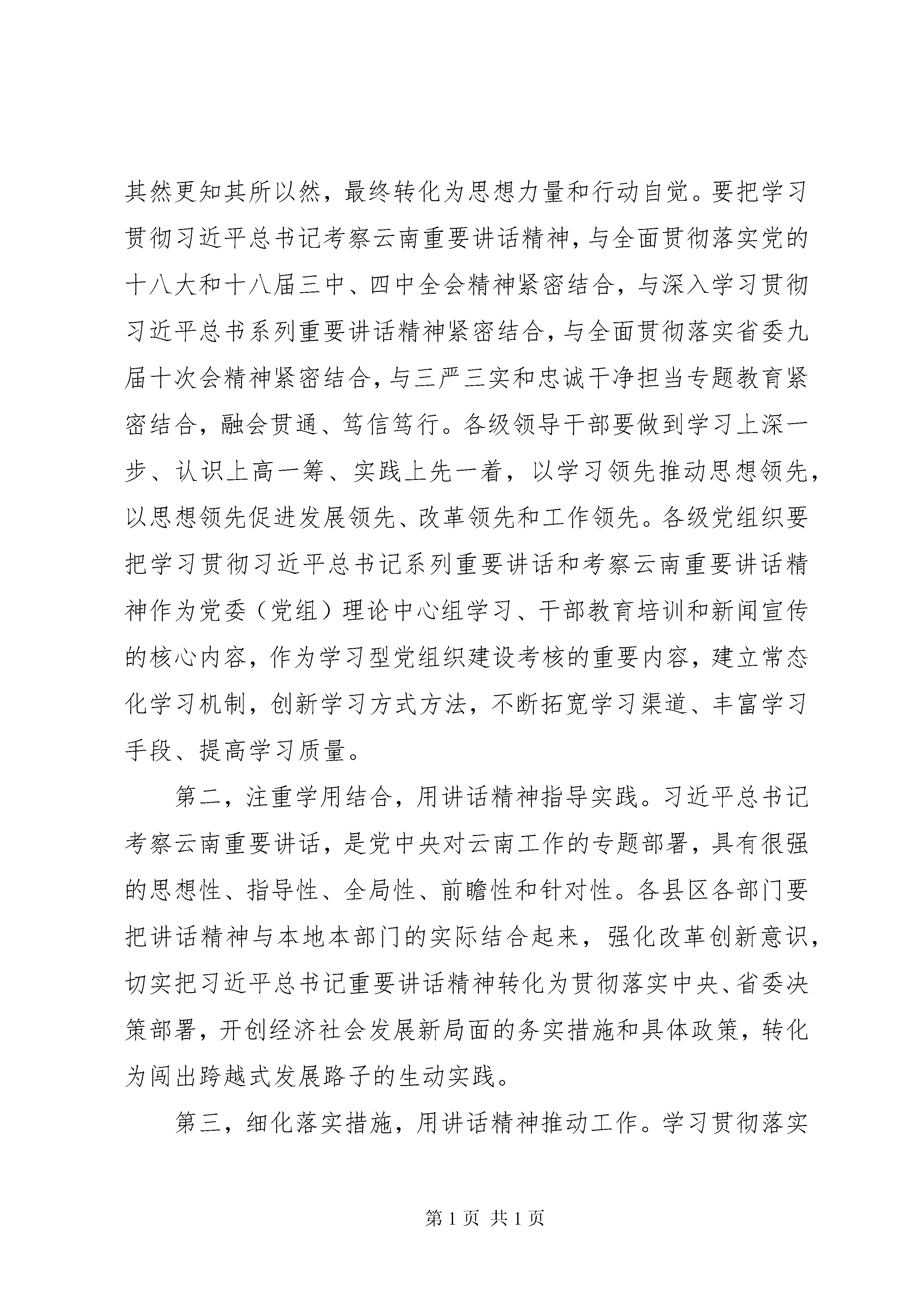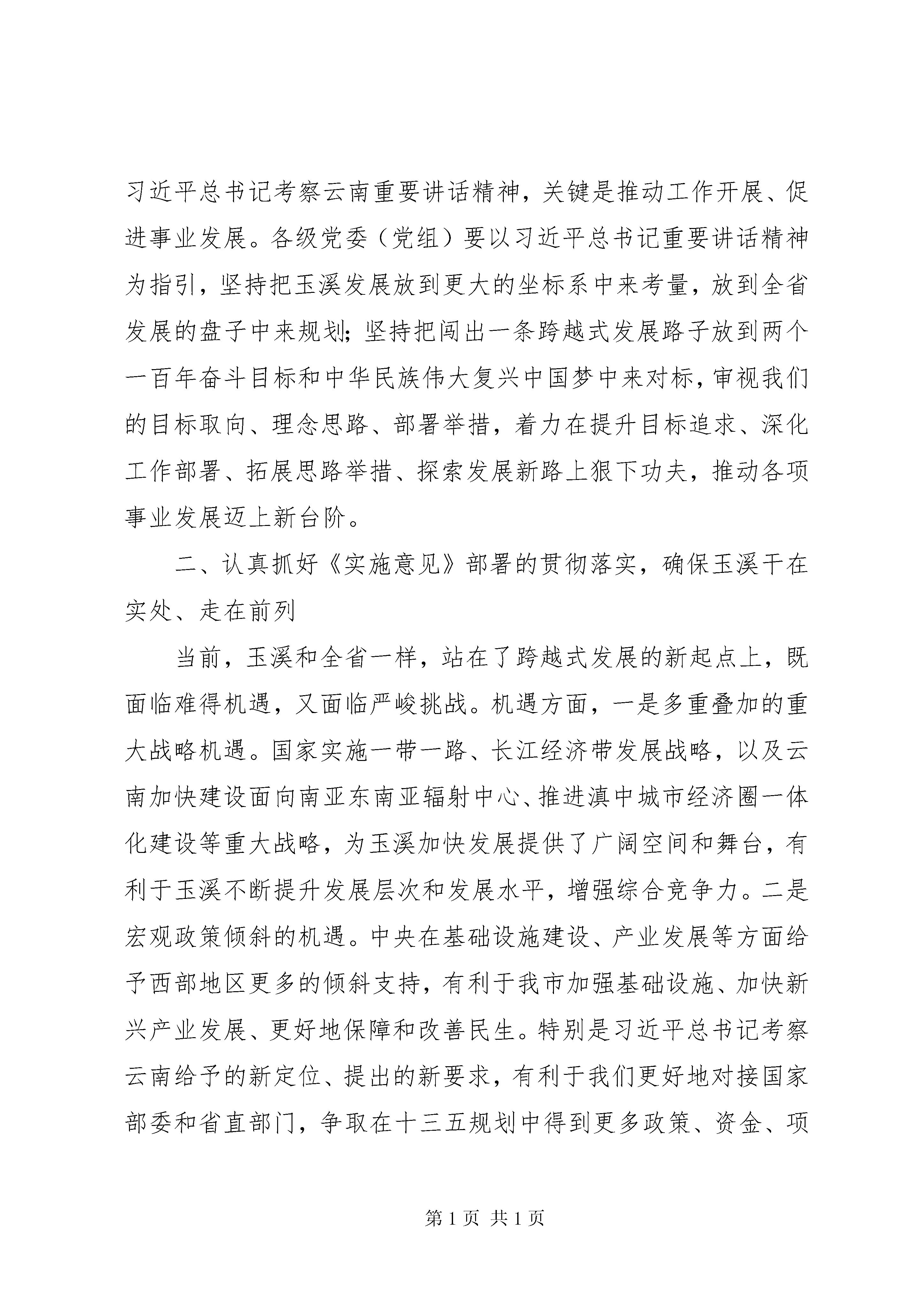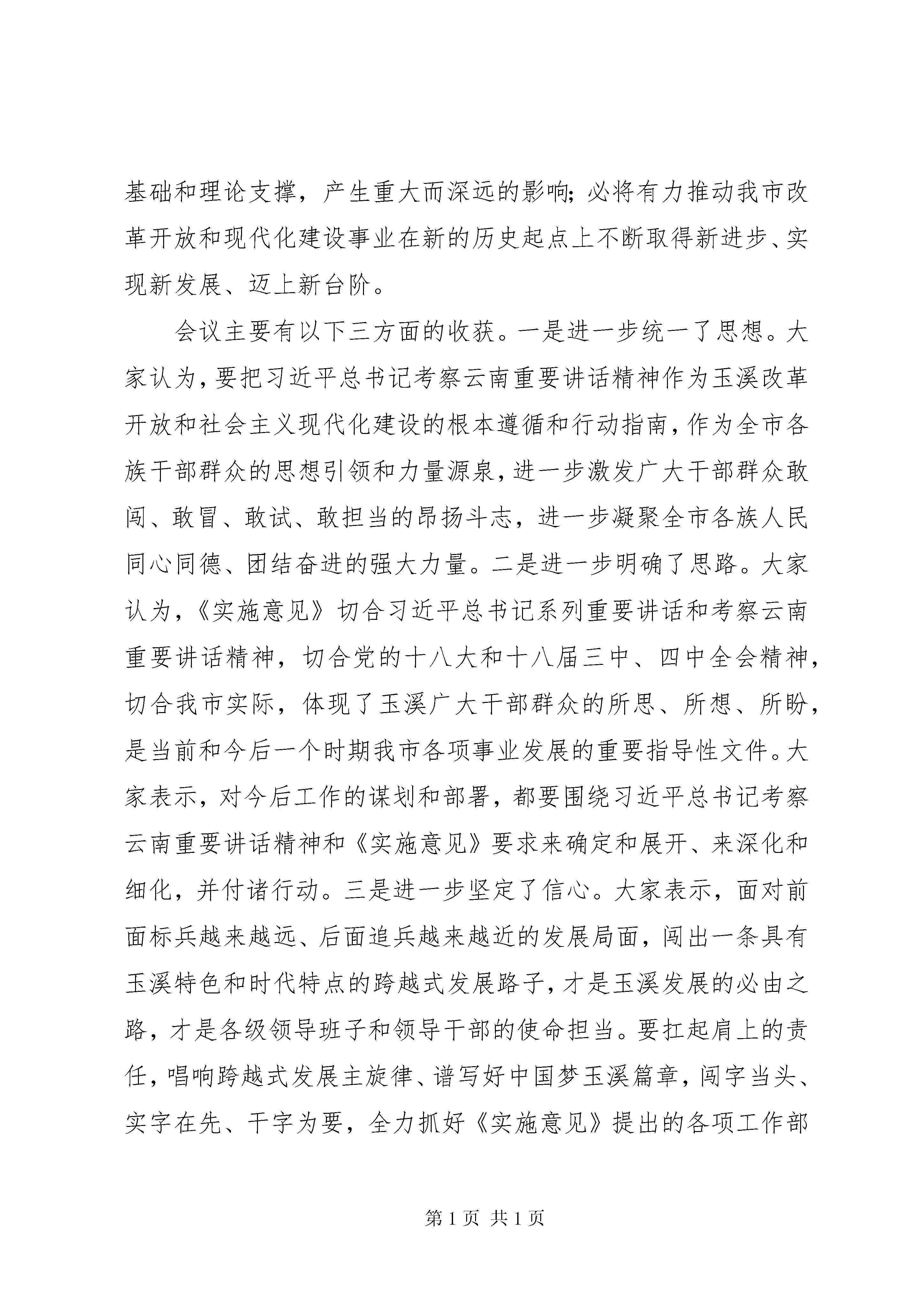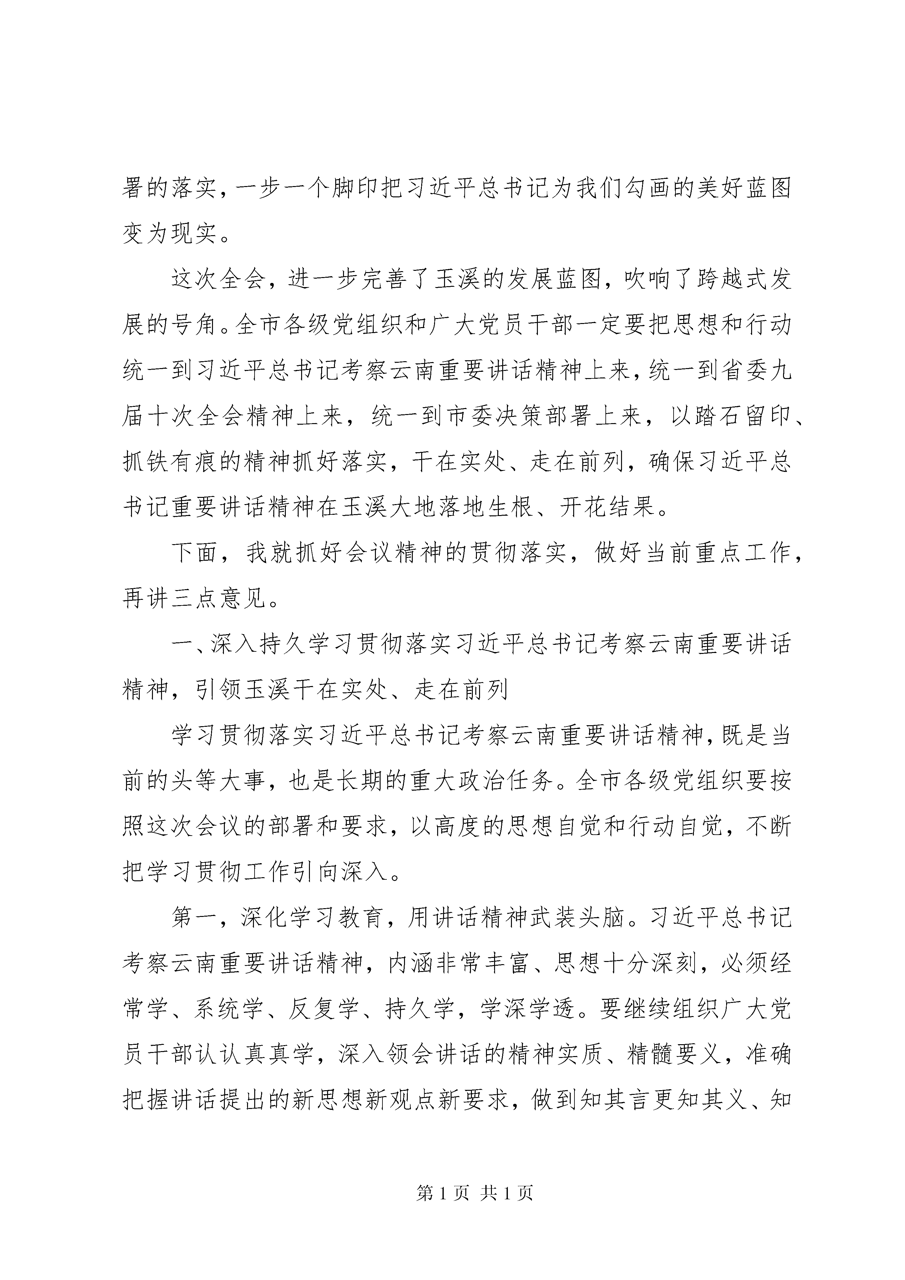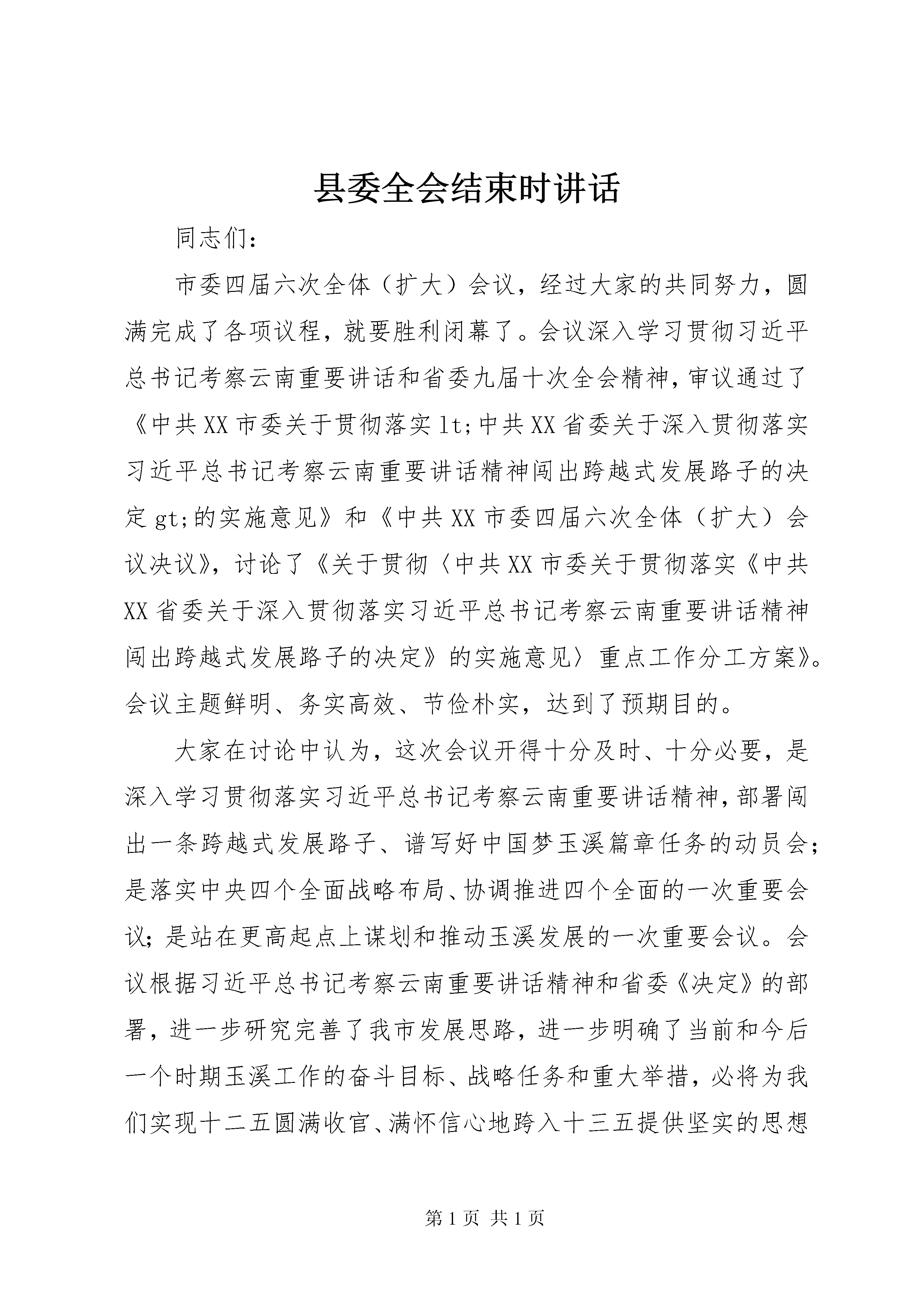 县委全会结束时讲话同志们:市委四届六次全体(扩大)会议,经过大家的共同努力,圆满完成了各项议程,就要胜利闭幕了。会议深入学习贯彻习近平总书记考察云南重要讲话和省委九届十次全会精神,审议通过了《中共XX市委关于贯彻落实lt;中共XX省委关于深入贯彻落实习近平总书记考察云南重要讲话精神闯出跨越式发展路子的决定gt;的实施意见》和《中共XX市委四届六次全体(扩大)会议决议》,讨论了《关于贯彻〈中共XX市委关于贯彻落实《中共XX省委关于深入贯彻落实习近平总书记考察云南重要讲话精神闯出跨越式发展路子的决定》的实施意见〉重点工作分工方案》。会议主题鲜明、务实高效、节俭朴实,达到了预期目的。大家在讨论中认为,这次会议开得十分及时、十分必要,是深入学习贯彻落实习近平总书记考察云南重要讲话精神,部署闯出一条跨越式发展路子、谱写好中国梦玉溪篇章任务的动员会;是落实中央四个全面战略布局、协调推进四个全面的一次重要会议;是站在更高起点上谋划和推动玉溪发展的一次重要会议。会议根据习近平总书记考察云南重要讲话精神和省委《决定》的部署,进一步研究完善了我市发展思路,进一步明确了当前和今后一个时期玉溪工作的奋斗目标、战略任务和重大举措,必将为我们实现十二五圆满收官、满怀信心地跨入十三五提供坚实的思想基础和理论支撑,产生重大而深远的影响;必将有力推动我市改革开放和现代化建设事业在新的历史起点上不断取得新进步、实现新发展、迈上新台阶。会议主要有以下三方面的收获。一是进一步统一了思想。大家认为,要把习近平总书记考察云南重要讲话精神作为玉溪改革开放和社会主义现代化建设的根本遵循和行动指南,作为全市各族干部群众的思想引领和力量源泉,进一步激发广大干部群众敢闯、敢冒、敢试、敢担当的昂扬斗志,进一步凝聚全市各族人民同心同德、团结奋进的强大力量。二是进一步明确了思路。大家认为,《实施意见》切合习近平总书记系列重要讲话和考察云南重要讲话精神,切合党的十八大和十八届三中、四中全会精神,切合我市实际,体现了玉溪广大干部群众的所思、所想、所盼,是当前和今后一个时期我市各项事业发展的重要指导性文件。大家表示,对今后工作的谋划和部署,都要围绕习近平总书记考察云南重要讲话精神和《实施意见》要求来确定和展开、来深化和细化,并付诸行动。三是进一步坚定了信心。大家表示,面对前面标兵越来越远、后面追兵越来越近的发展局面,闯出一条具有玉溪特色和时代特点的跨越式发展路子,才是玉溪发展的必由之路,才是各级领导班子和领导干部的使命担当。要扛起肩上的责任,唱响跨越式发展主旋律、谱写好中国梦玉溪篇章,闯字当头、实字在先、干字为要,全力抓好《实施意见》提出的各项工作部署的落实,一步一个脚印把习近平总书记为我们勾画的美好蓝图变为现实。这次全会,进一步完善了玉溪的发展蓝图,吹响了跨越式发展的号角。全市各级党组织和广大党员干部一定要把思想和行动统一到习近平总书记考察云南重要讲话精神上来,统一到省委九届十次全会精神上来,统一到市委决策部署上来,以踏石留印、抓铁有痕的精神抓好落实,干在实处、走在前列,确保习近平总书记重要讲话精神在玉溪大地落地生根、开花结果。下面,我就抓好会议精神的贯彻落实,做好当前重点工作,再讲三点意见。一、深入持久学习贯彻落实习近平总书记考察云南重要讲话精神,引领玉溪干在实处、走在前列学习贯彻落实习近平总书记考察云南重要讲话精神,既是当前的头等大事,也是长期的重大政治任务。全市各级党组织要按照这次会议的部署和要求,以高度的思想自觉和行动自觉,不断把学习贯彻工作引向深入。第一,深化学习教育,用讲话精神武装头脑。习近平总书记考察云南重要讲话精神,内涵非常丰富、思想十分深刻,必须经常学、系统学、反复学、持久学,学深学透。要继续组织广大党员干部认认真真学,深入领会讲话的精神实质、精髓要义,准确把握讲话提出的新思想新观点新要求,做到知其言更知其义、知其然更知其所以然,最终转化为思想力量和行动自觉。要把学习贯彻习近平总书记考察云南重要讲话精神,与全面贯彻落实党的十八大和十八届三中、四中全会精神紧密结合,与深入学习贯彻习近平总书系列重要讲话精神紧密结合,与全面贯彻落实省委九届十次会精神紧密结合,与三严三实和忠诚干净担当专题教育紧密结合,融会贯通、笃信笃行。各级领导干部要做到学习上深一步、认识上高一筹、实践上先一着,以学习领先推动思想领先,以思想领先促进发展领先、改革领先和工作领先。各级党组织要把学习贯彻习近平总书记系列重要讲话和考察云南重要讲话精神作为党委(党组)理论中心组学习、干部教育培训和新闻宣传的核心内容,作为学习型党组织建设考核的重要内容,建立常态化学习机制,创新学习方式方法,不断拓宽学习渠道、丰富学习手段、提高学习质量。第二,注重学用结合,用讲话精神指导实践。习近平总书记考察云
