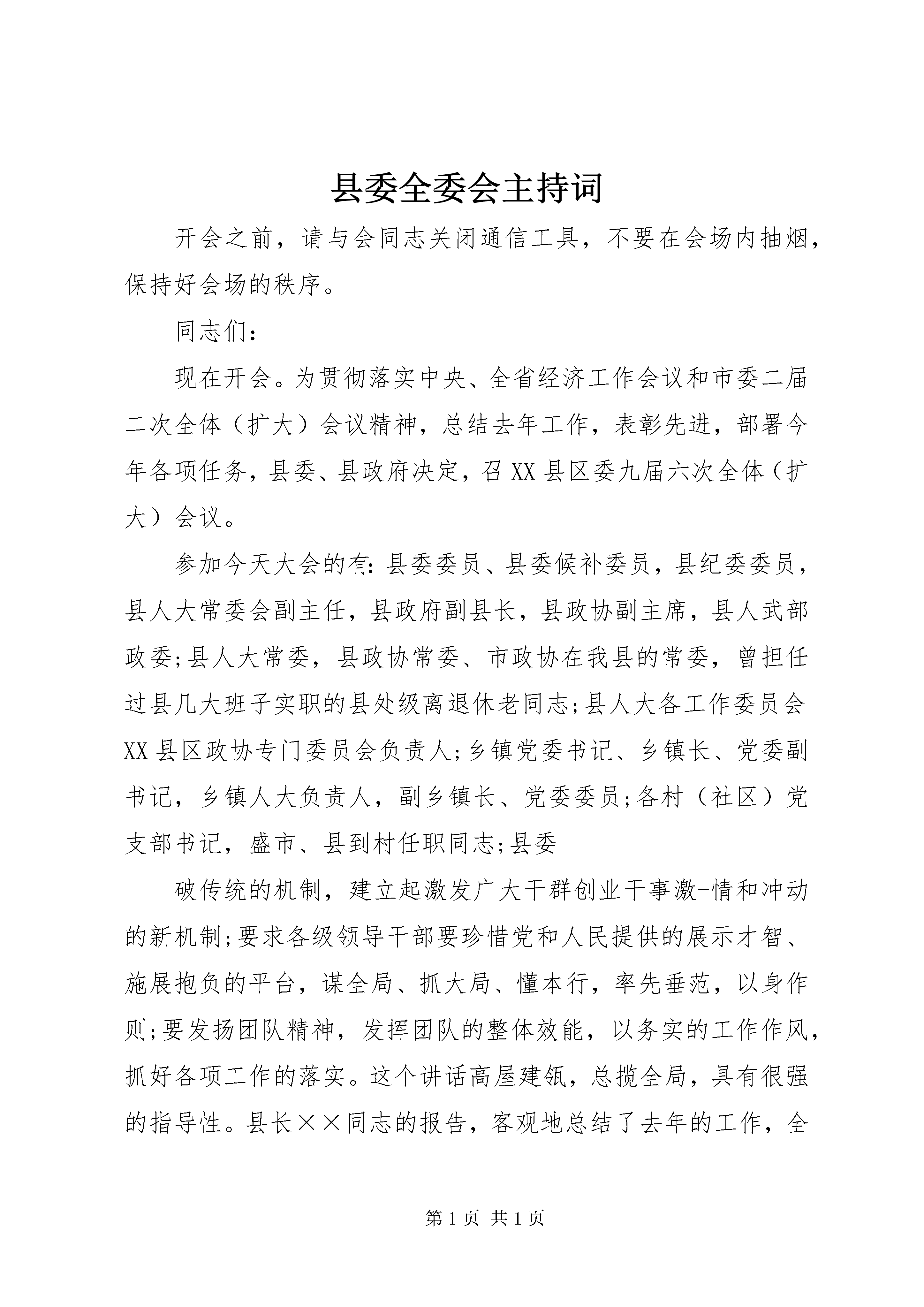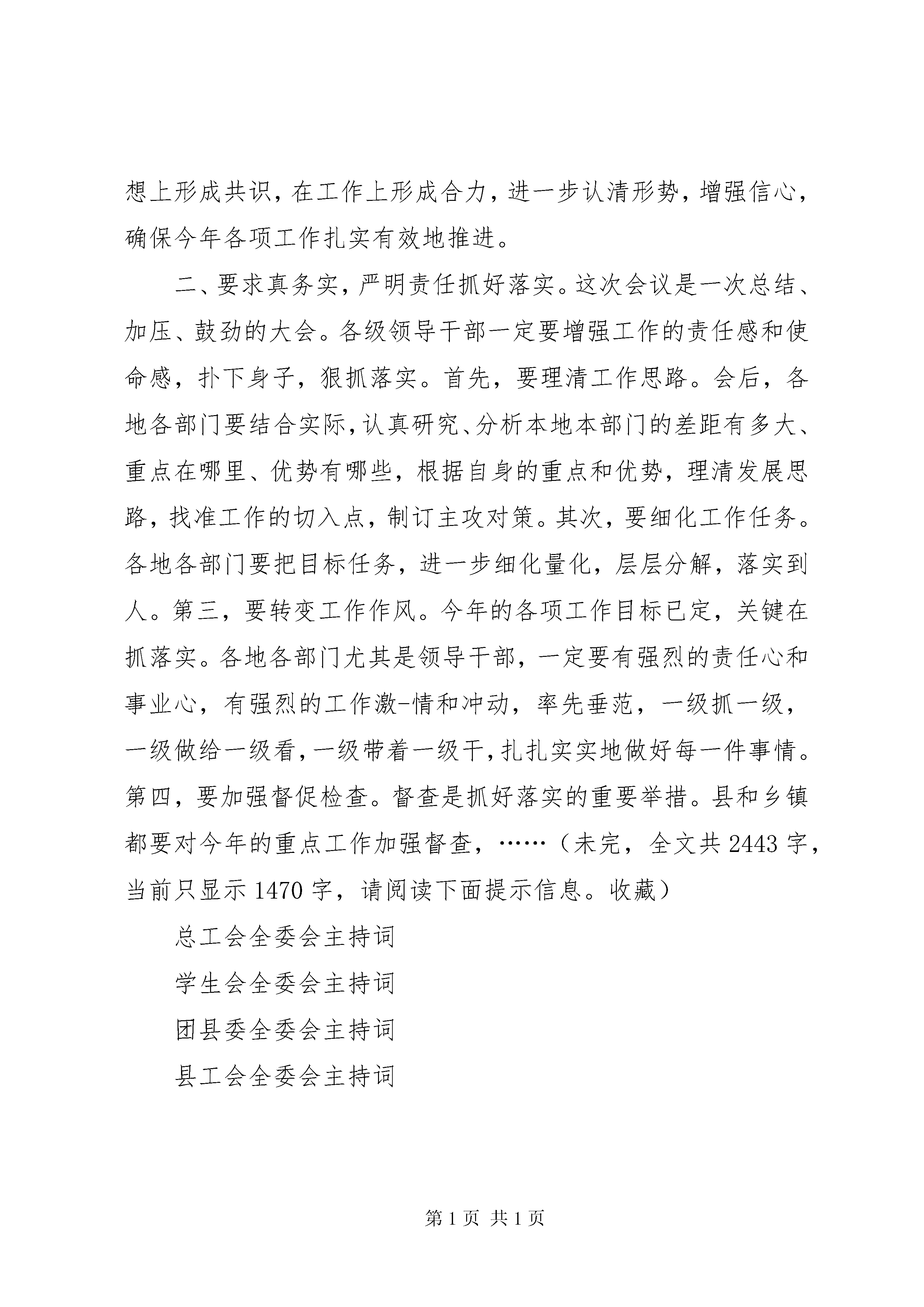 县委全委会主持词开会之前,请与会同志关闭通信工具,不要在会场内抽烟,保持好会场的秩序。同志们:现在开会。为贯彻落实中央、全省经济工作会议和市委二届二次全体(扩大)会议精神,总结去年工作,表彰先进,部署今年各项任务,县委、县政府决定,召XX县区委九届六次全体(扩大)会议。参加今天大会的有:县委委员、县委候补委员,县纪委委员,县人大常委会副主任,县政府副县长,县政协副主席,县人武部政委;县人大常委,县政协常委、市政协在我县的常委,曾担任过县几大班子实职的县处级离退休老同志;县人大各工作委员会XX县区政协专门委员会负责人;乡镇党委书记、乡镇长、党委副书记,乡镇人大负责人,副乡镇长、党委委员;各村(社区)党支部书记,盛市、县到村任职同志;县委破传统的机制,建立起激发广大干群创业干事激-情和冲动的新机制;要求各级领导干部要珍惜党和人民提供的展示才智、施展抱负的平台,谋全局、抓大局、懂本行,率先垂范,以身作则;要发扬团队精神,发挥团队的整体效能,以务实的工作作风,抓好各项工作的落实。这个讲话高屋建瓴,总揽全局,具有很强的指导性。县长××同志的报告,客观地总结了去年的工作,全面地部署了今年的目标任务和工作举措,详实具体,针对性和可操作性都很强。两位负责同志的讲话,表明了县委、县政府加快××发展的信心和决心。会上,表彰了去年我县各项工作中的突出典型。希望受表彰的单位,要与时俱进、积极进娶百尺竿头、更上一层楼;未受表彰的单位,要不甘落后,鼓足勇气、奋起直追。下面,就会议精神的贯彻落实,讲三点意见:一、要深刻理解,贯彻会议精神抓好传达落实。这次会议的主要精神,集中体现两位负责同志的讲话之中。深刻理解这次会议精神,必须进一步解放思想、更新观念,要有“不发展是过,小发展、中发展也是过”的理念,牢固树立工业首位意识,推进全县经济的大发展、快发展;必须要明确今年的发展目标和工作举措,切实把工作重点转到调整经济结构、转变增长方式、提高增长质量和效益上来;必须突出经济建设这个中心,始终把加快发展、富民强县作为最大的政治、最硬的道理、最根本的任务,矢志不移地抓好“六个经济”,不断提升壮大我县的经济实力;必须要坚持经济和社会统筹发展,实现社会全面进步。总的要求是:维护社会稳定,促进经济发展,创建平安××,构建和-谐社会。会后,各地各部门要通过各种形式,迅速将会议精神传达到广大干部群众;县“两台一报”等新闻媒体,要通过生动活泼的形式,广泛深入地宣传好会议精神。通过学习、宣传,使全县上下在思想上形成共识,在工作上形成合力,进一步认清形势,增强信心,确保今年各项工作扎实有效地推进。二、要求真务实,严明责任抓好落实。这次会议是一次总结、加压、鼓劲的大会。各级领导干部一定要增强工作的责任感和使命感,扑下身子,狠抓落实。首先,要理清工作思路。会后,各地各部门要结合实际,认真研究、分析本地本部门的差距有多大、重点在哪里、优势有哪些,根据自身的重点和优势,理清发展思路,找准工作的切入点,制订主攻对策。其次,要细化工作任务。各地各部门要把目标任务,进一步细化量化,层层分解,落实到人。第三,要转变工作作风。今年的各项工作目标已定,关键在抓落实。各地各部门尤其是领导干部,一定要有强烈的责任心和事业心,有强烈的工作激-情和冲动,率先垂范,一级抓一级,一级做给一级看,一级带着一级干,扎扎实实地做好每一件事情。第四,要加强督促检查。督查是抓好落实的重要举措。县和乡镇都要对今年的重点工作加强督查,……(未完,全文共2443字,当前只显示1470字,请阅读下面提示信息。收藏)总工会全委会主持词学生会全委会主持词团县委全委会主持词县工会全委会主持词