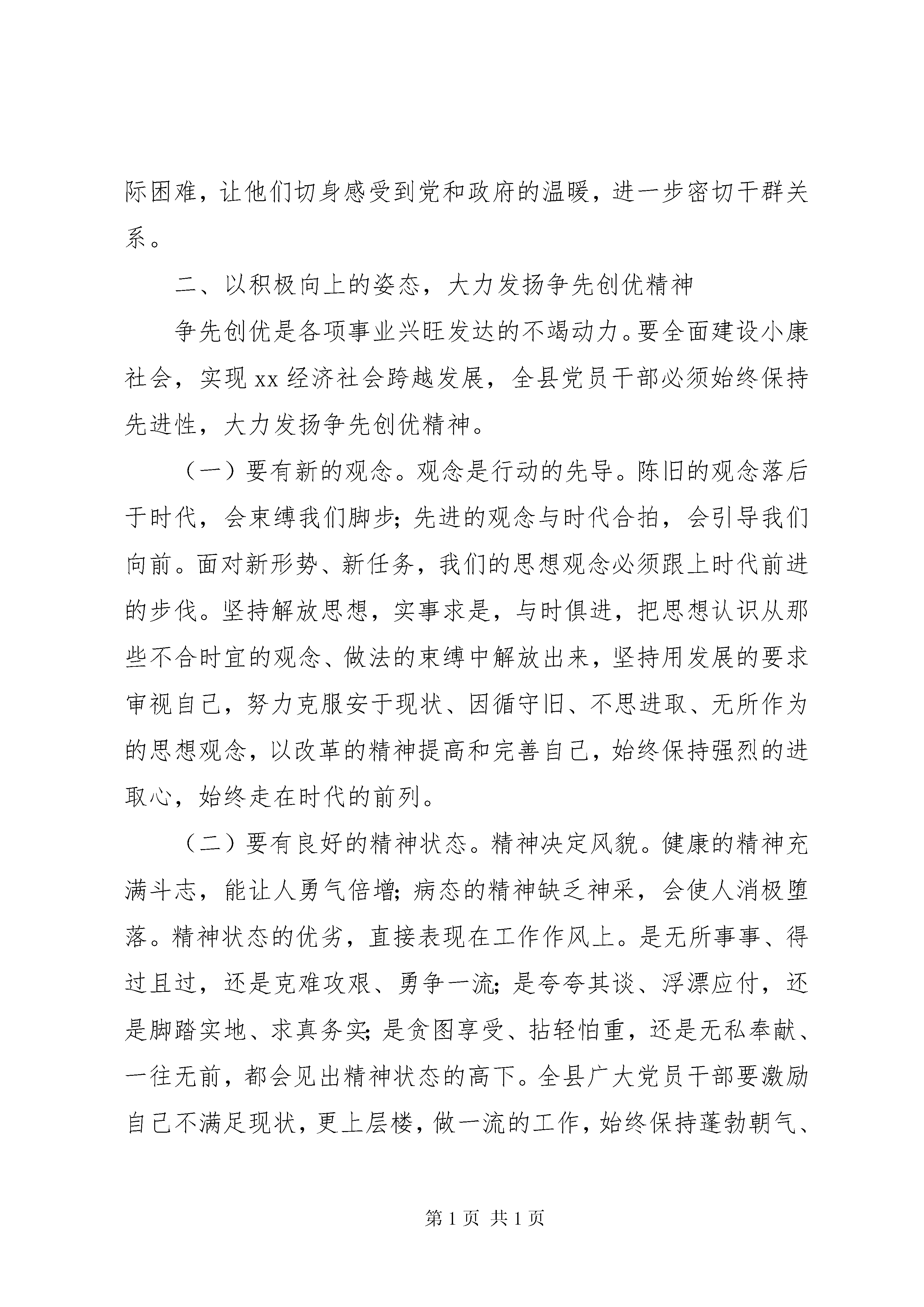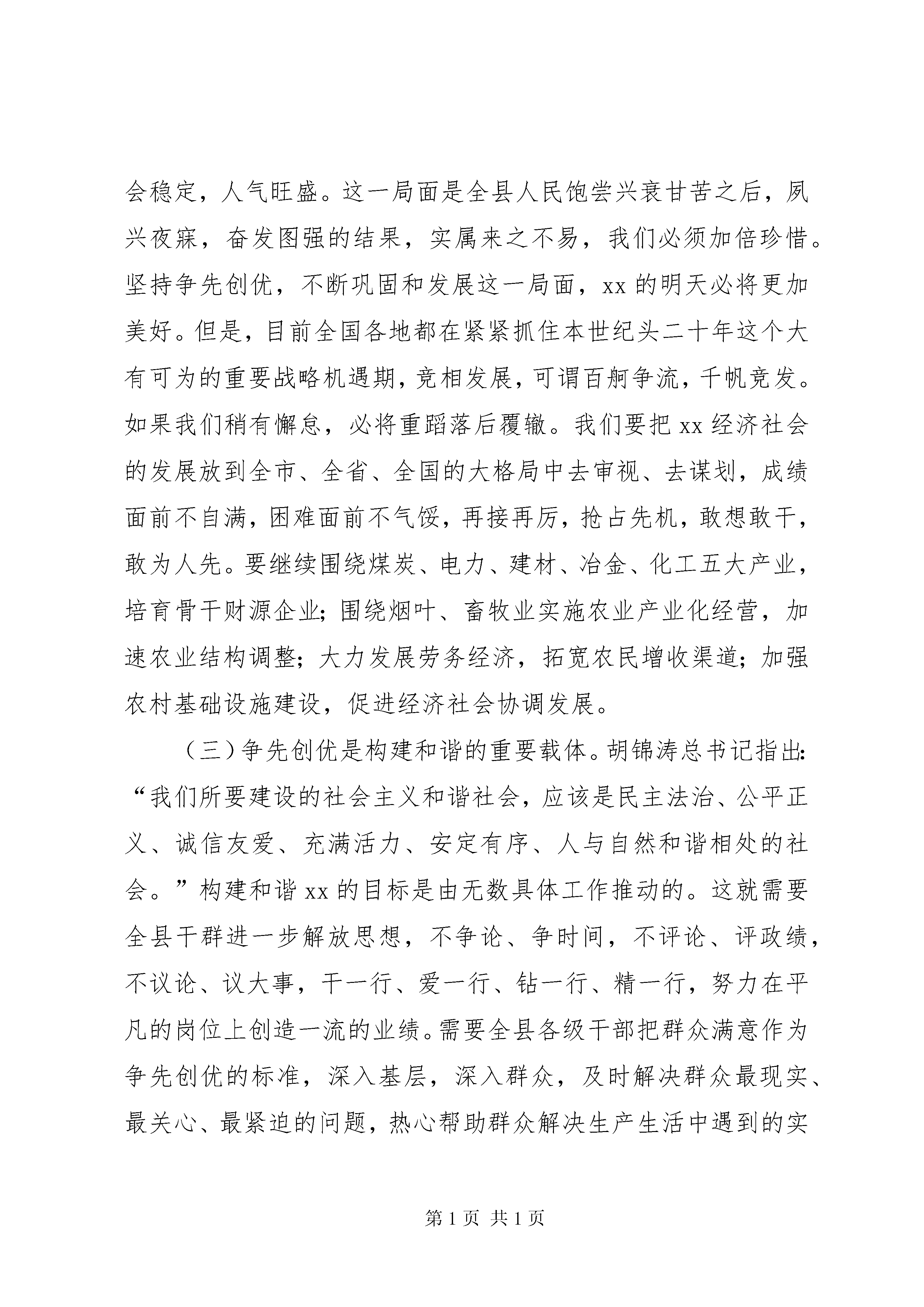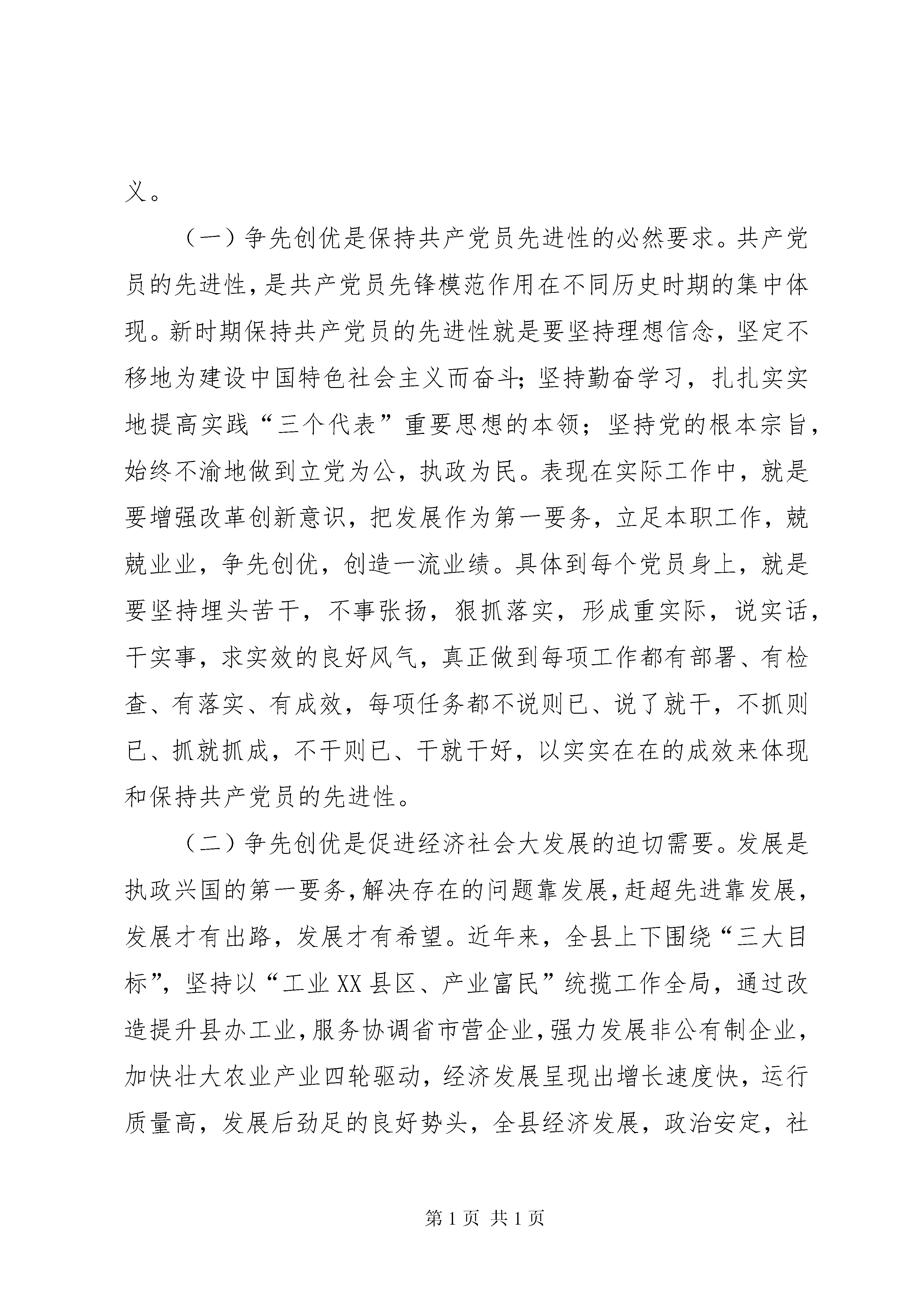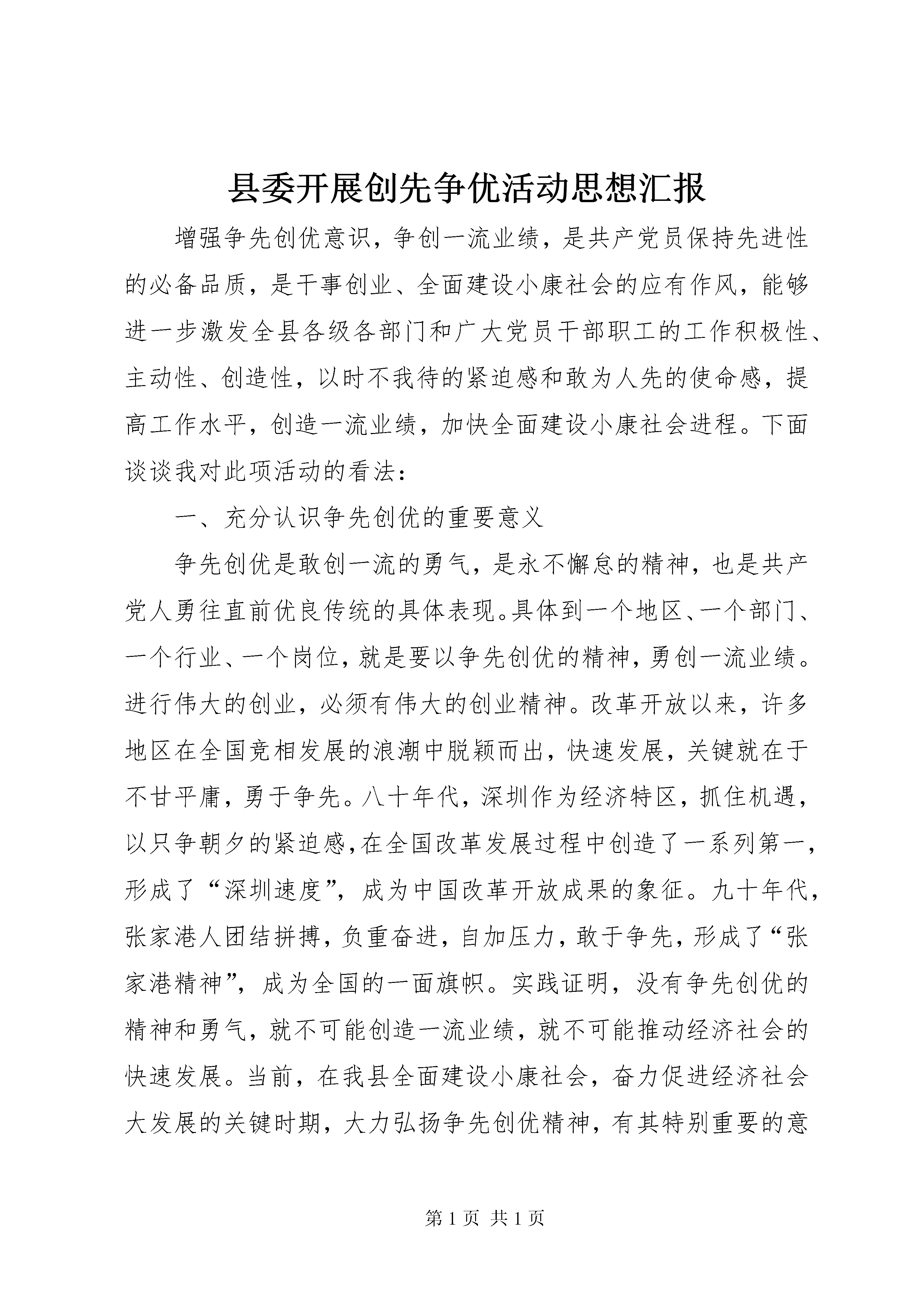 县委开展创先争优活动思想汇报增强争先创优意识,争创一流业绩,是共产党员保持先进性的必备品质,是干事创业、全面建设小康社会的应有作风,能够进一步激发全县各级各部门和广大党员干部职工的工作积极性、主动性、创造性,以时不我待的紧迫感和敢为人先的使命感,提高工作水平,创造一流业绩,加快全面建设小康社会进程。下面谈谈我对此项活动的看法:一、充分认识争先创优的重要意义争先创优是敢创一流的勇气,是永不懈怠的精神,也是共产党人勇往直前优良传统的具体表现。具体到一个地区、一个部门、一个行业、一个岗位,就是要以争先创优的精神,勇创一流业绩。进行伟大的创业,必须有伟大的创业精神。改革开放以来,许多地区在全国竞相发展的浪潮中脱颖而出,快速发展,关键就在于不甘平庸,勇于争先。八十年代,深圳作为经济特区,抓住机遇,以只争朝夕的紧迫感,在全国改革发展过程中创造了一系列第一,形成了“深圳速度”,成为中国改革开放成果的象征。九十年代,张家港人团结拼搏,负重奋进,自加压力,敢于争先,形成了“张家港精神”,成为全国的一面旗帜。实践证明,没有争先创优的精神和勇气,就不可能创造一流业绩,就不可能推动经济社会的快速发展。当前,在我县全面建设小康社会,奋力促进经济社会大发展的关键时期,大力弘扬争先创优精神,有其特别重要的意义。(一)争先创优是保持共产党员先进性的必然要求。共产党员的先进性,是共产党员先锋模范作用在不同历史时期的集中体现。新时期保持共产党员的先进性就是要坚持理想信念,坚定不移地为建设中国特色社会主义而奋斗;坚持勤奋学习,扎扎实实地提高实践“三个代表”重要思想的本领;坚持党的根本宗旨,始终不渝地做到立党为公,执政为民。表现在实际工作中,就是要增强改革创新意识,把发展作为第一要务,立足本职工作,兢兢业业,争先创优,创造一流业绩。具体到每个党员身上,就是要坚持埋头苦干,不事张扬,狠抓落实,形成重实际,说实话,干实事,求实效的良好风气,真正做到每项工作都有部署、有检查、有落实、有成效,每项任务都不说则已、说了就干,不抓则已、抓就抓成,不干则已、干就干好,以实实在在的成效来体现和保持共产党员的先进性。(二)争先创优是促进经济社会大发展的迫切需要。发展是执政兴国的第一要务,解决存在的问题靠发展,赶超先进靠发展,发展才有出路,发展才有希望。近年来,全县上下围绕“三大目标”,坚持以“工业XX县区、产业富民”统揽工作全局,通过改造提升县办工业,服务协调省市营企业,强力发展非公有制企业,加快壮大农业产业四轮驱动,经济发展呈现出增长速度快,运行质量高,发展后劲足的良好势头,全县经济发展,政治安定,社会稳定,人气旺盛。这一局面是全县人民饱尝兴衰甘苦之后,夙兴夜寐,奋发图强的结果,实属来之不易,我们必须加倍珍惜。坚持争先创优,不断巩固和发展这一局面,xx的明天必将更加美好。但是,目前全国各地都在紧紧抓住本世纪头二十年这个大有可为的重要战略机遇期,竞相发展,可谓百舸争流,千帆竞发。如果我们稍有懈怠,必将重蹈落后覆辙。我们要把xx经济社会的发展放到全市、全省、全国的大格局中去审视、去谋划,成绩面前不自满,困难面前不气馁,再接再厉,抢占先机,敢想敢干,敢为人先。要继续围绕煤炭、电力、建材、冶金、化工五大产业,培育骨干财源企业;围绕烟叶、畜牧业实施农业产业化经营,加速农业结构调整;大力发展劳务经济,拓宽农民增收渠道;加强农村基础设施建设,促进经济社会协调发展。(三)争先创优是构建和谐的重要载体。胡锦涛总书记指出:“我们所要建设的社会主义和谐社会,应该是民主法治、公平正义、诚信友爱、充满活力、安定有序、人与自然和谐相处的社会。”构建和谐xx的目标是由无数具体工作推动的。这就需要全县干群进一步解放思想,不争论、争时间,不评论、评政绩,不议论、议大事,干一行、爱一行、钻一行、精一行,努力在平凡的岗位上创造一流的业绩。需要全县各级干部把群众满意作为争先创优的标准,深入基层,深入群众,及时解决群众最现实、最关心、最紧迫的问题,热心帮助群众解决生产生活中遇到的实际困难,让他们切身感受到党和政府的温暖,进一步密切干群关系。二、以积极向上的姿态,大力发扬争先创优精神争先创优是各项事业兴旺发达的不竭动力。要全面建设小康社会,实现xx经济社会跨越发展,全县党员干部必须始终保持先进性,大力发扬争先创优精神。(一)要有新的观念。观念是行动的先导。陈旧的观念落后于时代,会束缚我们脚步;先进的观念与时代合拍,会引导我们向前。面对新形势、新任务,我们的思想观念必须跟上时代前进的步伐。坚持解放思想,实事求是,与时俱进,把思想认识从那些不合时宜的观念、做法的束缚中解放出来,坚持用发展的要求审视自己,努力克服安于现状、因循守旧、不思进取、无所作为的思想观念,以改革的精神提高和完善自己,始终保持强烈的进