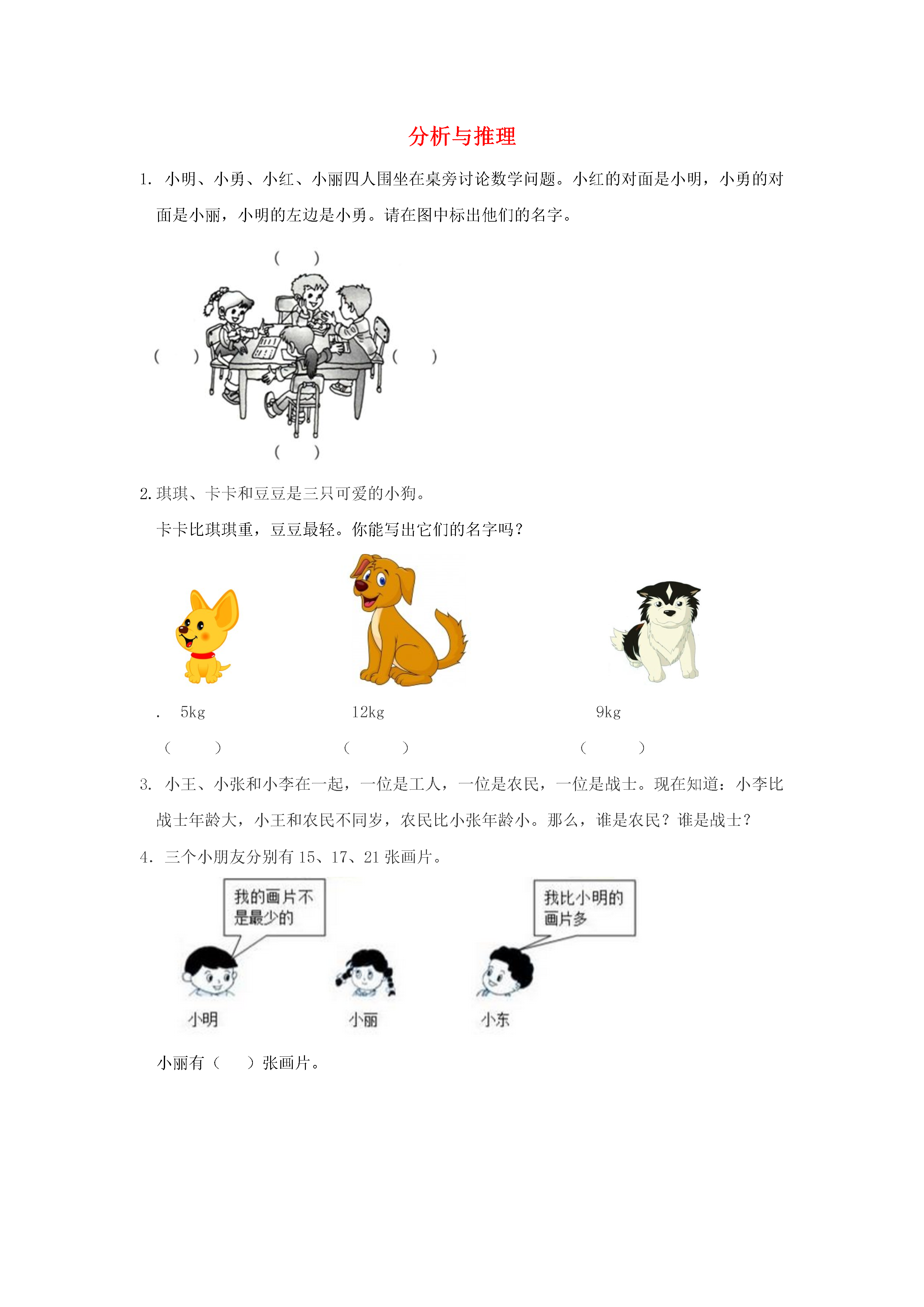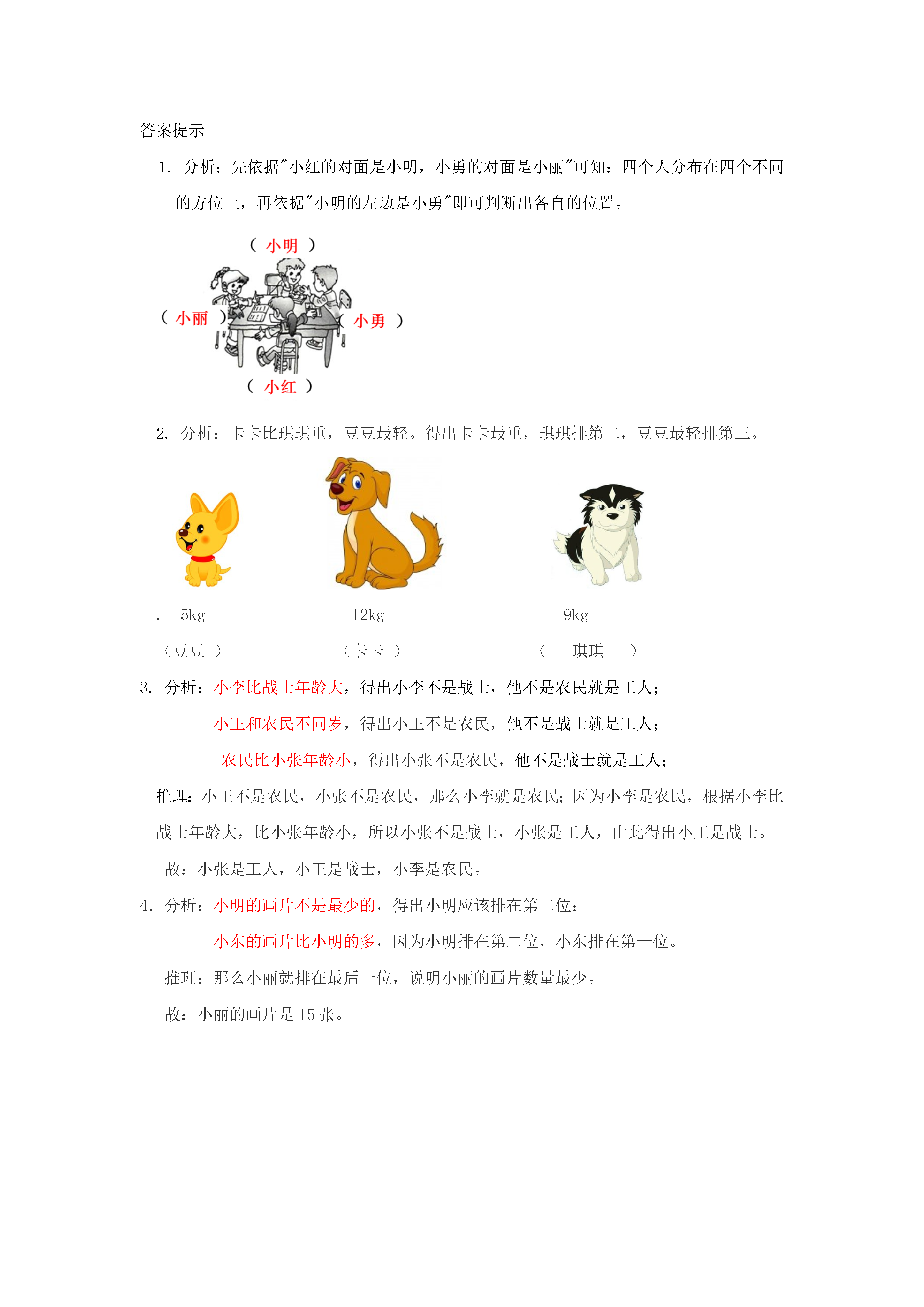 分析与推理1.小明、小勇、小红、小丽四人围坐在桌旁讨论数学问题。小红的对面是小明,小勇的对面是小丽,小明的左边是小勇。请在图中标出他们的名字。2.琪琪、卡卡和豆豆是三只可爱的小狗。卡卡比琪琪重,豆豆最轻。你能写出它们的名字吗?.5kg12kg9kg()()()3.小王、小张和小李在一起,一位是工人,一位是农民,一位是战士。现在知道:小李比战士年龄大,小王和农民不同岁,农民比小张年龄小。那么,谁是农民?谁是战士?4.三个小朋友分别有15、17、21张画片。小丽有()张画片。答案提示1.分析:先依据"小红的对面是小明,小勇的对面是小丽"可知:四个人分布在四个不同的方位上,再依据"小明的左边是小勇"即可判断出各自的位置。2.分析:卡卡比琪琪重,豆豆最轻。得出卡卡最重,琪琪排第二,豆豆最轻排第三。.5kg12kg9kg(豆豆)(卡卡)(琪琪)3.分析:小李比战士年龄大,得出小李不是战士,他不是农民就是工人;小王和农民不同岁,得出小王不是农民,他不是战士就是工人;农民比小张年龄小,得出小张不是农民,他不是战士就是工人;推理:小王不是农民,小张不是农民,那么小李就是农民;因为小李是农民,根据小李比战士年龄大,比小张年龄小,所以小张不是战士,小张是工人,由此得出小王是战士。故:小张是工人,小王是战士,小李是农民。4.分析:小明的画片不是最少的,得出小明应该排在第二位;小东的画片比小明的多,因为小明排在第二位,小东排在第一位。推理:那么小丽就排在最后一位,说明小丽的画片数量最少。故:小丽的画片是15张。