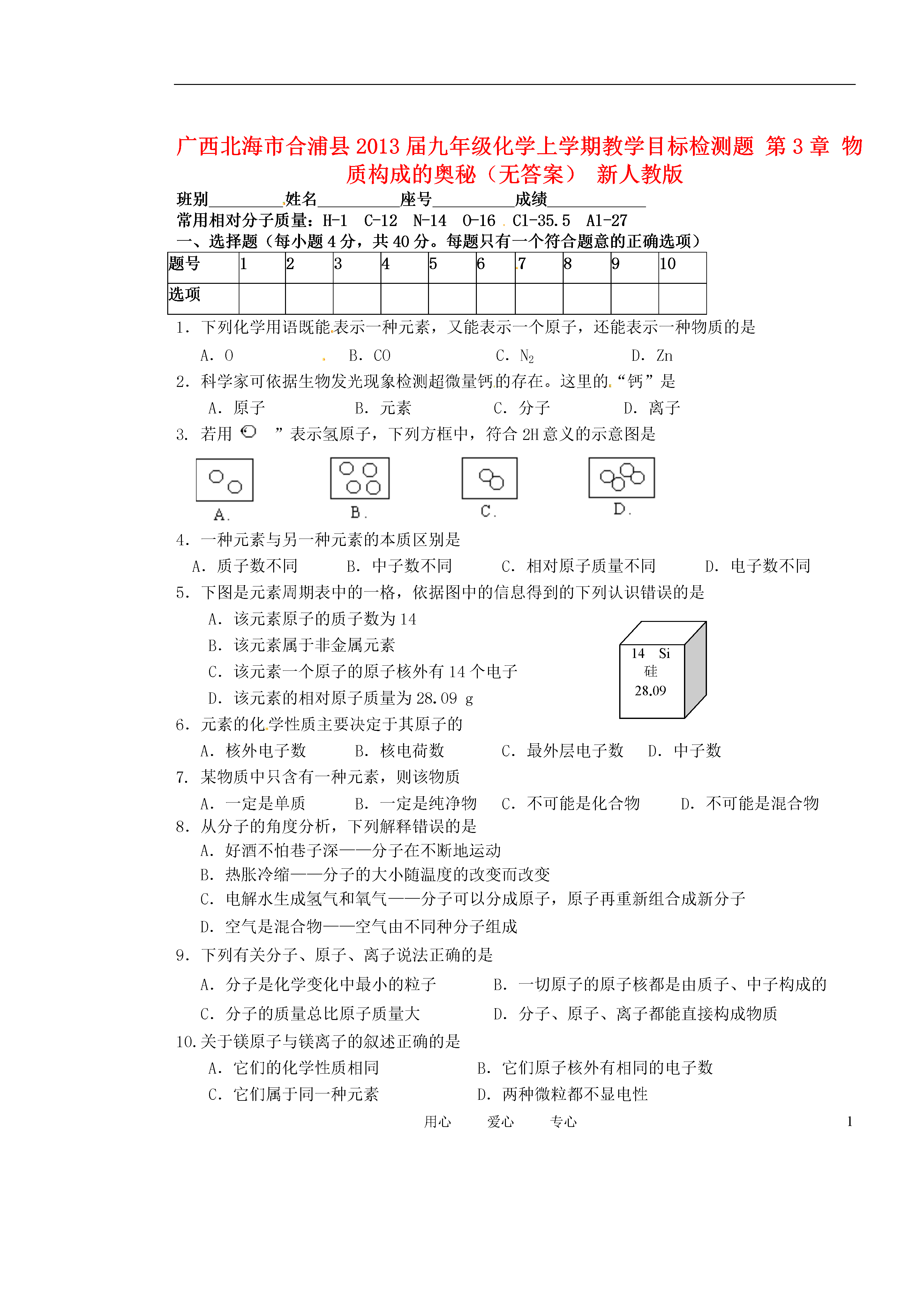 试题-广西-2012_广西北海市合浦县2013届九年级化学上学期教学目标检测题 第3章 物质构成的奥秘(无答案) 新人教版.rar