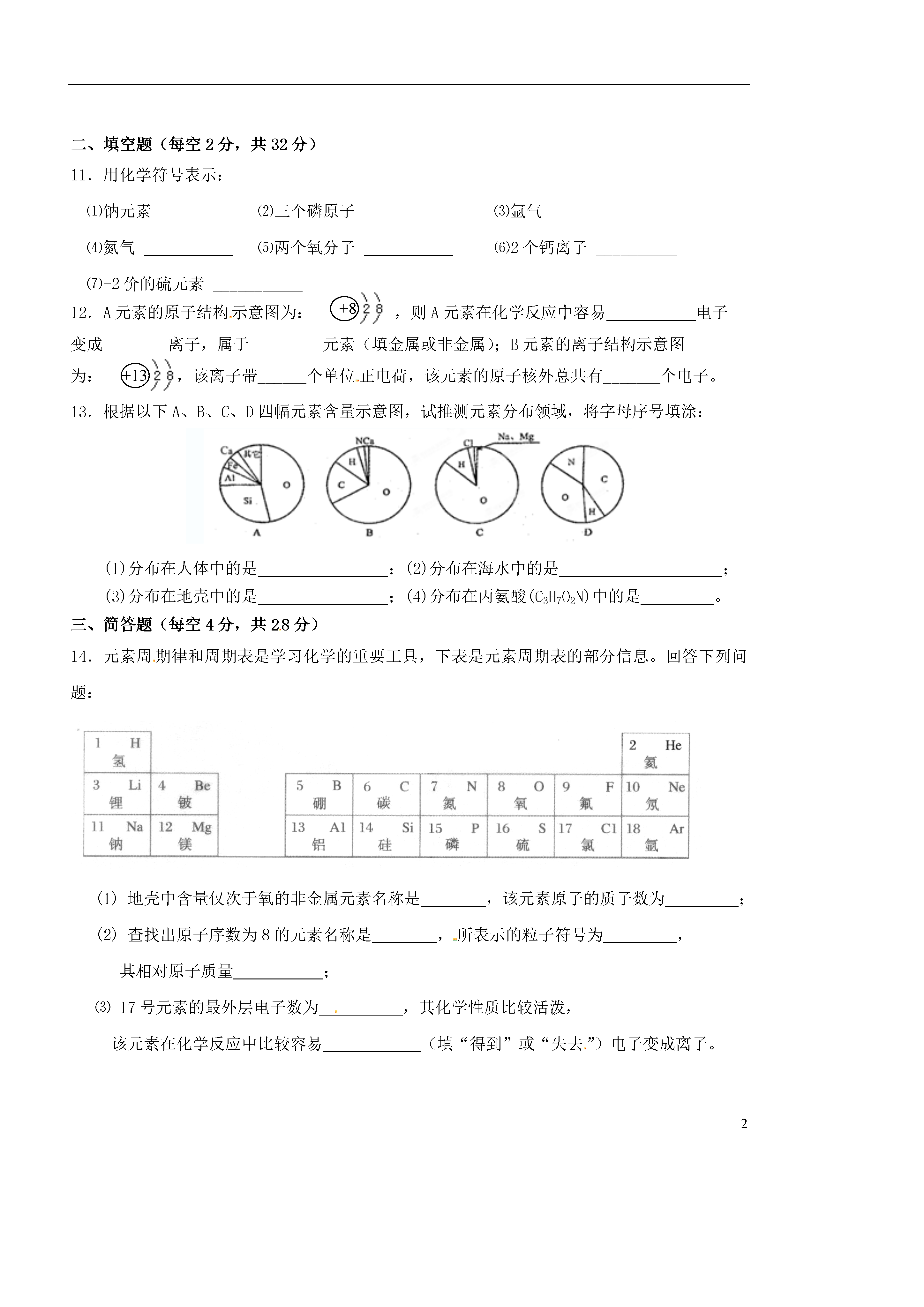 21用心爱心专心广西北海市合浦县2013届九年级化学上学期教学目标检测题第3章物质构成的奥秘(无答案)新人教版班别_________姓名__________座号__________成绩____________常用相对分子质量:H-1C-12N-14O-16Cl-35.5Al-27一、选择题(每小题4分,共40分。每题只有一个符合题意的正确选项)题号12345678910选项1.下列化学用语既能表示一种元素,又能表示一个原子,还能表示一种物质的是A.OB.COC.N2D.Zn2.科学家可依据生物发光现象检测超微量钙的存在。这里的“钙”是A.原子B.元素C.分子D.离子3.若用“”表示氢原子,下列方框中,符合2H意义的示意图是4.一种元素与另一种元素的本质区别是A.质子数不同B.中子数不同C.相对原子质量不同D.电子数不同5.下图是元素周期表中的一格,依据图中的信息得到的下列认识错误的是14Si硅28.09A.该元素原子的质子数为14B.该元素属于非金属元素C.该元素一个原子的原子核外有14个电子D.该元素的相对原子质量为28.09g6.元素的化学性质主要决定于其原子的A.核外电子数B.核电荷数C.最外层电子数D.中子数7.某物质中只含有一种元素,则该物质A.一定是单质B.一定是纯净物C.不可能是化合物D.不可能是混合物8.从分子的角度分析,下列解释错误的是A.好酒不怕巷子深——分子在不断地运动B.热胀冷缩——分子的大小随温度的改变而改变C.电解水生成氢气和氧气——分子可以分成原子,原子再重新组合成新分子D.空气是混合物——空气由不同种分子组成9.下列有关分子、原子、离子说法正确的是A.分子是化学变化中最小的粒子B.一切原子的原子核都是由质子、中子构成的C.分子的质量总比原子质量大D.分子、原子、离子都能直接构成物质10.关于镁原子与镁离子的叙述正确的是A.它们的化学性质相同B.它们原子核外有相同的电子数C.它们属于同一种元素D.两种微粒都不显电性二、填空题(每空2分,共32分)11.用化学符号表示:⑴钠元素⑵三个磷原子⑶氩气⑷氮气⑸两个氧分子⑹2个钙离子__________+8⑺-2价的硫元素___________12.A元素的原子结构示意图为:,则A元素在化学反应中容易电子+13变成________离子,属于_________元素(填金属或非金属);B元素的离子结构示意图为:,该离子带______个单位正电荷,该元素的原子核外总共有_______个电子。13.根据以下A、B、C、D四幅元素含量示意图,试推测元素分布领域,将字母序号填涂:(1)分布在人体中的是;(2)分布在海水中的是;(3)分布在地壳中的是;(4)分布在丙氨酸(C3H7O2N)中的是。三、简答题(每空4分,共28分)14.元素周期律和周期表是学习化学的重要工具,下表是元素周期表的部分信息。回答下列问题:(1)地壳中含量仅次于氧的非金属元素名称是,该元素原子的质子数为;(2)查找出原子序数为8的元素名称是,所表示的粒子符号为,其相对原子质量;⑶17号元素的最外层电子数为,其化学性质比较活泼,该元素在化学反应中比较容易(填“得到”或“失去”)电子变成离子。