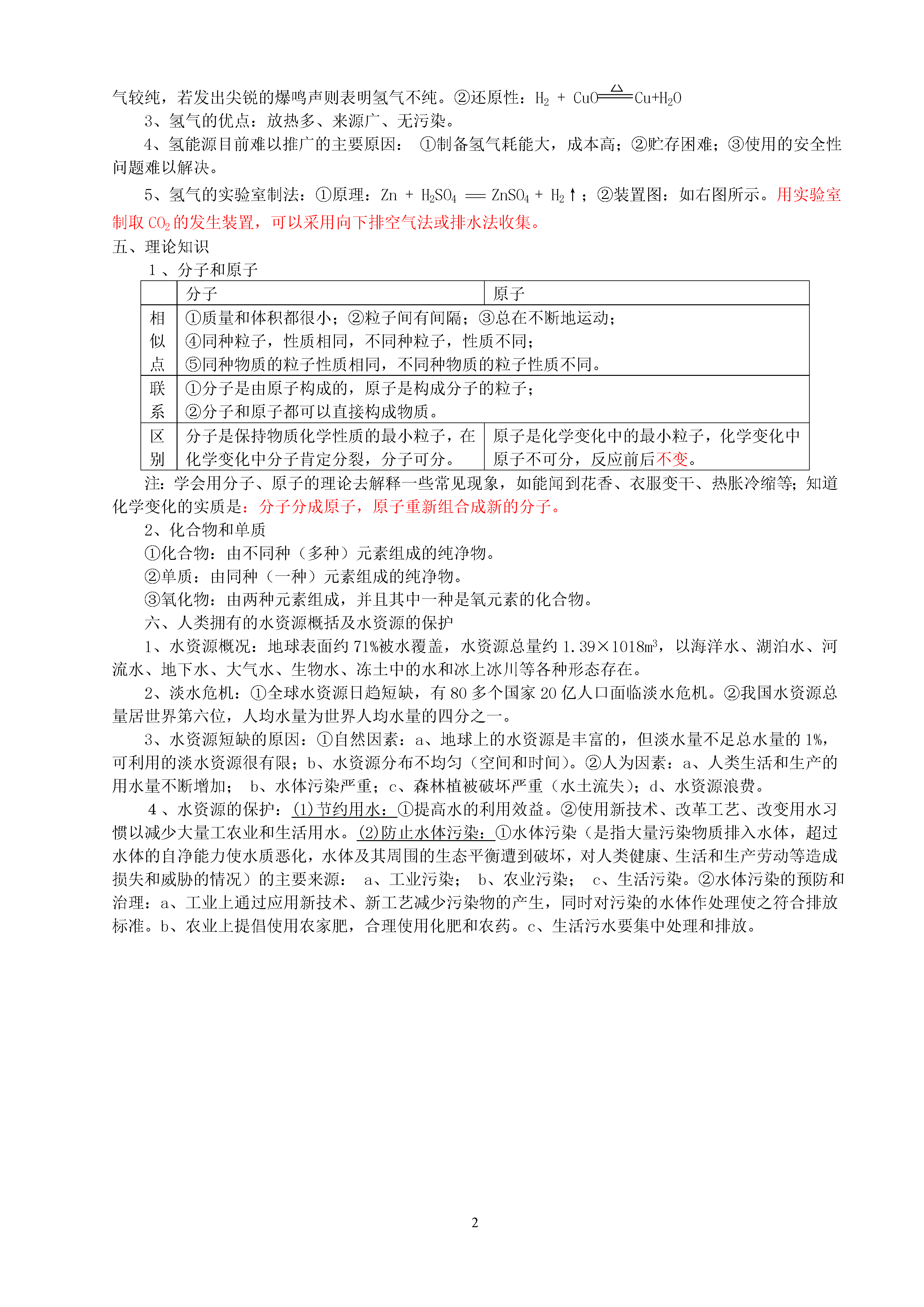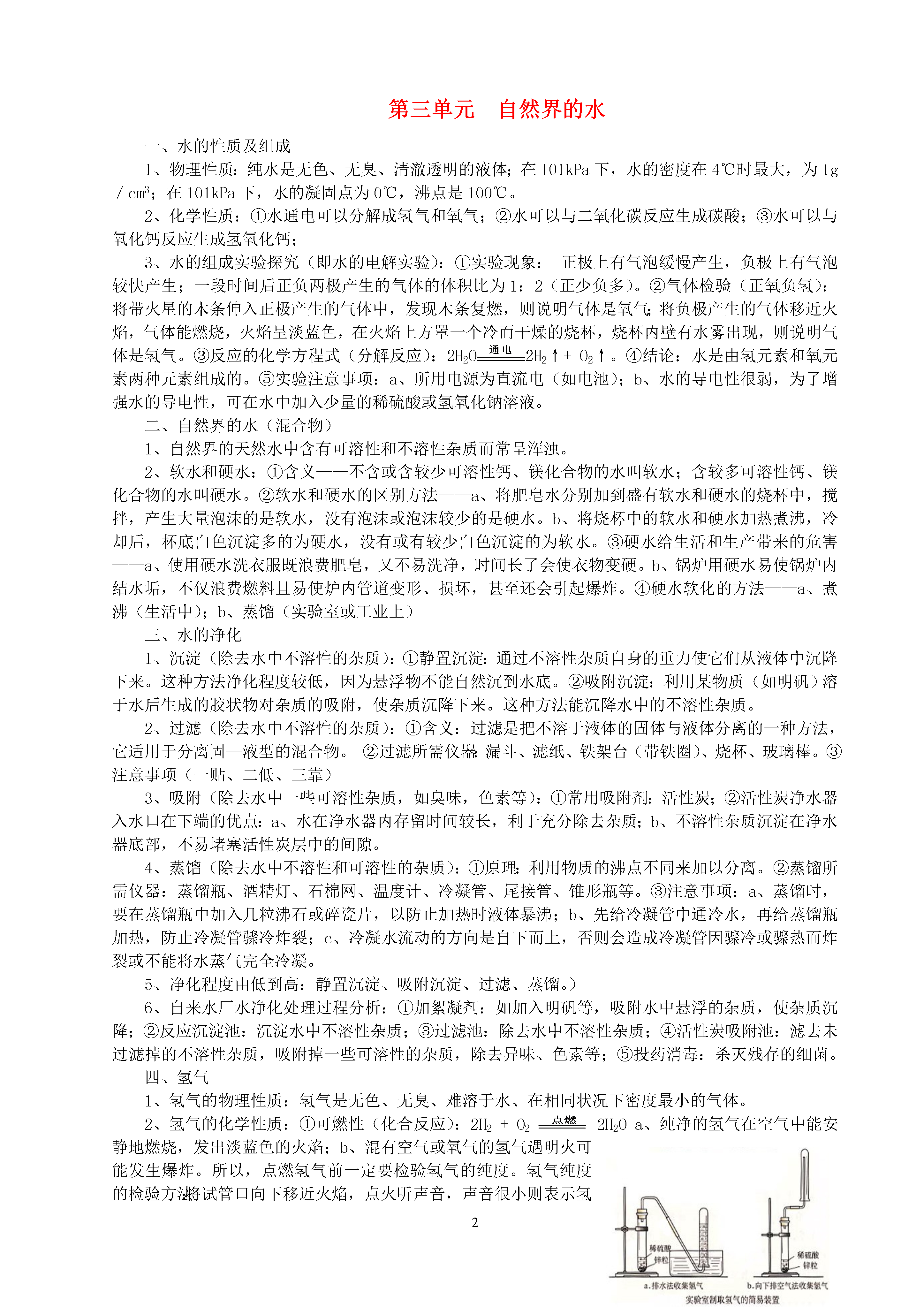 2第三单元自然界的水一、水的性质及组成1、物理性质:纯水是无色、无臭、清澈透明的液体;在101kPa下,水的密度在4℃时最大,为1g/cm3;在101kPa下,水的凝固点为0℃,沸点是100℃。2、化学性质:①水通电可以分解成氢气和氧气;②水可以与二氧化碳反应生成碳酸;③水可以与氧化钙反应生成氢氧化钙;3、水的组成实验探究(即水的电解实验):①实验现象:正极上有气泡缓慢产生,负极上有气泡较快产生;一段时间后正负两极产生的气体的体积比为1:2(正少负多)。②气体检验(正氧负氢):将带火星的木条伸入正极产生的气体中,发现木条复燃,则说明气体是氧气;将负极产生的气体移近火焰,气体能燃烧,火焰呈淡蓝色,在火焰上方罩一个冷而干燥的烧杯,烧杯内壁有水雾出现,则说明气体是氢气。③反应的化学方程式(分解反应):2H2O2H2↑+O2↑。④结论:水是由氢元素和氧元素两种元素组成的。⑤实验注意事项:a、所用电源为直流电(如电池);b、水的导电性很弱,为了增强水的导电性,可在水中加入少量的稀硫酸或氢氧化钠溶液。二、自然界的水(混合物)1、自然界的天然水中含有可溶性和不溶性杂质而常呈浑浊。2、软水和硬水:①含义——不含或含较少可溶性钙、镁化合物的水叫软水;含较多可溶性钙、镁化合物的水叫硬水。②软水和硬水的区别方法——a、将肥皂水分别加到盛有软水和硬水的烧杯中,搅拌,产生大量泡沫的是软水,没有泡沫或泡沫较少的是硬水。b、将烧杯中的软水和硬水加热煮沸,冷却后,杯底白色沉淀多的为硬水,没有或有较少白色沉淀的为软水。③硬水给生活和生产带来的危害——a、使用硬水洗衣服既浪费肥皂,又不易洗净,时间长了会使衣物变硬。b、锅炉用硬水易使锅炉内结水垢,不仅浪费燃料且易使炉内管道变形、损坏,甚至还会引起爆炸。④硬水软化的方法——a、煮沸(生活中);b、蒸馏(实验室或工业上)三、水的净化1、沉淀(除去水中不溶性的杂质):①静置沉淀:通过不溶性杂质自身的重力使它们从液体中沉降下来。这种方法净化程度较低,因为悬浮物不能自然沉到水底。②吸附沉淀:利用某物质(如明矾)溶于水后生成的胶状物对杂质的吸附,使杂质沉降下来。这种方法能沉降水中的不溶性杂质。2、过滤(除去水中不溶性的杂质):①含义:过滤是把不溶于液体的固体与液体分离的一种方法,它适用于分离固—液型的混合物。②过滤所需仪器:漏斗、滤纸、铁架台(带铁圈)、烧杯、玻璃棒。③注意事项(一贴、二低、三靠)3、吸附(除去水中一些可溶性杂质,如臭味,色素等):①常用吸附剂:活性炭;②活性炭净水器入水口在下端的优点:a、水在净水器内存留时间较长,利于充分除去杂质;b、不溶性杂质沉淀在净水器底部,不易堵塞活性炭层中的间隙。4、蒸馏(除去水中不溶性和可溶性的杂质):①原理:利用物质的沸点不同来加以分离。②蒸馏所需仪器:蒸馏瓶、酒精灯、石棉网、温度计、冷凝管、尾接管、锥形瓶等。③注意事项:a、蒸馏时,要在蒸馏瓶中加入几粒沸石或碎瓷片,以防止加热时液体暴沸;b、先给冷凝管中通冷水,再给蒸馏瓶加热,防止冷凝管骤冷炸裂;c、冷凝水流动的方向是自下而上,否则会造成冷凝管因骤冷或骤热而炸裂或不能将水蒸气完全冷凝。5、净化程度由低到高:静置沉淀、吸附沉淀、过滤、蒸馏。)6、自来水厂水净化处理过程分析:①加絮凝剂:如加入明矾等,吸附水中悬浮的杂质,使杂质沉降;②反应沉淀池:沉淀水中不溶性杂质;③过滤池:除去水中不溶性杂质;④活性炭吸附池:滤去未过滤掉的不溶性杂质,吸附掉一些可溶性的杂质,除去异味、色素等;⑤投药消毒:杀灭残存的细菌。四、氢气1、氢气的物理性质:氢气是无色、无臭、难溶于水、在相同状况下密度最小的气体。2、氢气的化学性质:①可燃性(化合反应):2H2+O22H2Oa、纯净的氢气在空气中能安静地燃烧,发出淡蓝色的火焰;b、混有空气或氧气的氢气遇明火可能发生爆炸。所以,点燃氢气前一定要检验氢气的纯度。氢气纯度的检验方法:将试管口向下移近火焰,点火听声音,声音很小则表示氢气较纯,若发出尖锐的爆鸣声则表明氢气不纯。②还原性:H2+CuOCu+H2O3、氢气的优点:放热多、来源广、无污染。4、氢能源目前难以推广的主要原因:①制备氢气耗能大,成本高;②贮存困难;③使用的安全性问题难以解决。5、氢气的实验室制法:①原理:Zn+H2SO4===ZnSO4+H2↑;②装置图:如右图所示。用实验室制取CO2的发生装置,可以采用向下排空气法或排水法收集。五、理论知识1、分子和原子分子原子相似点①质量和体积都很小;②粒子间有间隔;③总在不断地运动;④同种粒子,性质相同,不同种粒子,性质不同;⑤同种物质的粒子性质相同,不同种物质的粒子性质不同。联系①分子是由原子构成的,原子是构成分子的粒子;②分子和原子都可以直接