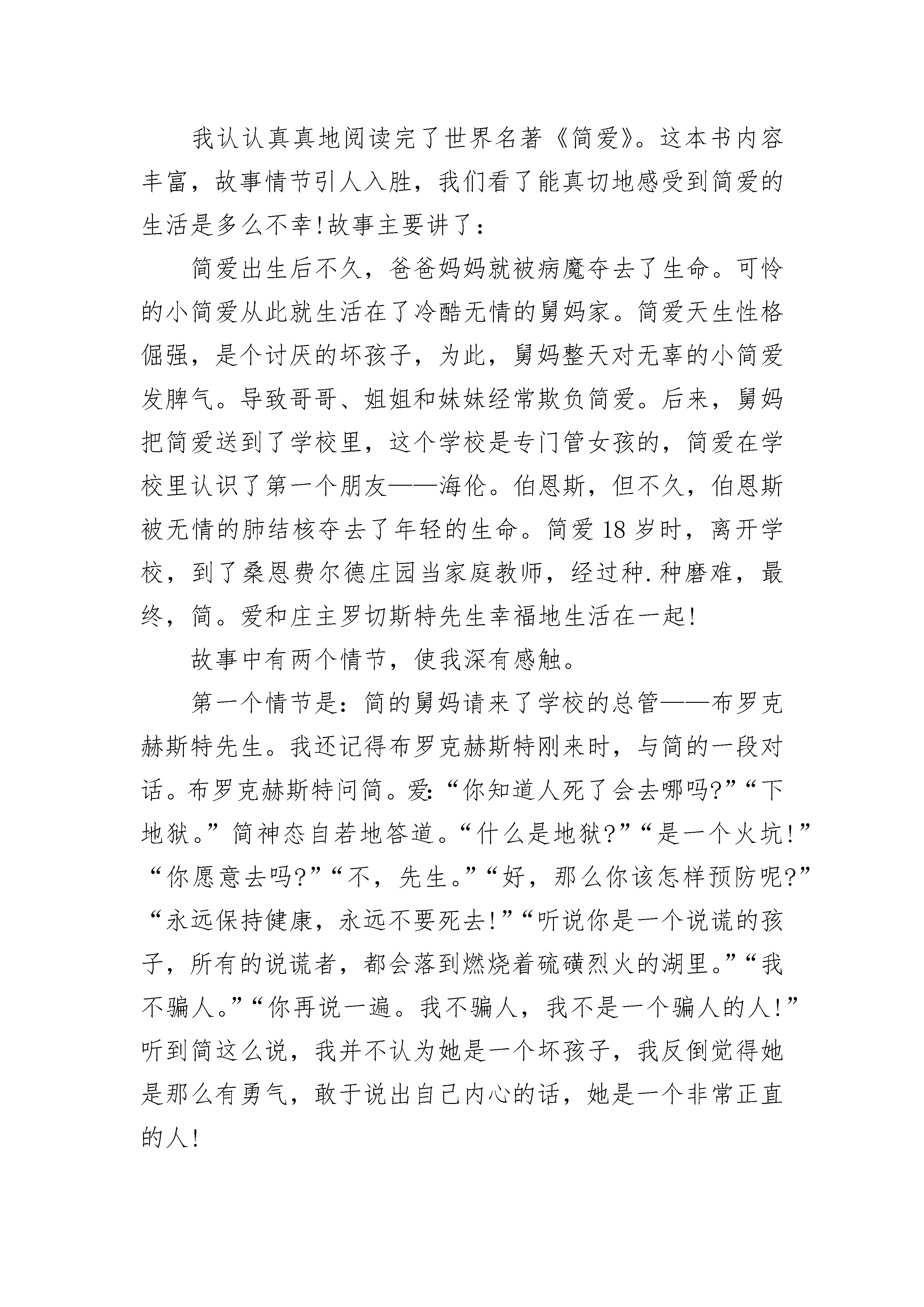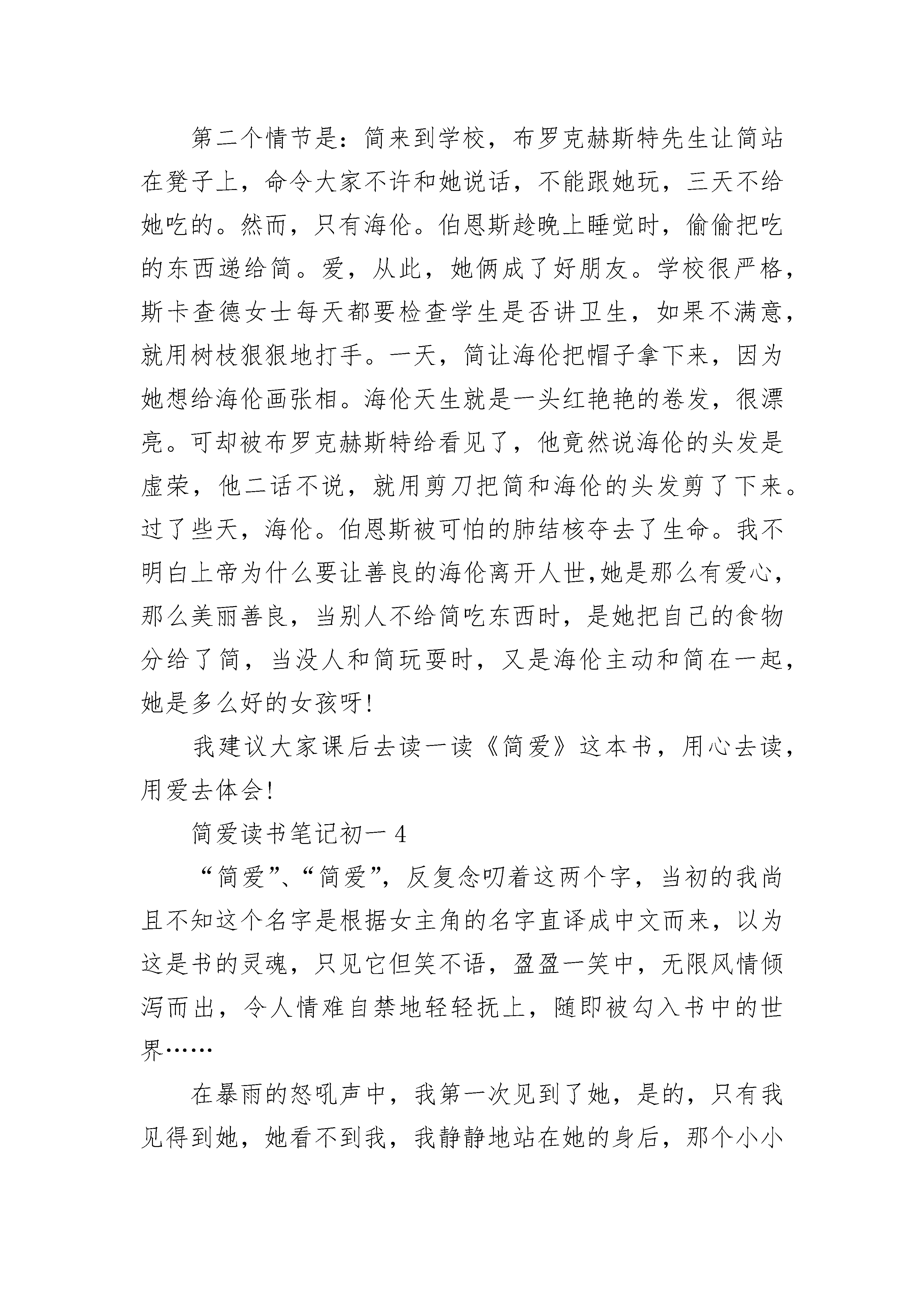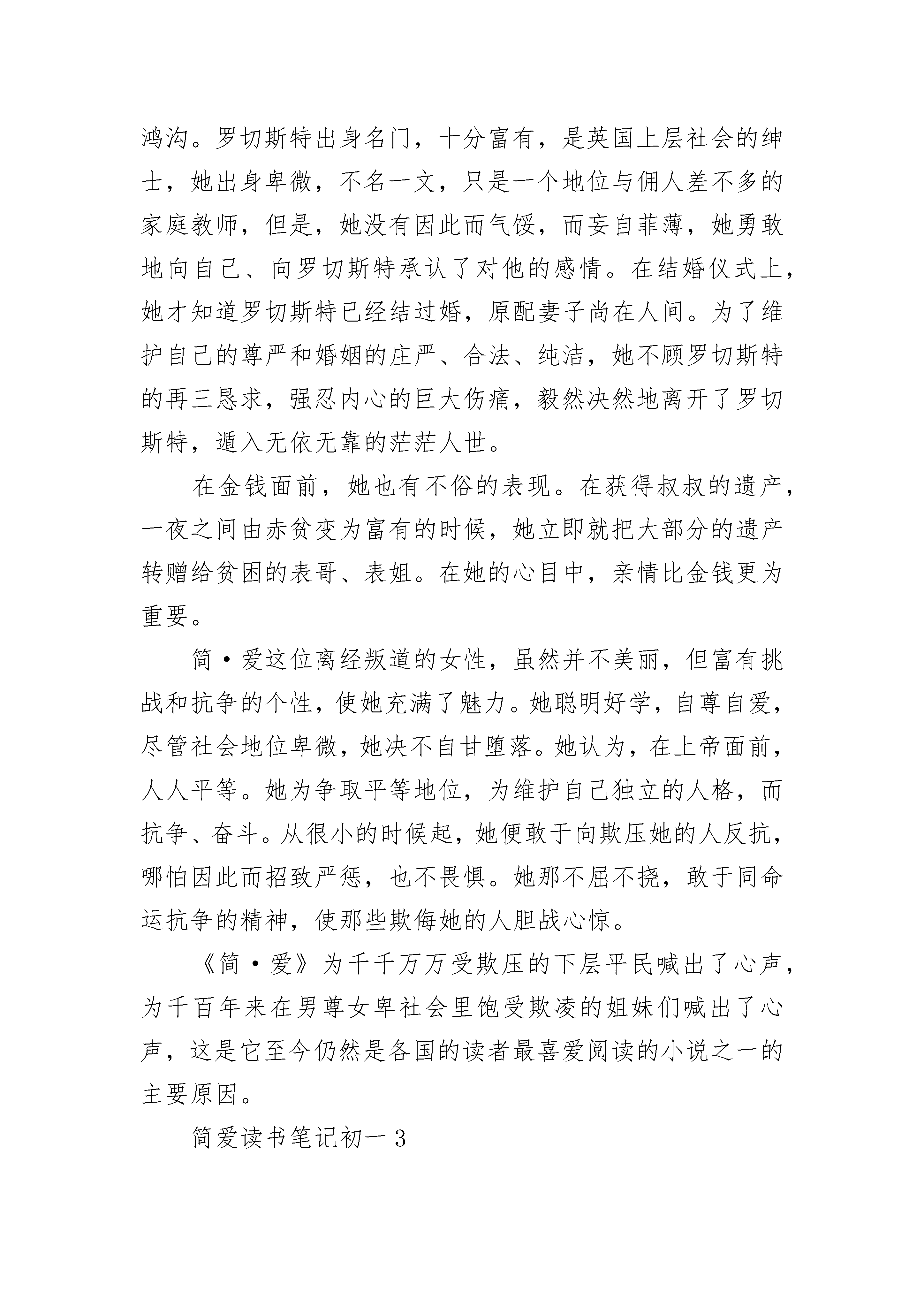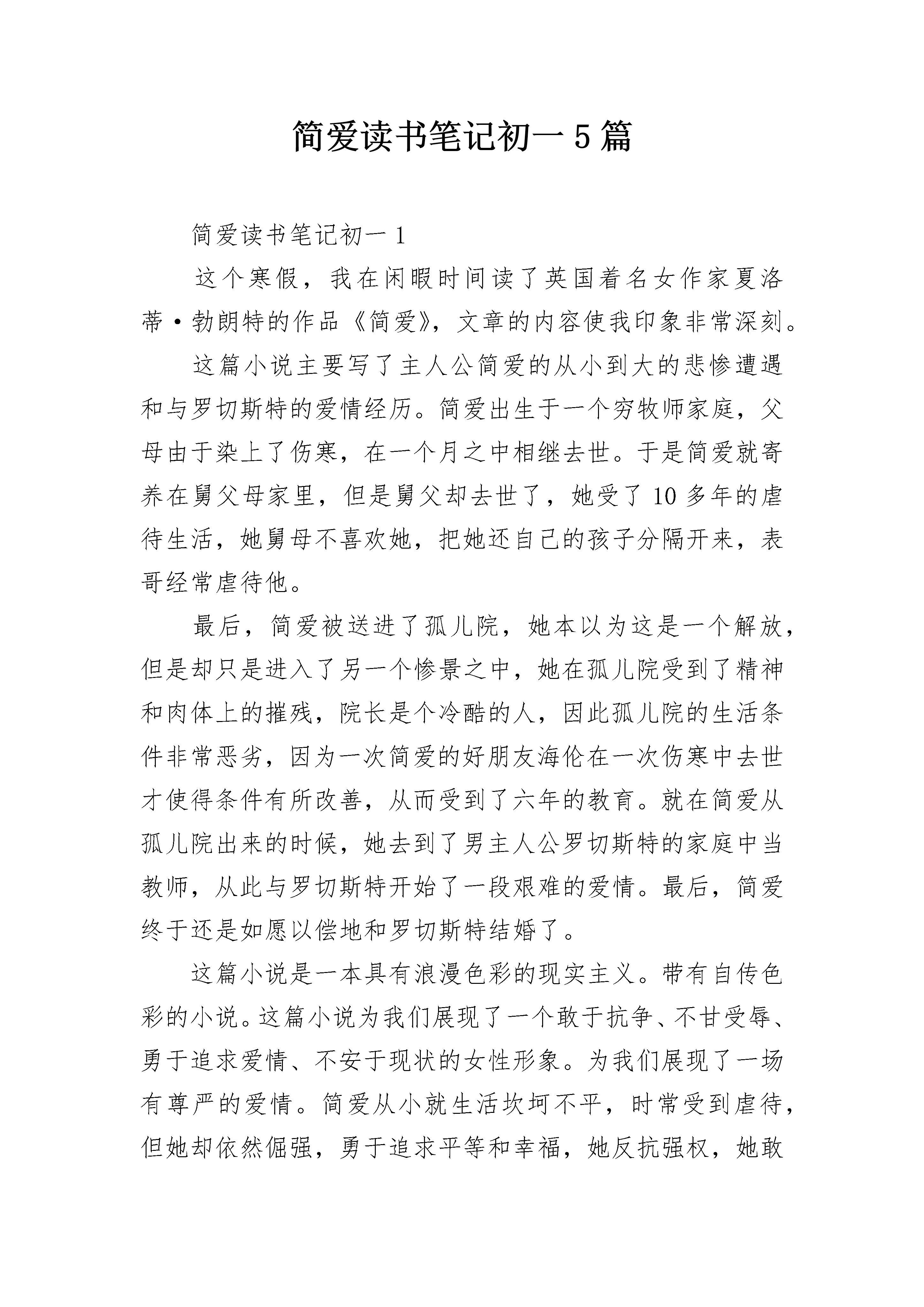 简爱读书笔记初一5篇简爱读书笔记初一1这个寒假,我在闲暇时间读了英国着名女作家夏洛蒂·勃朗特的作品《简爱》,文章的内容使我印象非常深刻。这篇小说主要写了主人公简爱的从小到大的悲惨遭遇和与罗切斯特的爱情经历。简爱出生于一个穷牧师家庭,父母由于染上了伤寒,在一个月之中相继去世。于是简爱就寄养在舅父母家里,但是舅父却去世了,她受了10多年的虐待生活,她舅母不喜欢她,把她还自己的孩子分隔开来,表哥经常虐待他。最后,简爱被送进了孤儿院,她本以为这是一个解放,但是却只是进入了另一个惨景之中,她在孤儿院受到了精神和肉体上的摧残,院长是个冷酷的人,因此孤儿院的生活条件非常恶劣,因为一次简爱的好朋友海伦在一次伤寒中去世才使得条件有所改善,从而受到了六年的教育。就在简爱从孤儿院出来的时候,她去到了男主人公罗切斯特的家庭中当教师,从此与罗切斯特开始了一段艰难的爱情。最后,简爱终于还是如愿以偿地和罗切斯特结婚了。这篇小说是一本具有浪漫色彩的现实主义。带有自传色彩的小说。这篇小说为我们展现了一个敢于抗争、不甘受辱、勇于追求爱情、不安于现状的女性形象。为我们展现了一场有尊严的爱情。简爱从小就生活坎坷不平,时常受到虐待,但她却依然倔强,勇于追求平等和幸福,她反抗强权,她敢于反抗她的舅母。敢于反抗摧残她们的教师和校长。呈现出了一个勇敢的女性伟大形象。而最终她成功了,获得了幸福。她那无辜的生活遭遇,更反映出了大多数英国下层人民的生活写照。这是一场有尊严的爱情。我觉得,简爱最后成为了一个幸福的人,因为她终于能和她深爱的人在一起。我觉得,这种淳朴单纯只有深深的爱不掺杂丝毫的爱情,才是最完美的爱情。读完简爱这一篇小说,作者的心理描写和简爱勇于追求真爱的形象刻画,都使我印象非常深刻。简爱读书笔记初一2《简·爱》一反传统小说中以温柔美丽的女子做主角、以浪漫动人的爱情传奇为故事的旧格式,写出了一个出身低微、相貌平平的女子与不公平的命运抗争的故事。主人公简·爱是不幸的,她自幼失去父母,唯一爱她并领养她的舅舅又过早地弃她而逝。她初涉人世,便过着寄人篱下、任人驱使的悲惨生活,饱尝了人情冷暖、世态炎凉的痛苦。为了逃避严酷的现实,她把自己的感情寄托在她酷爱的书和大自然上。书丰富了她的感情世界,陶冶了她的性情,苦难又磨炼了她的意志,使她养成了坚毅倔强、外柔内刚的性格。小说中,简·爱与桑菲尔德府的男主人罗切斯特的爱情波折,使简·爱的个性得到了充分的体现。当简·爱发现自己爱上了罗切斯特时,她很清楚地意识到,横在他们之间的鸿沟。罗切斯特出身名门,十分富有,是英国上层社会的绅士,她出身卑微,不名一文,只是一个地位与佣人差不多的家庭教师,但是,她没有因此而气馁,而妄自菲薄,她勇敢地向自己、向罗切斯特承认了对他的感情。在结婚仪式上,她才知道罗切斯特已经结过婚,原配妻子尚在人间。为了维护自己的尊严和婚姻的庄严、合法、纯洁,她不顾罗切斯特的再三恳求,强忍内心的巨大伤痛,毅然决然地离开了罗切斯特,遁入无依无靠的茫茫人世。在金钱面前,她也有不俗的表现。在获得叔叔的遗产,一夜之间由赤贫变为富有的时候,她立即就把大部分的遗产转赠给贫困的表哥、表姐。在她的心目中,亲情比金钱更为重要。简·爱这位离经叛道的女性,虽然并不美丽,但富有挑战和抗争的个性,使她充满了魅力。她聪明好学,自尊自爱,尽管社会地位卑微,她决不自甘堕落。她认为,在上帝面前,人人平等。她为争取平等地位,为维护自己独立的人格,而抗争、奋斗。从很小的时候起,她便敢于向欺压她的人反抗,哪怕因此而招致严惩,也不畏惧。她那不屈不挠,敢于同命运抗争的精神,使那些欺侮她的人胆战心惊。《简·爱》为千千万万受欺压的下层平民喊出了心声,为千百年来在男尊女卑社会里饱受欺凌的姐妹们喊出了心声,这是它至今仍然是各国的读者最喜爱阅读的小说之一的主要原因。简爱读书笔记初一3我认认真真地阅读完了世界名著《简爱》。这本书内容丰富,故事情节引人入胜,我们看了能真切地感受到简爱的生活是多么不幸!故事主要讲了:简爱出生后不久,爸爸妈妈就被病魔夺去了生命。可怜的小简爱从此就生活在了冷酷无情的舅妈家。简爱天生性格倔强,是个讨厌的坏孩子,为此,舅妈整天对无辜的小简爱发脾气。导致哥哥、姐姐和妹妹经常欺负简爱。后来,舅妈把简爱送到了学校里,这个学校是专门管女孩的,简爱在学校里认识了第一个朋友——海伦。伯恩斯,但不久,伯恩斯被无情的肺结核夺去了年轻的生命。简爱18岁时,离开学校,到了桑恩费尔德庄园当家庭教师,经过种.种磨难,最终,简。爱和庄主罗切斯特先生幸福地生活在一起!故事中有两个情节,使我深有感触。第一个情节是:简的舅妈请来了学校的总管——布罗克赫斯特先生。我还记得布罗克赫斯特刚来时,与简的一段对话。布罗克赫斯特问简。爱:“你知道人死了会去哪吗?”“下地狱。”简神态自若地答道。“什么是地狱?