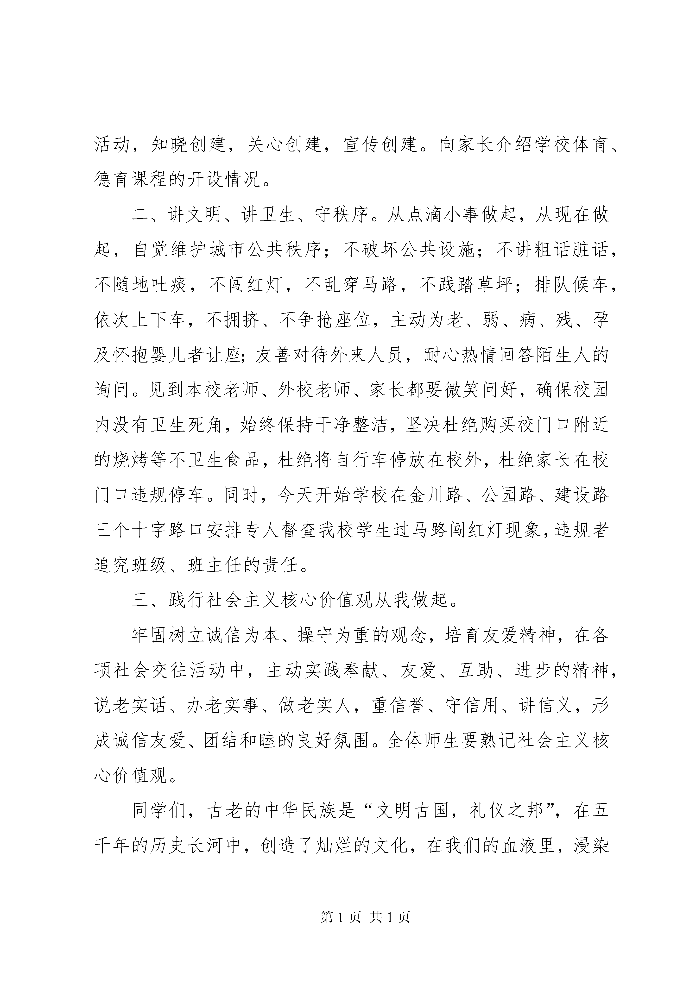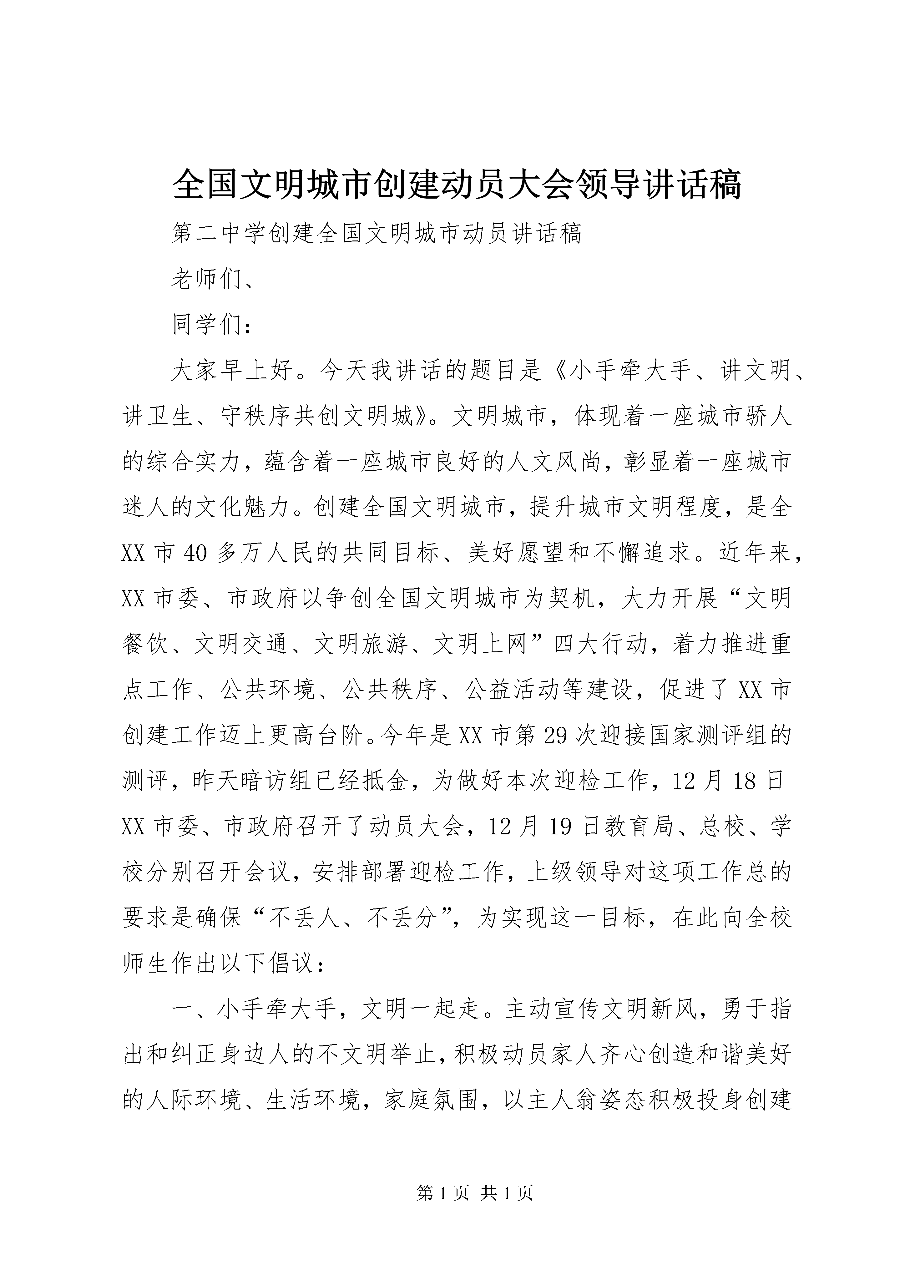 全国文明城市创建动员大会领导讲话稿第二中学创建全国文明城市动员讲话稿老师们、同学们:大家早上好。今天我讲话的题目是《小手牵大手、讲文明、讲卫生、守秩序共创文明城》。文明城市,体现着一座城市骄人的综合实力,蕴含着一座城市良好的人文风尚,彰显着一座城市迷人的文化魅力。创建全国文明城市,提升城市文明程度,是全XX市40多万人民的共同目标、美好愿望和不懈追求。近年来,XX市委、市政府以争创全国文明城市为契机,大力开展“文明餐饮、文明交通、文明旅游、文明上网”四大行动,着力推进重点工作、公共环境、公共秩序、公益活动等建设,促进了XX市创建工作迈上更高台阶。今年是XX市第29次迎接国家测评组的测评,昨天暗访组已经抵金,为做好本次迎检工作,12月18日XX市委、市政府召开了动员大会,12月19日教育局、总校、学校分别召开会议,安排部署迎检工作,上级领导对这项工作总的要求是确保“不丢人、不丢分”,为实现这一目标,在此向全校师生作出以下倡议:一、小手牵大手,文明一起走。主动宣传文明新风,勇于指出和纠正身边人的不文明举止,积极动员家人齐心创造和谐美好的人际环境、生活环境,家庭氛围,以主人翁姿态积极投身创建活动,知晓创建,关心创建,宣传创建。向家长介绍学校体育、德育课程的开设情况。二、讲文明、讲卫生、守秩序。从点滴小事做起,从现在做起,自觉维护城市公共秩序;不破坏公共设施;不讲粗话脏话,不随地吐痰,不闯红灯,不乱穿马路,不践踏草坪;排队候车,依次上下车,不拥挤、不争抢座位,主动为老、弱、病、残、孕及怀抱婴儿者让座;友善对待外来人员,耐心热情回答陌生人的询问。见到本校老师、外校老师、家长都要微笑问好,确保校园内没有卫生死角,始终保持干净整洁,坚决杜绝购买校门口附近的烧烤等不卫生食品,杜绝将自行车停放在校外,杜绝家长在校门口违规停车。同时,今天开始学校在金川路、公园路、建设路三个十字路口安排专人督查我校学生过马路闯红灯现象,违规者追究班级、班主任的责任。三、践行社会主义核心价值观从我做起。牢固树立诚信为本、操守为重的观念,培育友爱精神,在各项社会交往活动中,主动实践奉献、友爱、互助、进步的精神,说老实话、办老实事、做老实人,重信誉、守信用、讲信义,形成诚信友爱、团结和睦的良好氛围。全体师生要熟记社会主义核心价值观。同学们,古老的中华民族是“文明古国,礼仪之邦”,在五千年的历史长河中,创造了灿烂的文化,在我们的血液里,浸染着的、流敞着的是“讲文明,懂礼仪”的几千年文明的民族精华。在经济高速发展的今天,在价值观多元发展的今天,在个性凸现的今天,我们更没有理由摒弃千年的文明传统。创建文明城市,需要全社会共同努力,让我们积极投身到创建这场创建全国文明城市的攻坚战中来。