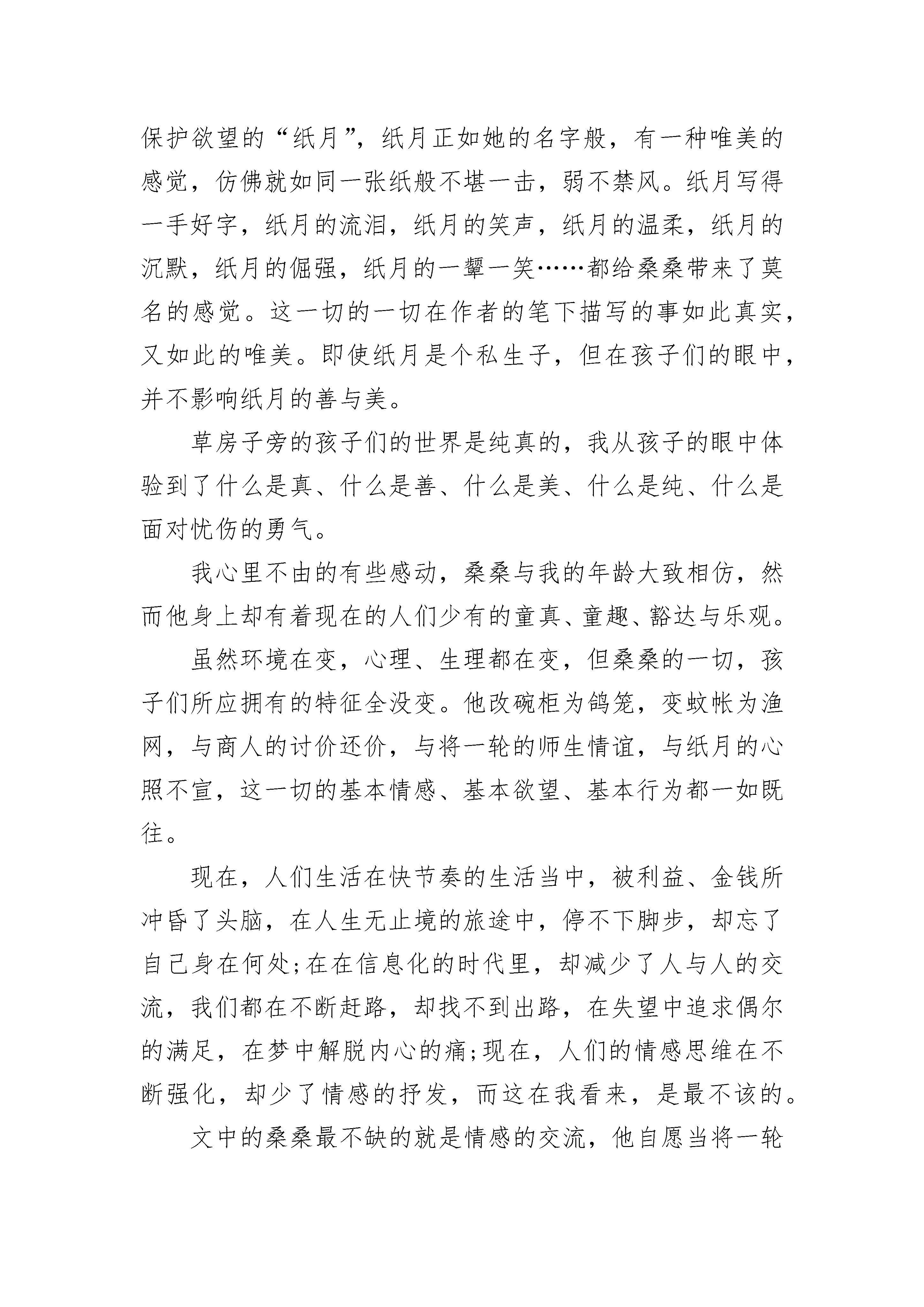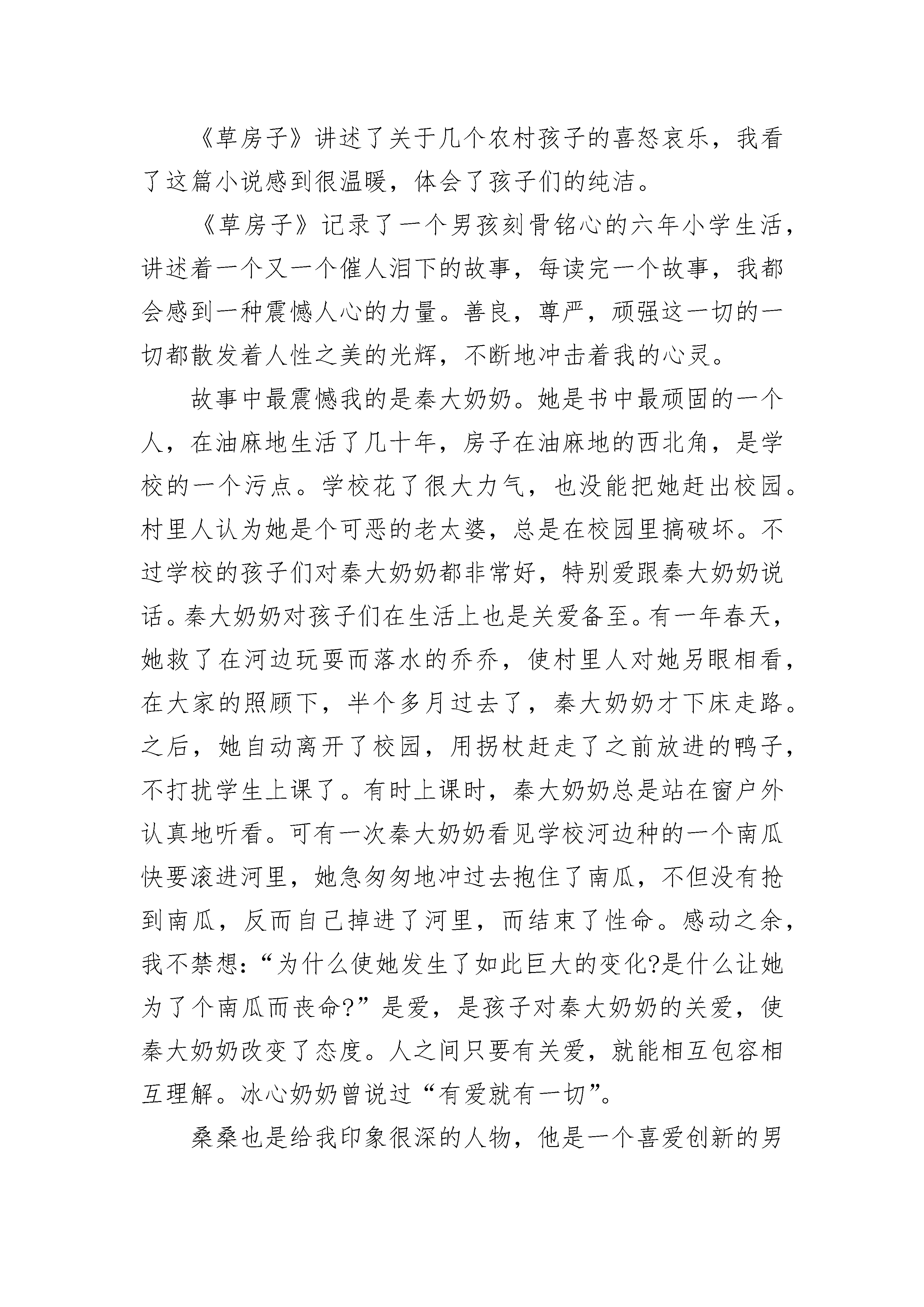 2023草房子读书笔记初中_草房子暑假个人读书感悟更多初中读书笔记相关内容推荐↓↓↓初中朝花夕拾读书笔记暖爱的读书笔记初中生初中生读书笔记家初中生读书笔记小王子彩虹鸽读书笔记初中生草房子读书笔记初中1《草房子》的作者曹文轩,以细腻的笔触描绘了乡间最美好的回忆。这本书记录了桑桑小学六年生活终生难忘的回忆。漂亮的草房子,独特香味的苦艾,平静的溪流,一望无际的芦苇荡,这就是油麻地,一个美丽又热闹的小村庄,在这儿生活着一群孩子,他们都有各自不同的特点,如勇敢、淘气的男孩儿桑桑,文弱、聪慧的纸月,不被困难屈服的杜小康,有强烈自尊心的秃鹤……文中令我印象最深的就是秦大奶奶。她,是整本书里最固执的人,却让我怜悯,在当地人眼中,她是一个可恶的老太婆,但在一个鸟语花香的春天,她冒着生命危险在大河中把乔乔救上岸来,在一场大病里,人们细心的照顾她,她发生了翻天覆地的变化,在这章故事结尾,她,居然区区为了一个普通的南瓜,而丢掉了性命,为她的人生画上了一个圆满的句号。我闭上眼,开始静静地思考,是什么改变了她,是爱啊!是油麻地人们无微不至的照顾感动了她,让她的一生发生了如此大的变化。桑桑是一个调皮,聪明的小男孩,他是这本书的主人公,他总是做出一些莫明其妙的事儿,比如用自家的碗柜给鸽子做家,拆了蚊帐做鱼网,在烈日当空的夏天穿爸爸的棉袄……每次犯错误,总少不了妈妈对他的训斥,而桑桑呢,却把妈妈的教诲当成耳边风,左耳朵进,右耳朵出,让妈妈对他无可奈何,让我也对他哭笑不得。杜小康曾经是油麻地最富有的一户人家,居住在高大阔气的红门里,但因为一场突如其来的意外,他们家在一夜之间变得一贫如洗,成绩名列前茅的杜小康不得不弃学回家,和父亲一起放鸭子,挫折一次次在杜小康家降临,一直泡在甜水中的杜小康没有放弃,挑起了家业这一沉重的担子,不顾面子,在校门口摆起了小摊,他的精神让我敬仰。《草房子》,这部小说让给我最大的启发是:人生处处充满希望,只要你以乐观的态度积极地面对一切,奇迹一定会出现!那就让这本书一直藏在我们的心里,永远,永远……草房子读书笔记初中2《草房子》讲述了关于几个农村孩子的喜怒哀乐,我看了这篇小说感到很温暖,体会了孩子们的纯洁。《草房子》记录了一个男孩刻骨铭心的六年小学生活,讲述着一个又一个催人泪下的故事,每读完一个故事,我都会感到一种震憾人心的力量。善良,尊严,顽强这一切的一切都散发着人性之美的光辉,不断地冲击着我的心灵。故事中最震憾我的是秦大奶奶。她是书中最顽固的一个人,在油麻地生活了几十年,房子在油麻地的西北角,是学校的一个污点。学校花了很大力气,也没能把她赶出校园。村里人认为她是个可恶的老太婆,总是在校园里搞破坏。不过学校的孩子们对秦大奶奶都非常好,特别爱跟秦大奶奶说话。秦大奶奶对孩子们在生活上也是关爱备至。有一年春天,她救了在河边玩耍而落水的乔乔,使村里人对她另眼相看,在大家的照顾下,半个多月过去了,秦大奶奶才下床走路。之后,她自动离开了校园,用拐杖赶走了之前放进的鸭子,不打扰学生上课了。有时上课时,秦大奶奶总是站在窗户外认真地听看。可有一次秦大奶奶看见学校河边种的一个南瓜快要滚进河里,她急匆匆地冲过去抱住了南瓜,不但没有抢到南瓜,反而自己掉进了河里,而结束了性命。感动之余,我不禁想:“为什么使她发生了如此巨大的变化?是什么让她为了个南瓜而丧命?”是爱,是孩子对秦大奶奶的关爱,使秦大奶奶改变了态度。人之间只要有关爱,就能相互包容相互理解。冰心奶奶曾说过“有爱就有一切”。桑桑也是给我印象很深的人物,他是一个喜爱创新的男孩,又非常淘气。他非常喜欢鸽子,一次为了使家里养的鸽子住得更好,用碗柜和地板做了一个鸽笼,桑桑的妈妈看到了残废的碗柜成了鸽子的家,狠狠地揍了桑桑一顿。还有一次,桑桑因为想捕鱼,但又没网,灵机一动便剪下了蚊帐,用蚊帐上的网用来捕鱼。这是一个朴实的乡村男孩的生活,充满童真,别有风趣。生活就应该需要些活力,创新就是能给生活带来精彩与惊喜。《草房子》一书中的点点滴滴,使我受益匪浅,让我深深体会到了生活中的爱,生活中的真,生活中的美。草房子读书笔记初中3合上《草房子》,站在家中的阳台上仰望星空,我又有一种潸然泪下的感觉。《草房子》是曹文轩的一部少年长篇小说。作品写了主人公桑桑刻骨铭心的六年小学生活。六年中,他亲自目睹或直接参与了一连串看似寻常但又催人泪下的故事:少男少女之间毫无瑕疵的纯情;不幸少年与厄运的斗争;垂暮老人的人格光彩;大人间扑朔迷离且又充满诗情画意的情感纠葛……这一切清楚却又朦胧的展现在桑桑的世界里。这六年,是他接受人生教育的六年。书中的故事我们未必经历过,但无疑我们都能感受到,那种那种发生在少男少女之间纯真的爱意,书中充满了悲悯的情怀,情节曲折,每个故事都在震撼我们的内心。全书中,最能使我感到感动的,还是第二章:纸月。作者在本章中不