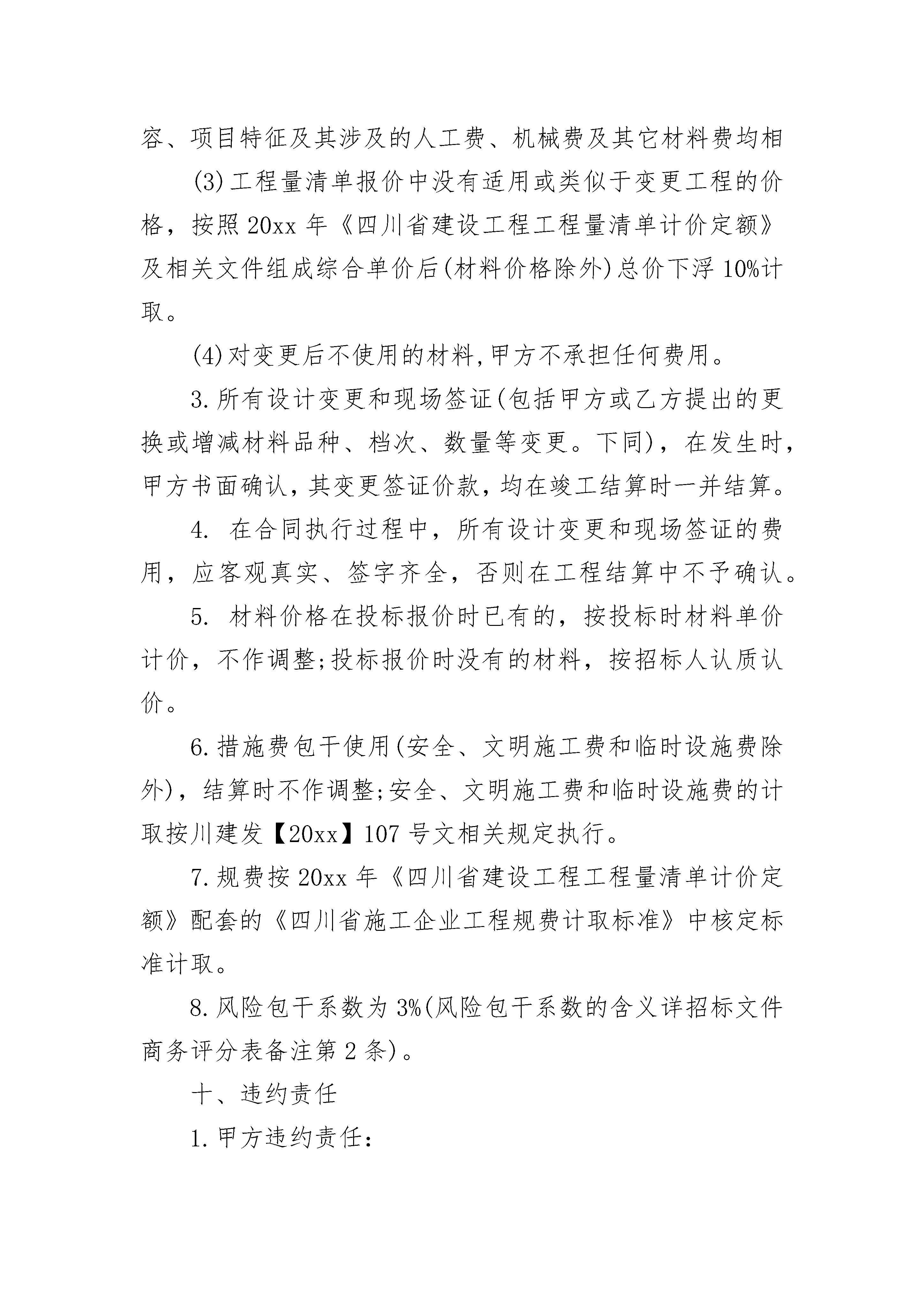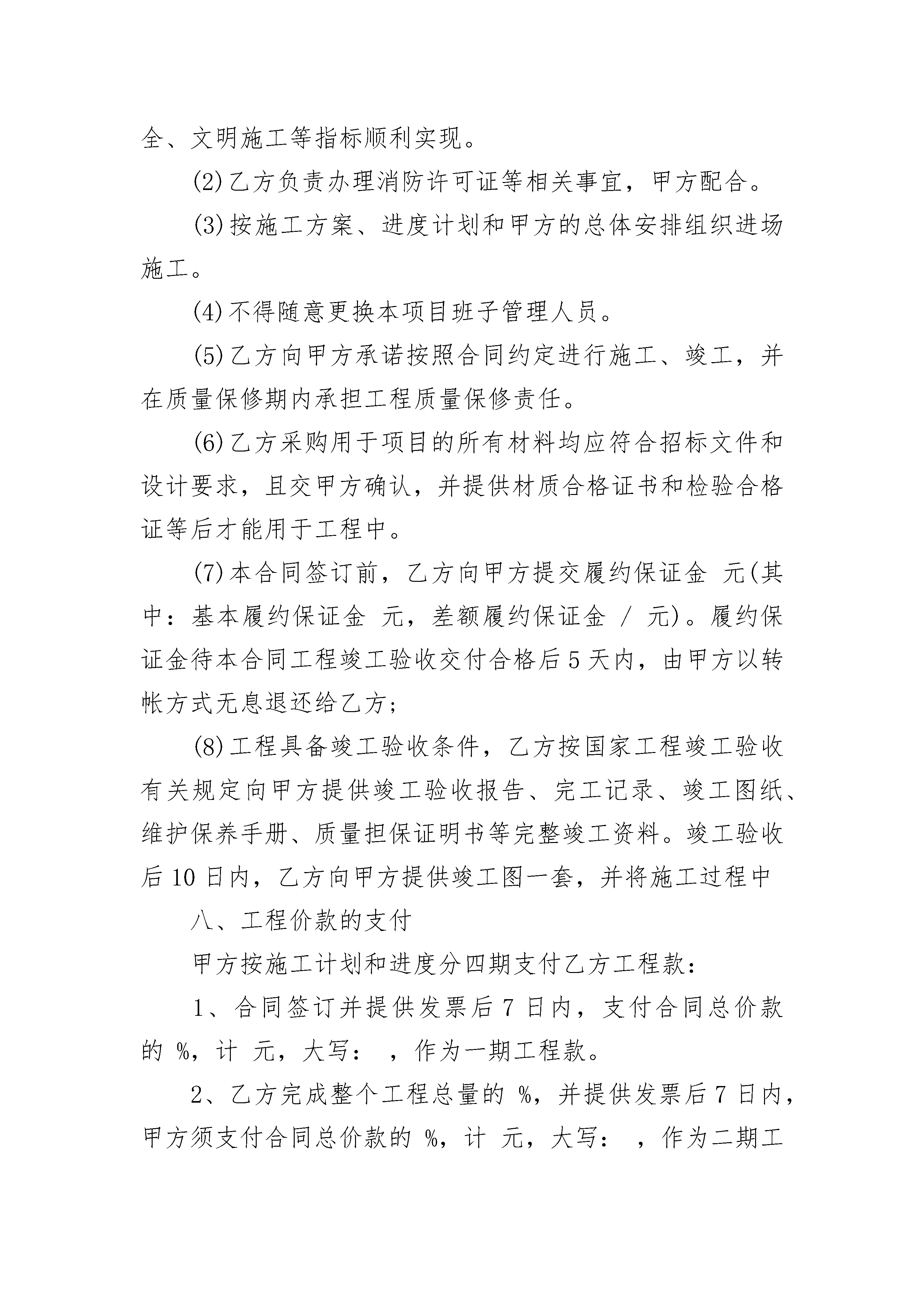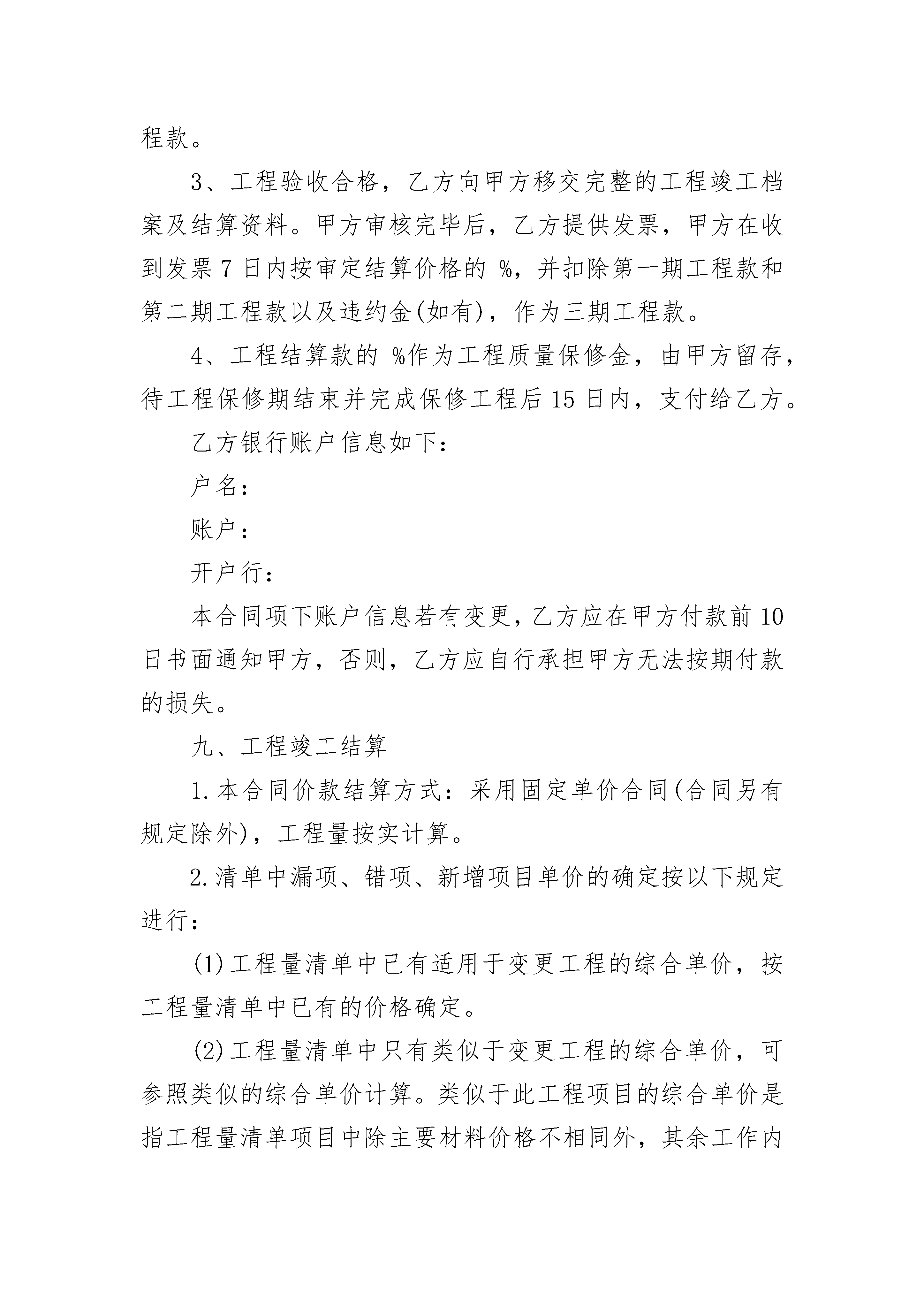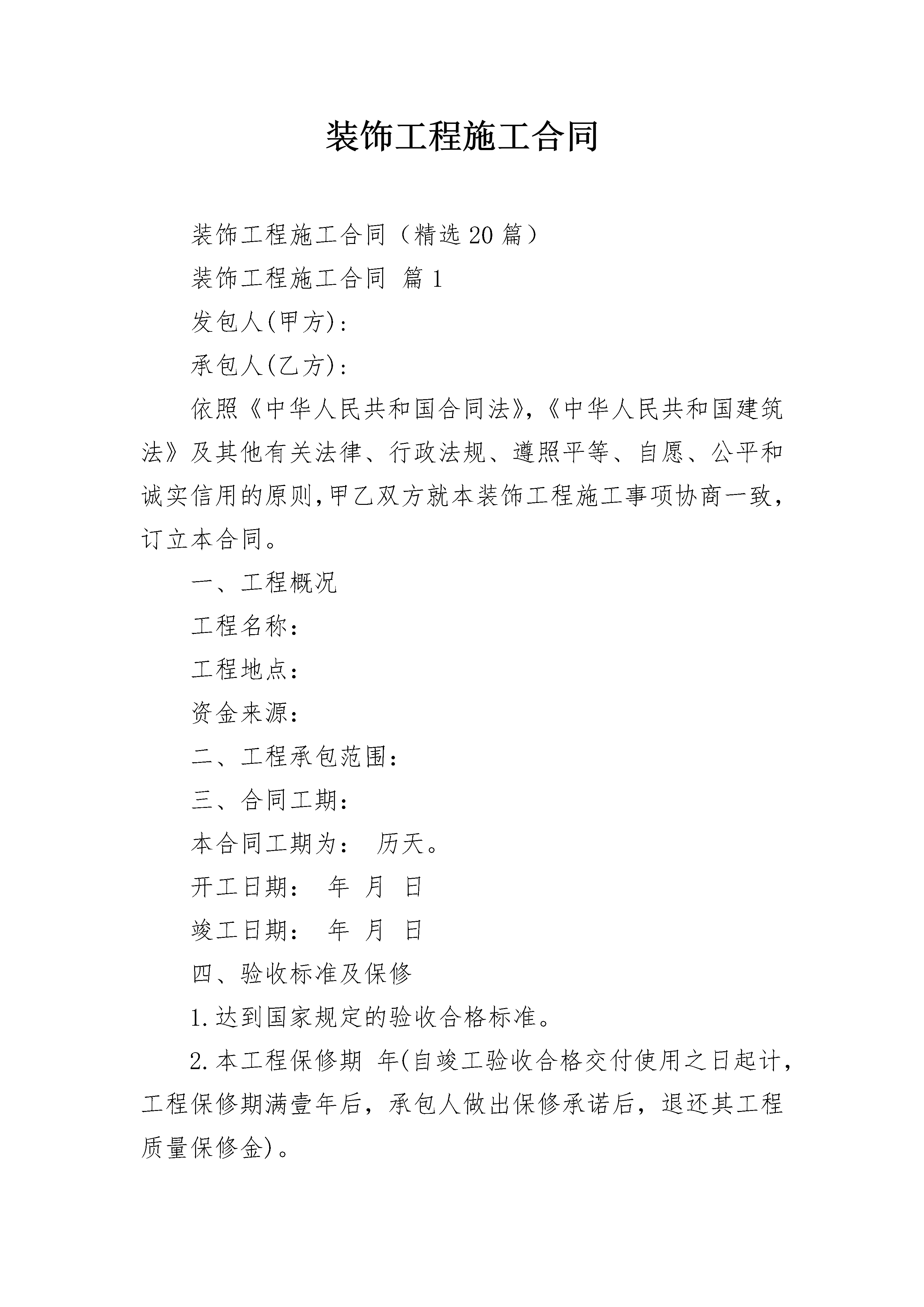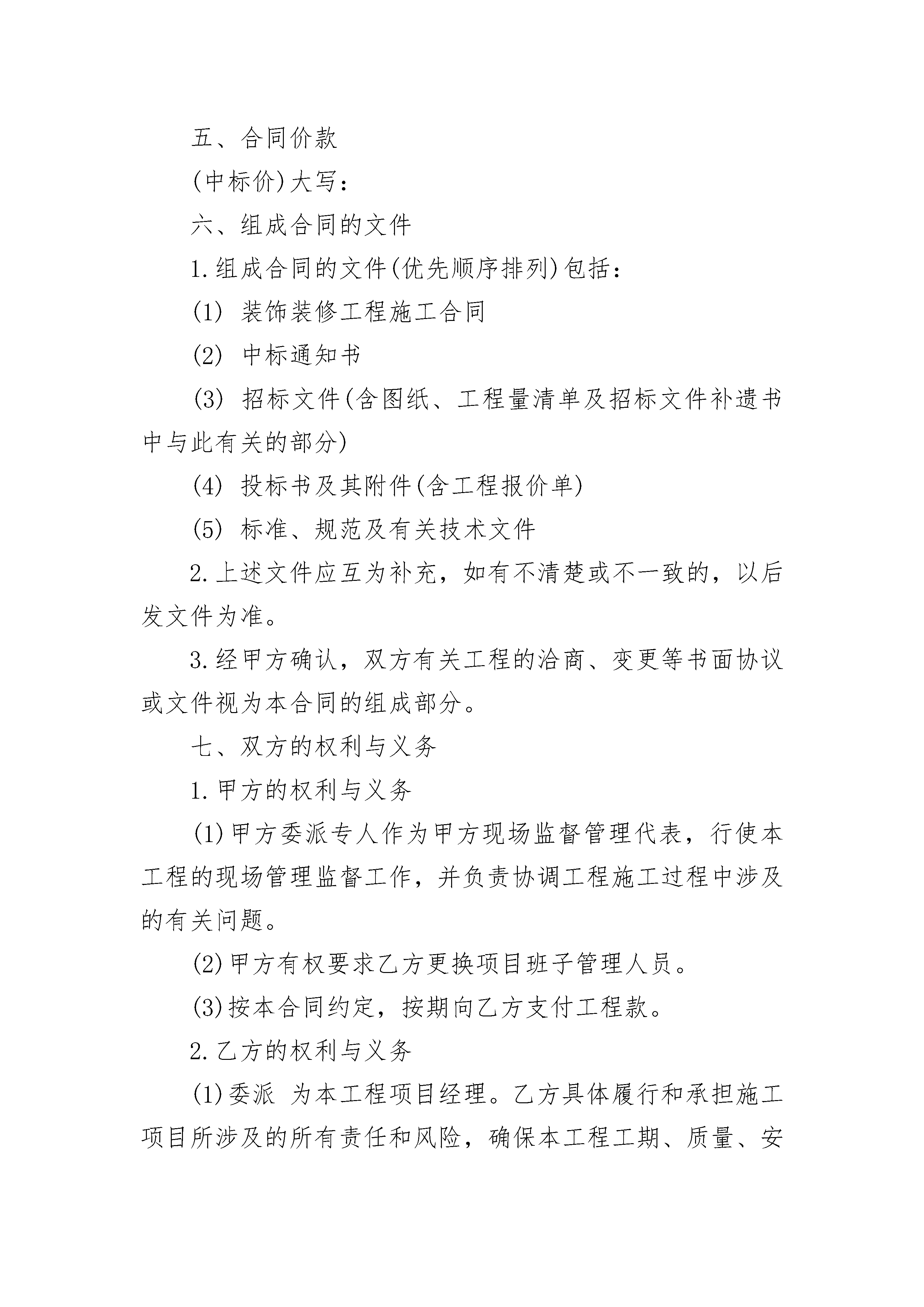 装饰工程施工合同装饰工程施工合同(精选20篇)装饰工程施工合同篇1发包人(甲方):承包人(乙方):依照《中华人民共和国合同法》,《中华人民共和国建筑法》及其他有关法律、行政法规、遵照平等、自愿、公平和诚实信用的原则,甲乙双方就本装饰工程施工事项协商一致,订立本合同。一、工程概况工程名称:工程地点:资金来源:二、工程承包范围:三、合同工期:本合同工期为:历天。开工日期:年月日竣工日期:年月日四、验收标准及保修1.达到国家规定的验收合格标准。2.本工程保修期年(自竣工验收合格交付使用之日起计,工程保修期满壹年后,承包人做出保修承诺后,退还其工程质量保修金)。五、合同价款(中标价)大写:六、组成合同的文件1.组成合同的文件(优先顺序排列)包括:(1)装饰装修工程施工合同(2)中标通知书(3)招标文件(含图纸、工程量清单及招标文件补遗书中与此有关的部分)(4)投标书及其附件(含工程报价单)(5)标准、规范及有关技术文件2.上述文件应互为补充,如有不清楚或不一致的,以后发文件为准。3.经甲方确认,双方有关工程的洽商、变更等书面协议或文件视为本合同的组成部分。七、双方的权利与义务1.甲方的权利与义务(1)甲方委派专人作为甲方现场监督管理代表,行使本工程的现场管理监督工作,并负责协调工程施工过程中涉及的有关问题。(2)甲方有权要求乙方更换项目班子管理人员。(3)按本合同约定,按期向乙方支付工程款。2.乙方的权利与义务(1)委派为本工程项目经理。乙方具体履行和承担施工项目所涉及的所有责任和风险,确保本工程工期、质量、安全、文明施工等指标顺利实现。(2)乙方负责办理消防许可证等相关事宜,甲方配合。(3)按施工方案、进度计划和甲方的总体安排组织进场施工。(4)不得随意更换本项目班子管理人员。(5)乙方向甲方承诺按照合同约定进行施工、竣工,并在质量保修期内承担工程质量保修责任。(6)乙方采购用于项目的所有材料均应符合招标文件和设计要求,且交甲方确认,并提供材质合格证书和检验合格证等后才能用于工程中。(7)本合同签订前,乙方向甲方提交履约保证金元(其中:基本履约保证金元,差额履约保证金/元)。履约保证金待本合同工程竣工验收交付合格后5天内,由甲方以转帐方式无息退还给乙方;(8)工程具备竣工验收条件,乙方按国家工程竣工验收有关规定向甲方提供竣工验收报告、完工记录、竣工图纸、维护保养手册、质量担保证明书等完整竣工资料。竣工验收后10日内,乙方向甲方提供竣工图一套,并将施工过程中八、工程价款的支付甲方按施工计划和进度分四期支付乙方工程款:1、合同签订并提供发票后7日内,支付合同总价款的%,计元,大写:,作为一期工程款。2、乙方完成整个工程总量的%,并提供发票后7日内,甲方须支付合同总价款的%,计元,大写:,作为二期工程款。3、工程验收合格,乙方向甲方移交完整的工程竣工档案及结算资料。甲方审核完毕后,乙方提供发票,甲方在收到发票7日内按审定结算价格的%,并扣除第一期工程款和第二期工程款以及违约金(如有),作为三期工程款。4、工程结算款的%作为工程质量保修金,由甲方留存,待工程保修期结束并完成保修工程后15日内,支付给乙方。乙方银行账户信息如下:户名:账户:开户行:本合同项下账户信息若有变更,乙方应在甲方付款前10日书面通知甲方,否则,乙方应自行承担甲方无法按期付款的损失。九、工程竣工结算1.本合同价款结算方式:采用固定单价合同(合同另有规定除外),工程量按实计算。2.清单中漏项、错项、新增项目单价的确定按以下规定进行:(1)工程量清单中已有适用于变更工程的综合单价,按工程量清单中已有的价格确定。(2)工程量清单中只有类似于变更工程的综合单价,可参照类似的综合单价计算。类似于此工程项目的综合单价是指工程量清单项目中除主要材料价格不相同外,其余工作内容、项目特征及其涉及的人工费、机械费及其它材料费均相(3)工程量清单报价中没有适用或类似于变更工程的价格,按照20xx年《四川省建设工程工程量清单计价定额》及相关文件组成综合单价后(材料价格除外)总价下浮10%计取。(4)对变更后不使用的材料,甲方不承担任何费用。3.所有设计变更和现场签证(包括甲方或乙方提出的更换或增减材料品种、档次、数量等变更。下同),在发生时,甲方书面确认,其变更签证价款,均在竣工结算时一并结算。4.在合同执行过程中,所有设计变更和现场签证的费用,应客观真实、签字齐全,否则在工程结算中不予确认。5.材料价格在投标报价时已有的,按投标时材料单价计价,不作调整;投标报价时没有的材料,按招标人认质认价。6.措施费包干使用(安全、文明施工费和临时设施费除外),结算时不作调整;安全、文明施工费和临时设施费的计取按川建发【20xx】107号文相关规定执行。7.规费按20xx年《四川省建设工程工程量清单计
