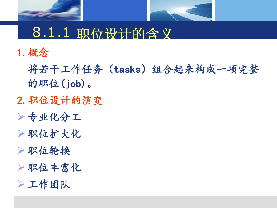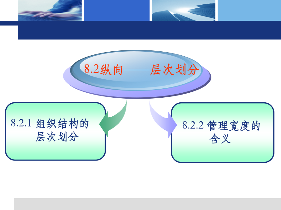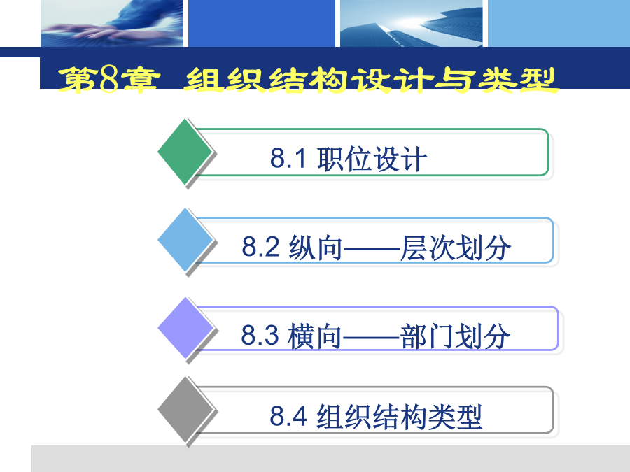 第8章组织结构设计与类型8.1.1职位设计的含义8.1.2职位设计的要求8.2.2组织结构的层次划分8.2.2管理宽度的含义8.2.2管理宽度的含义8.3.1部门的含义8.3.2部门划分的方法8.3.3部门划分的原则8.3.3部门划分的原则常见的组织结构Clicktoeditcompanyslogan.
