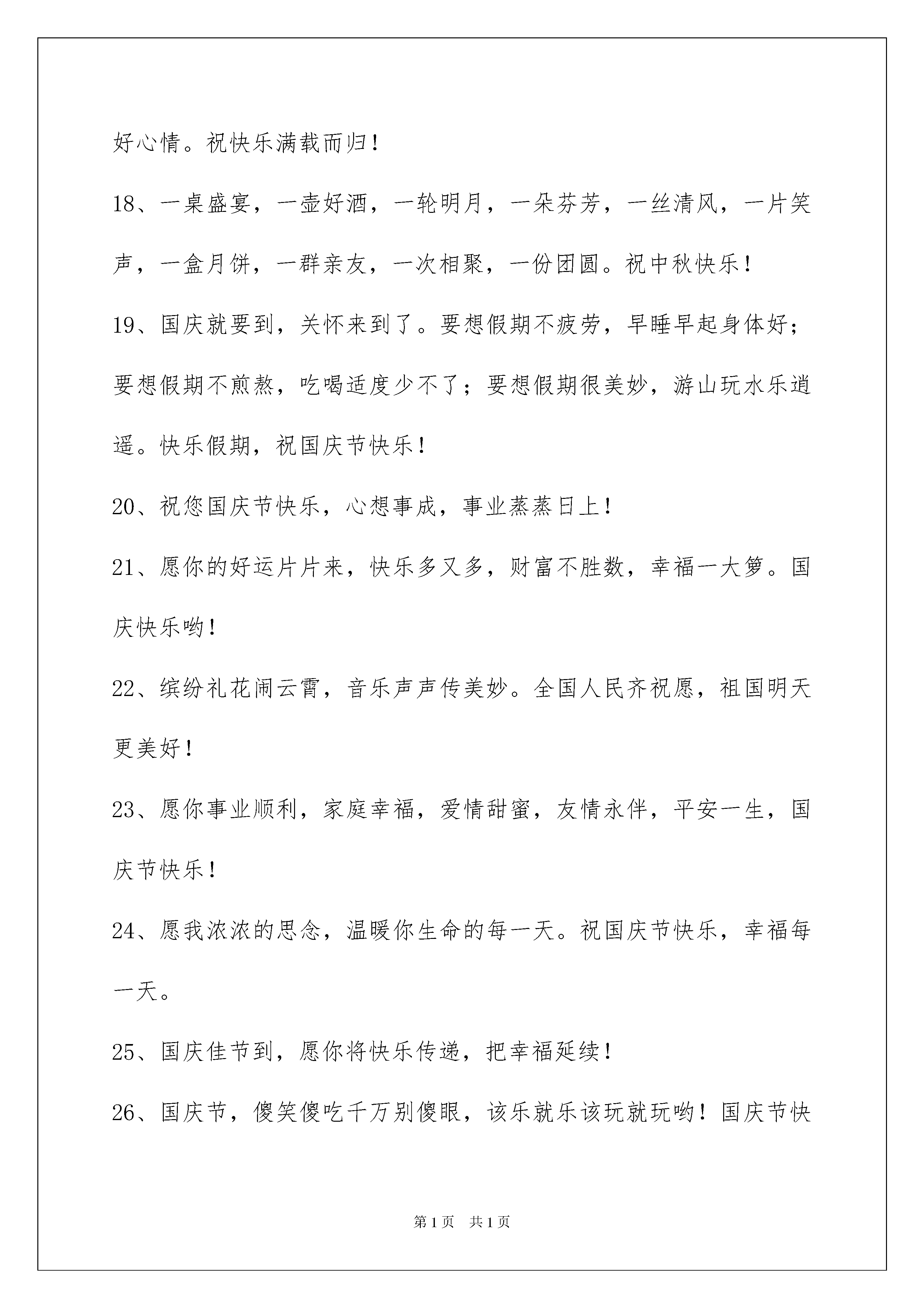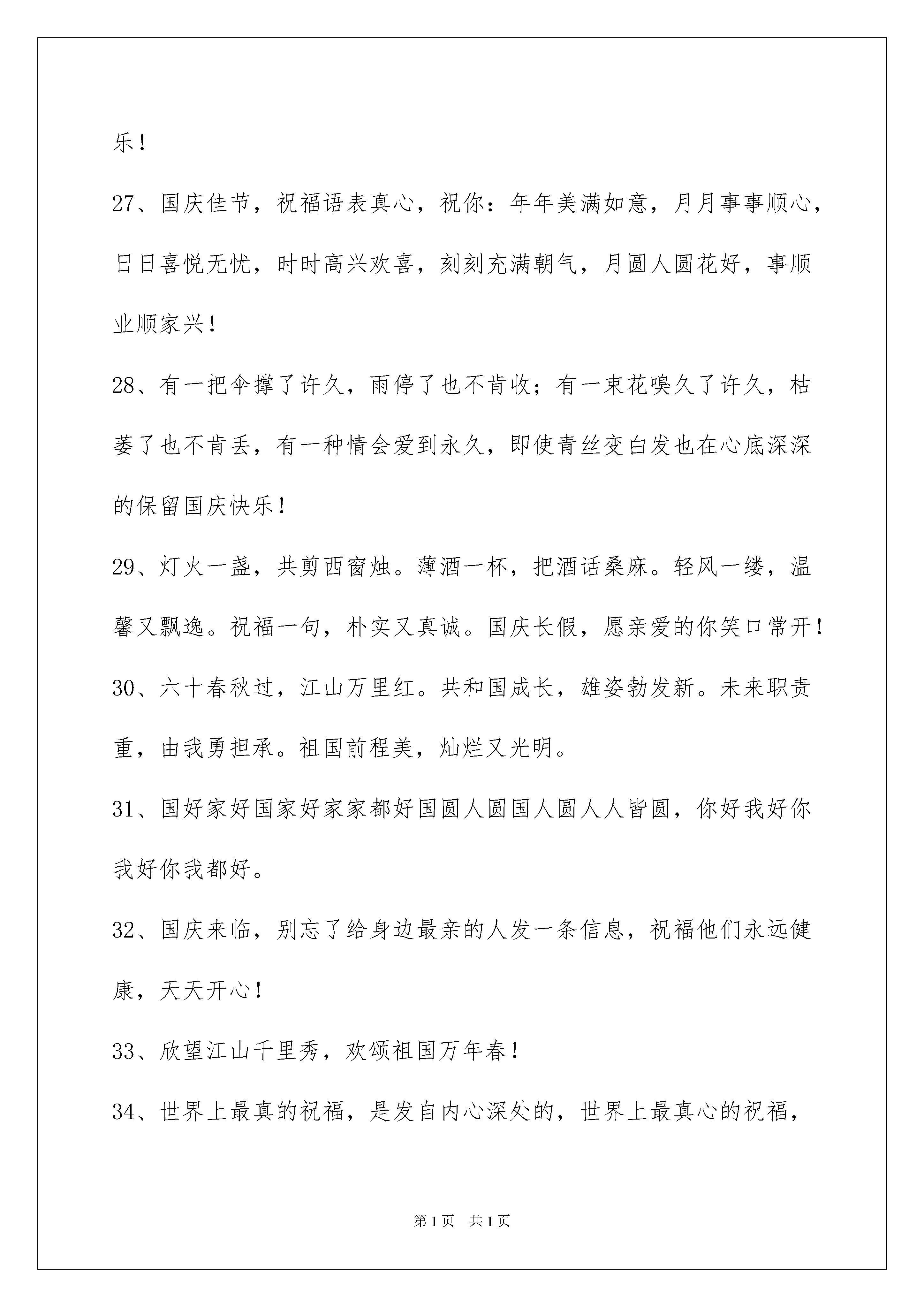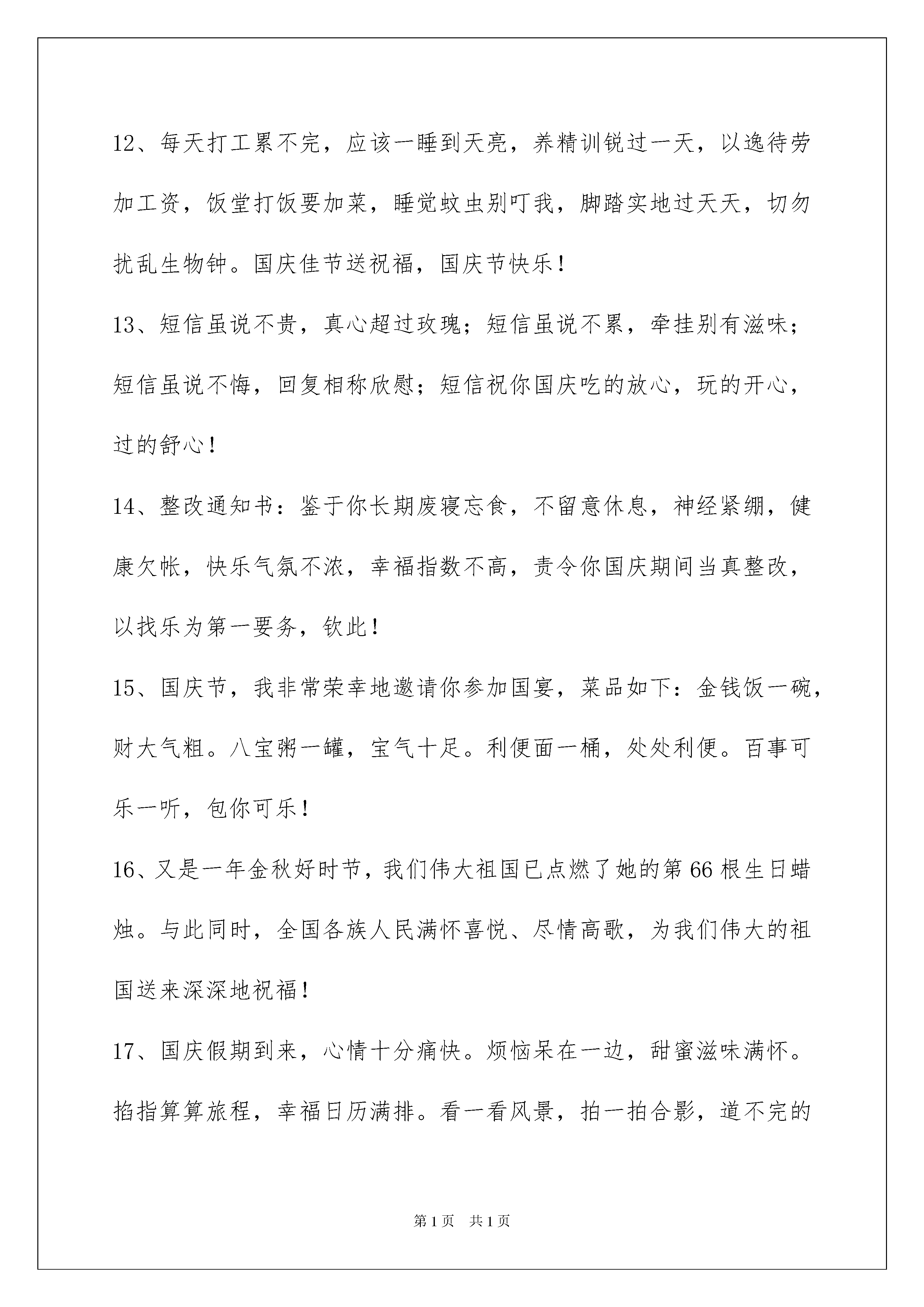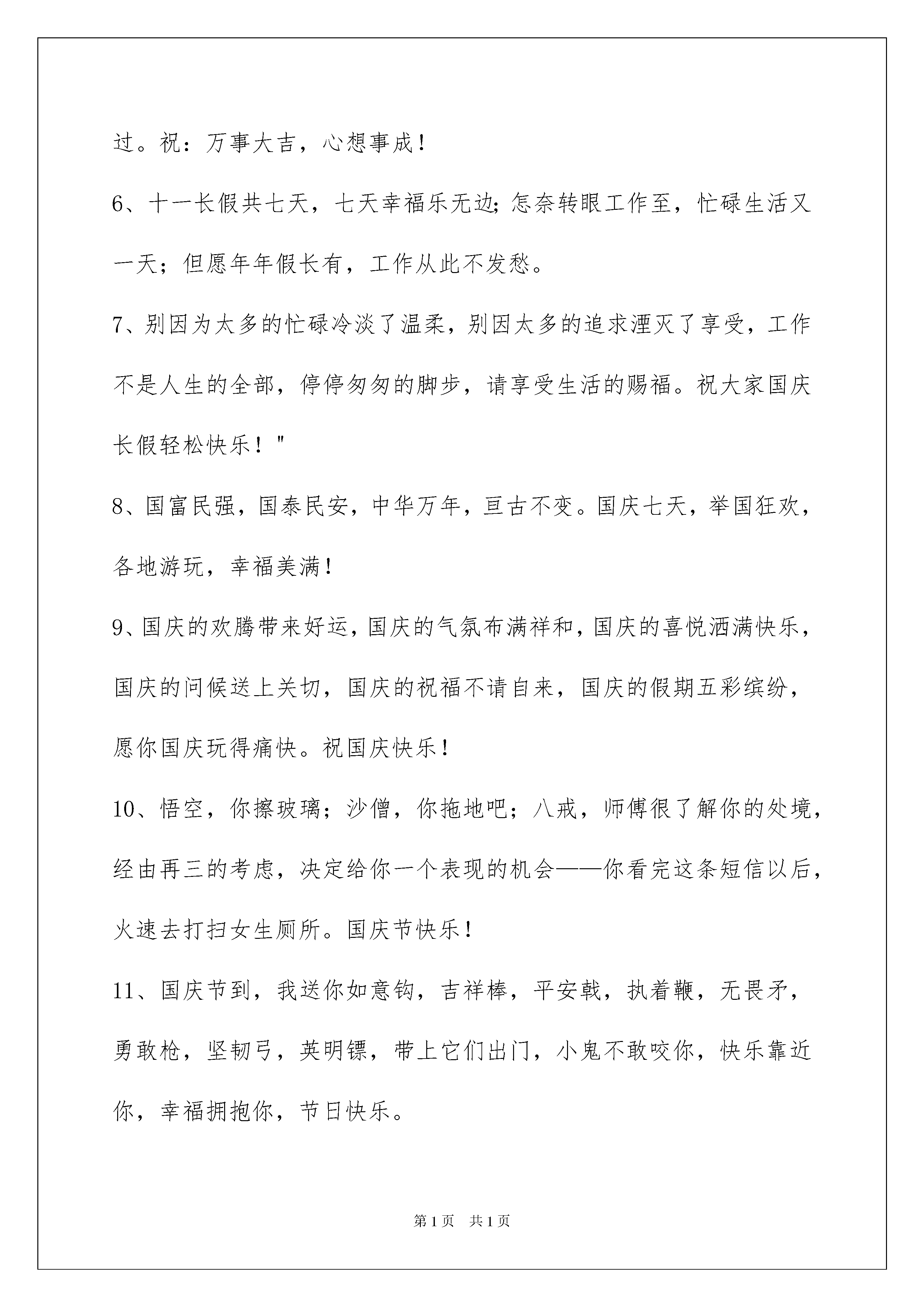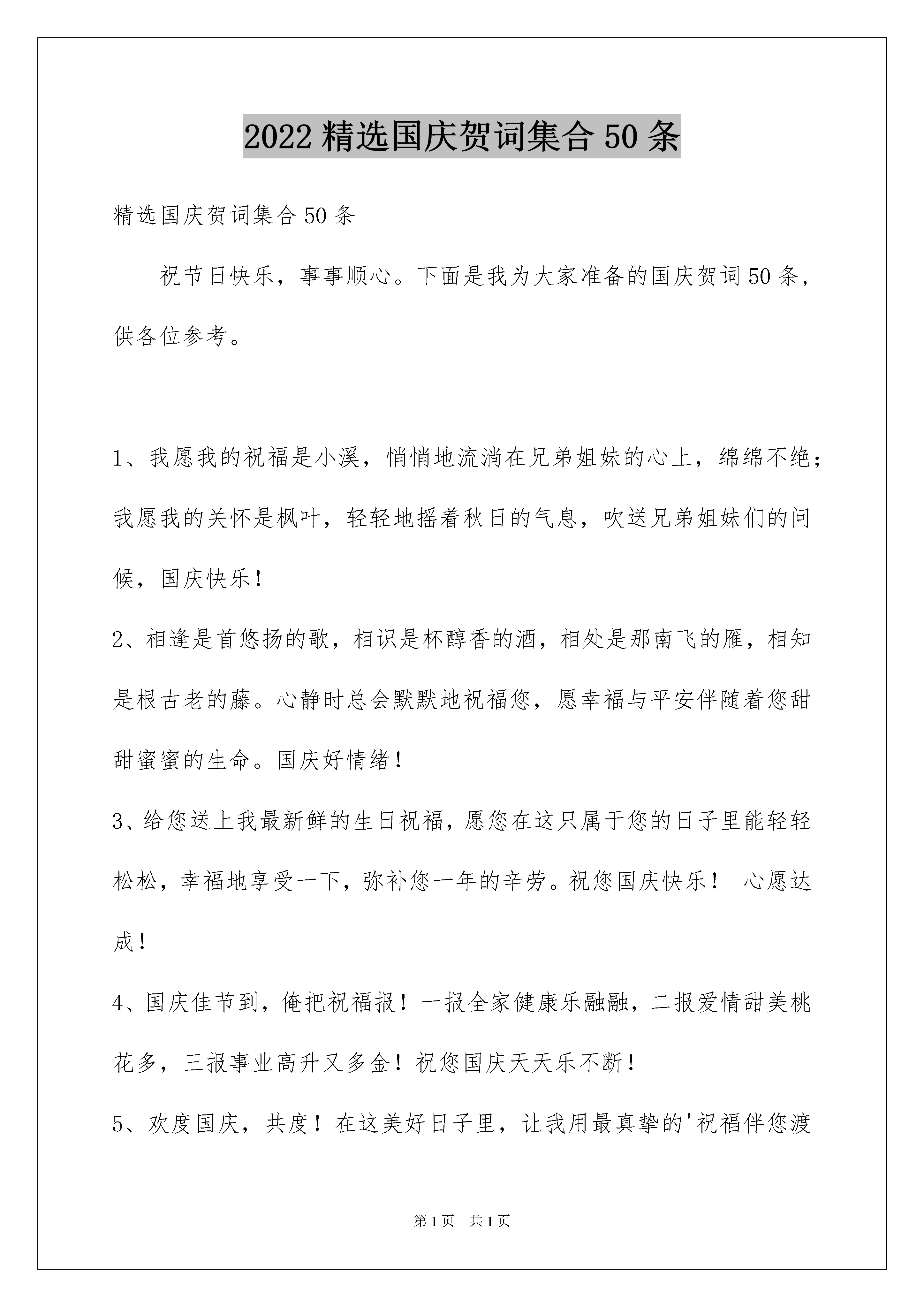 2022精选国庆贺词集合50条精选国庆贺词集合50条祝节日快乐,事事顺心。下面是我为大家准备的国庆贺词50条,供各位参考。1、我愿我的祝福是小溪,悄悄地流淌在兄弟姐妹的心上,绵绵不绝;我愿我的关怀是枫叶,轻轻地摇着秋日的气息,吹送兄弟姐妹们的问候,国庆快乐!2、相逢是首悠扬的歌,相识是杯醇香的酒,相处是那南飞的雁,相知是根古老的藤。心静时总会默默地祝福您,愿幸福与平安伴随着您甜甜蜜蜜的生命。国庆好情绪!3、给您送上我最新鲜的生日祝福,愿您在这只属于您的日子里能轻轻松松,幸福地享受一下,弥补您一年的辛劳。祝您国庆快乐!心愿达成!4、国庆佳节到,俺把祝福报!一报全家健康乐融融,二报爱情甜美桃花多,三报事业高升又多金!祝您国庆天天乐不断!5、欢度国庆,共度!在这美好日子里,让我用最真挚的'祝福伴您渡过。祝:万事大吉,心想事成!6、十一长假共七天,七天幸福乐无边;怎奈转眼工作至,忙碌生活又一天;但愿年年假长有,工作从此不发愁。7、别因为太多的忙碌冷淡了温柔,别因太多的追求湮灭了享受,工作不是人生的全部,停停匆匆的脚步,请享受生活的赐福。祝大家国庆长假轻松快乐!"8、国富民强,国泰民安,中华万年,亘古不变。国庆七天,举国狂欢,各地游玩,幸福美满!9、国庆的欢腾带来好运,国庆的气氛布满祥和,国庆的喜悦洒满快乐,国庆的问候送上关切,国庆的祝福不请自来,国庆的假期五彩缤纷,愿你国庆玩得痛快。祝国庆快乐!10、悟空,你擦玻璃;沙僧,你拖地吧;八戒,师傅很了解你的处境,经由再三的考虑,决定给你一个表现的机会——你看完这条短信以后,火速去打扫女生厕所。国庆节快乐!11、国庆节到,我送你如意钩,吉祥棒,平安戟,执着鞭,无畏矛,勇敢枪,坚韧弓,英明镖,带上它们出门,小鬼不敢咬你,快乐靠近你,幸福拥抱你,节日快乐。12、每天打工累不完,应该一睡到天亮,养精训锐过一天,以逸待劳加工资,饭堂打饭要加菜,睡觉蚊虫别叮我,脚踏实地过天天,切勿扰乱生物钟。国庆佳节送祝福,国庆节快乐!13、短信虽说不贵,真心超过玫瑰;短信虽说不累,牵挂别有滋味;短信虽说不悔,回复相称欣慰;短信祝你国庆吃的放心,玩的开心,过的舒心!14、整改通知书:鉴于你长期废寝忘食,不留意休息,神经紧绷,健康欠帐,快乐气氛不浓,幸福指数不高,责令你国庆期间当真整改,以找乐为第一要务,钦此!15、国庆节,我非常荣幸地邀请你参加国宴,菜品如下:金钱饭一碗,财大气粗。八宝粥一罐,宝气十足。利便面一桶,处处利便。百事可乐一听,包你可乐!16、又是一年金秋好时节,我们伟大祖国已点燃了她的第66根生日蜡烛。与此同时,全国各族人民满怀喜悦、尽情高歌,为我们伟大的祖国送来深深地祝福!17、国庆假期到来,心情十分痛快。烦恼呆在一边,甜蜜滋味满怀。掐指算算旅程,幸福日历满排。看一看风景,拍一拍合影,道不完的好心情。祝快乐满载而归!18、一桌盛宴,一壶好酒,一轮明月,一朵芬芳,一丝清风,一片笑声,一盒月饼,一群亲友,一次相聚,一份团圆。祝中秋快乐!19、国庆就要到,关怀来到了。要想假期不疲劳,早睡早起身体好;要想假期不煎熬,吃喝适度少不了;要想假期很美妙,游山玩水乐逍遥。快乐假期,祝国庆节快乐!20、祝您国庆节快乐,心想事成,事业蒸蒸日上!21、愿你的好运片片来,快乐多又多,财富不胜数,幸福一大箩。国庆快乐哟!22、缤纷礼花闹云霄,音乐声声传美妙。全国人民齐祝愿,祖国明天更美好!23、愿你事业顺利,家庭幸福,爱情甜蜜,友情永伴,平安一生,国庆节快乐!24、愿我浓浓的思念,温暖你生命的每一天。祝国庆节快乐,幸福每一天。25、国庆佳节到,愿你将快乐传递,把幸福延续!26、国庆节,傻笑傻吃千万别傻眼,该乐就乐该玩就玩哟!国庆节快乐!27、国庆佳节,祝福语表真心,祝你:年年美满如意,月月事事顺心,日日喜悦无忧,时时高兴欢喜,刻刻充满朝气,月圆人圆花好,事顺业顺家兴!28、有一把伞撑了许久,雨停了也不肯收;有一束花嗅久了许久,枯萎了也不肯丢,有一种情会爱到永久,即使青丝变白发也在心底深深的保留国庆快乐!29、灯火一盏,共剪西窗烛。薄酒一杯,把酒话桑麻。轻风一缕,温馨又飘逸。祝福一句,朴实又真诚。国庆长假,愿亲爱的你笑口常开!30、六十春秋过,江山万里红。共和国成长,雄姿勃发新。未来职责重,由我勇担承。祖国前程美,灿烂又光明。31、国好家好国家好家家都好国圆人圆国人圆人人皆圆,你好我好你我好你我都好。32、国庆来临,别忘了给身边最亲的人发一条信息,祝福他们永远健康,天天开心!33、欣望江山千里秀,欢颂祖国万年春!34、世界上最真的祝福,是发自内心深处的,世界上最真心的祝福,是