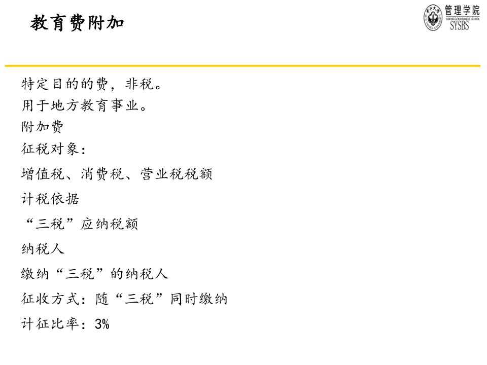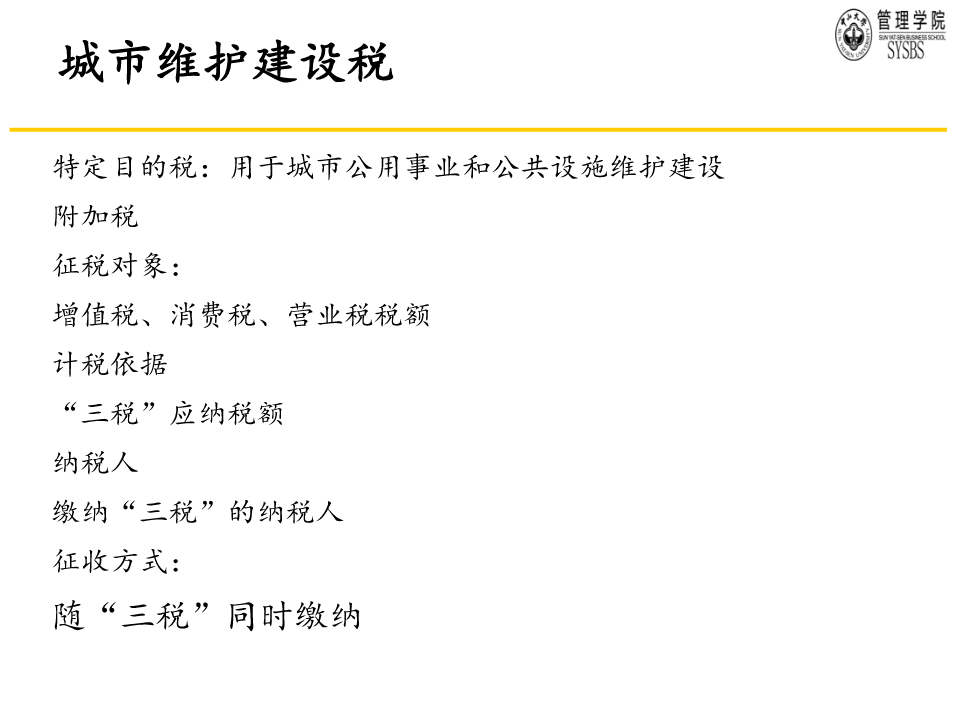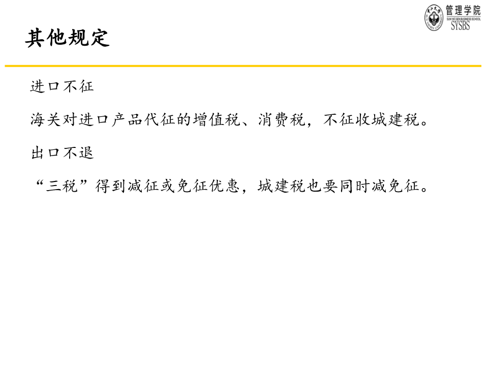 小税种 会计系宋小宁博士助理教授 songxiaoning2000@163.com 城市维护建设税 特定目的税:用于城市公用事业和公共设施维护建设 附加税 征税对象: 增值税、消费税、营业税税额 计税依据 “三税”应纳税额 纳税人 缴纳“三税”的纳税人 征收方式: 随“三税”同时缴纳 税率 纳税人所在地在 市区,7%; 县城、镇,5%; 不在市区、县城或者镇的,1%。 其他规定 进口不征 海关对进口产品代征的增值税、消费税,不征收城建税。 出口不退 “三税”得到减征或免征优惠,城建税也要同时减免征。 教育费附加 特定目的的费,非税。 用于地方教育事业。 附加费 征税对象: 增值税、消费税、营业税税额 计税依据 “三税”应纳税额 纳税人 缴纳“三税”的纳税人 征收方式:随“三税”同时缴纳 计征比率:3% 其他规定 •进口不征 海关对进口产品代征的增值税、消费税,不征收城建税。 •出口不退 •“三税”得到减征或免征优惠,教育费附加也要同时减免 征。 关税 征税对象 对进出境货物、物品征收。 境:“海关境域”或“关税领域”。 纳税人 进口货物收货人 出口货物发货人 进出境物品的所有人 进出口税则 进出口税则就是关税税率表。 通常还包括实施税则的法令、使用说明和附录等。 我国现行税则体系包括:9个法律文件 8 《中华人民共和国海关进出口税则—统计目录本国子目注释》 序号税则号列商品名称商品描述 子目0104.1010改良种用绵羊,系指根据育种目标,利用现有品种发生的自然变异或人 工创造的新类型,通过系统的选育过程而育成的用于繁殖、培养推广或用以改良国内 10104.1010改良种用绵羊品种为主要用途的公、母绵羊。它比一般的绵羊有较好的生产性能和遗传品质,同时 又能适应一定的经济和自然条件。该税则子目仅包括由本国主管部门认定为“纯种” 的种用动物,进口时一般表现为“量少价高”。 20106.1920食用其他哺乳动物子目0106.1920所列产品是其它税则子目未列名的、可供人食用的哺乳动物。 子目0106.2011鳄鱼苗,系指由本国主管部门认定为“纯种”的种用鳄鱼苗。具有遗 30106.2011改良种用鳄鱼苗 传性状稳定、抗病力强、繁殖力强等特点。进口时一般表现为“量少价高”。 子目0106.9011蛙苗,系指由本国主管部门认定为“纯种”的种用蛙苗,具有遗传性状 40106.9011改良种用蛙苗 稳定、抗病力强、繁殖力强等特点。 子目0208.9010乳鸽的鲜、冷、冻肉及食用杂碎,包括:(1)整头乳鸽(即有头或 乳鸽的鲜、冷、冻无头的乳鸽躯体)。(2)半头乳鸽(整头纵向切开而得)。(3)连腿肉块、肉块。 50208.9010 肉及食用杂碎(4)主要供人食用的杂碎(例如,头及头块、脚、心、肝等)。 乳鸽,系指25~28日龄、体重在500~750克之间、用于食用的雏鸽。 进口关税税率 1.最惠国税率:WTO成员国;签约对等国;我国 2.协定税率:韩国、斯里兰卡、孟加拉(曼谷协定税率) 3.特惠税率:孟加拉的部分进口货物 4.普通税率:其他 5.关税配额税率 10 2011年关税配额商品税目、税率表 原产地规定 全部产地生产标准 完全在一个国家内生产或制造。 实质性加工标准 经过几个国家加工制造,以最后一个对货物进行经济上可以 视为实质性加工的国家作为原产国。 实质性加工,指产品加工后,在进出口税则中四位数税号一 级的税则归类已经有了改变,或者加工增值部分所占新产 品总值的比例已超过30%及以上的。 计征办法 从价税:绝大部分商品 从量税:原油、部分鸡产品、啤酒、胶卷 复合税:录像机、放像机、摄像机、数字照相机、摄 录一体机。 滑准税:新闻纸 关税税率随进口商品价格由高到低而由低到高设置计征关税。 13 出口关税税率 国家仅对少数资源性产品 我国真正征收出口关税的商品只有20种,税率也较低。 一栏比例税率(20%-40%) 14 特别关税 报复性关税 反倾销税与反补贴税 保障性关税 15 进口货物关税完税价格 进口货物完税价格包括 货物的货价 货物运抵中华人民共和国境内输入地点起卸前的运输及其相 关费用 保险费; 出口货物的完税价格 出口货物完税价格包括 •成交价格 •货物运至我国境内输出地点装载前的运输及其相关费用 •保险费 17 大中华区的自由贸易协议 《内地与香港关于建立更紧密经贸关系的安排》CEPA,2003 内地与澳门关于建立更紧密经贸关系的安排,CEPA,2005 《海峡两岸经济合作框架协议》ECFA,2010 《内地与香港关于建立更