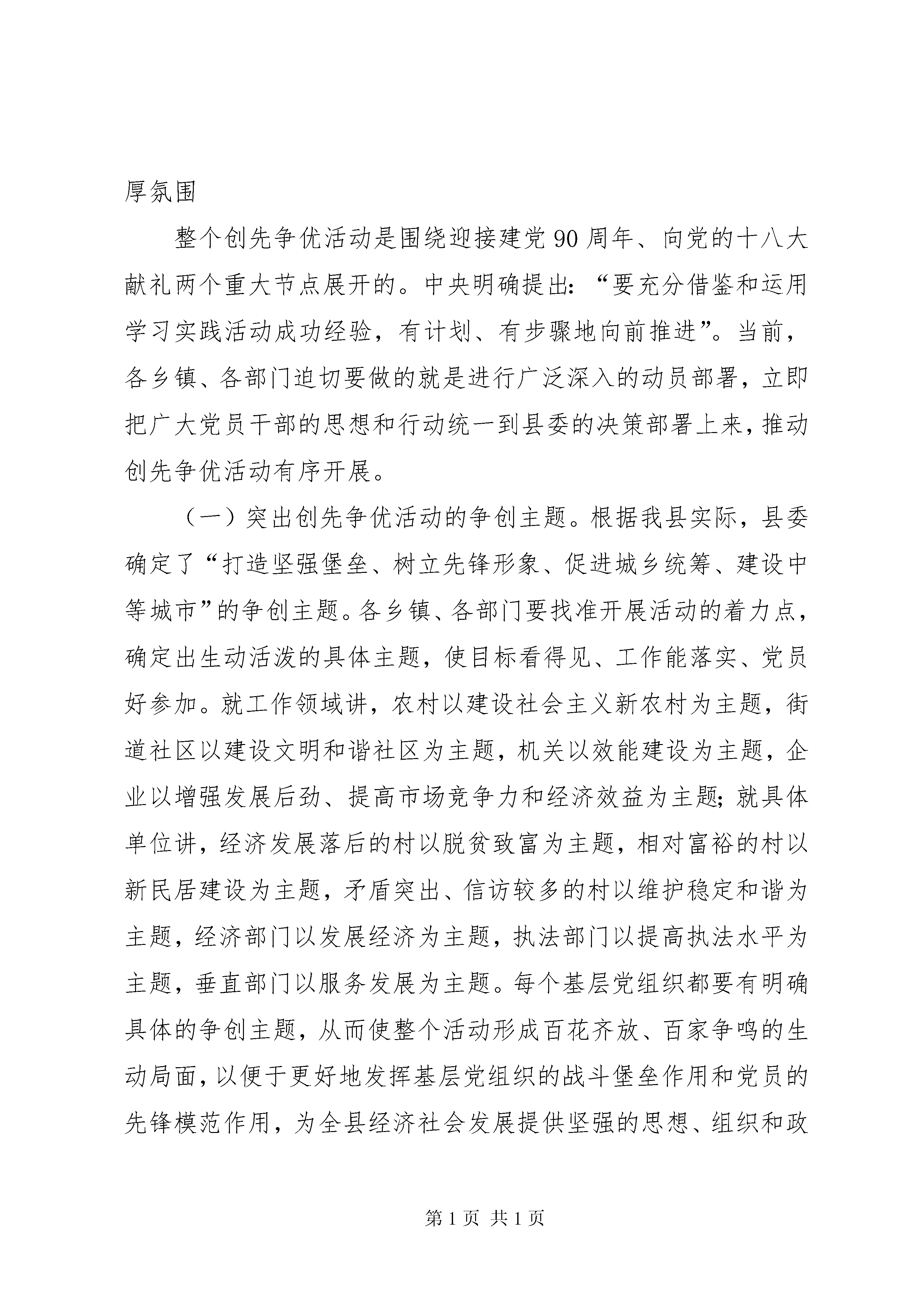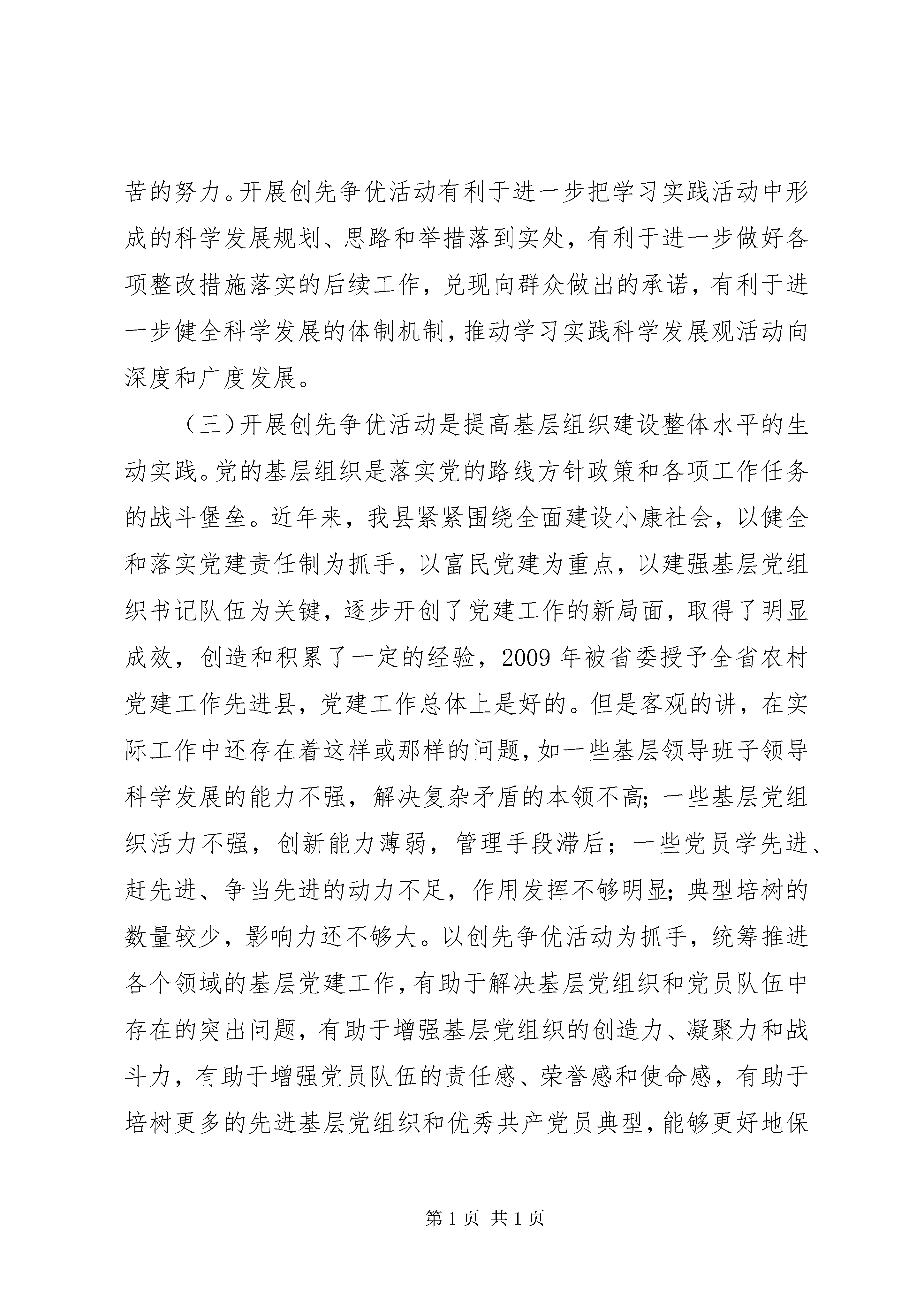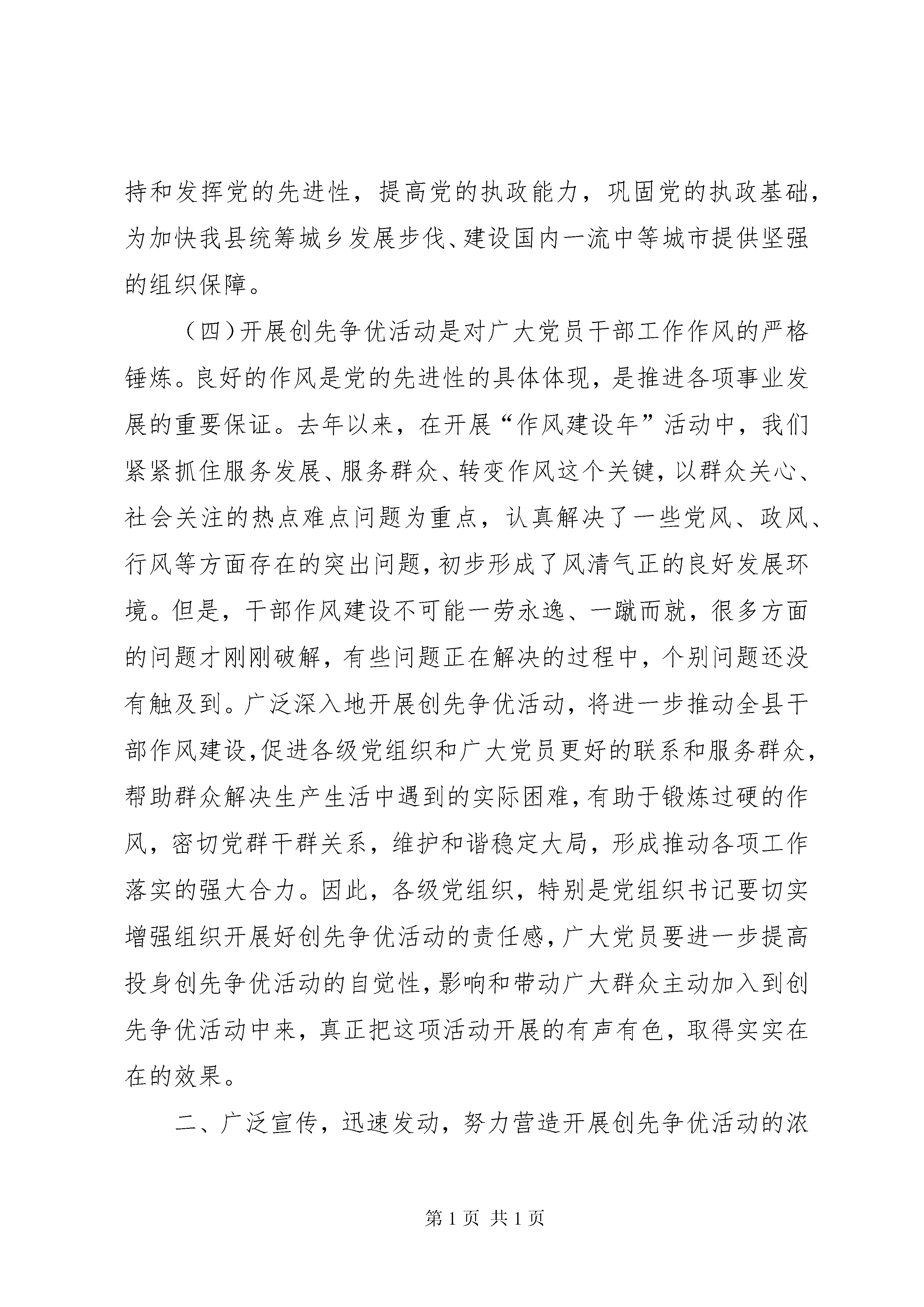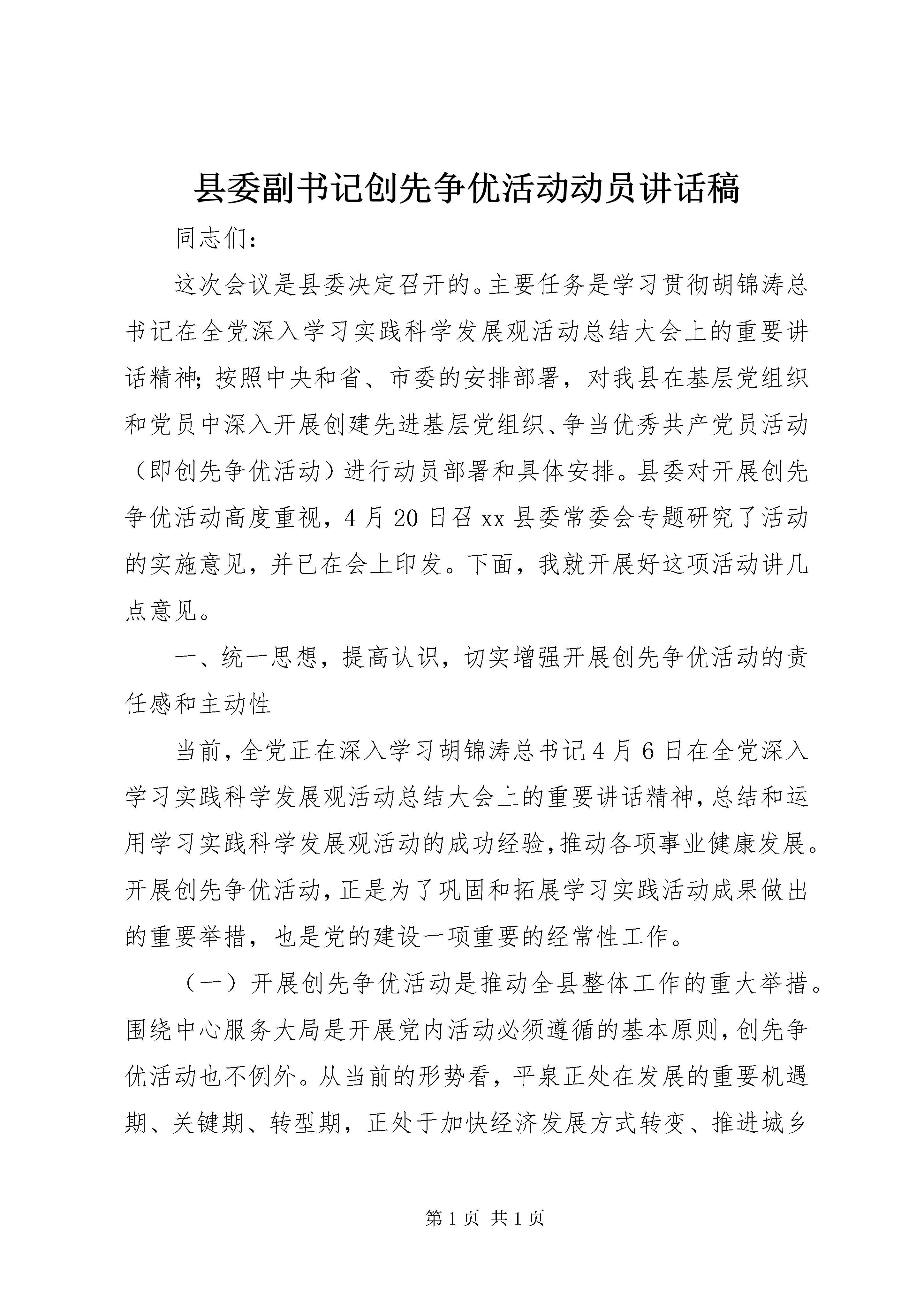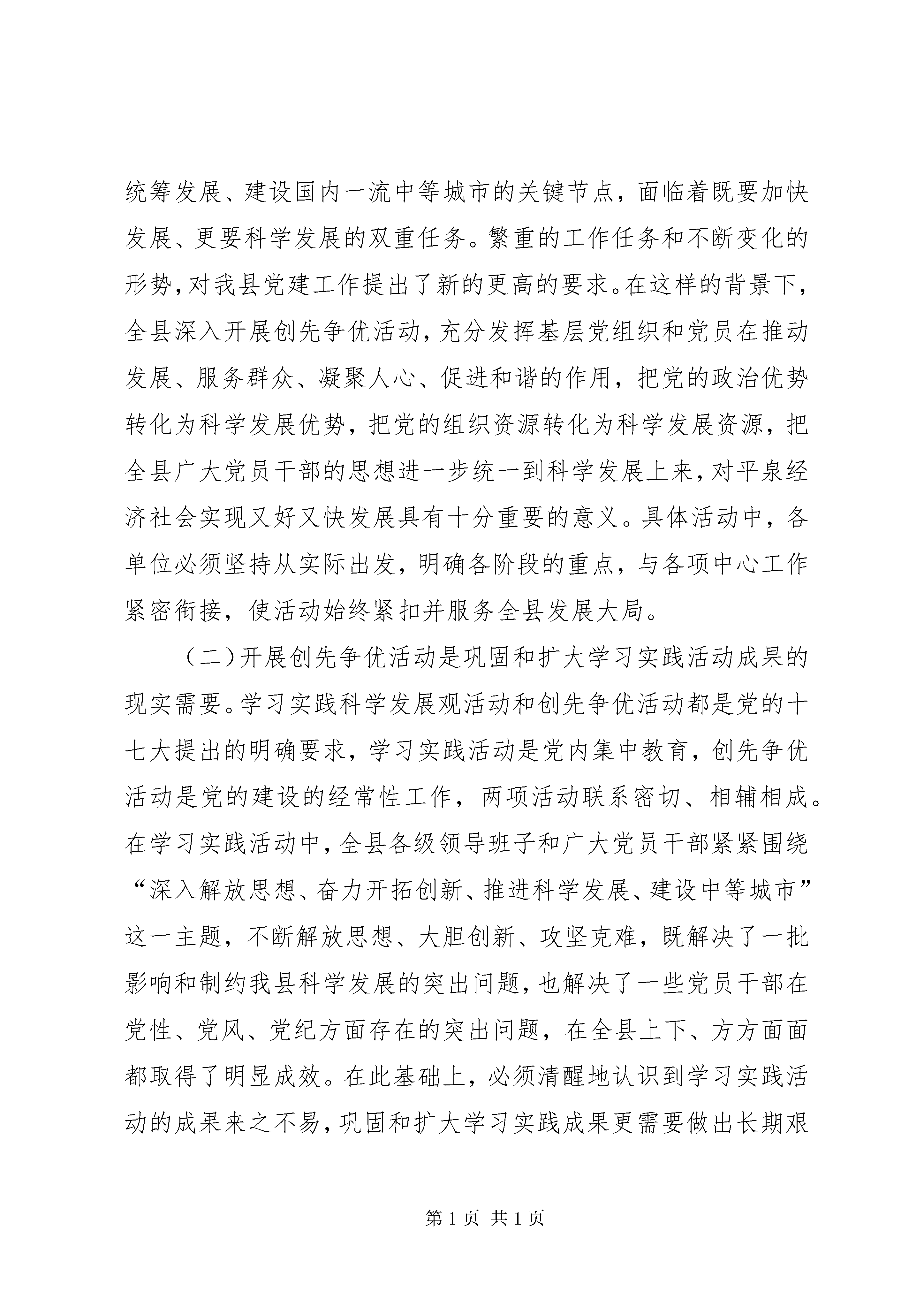 县委副书记创先争优活动动员讲话稿同志们:这次会议是县委决定召开的。主要任务是学习贯彻胡锦涛总书记在全党深入学习实践科学发展观活动总结大会上的重要讲话精神;按照中央和省、市委的安排部署,对我县在基层党组织和党员中深入开展创建先进基层党组织、争当优秀共产党员活动(即创先争优活动)进行动员部署和具体安排。县委对开展创先争优活动高度重视,4月20日召xx县委常委会专题研究了活动的实施意见,并已在会上印发。下面,我就开展好这项活动讲几点意见。一、统一思想,提高认识,切实增强开展创先争优活动的责任感和主动性当前,全党正在深入学习胡锦涛总书记4月6日在全党深入学习实践科学发展观活动总结大会上的重要讲话精神,总结和运用学习实践科学发展观活动的成功经验,推动各项事业健康发展。开展创先争优活动,正是为了巩固和拓展学习实践活动成果做出的重要举措,也是党的建设一项重要的经常性工作。(一)开展创先争优活动是推动全县整体工作的重大举措。围绕中心服务大局是开展党内活动必须遵循的基本原则,创先争优活动也不例外。从当前的形势看,平泉正处在发展的重要机遇期、关键期、转型期,正处于加快经济发展方式转变、推进城乡统筹发展、建设国内一流中等城市的关键节点,面临着既要加快发展、更要科学发展的双重任务。繁重的工作任务和不断变化的形势,对我县党建工作提出了新的更高的要求。在这样的背景下,全县深入开展创先争优活动,充分发挥基层党组织和党员在推动发展、服务群众、凝聚人心、促进和谐的作用,把党的政治优势转化为科学发展优势,把党的组织资源转化为科学发展资源,把全县广大党员干部的思想进一步统一到科学发展上来,对平泉经济社会实现又好又快发展具有十分重要的意义。具体活动中,各单位必须坚持从实际出发,明确各阶段的重点,与各项中心工作紧密衔接,使活动始终紧扣并服务全县发展大局。(二)开展创先争优活动是巩固和扩大学习实践活动成果的现实需要。学习实践科学发展观活动和创先争优活动都是党的十七大提出的明确要求,学习实践活动是党内集中教育,创先争优活动是党的建设的经常性工作,两项活动联系密切、相辅相成。在学习实践活动中,全县各级领导班子和广大党员干部紧紧围绕“深入解放思想、奋力开拓创新、推进科学发展、建设中等城市”这一主题,不断解放思想、大胆创新、攻坚克难,既解决了一批影响和制约我县科学发展的突出问题,也解决了一些党员干部在党性、党风、党纪方面存在的突出问题,在全县上下、方方面面都取得了明显成效。在此基础上,必须清醒地认识到学习实践活动的成果来之不易,巩固和扩大学习实践成果更需要做出长期艰苦的努力。开展创先争优活动有利于进一步把学习实践活动中形成的科学发展规划、思路和举措落到实处,有利于进一步做好各项整改措施落实的后续工作,兑现向群众做出的承诺,有利于进一步健全科学发展的体制机制,推动学习实践科学发展观活动向深度和广度发展。(三)开展创先争优活动是提高基层组织建设整体水平的生动实践。党的基层组织是落实党的路线方针政策和各项工作任务的战斗堡垒。近年来,我县紧紧围绕全面建设小康社会,以健全和落实党建责任制为抓手,以富民党建为重点,以建强基层党组织书记队伍为关键,逐步开创了党建工作的新局面,取得了明显成效,创造和积累了一定的经验,2009年被省委授予全省农村党建工作先进县,党建工作总体上是好的。但是客观的讲,在实际工作中还存在着这样或那样的问题,如一些基层领导班子领导科学发展的能力不强,解决复杂矛盾的本领不高;一些基层党组织活力不强,创新能力薄弱,管理手段滞后;一些党员学先进、赶先进、争当先进的动力不足,作用发挥不够明显;典型培树的数量较少,影响力还不够大。以创先争优活动为抓手,统筹推进各个领域的基层党建工作,有助于解决基层党组织和党员队伍中存在的突出问题,有助于增强基层党组织的创造力、凝聚力和战斗力,有助于增强党员队伍的责任感、荣誉感和使命感,有助于培树更多的先进基层党组织和优秀共产党员典型,能够更好地保持和发挥党的先进性,提高党的执政能力,巩固党的执政基础,为加快我县统筹城乡发展步伐、建设国内一流中等城市提供坚强的组织保障。(四)开展创先争优活动是对广大党员干部工作作风的严格锤炼。良好的作风是党的先进性的具体体现,是推进各项事业发展的重要保证。去年以来,在开展“作风建设年”活动中,我们紧紧抓住服务发展、服务群众、转变作风这个关键,以群众关心、社会关注的热点难点问题为重点,认真解决了一些党风、政风、行风等方面存在的突出问题,初步形成了风清气正的良好发展环境。但是,干部作风建设不可能一劳永逸、一蹴而就,很多方面的问题才刚刚破解,有些问题正在解决的过程中,个别问题还没有触及到。广泛深入地开展创先争优活动,将进一步推动全县干部作风建设,促进各级党组织和广大党员更好的联系和服务群众,帮助