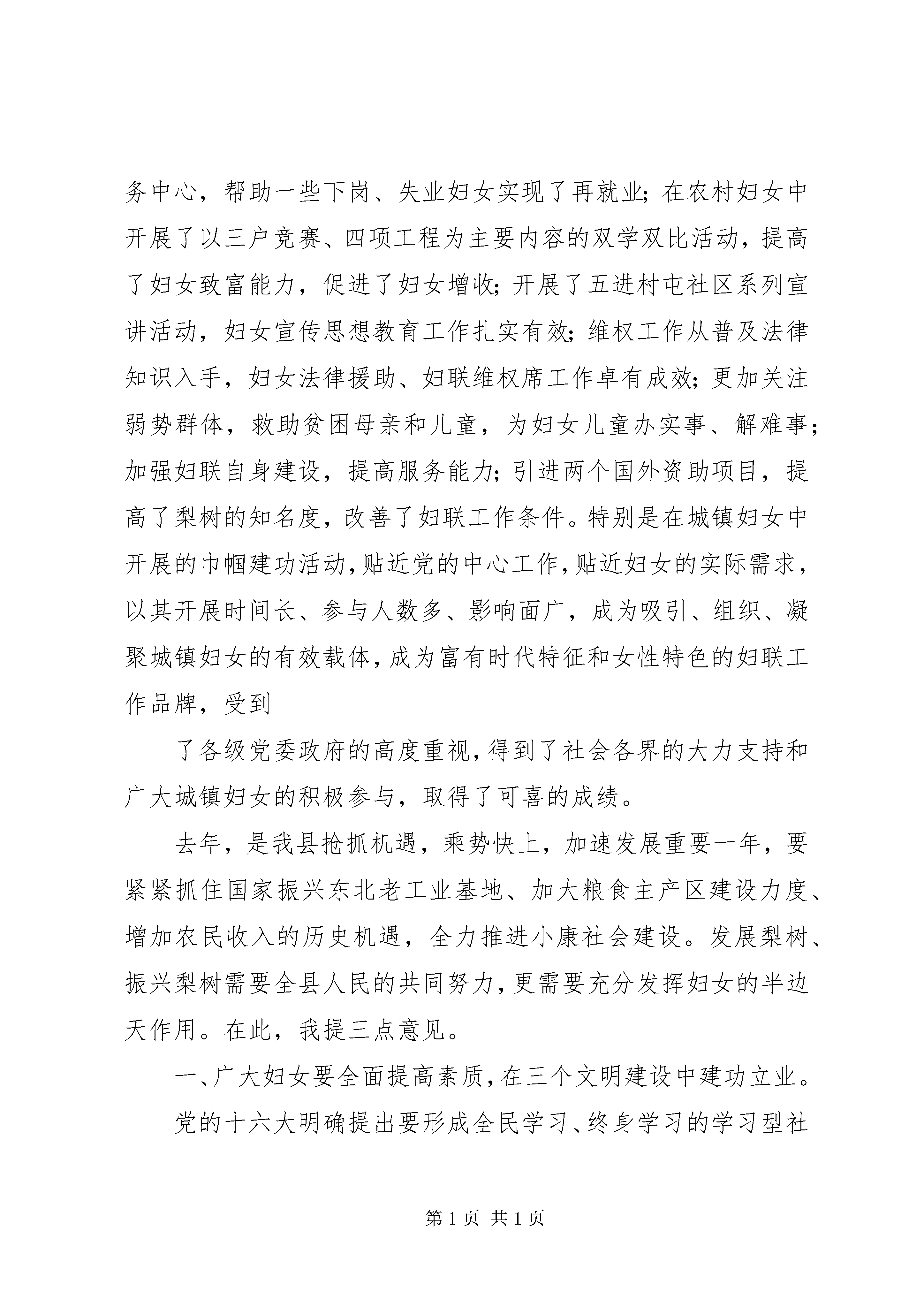 县委副书记在三八妇女节表彰大会上的讲话县委副书记在全县纪念三八国际劳动妇女节巾帼建功活动表彰大会上的讲话同志们:在三八劳动妇女节到来的前夕,县巾帼建功领导小组、县妇联在这里隆重召开全县巾帼建功表彰大会,对活动中涌现出的先进典型进行表彰,刚才,三个典型分别做了生动感人的事迹报告,这个会议很有意义,也非常重要。既是对三八节的最好纪念,又是组织全县女职工围绕二次创业、加快梨树发展的一次再动员,是县妇联工作紧贴党委工作中心,服务大局的具体体现,对于进一步调动全县女职工投身改革和建设的积极性、创造性,加快我县三个文明建设将起到很大的推动作用。在此我代表县委县政府对向受表彰的先进集体和个人表示热烈的祝贺,向全县各族各界妇女及妇女工作者致以节日的问候。在过去的一年里,全县广大妇女发扬自强不息,艰苦奋斗的精神,以主人翁的姿态,积极投身改革发展和现代化建设的伟大实践,为梨树三个文明建设做出院贡献。全县各级妇女组织紧紧围绕县委工作中心,认真履行各项职能,团结带领广大妇女为推动全县经济发展和社会进步积极努力,特别是在促进城镇妇女就业、农村妇女增收、提高妇女素质、维护妇女权益、文明家庭建设等方面,做了大量扎实有效的工作。县妇联成立了牵手家政服务中心,帮助一些下岗、失业妇女实现了再就业;在农村妇女中开展了以三户竞赛、四项工程为主要内容的双学双比活动,提高了妇女致富能力,促进了妇女增收;开展了五进村屯社区系列宣讲活动,妇女宣传思想教育工作扎实有效;维权工作从普及法律知识入手,妇女法律援助、妇联维权席工作卓有成效;更加关注弱势群体,救助贫困母亲和儿童,为妇女儿童办实事、解难事;加强妇联自身建设,提高服务能力;引进两个国外资助项目,提高了梨树的知名度,改善了妇联工作条件。特别是在城镇妇女中开展的巾帼建功活动,贴近党的中心工作,贴近妇女的实际需求,以其开展时间长、参与人数多、影响面广,成为吸引、组织、凝聚城镇妇女的有效载体,成为富有时代特征和女性特色的妇联工作品牌,受到了各级党委政府的高度重视,得到了社会各界的大力支持和广大城镇妇女的积极参与,取得了可喜的成绩。去年,是我县抢抓机遇,乘势快上,加速发展重要一年,要紧紧抓住国家振兴东北老工业基地、加大粮食主产区建设力度、增加农民收入的历史机遇,全力推进小康社会建设。发展梨树、振兴梨树需要全县人民的共同努力,更需要充分发挥妇女的半边天作用。在此,我提三点意见。一、广大妇女要全面提高素质,在三个文明建设中建功立业。党的十六大明确提出要形成全民学习、终身学习的学习型社会,促进人的全面发展。这是一个富有深刻内涵的重大课题,是具有鲜明时代意义的崭新要求。我们所处的时代,正在发生广泛而深刻的变化,科技进步日新月异,知识更新速度空前加快,广大妇女一定在增强学习的紧迫感,牢固树立主动学习、超前学习、终身学习的观念,全面提高思想道德、科学文化素质;要吸纳新理念、新观点,不断开拓视野,摒弃传统的思想观念和思维方式,善于接受新思想,新事物,使自己的思想观念、思维方式能够与时俱进,更加符合不断发展和客观世界;通过知识更新,带动工作创新,努力提高参与社会竞争的能力和本领,在激烈的市场竞争中有所作为。全面建设小康社会,既反映了广大妇女群众的根本利益和共同愿望,也为妇女群体的发展和建功立业提供了广阔的舞台,广大妇女要焕发精神,以只争朝夕、自强自立、与时俱进的精神状态,勇于创新,善于创业,最大限度地展示自己的聪明才智。特别是城镇各条战线女职工,要立足本职,爱岗敬业,发挥积极作用。下岗失业妇女要转变就业、择业观念,提出高竞争能力,掌握就业技能,大胆创业,努力实现自身的社会价值,为推进全县经济和社会发展建功立业。二、各级妇女组织要围绕三创目标,深化巾帼建功活动。巾帼建功活动是城镇妇女工作服从服务于大局的切入点,是妇女工作与党的中心工作的结合点,是城镇妇女工作直接参与两个文明建设的有效载体,也是城镇妇联工作的重点。中国妇女九大向全国各族各界妇女发出了创造新岗位、创造新业绩、创造新生活的号召。如何使城镇妇女了解三创精神,参与三创实践,获得三创成果是新阶段巾帼建功活动的主要任务。各级妇女组织要围绕中国妇女九大提出的目标,不断深化巾帼建功活动。立足创造新岗位,为下岗失业妇女服务。认真落实中央把城镇妇女工作重点放要社区的指示精神,把社区家政服务业作为下岗失业妇女和农村富余女劳力,提供就业岗位的重要领域。发挥妇联牵手家政服务中心的作用,积极开发社区新岗位,促进下岗失业妇女创业、再就业。立足创造新业绩,为在岗妇女建功成才服务。以创建巾帼文明岗为载体,不断拓展活动领域,丰富活动内涵,创新活动机制,使巾帼建功活动成为城镇妇女自身素质、创造新业绩、展现新风貌的品牌活动。将活动延伸到更多的行业和岗位,扩大活动的覆盖面。把提高女职工素质贯穿于创建