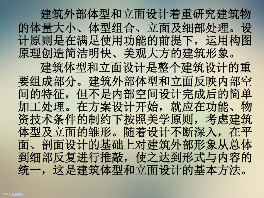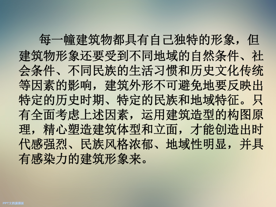 13十一月2024建筑外部体型和立面设计着重研究建筑物的体量大小、体型组合、立面及细部处理。设计原则是在满足使用功能的前提下,运用构图原理创造简洁明快、美观大方的建筑形象。 建筑体型和立面设计是整个建筑设计的重要组成部分。建筑外部体型和立面反映内部空间的特征,但不是内部空间设计完成后的简单加工处理。在方案设计开始,就应在功能、物资技术条件的制约下按照美学原则,考虑建筑体型及立面的雏形。随着设计不断深入,在平面、剖面设计的基础上对建筑外部形象从总体到细部反复进行推敲,使之达到形式与内容的统一,这是建筑体型和立面设计的基本方法。每一幢建筑物都具有自己独特的形象,但建筑物形象还要受到不同地域的自然条件、社会条件、不同民族的生活习惯和历史文化传统等因素的影响,建筑外形不可避免地要反映出特定的历史时期、特定的民族和地域特征。只有全面考虑上述因素,运用建筑造型的构图原理,精心塑造建筑体型和立面,才能创造出时代感强烈、民族风格浓郁、地域性明显,并具有感染力的建筑形象来。6.1建筑体型和立面设计要求商务写字楼,大面积的玻璃墙,流线型的外观,显得动感十足,很时尚、前卫。住宅建筑,由于内部空间小,人流出入较少的特征,立面上常以小巧的窗户、成组排列的阳台、凹廊等反映出住宅建筑性格特征。大面积玻璃的陈列橱窗和接近人流的明显入口显示出商业建筑的性格特征剧院建筑以巨大而封闭的观众厅、舞台和宽敞明亮的门厅、休息厅等三大部分的体量变化显示出明朗、轻快、活泼的性格特征。办公楼下图为纽约肯尼迪机场侯机楼建筑,设计者使其外部形象表现为一只展翅欲飞的大鸟形象,这种造型虽然不是出自功能要求但对表现航空港建筑的性格却十分贴切。(2)考虑物质条件的特点 建筑不同于一般的艺术品,它要运用大量的建筑材料,并通过一定的结构施工技术等手段才能建成。因此,建筑体型及立面设计必然在很大程度上受到物质技术条件的制约,并反映出结构、材料和施工的特点。 适应环境和建筑群体规划要求(P108) 符合形式美的规律 掌握建筑标准、考虑经济条件 一般中小型民用建筑多采用混合结构,由于受到墙体承重及梁板经济跨度的局限,室内空间小,层数不多,开窗面积受到限制。这类建筑的立面处理可通过外墙的色彩、质感、水平与垂直线条及门窗的合理组织来表现混合结构建筑简洁、朴素、稳重的外观特征。钢筋混凝土框架结构,由于墙体仅起围护作用,给空间处理赋予了极大的灵活性。它的立面开窗较自由,既可形成大面积独立窗,也可组成带形窗,甚至可以全部取消窗间墙而形成完全通透的形式。框架结构建筑具有简洁、明快、轻巧的外观形象。随着现代新结构、新材料、新技术的发展,给建筑外形设计提供了更大的灵活性和多样性。特别是各种空间结构的大量运用,更加丰富了建筑物的外观形象,使建筑造型呈现出千姿百态。压型钢板瓦6.2建筑构图原理要点建筑艺术属于造型艺术,必须遵守造型艺术中形式美的规律。不同的时代、不同的国家和地区、不同的民族,尽管建筑形式千差万别尽管人们的审美观各不相同,但形式美的规律是被人们普遍承认的,因而具有普遍性。 统一与变化,即“统一中求变化”,“变化中求统一”是形式美的根本法则,广泛适用于建筑设计中。 任何一幢建筑物都是由若干部分组成,客观上存在统一与变化的因素。一幢教学楼,分别由功能要求不同的教室、办公室组成;旅馆建筑分别由客房、餐厅、休息厅组成。由于功能要求不同,各房间高低、形状、大小、结构处理也不尽相同,如门窗、墙柱、阳台、屋顶、雨棚等各部分在形式、材料、色彩、质地等方面就各不相同。这些不同的功能组成和不同的外形因素,构成了建筑外表的多样化。另一方面,它们彼此之间也有必然的内在联系,如共同的功能要求使性质不同的房间在门窗处理、层高、开间及装修方面往往采取统一的处理方式,这些都为建筑外形设计的整体统一性提供了客观的基础。因此,任何建筑无论整体和单体、平面和空间、体型和细部都存在着统一与变化的因素。 在体型和立面设计中,如何充分利用这些相同与变化的因素,处理好它们之间的关系,做到统一与变化,使之完美地结合,是非常重要的。建筑外形缺乏多样性和变化,就显得“单调”、“呆板”,反之,过多的变化,缺乏和谐的整体统一感,就会显得“杂乱”、“繁琐”。为取得多样性统一的因素效果,常用手法有建筑构图原理要点任何简单的、容易被人们识别的几何体都具有一种必然的统一性,如圆柱体、圆锥体、长方体、正方体、球体。这些形体常用于建筑上。由于它们的形状简单、明确肯定,自然能取得统一,如我国的天坛、园林建筑中的亭、台及一些现代建筑均以简单的几何形体获得高度统一、稳定的艺术效果。运用轴线的处理突出主体。从古至今,对称手法在建筑中运用较为普遍,通常采用突出中央入口的手法来引导人流。突出中央入口突出中央主楼突出中央体部突出中央体部突出两个端部突出两个端部以低衬高,突出主体在建筑