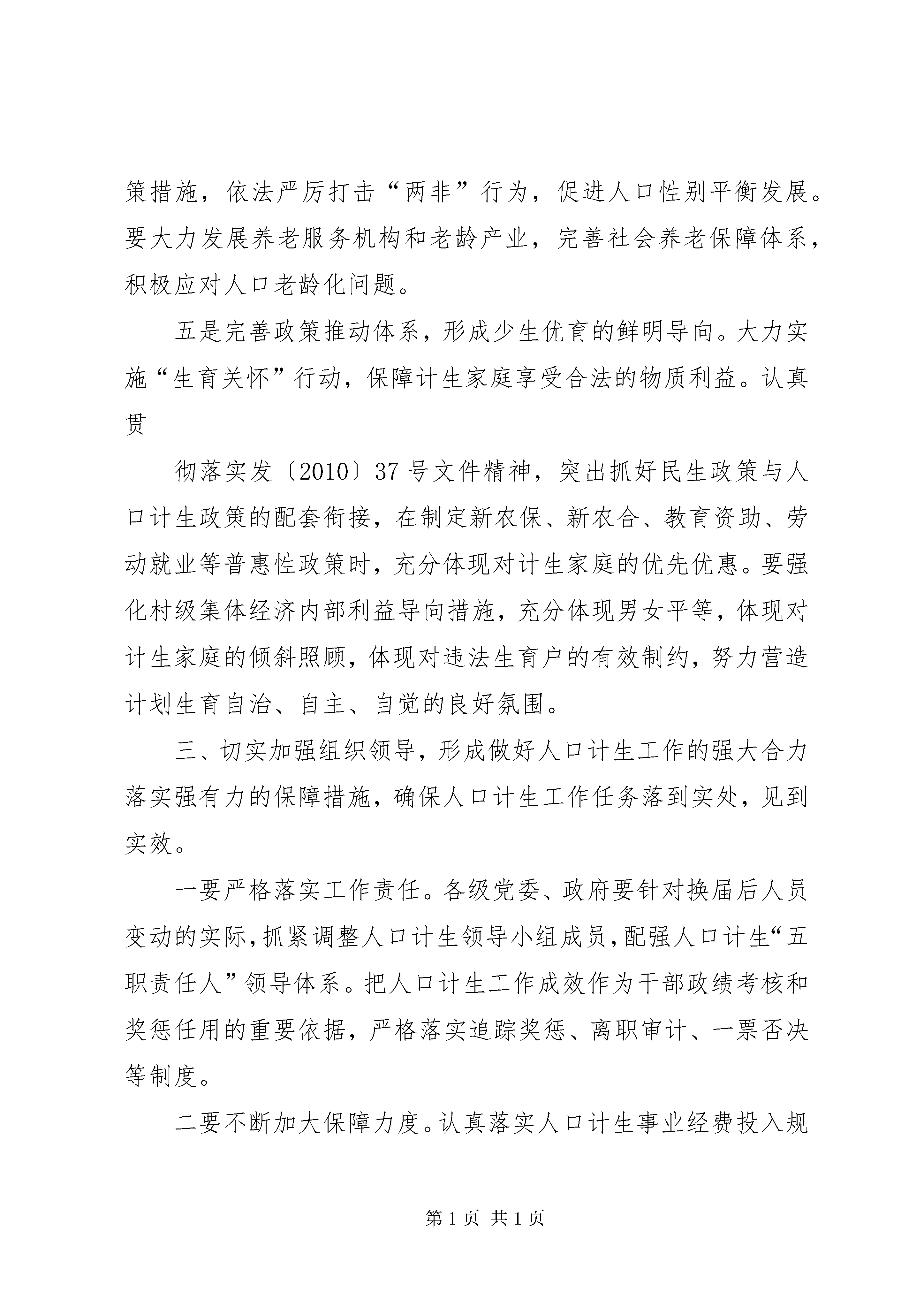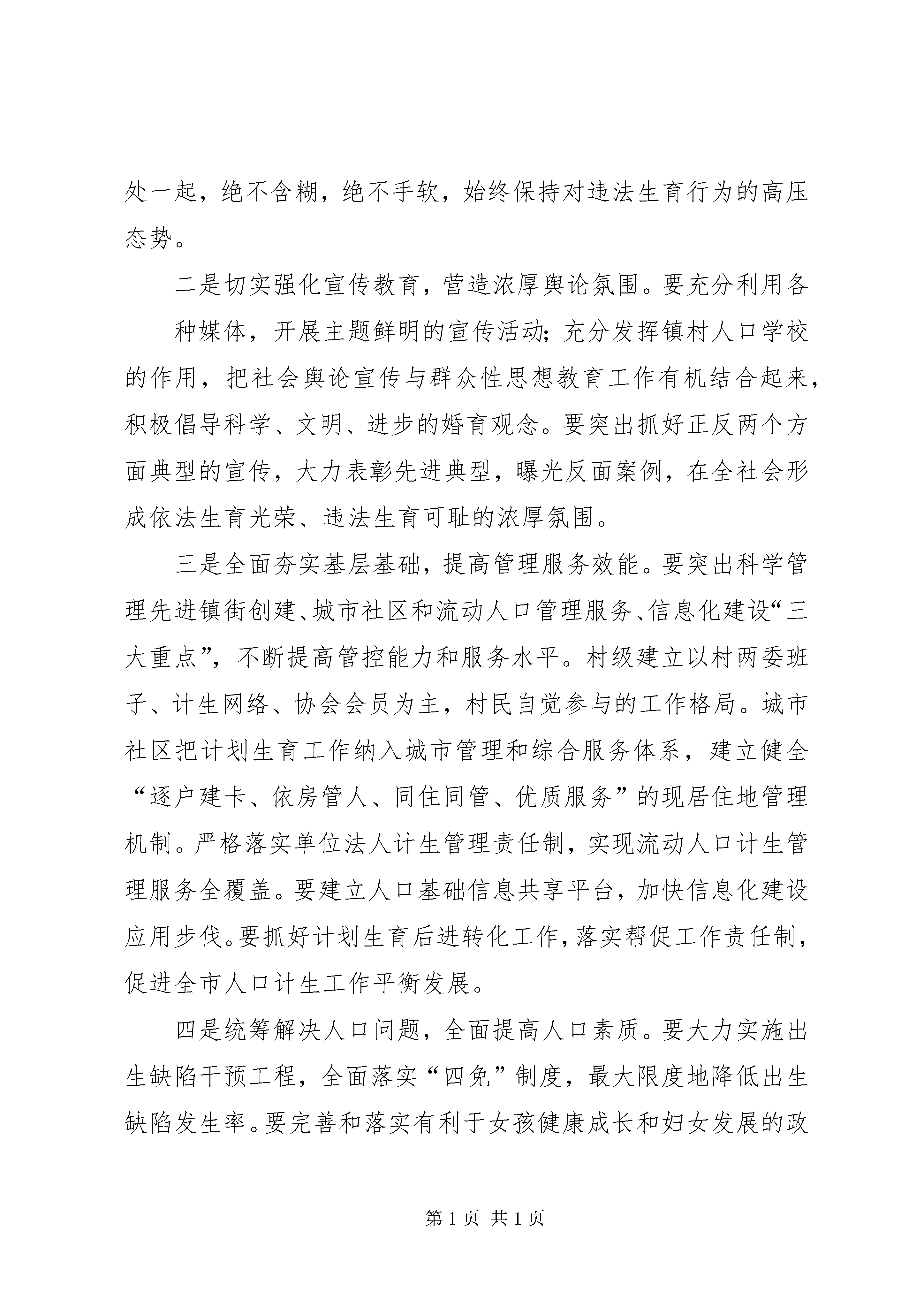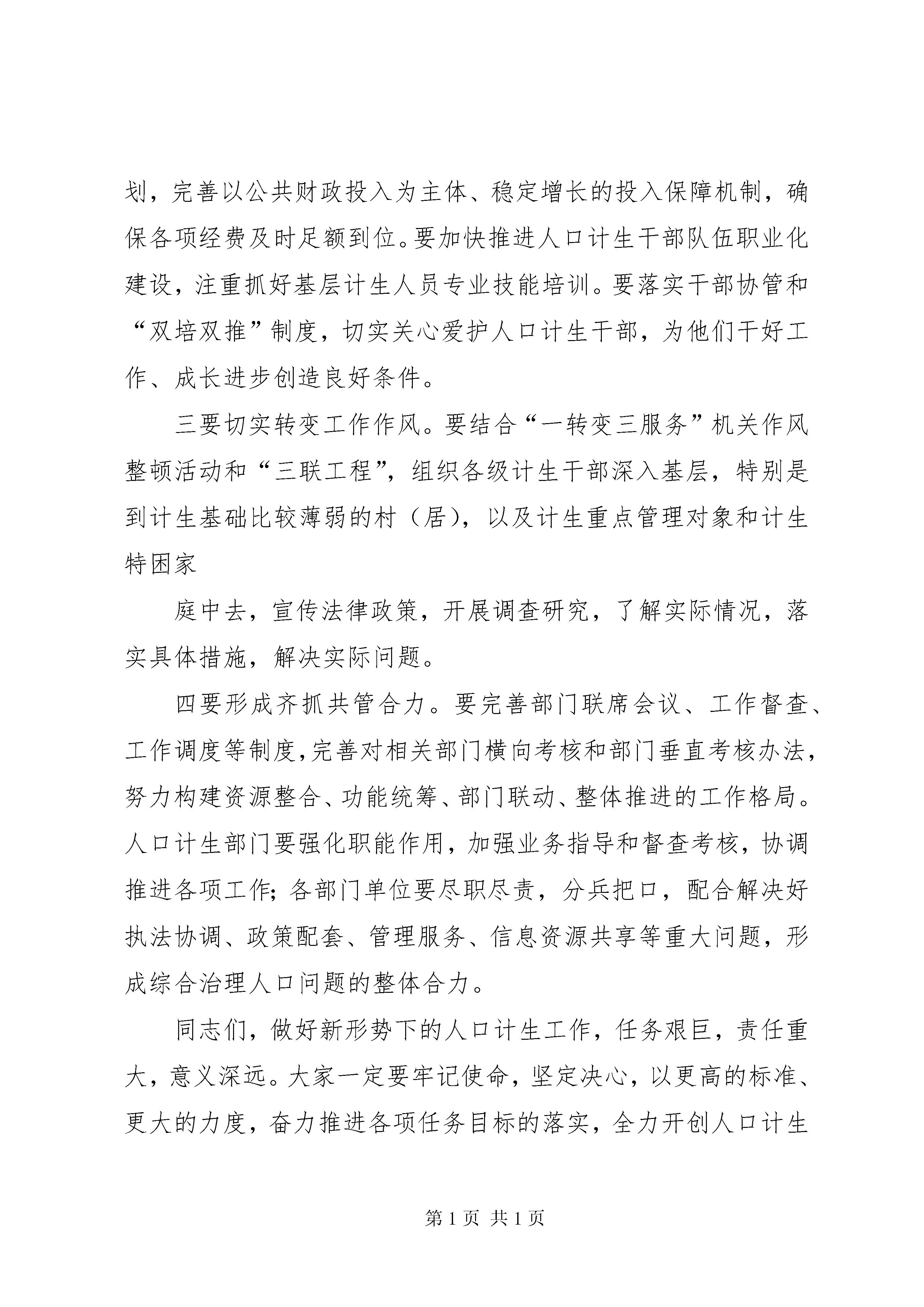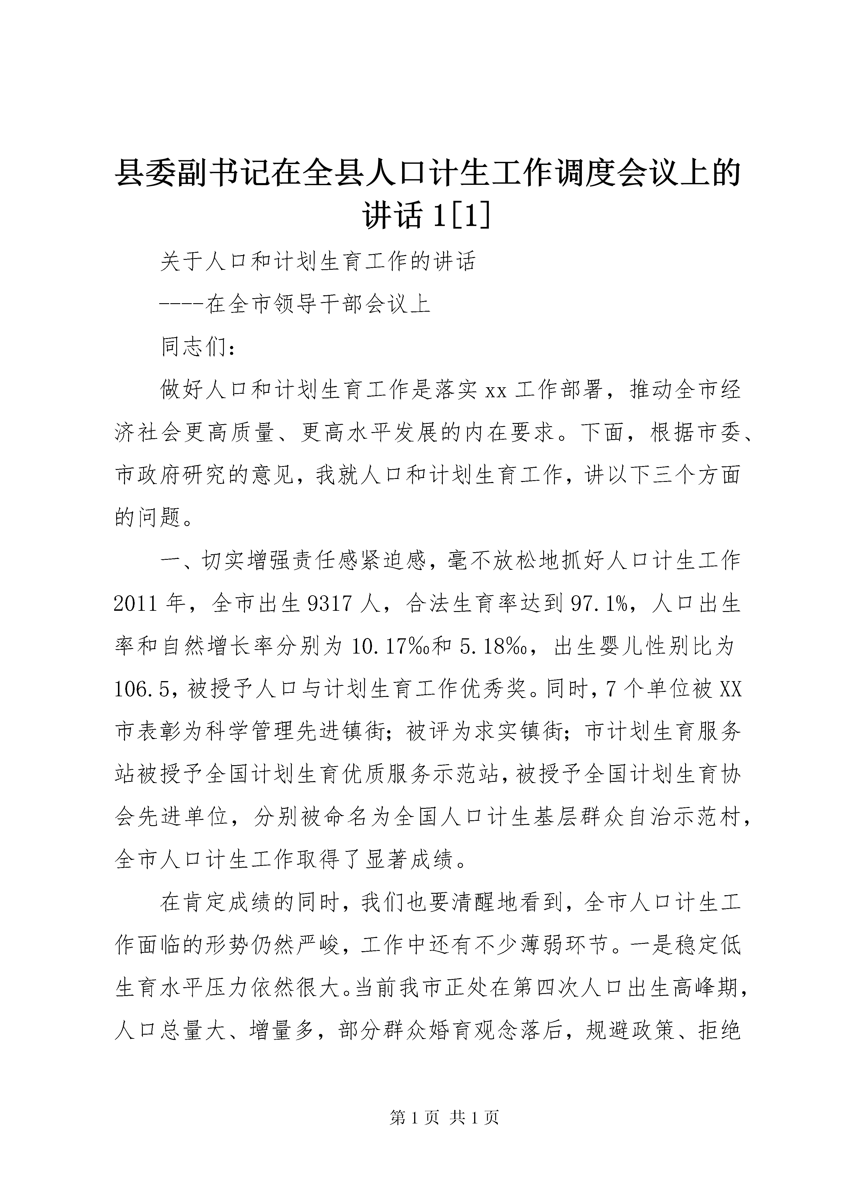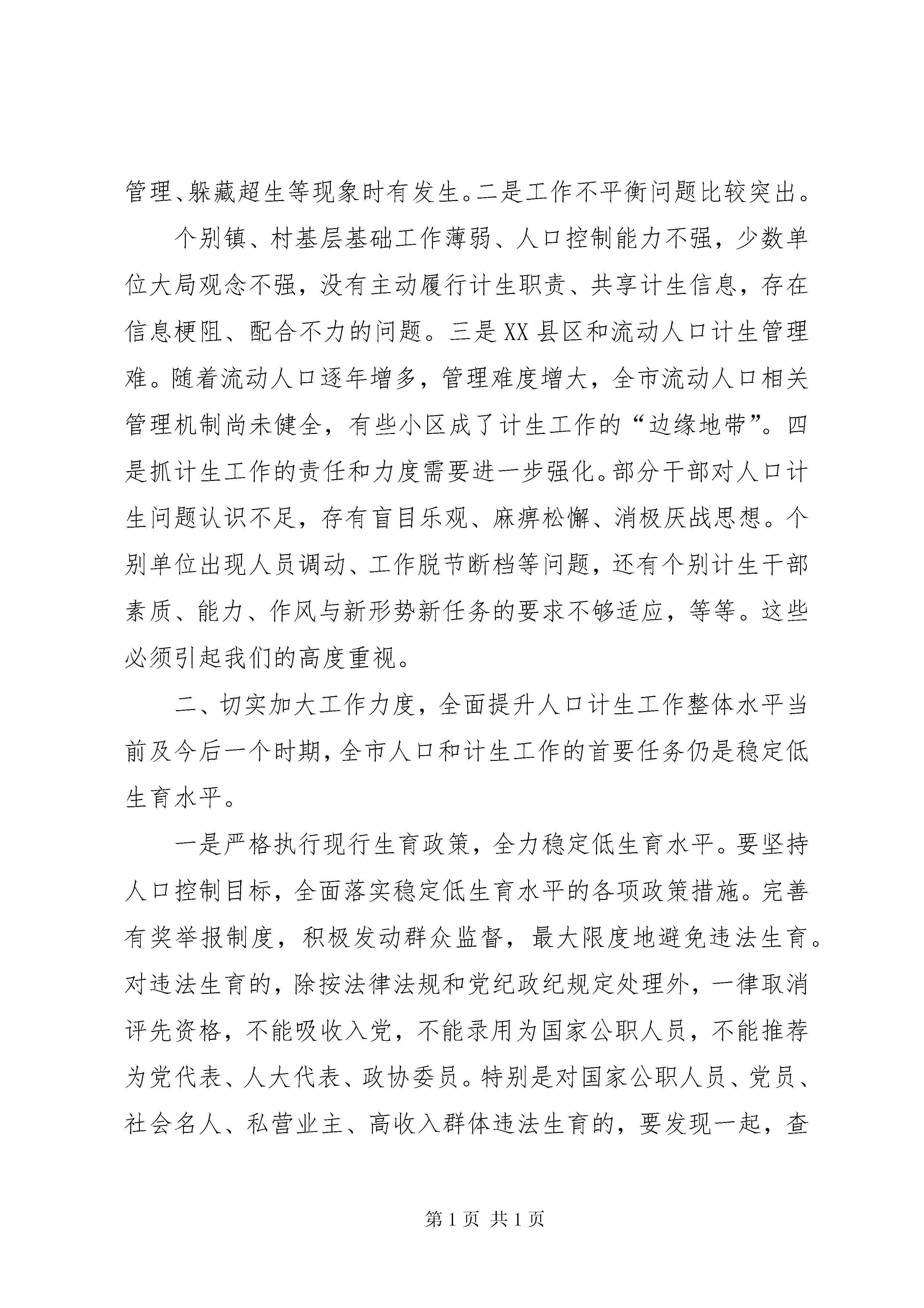 县委副书记在全县人口计生工作调度会议上的讲话1[1]关于人口和计划生育工作的讲话----在全市领导干部会议上同志们:做好人口和计划生育工作是落实xx工作部署,推动全市经济社会更高质量、更高水平发展的内在要求。下面,根据市委、市政府研究的意见,我就人口和计划生育工作,讲以下三个方面的问题。一、切实增强责任感紧迫感,毫不放松地抓好人口计生工作2011年,全市出生9317人,合法生育率达到97.1%,人口出生率和自然增长率分别为10.17‰和5.18‰,出生婴儿性别比为106.5,被授予人口与计划生育工作优秀奖。同时,7个单位被XX市表彰为科学管理先进镇街;被评为求实镇街;市计划生育服务站被授予全国计划生育优质服务示范站,被授予全国计划生育协会先进单位,分别被命名为全国人口计生基层群众自治示范村,全市人口计生工作取得了显著成绩。在肯定成绩的同时,我们也要清醒地看到,全市人口计生工作面临的形势仍然严峻,工作中还有不少薄弱环节。一是稳定低生育水平压力依然很大。当前我市正处在第四次人口出生高峰期,人口总量大、增量多,部分群众婚育观念落后,规避政策、拒绝管理、躲藏超生等现象时有发生。二是工作不平衡问题比较突出。个别镇、村基层基础工作薄弱、人口控制能力不强,少数单位大局观念不强,没有主动履行计生职责、共享计生信息,存在信息梗阻、配合不力的问题。三是XX县区和流动人口计生管理难。随着流动人口逐年增多,管理难度增大,全市流动人口相关管理机制尚未健全,有些小区成了计生工作的“边缘地带”。四是抓计生工作的责任和力度需要进一步强化。部分干部对人口计生问题认识不足,存有盲目乐观、麻痹松懈、消极厌战思想。个别单位出现人员调动、工作脱节断档等问题,还有个别计生干部素质、能力、作风与新形势新任务的要求不够适应,等等。这些必须引起我们的高度重视。二、切实加大工作力度,全面提升人口计生工作整体水平当前及今后一个时期,全市人口和计生工作的首要任务仍是稳定低生育水平。一是严格执行现行生育政策,全力稳定低生育水平。要坚持人口控制目标,全面落实稳定低生育水平的各项政策措施。完善有奖举报制度,积极发动群众监督,最大限度地避免违法生育。对违法生育的,除按法律法规和党纪政纪规定处理外,一律取消评先资格,不能吸收入党,不能录用为国家公职人员,不能推荐为党代表、人大代表、政协委员。特别是对国家公职人员、党员、社会名人、私营业主、高收入群体违法生育的,要发现一起,查处一起,绝不含糊,绝不手软,始终保持对违法生育行为的高压态势。二是切实强化宣传教育,营造浓厚舆论氛围。要充分利用各种媒体,开展主题鲜明的宣传活动;充分发挥镇村人口学校的作用,把社会舆论宣传与群众性思想教育工作有机结合起来,积极倡导科学、文明、进步的婚育观念。要突出抓好正反两个方面典型的宣传,大力表彰先进典型,曝光反面案例,在全社会形成依法生育光荣、违法生育可耻的浓厚氛围。三是全面夯实基层基础,提高管理服务效能。要突出科学管理先进镇街创建、城市社区和流动人口管理服务、信息化建设“三大重点”,不断提高管控能力和服务水平。村级建立以村两委班子、计生网络、协会会员为主,村民自觉参与的工作格局。城市社区把计划生育工作纳入城市管理和综合服务体系,建立健全“逐户建卡、依房管人、同住同管、优质服务”的现居住地管理机制。严格落实单位法人计生管理责任制,实现流动人口计生管理服务全覆盖。要建立人口基础信息共享平台,加快信息化建设应用步伐。要抓好计划生育后进转化工作,落实帮促工作责任制,促进全市人口计生工作平衡发展。四是统筹解决人口问题,全面提高人口素质。要大力实施出生缺陷干预工程,全面落实“四免”制度,最大限度地降低出生缺陷发生率。要完善和落实有利于女孩健康成长和妇女发展的政策措施,依法严厉打击“两非”行为,促进人口性别平衡发展。要大力发展养老服务机构和老龄产业,完善社会养老保障体系,积极应对人口老龄化问题。五是完善政策推动体系,形成少生优育的鲜明导向。大力实施“生育关怀”行动,保障计生家庭享受合法的物质利益。认真贯彻落实发〔2010〕37号文件精神,突出抓好民生政策与人口计生政策的配套衔接,在制定新农保、新农合、教育资助、劳动就业等普惠性政策时,充分体现对计生家庭的优先优惠。要强化村级集体经济内部利益导向措施,充分体现男女平等,体现对计生家庭的倾斜照顾,体现对违法生育户的有效制约,努力营造计划生育自治、自主、自觉的良好氛围。三、切实加强组织领导,形成做好人口计生工作的强大合力落实强有力的保障措施,确保人口计生工作任务落到实处,见到实效。一要严格落实工作责任。各级党委、政府要针对换届后人员变动的实际,抓紧调整人口计生领导小组成员,配强人口计生“五职责任人”领导体系。把人口计生工作成效作为干部政绩考核和奖惩任用的重要依据